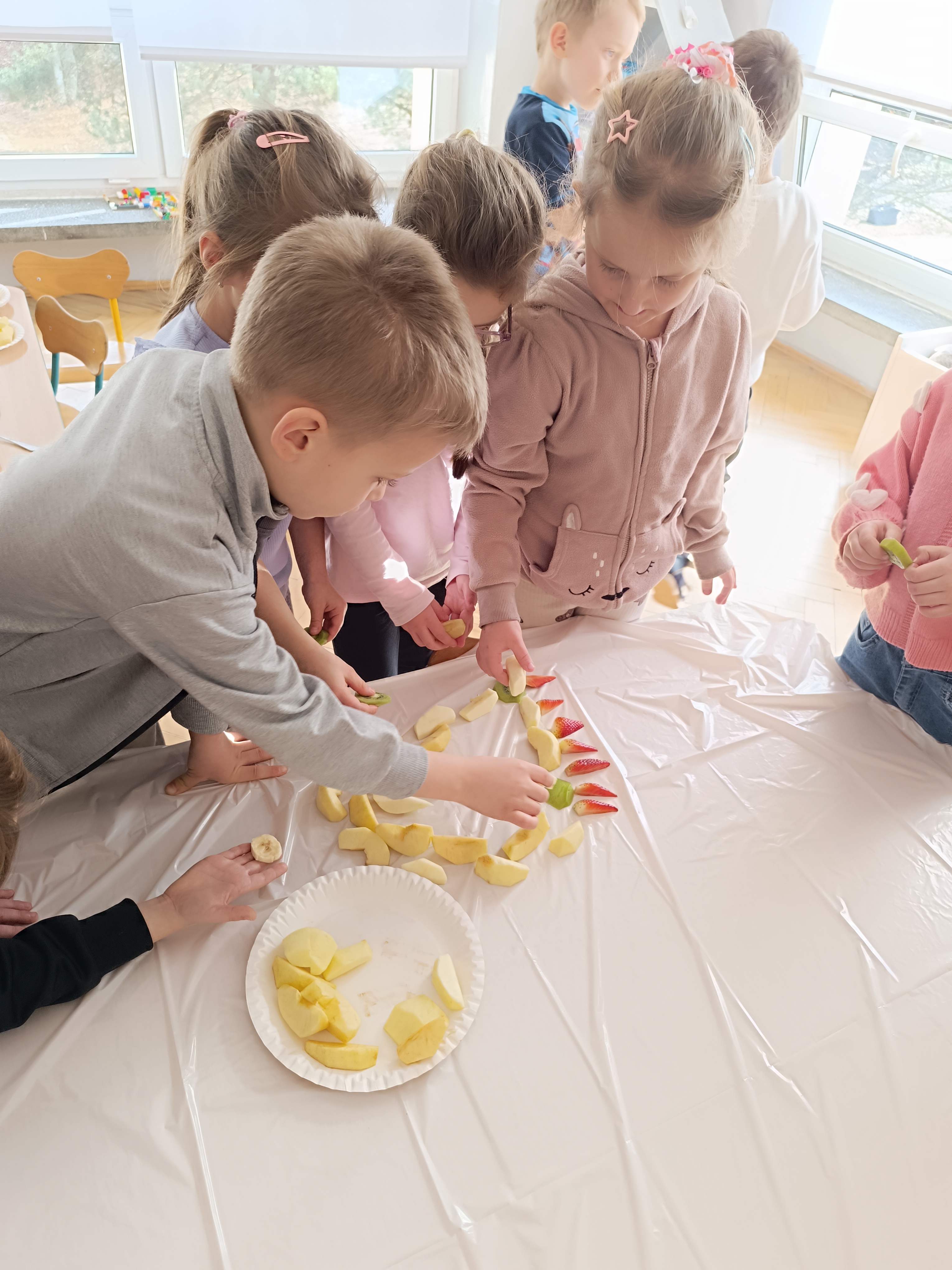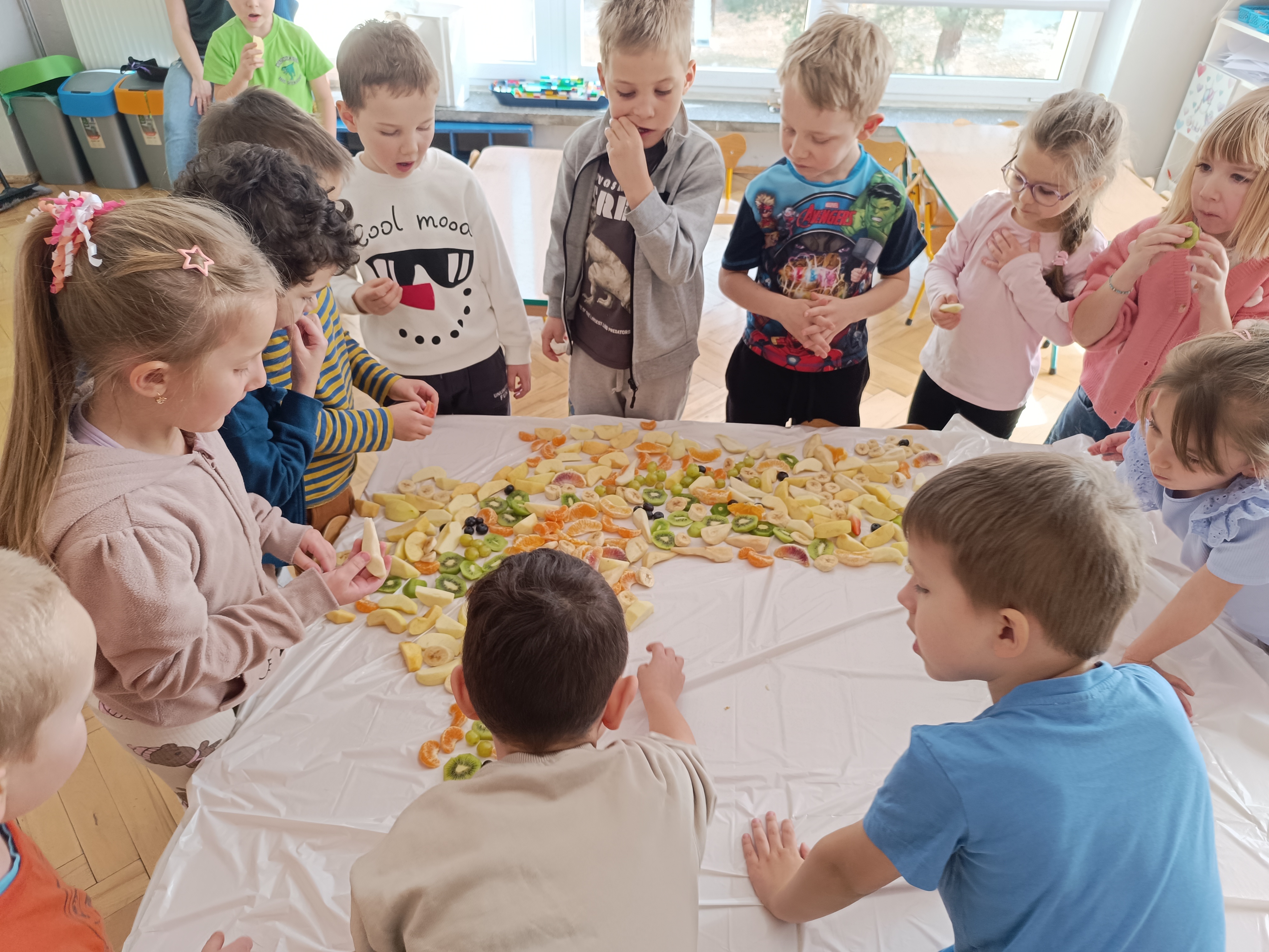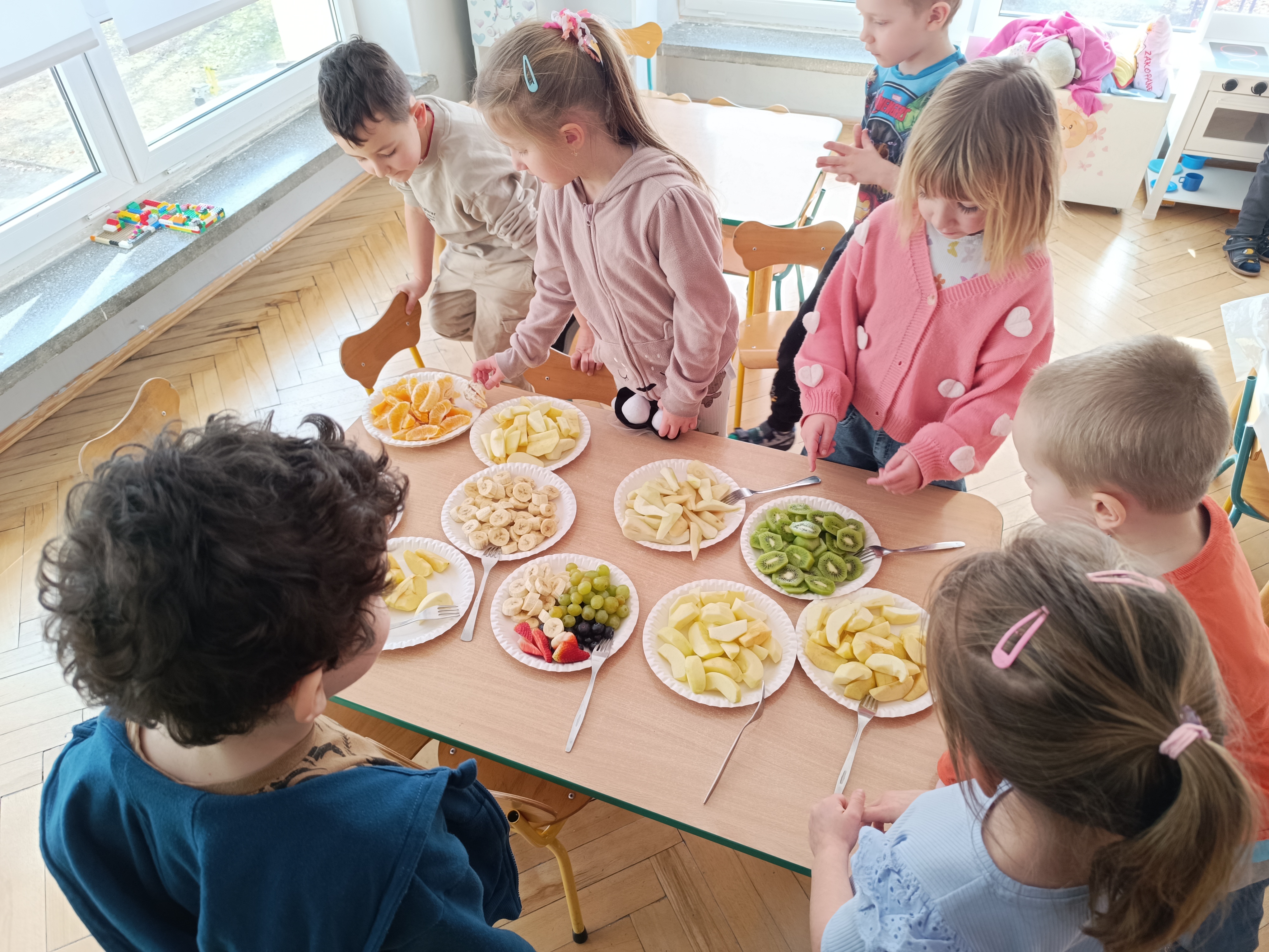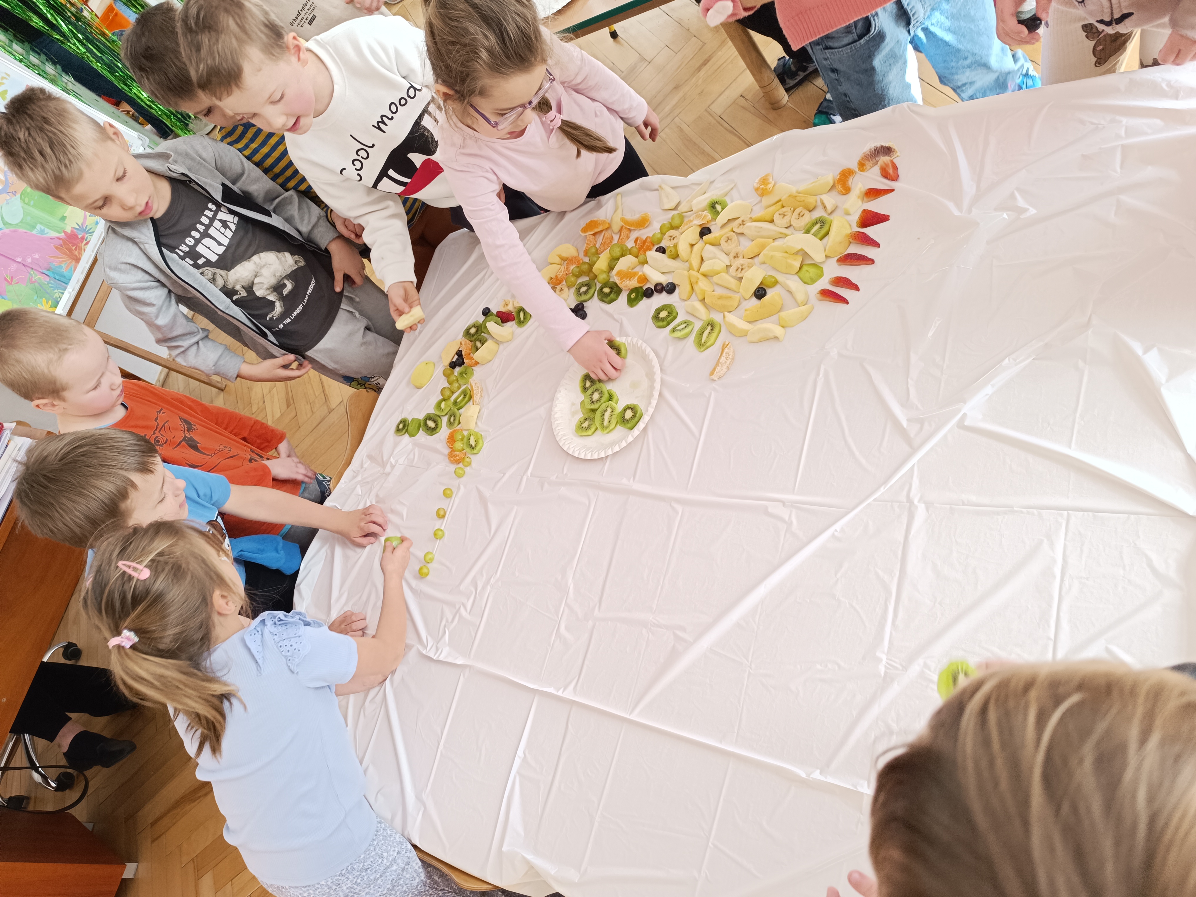 W piątek odbył się także Owocowy Dzień. Dzieci wspólnie ułożyły kolorowego dinozaura z owoców, rozwijając kreatywność i utrwalając zasady zdrowego odżywiania. Na zakończenie z apetytem zjadły przygotowaną kompozycję.