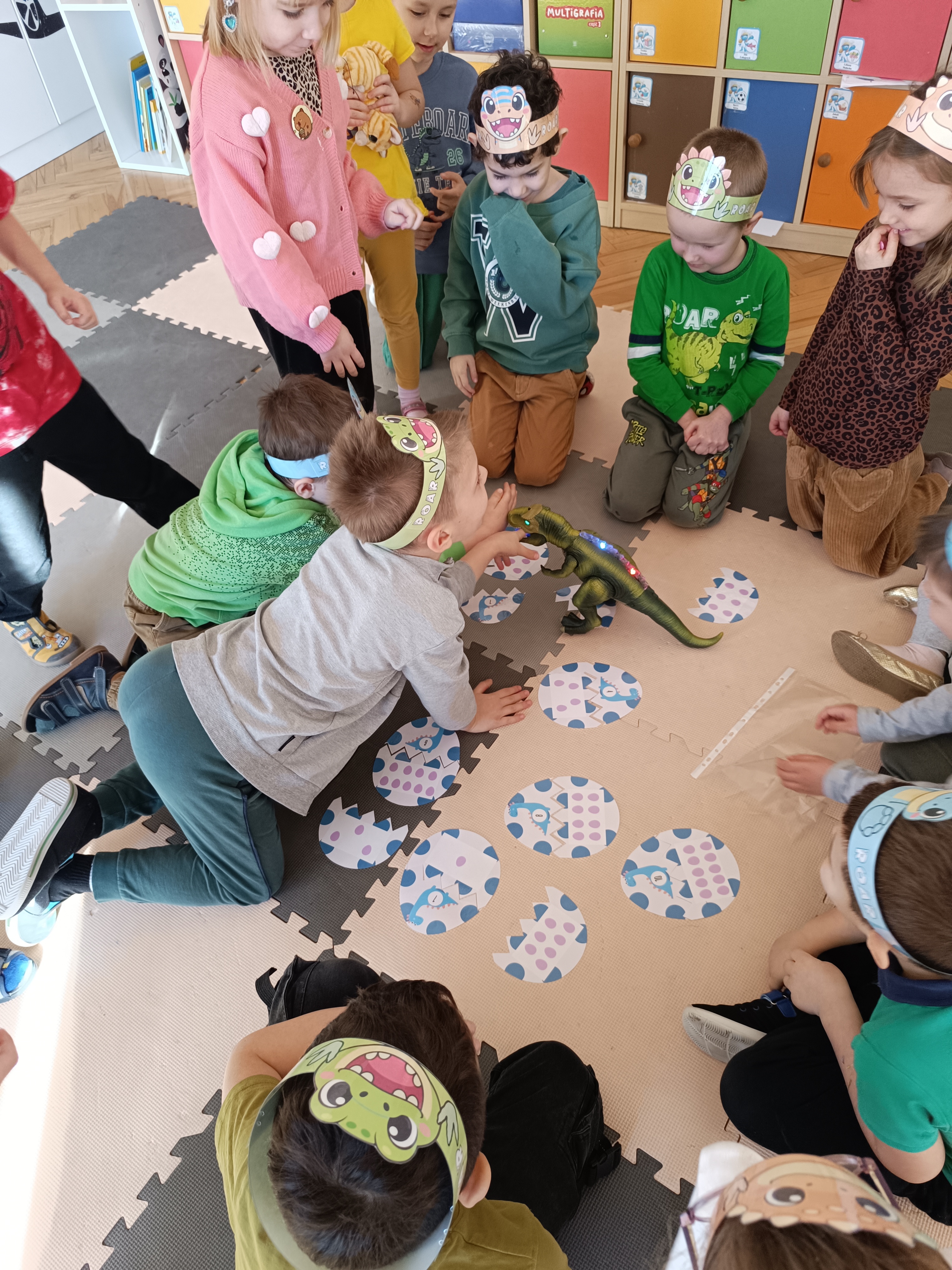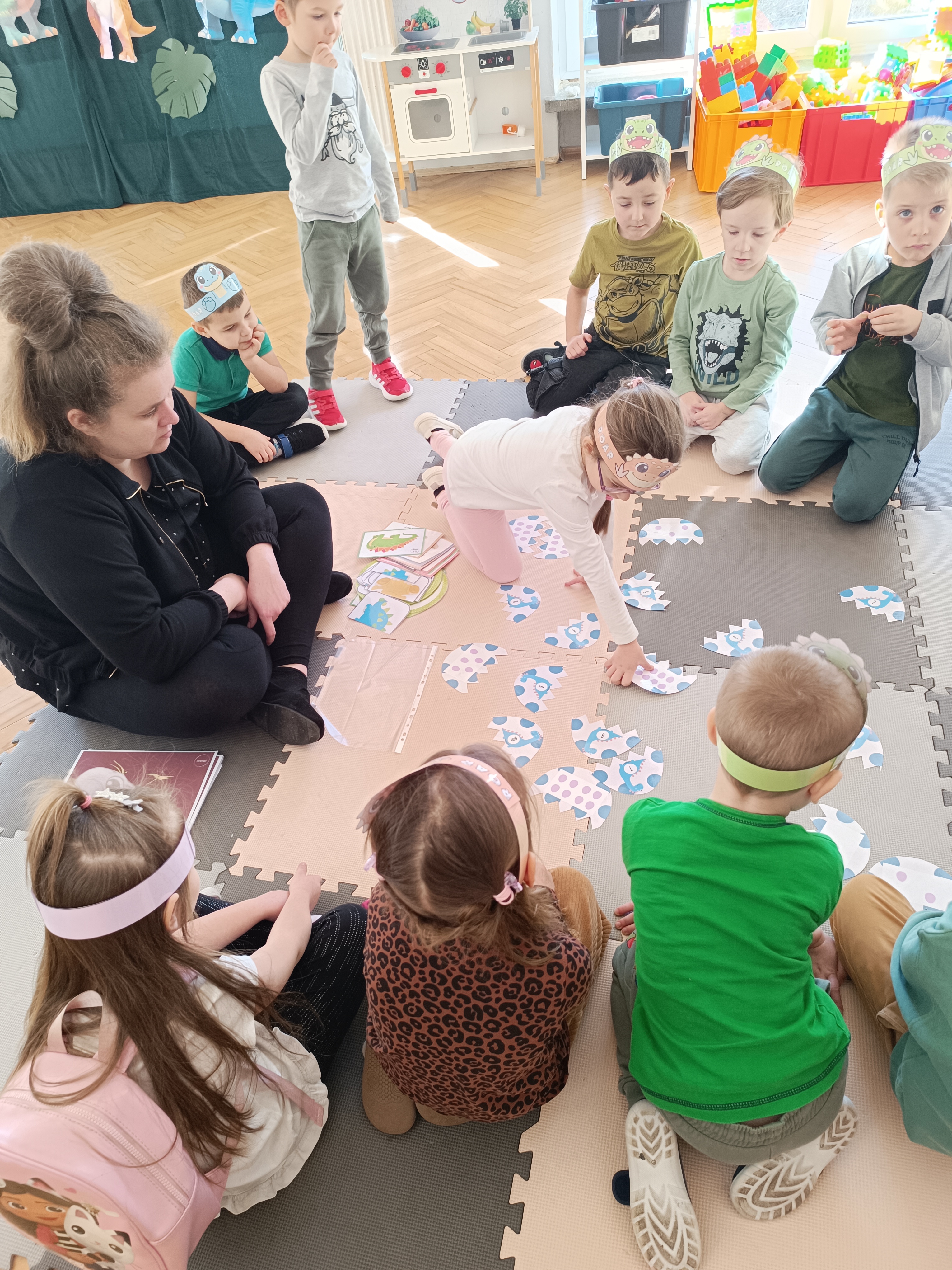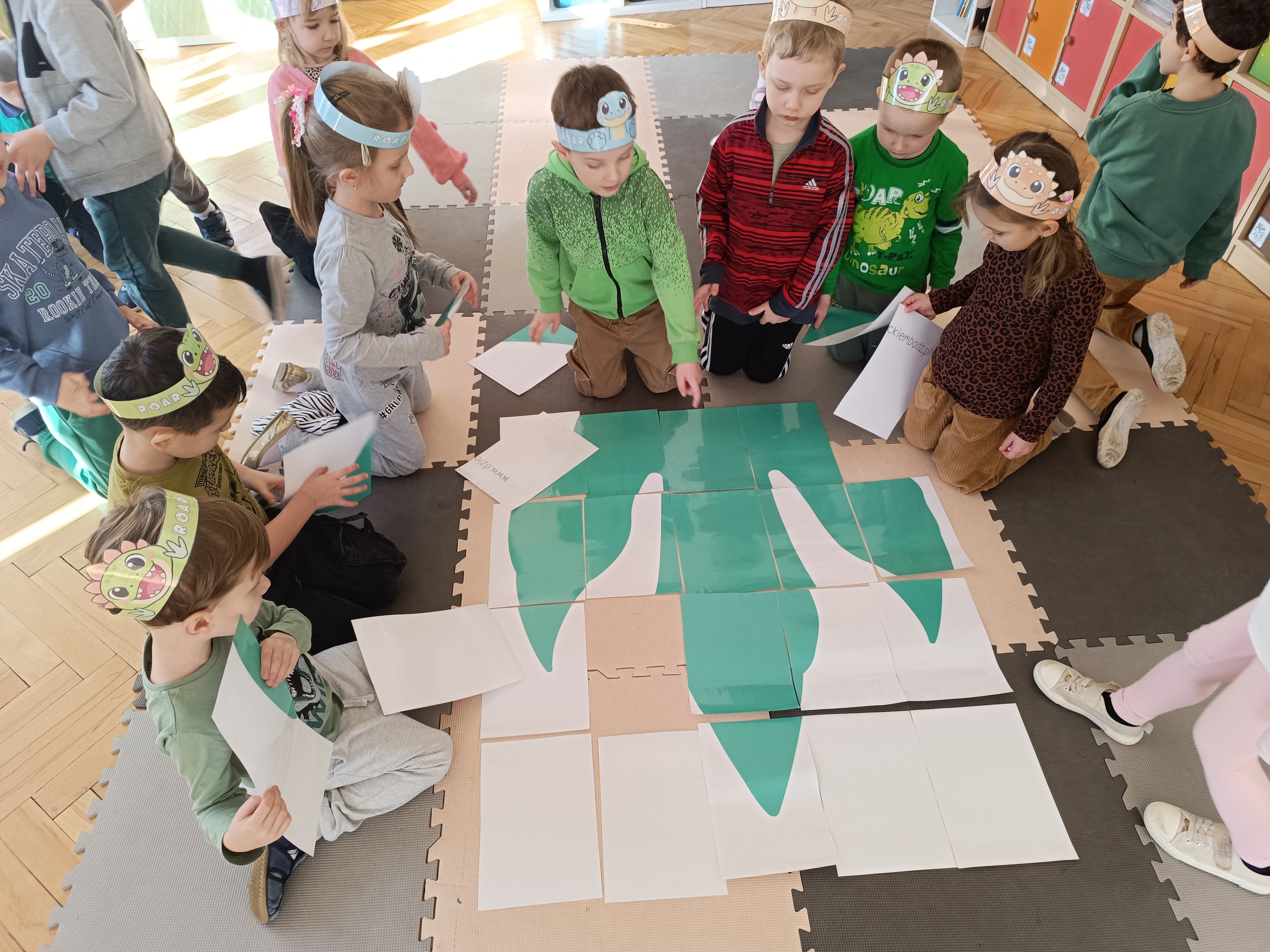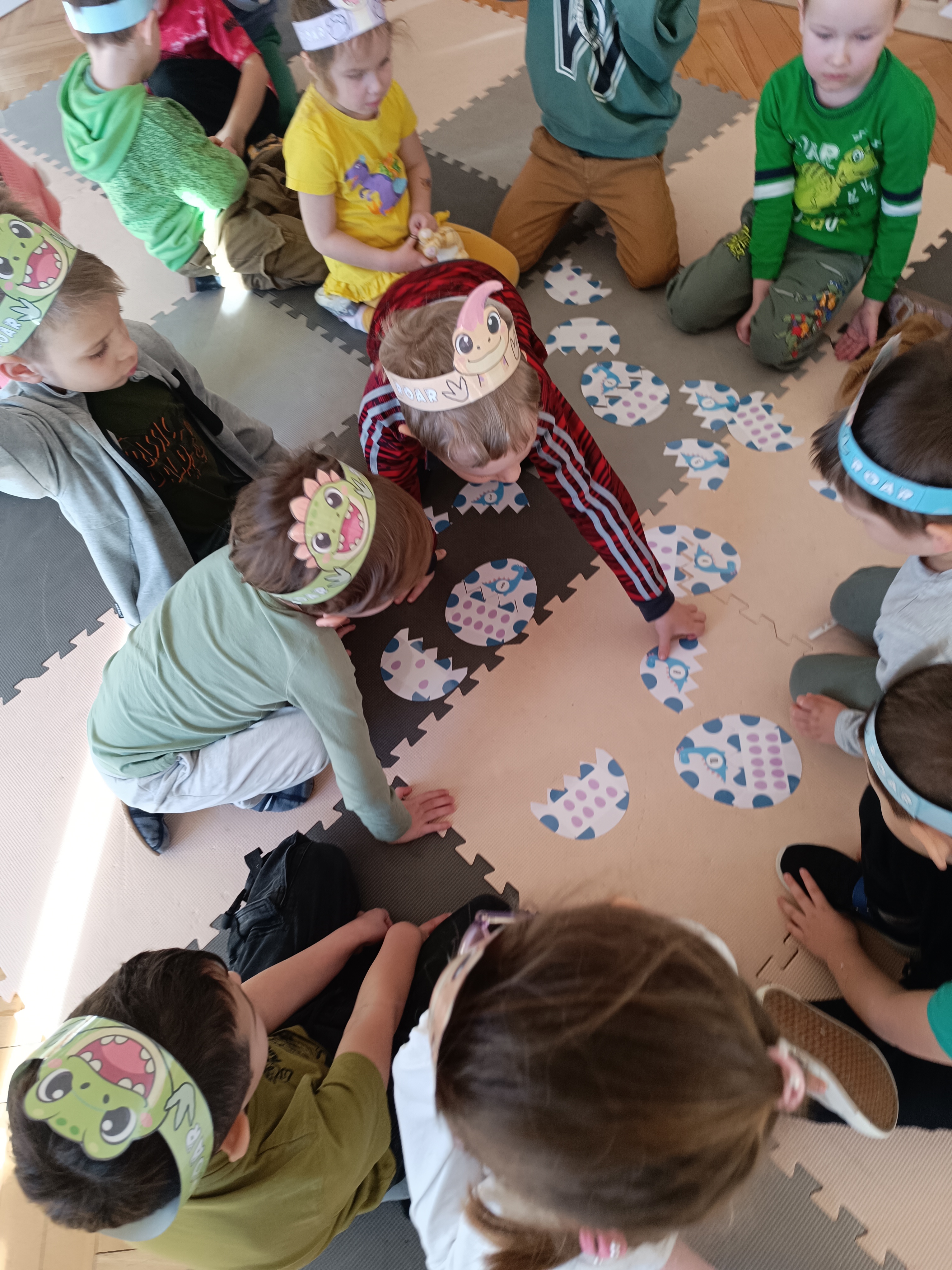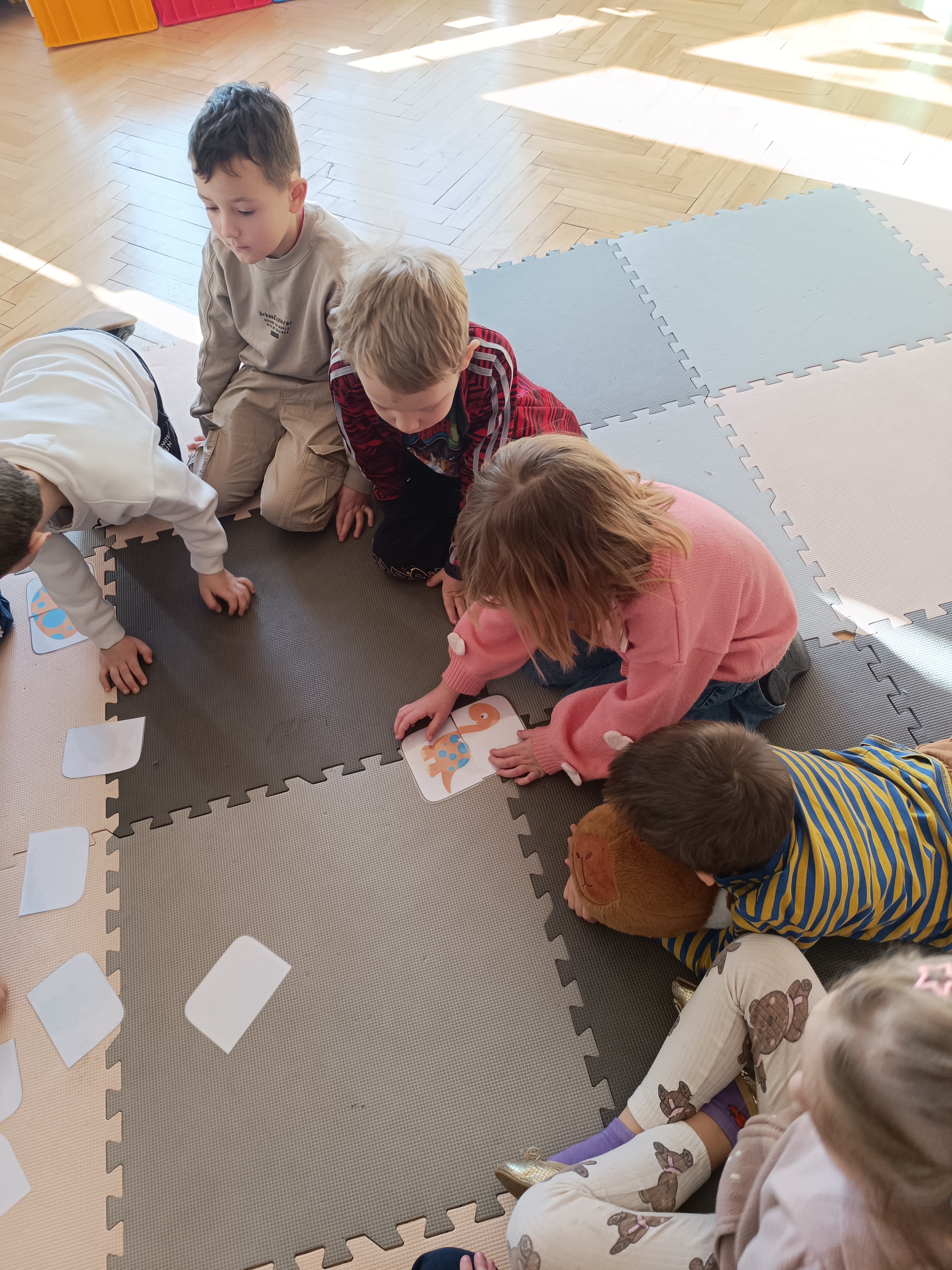 Nie zabrakło również aktywności rozwijających logiczne myślenie i współpracę. Dzieci układały puzzle, które po połączeniu wszystkich elementów tworzyły wielki odcisk stopy dinozaura. Z dużym zaangażowaniem grały w memory dinozaurów, ćwicząc pamięć i koncentrację. Podczas zabaw matematycznych przeliczały elementy na papierowych jajkach oraz dopasowywały do siebie odpowiednie połówki jajek, łącząc je w całość.