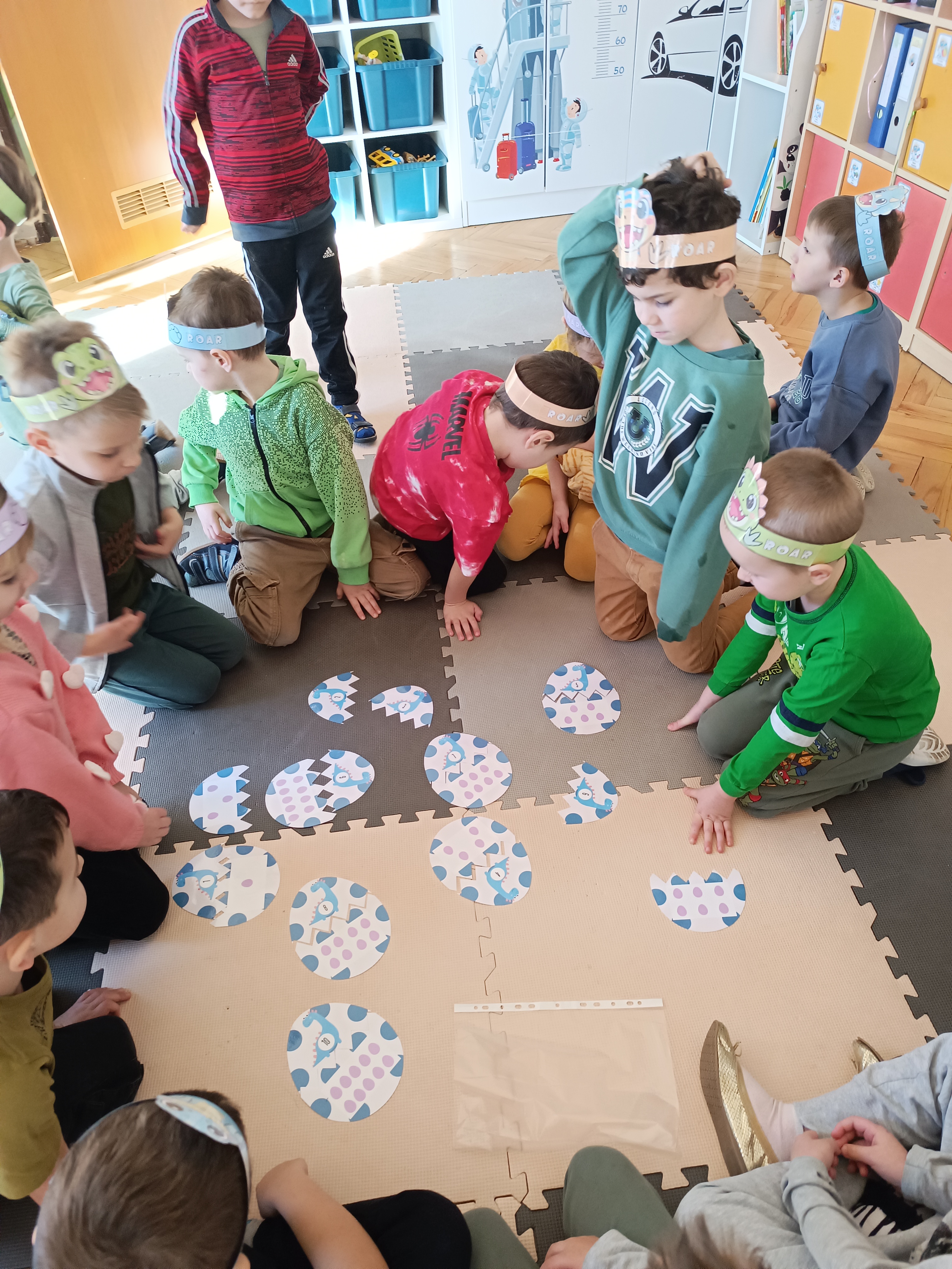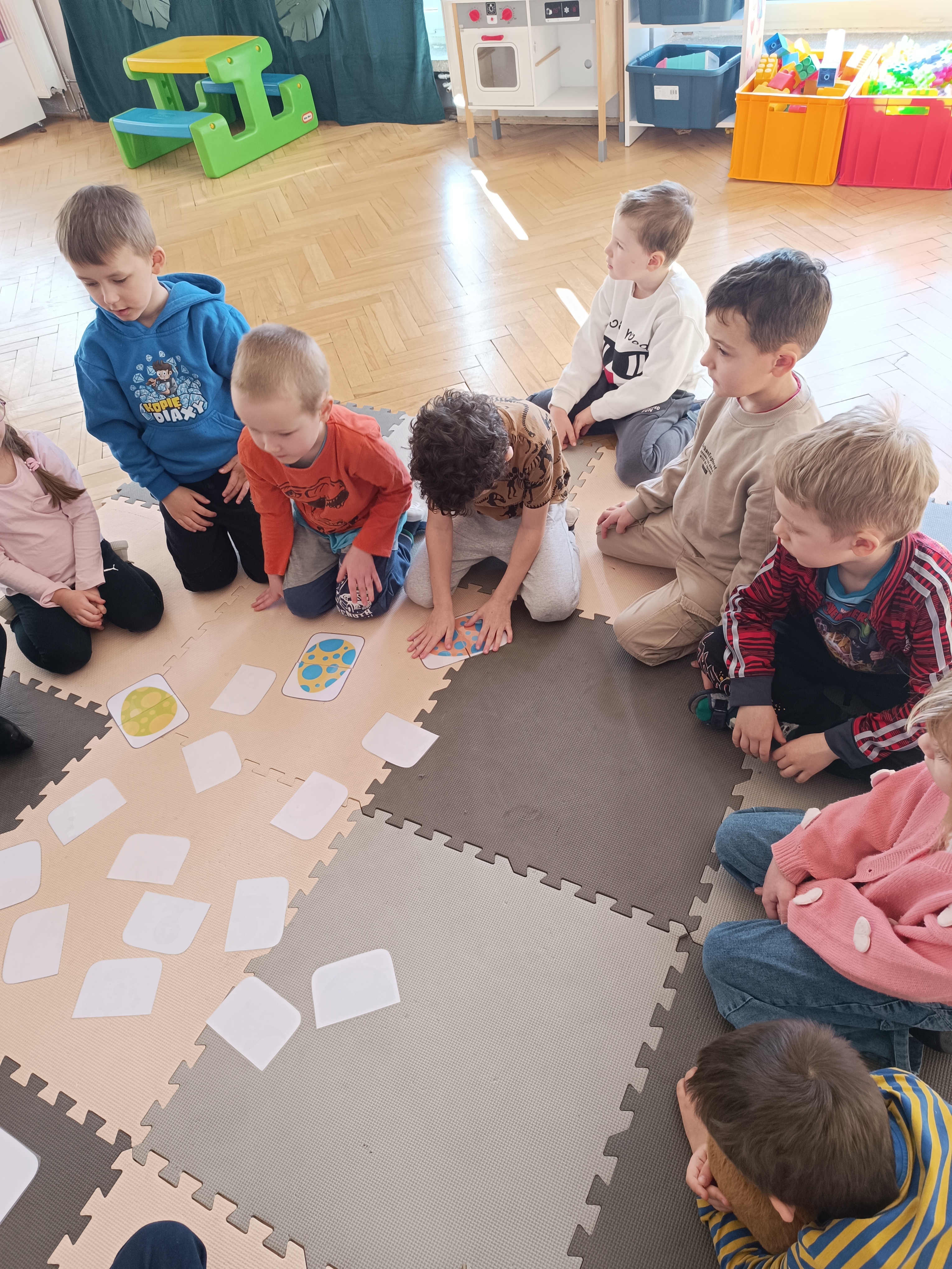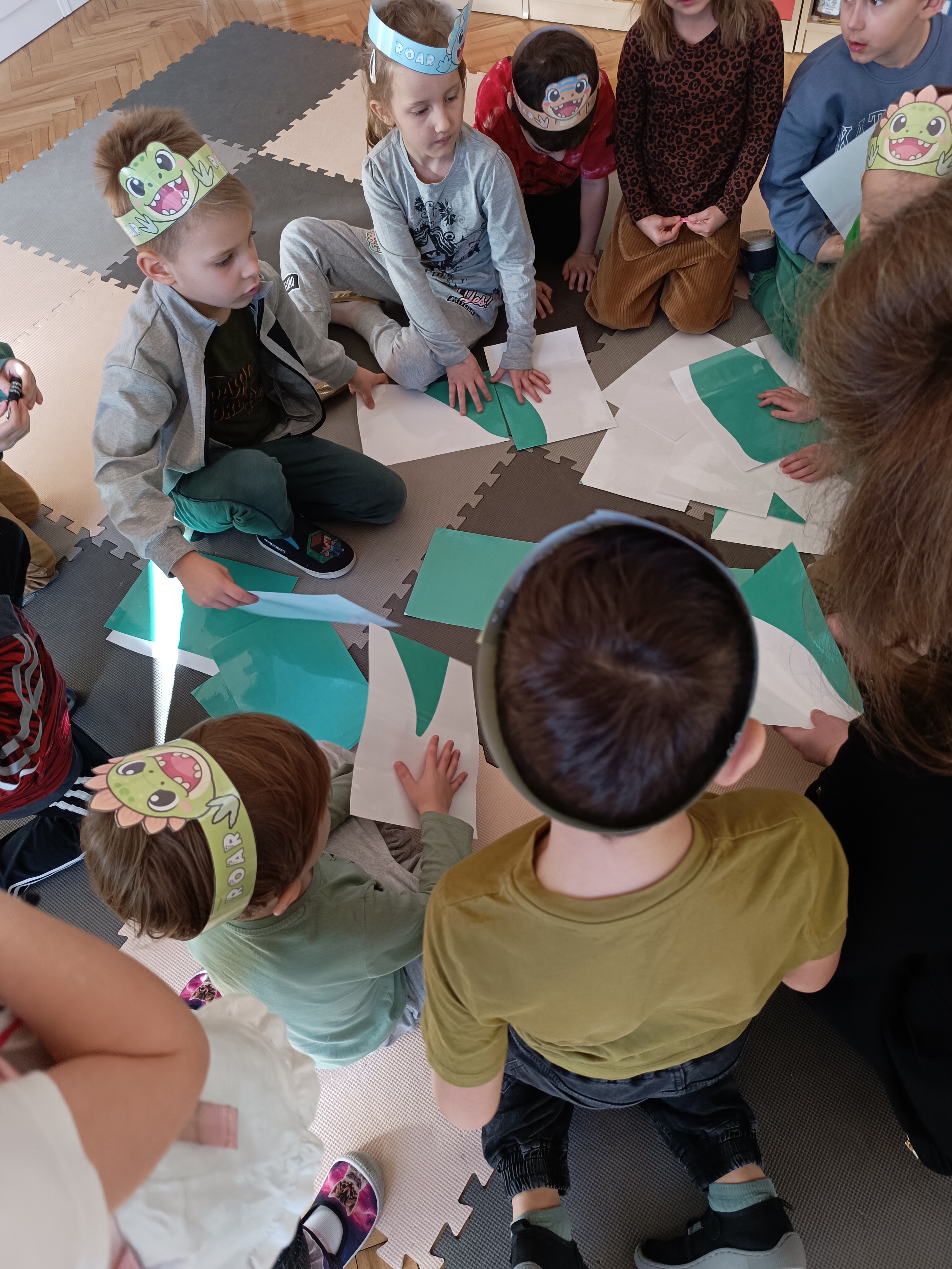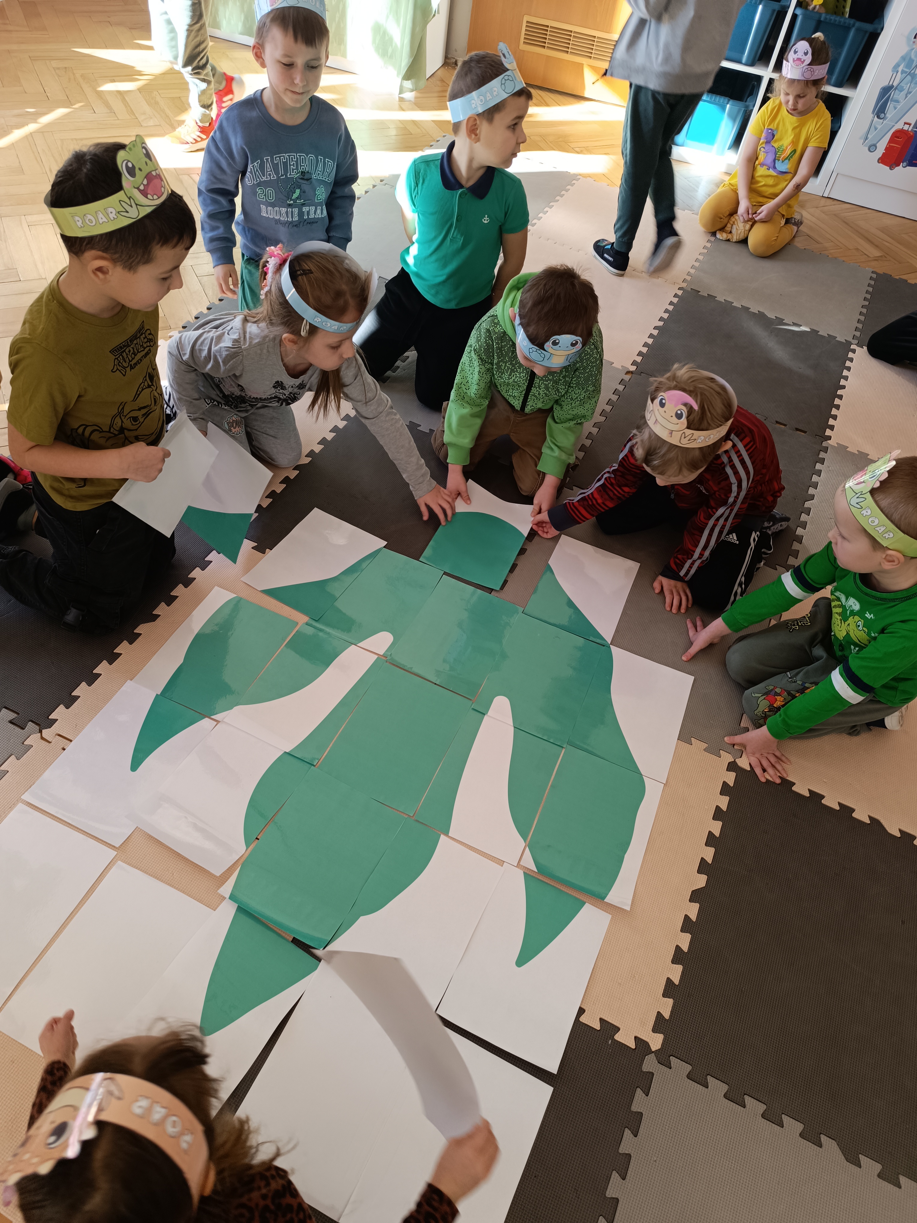 Nie zabrakło również aktywności rozwijających logiczne myślenie i współpracę. Dzieci układały puzzle, które po połączeniu wszystkich elementów tworzyły wielki odcisk stopy dinozaura. Z dużym zaangażowaniem grały w memory dinozaurów, ćwicząc pamięć i koncentrację. Podczas zabaw matematycznych przeliczały elementy na papierowych jajkach oraz dopasowywały do siebie odpowiednie połówki jajek, łącząc je w całość.