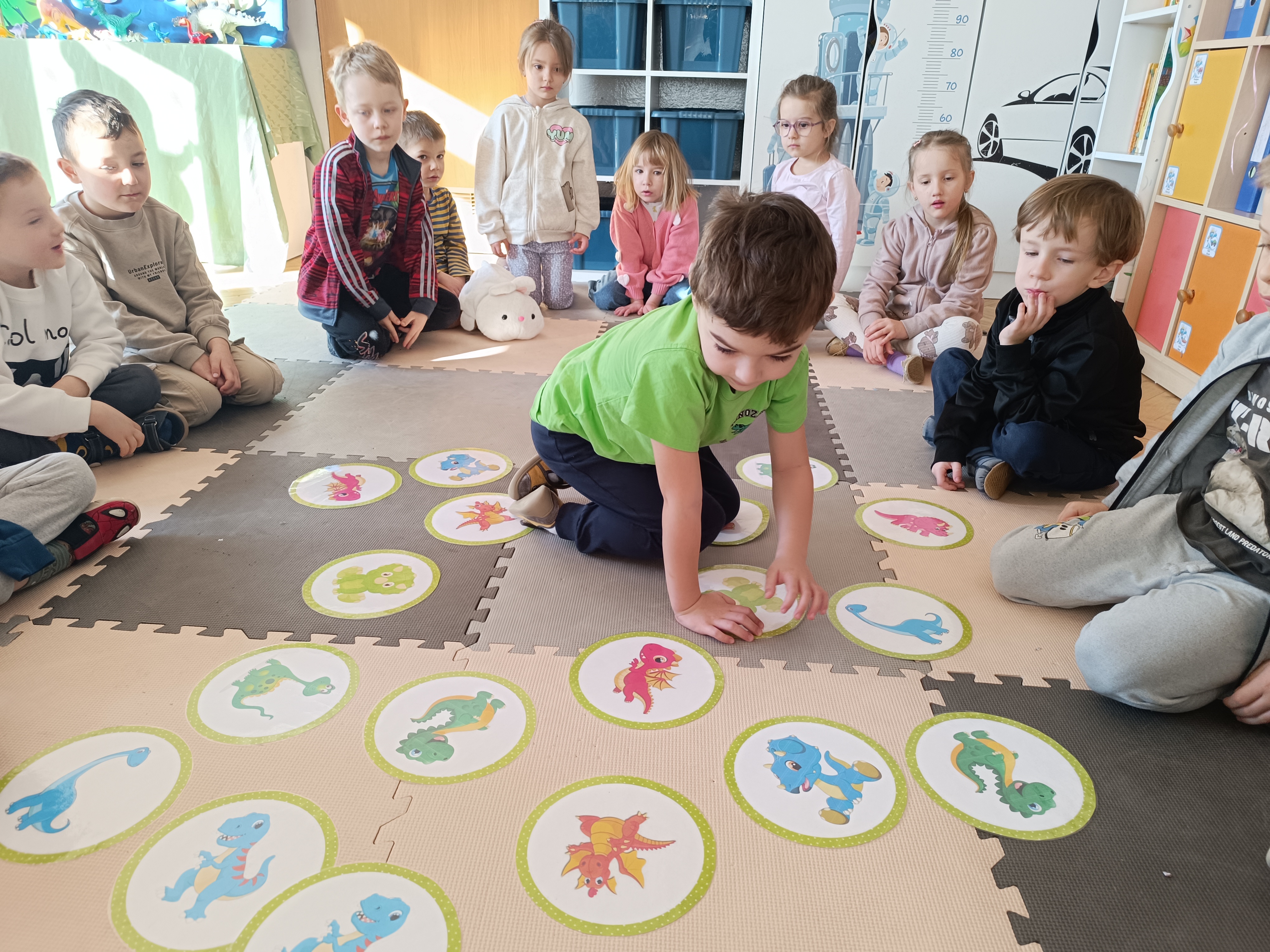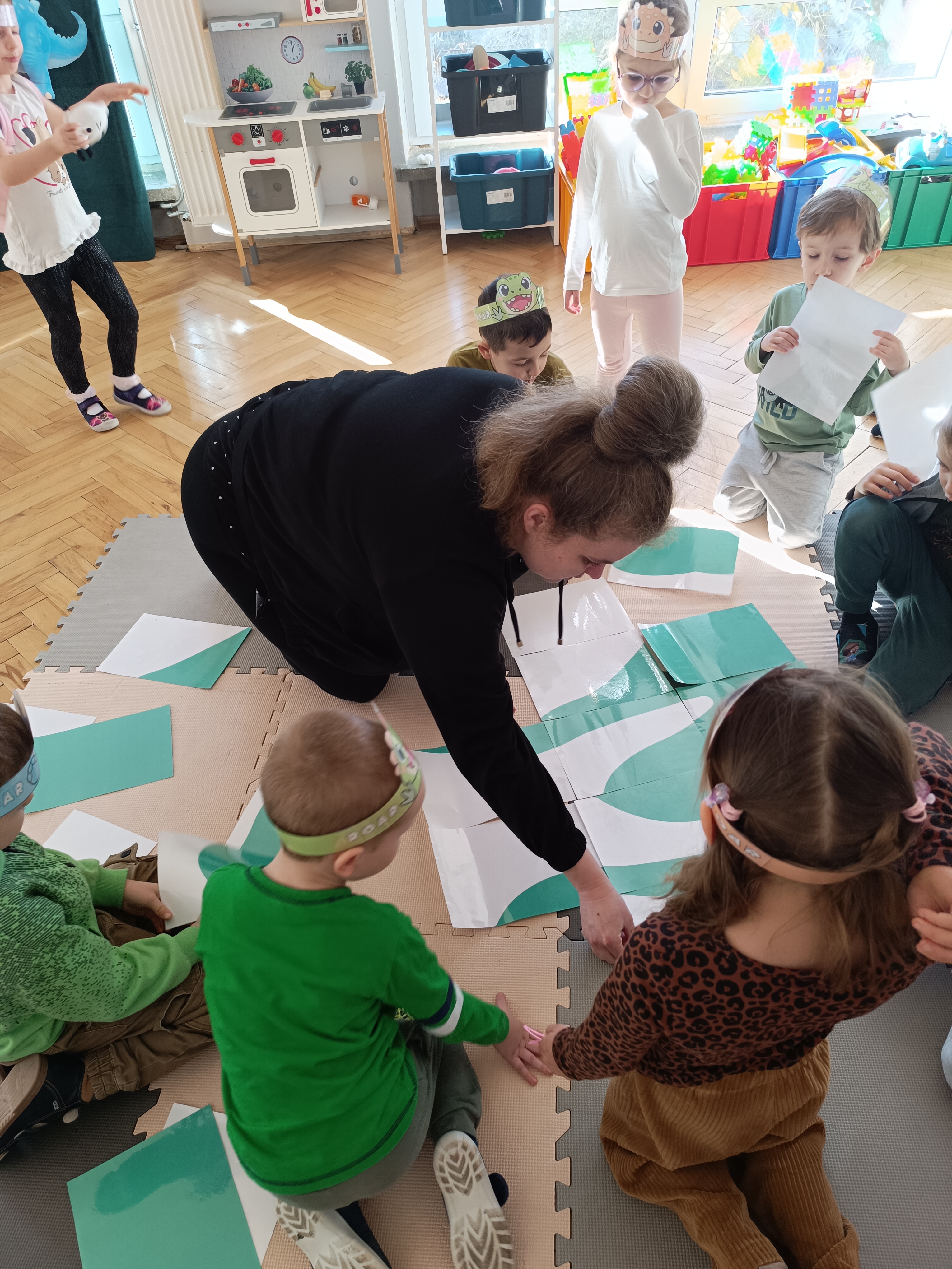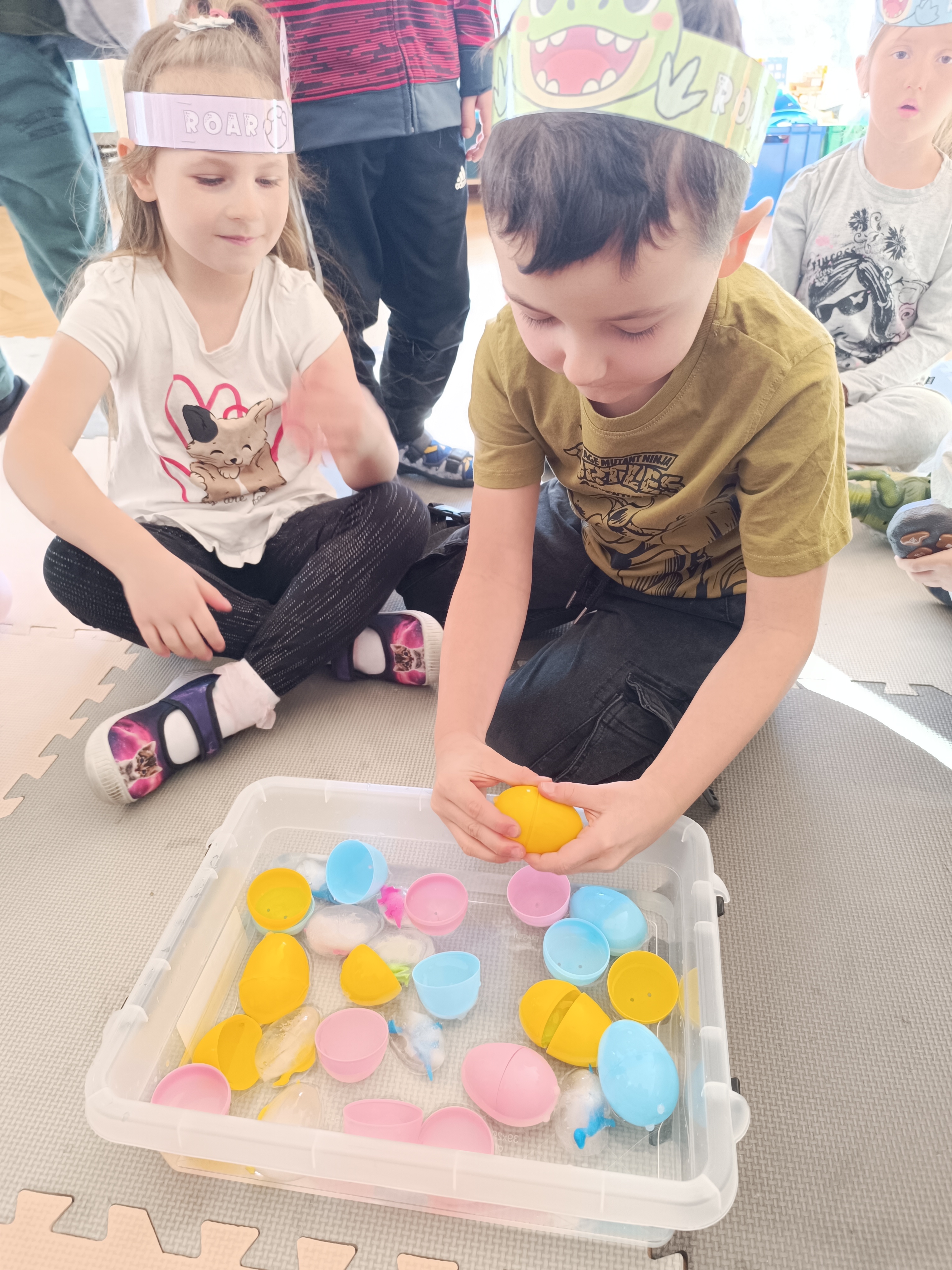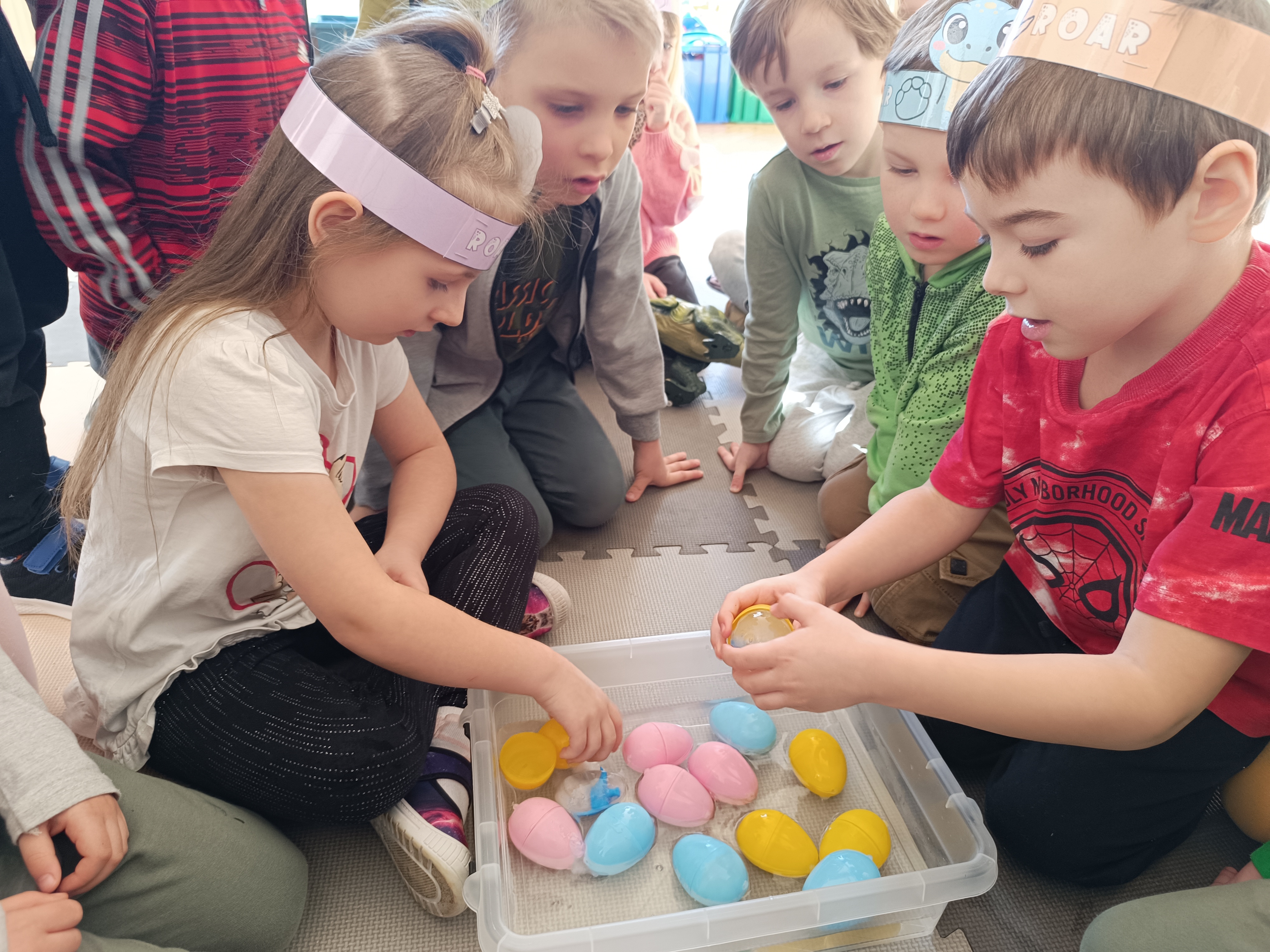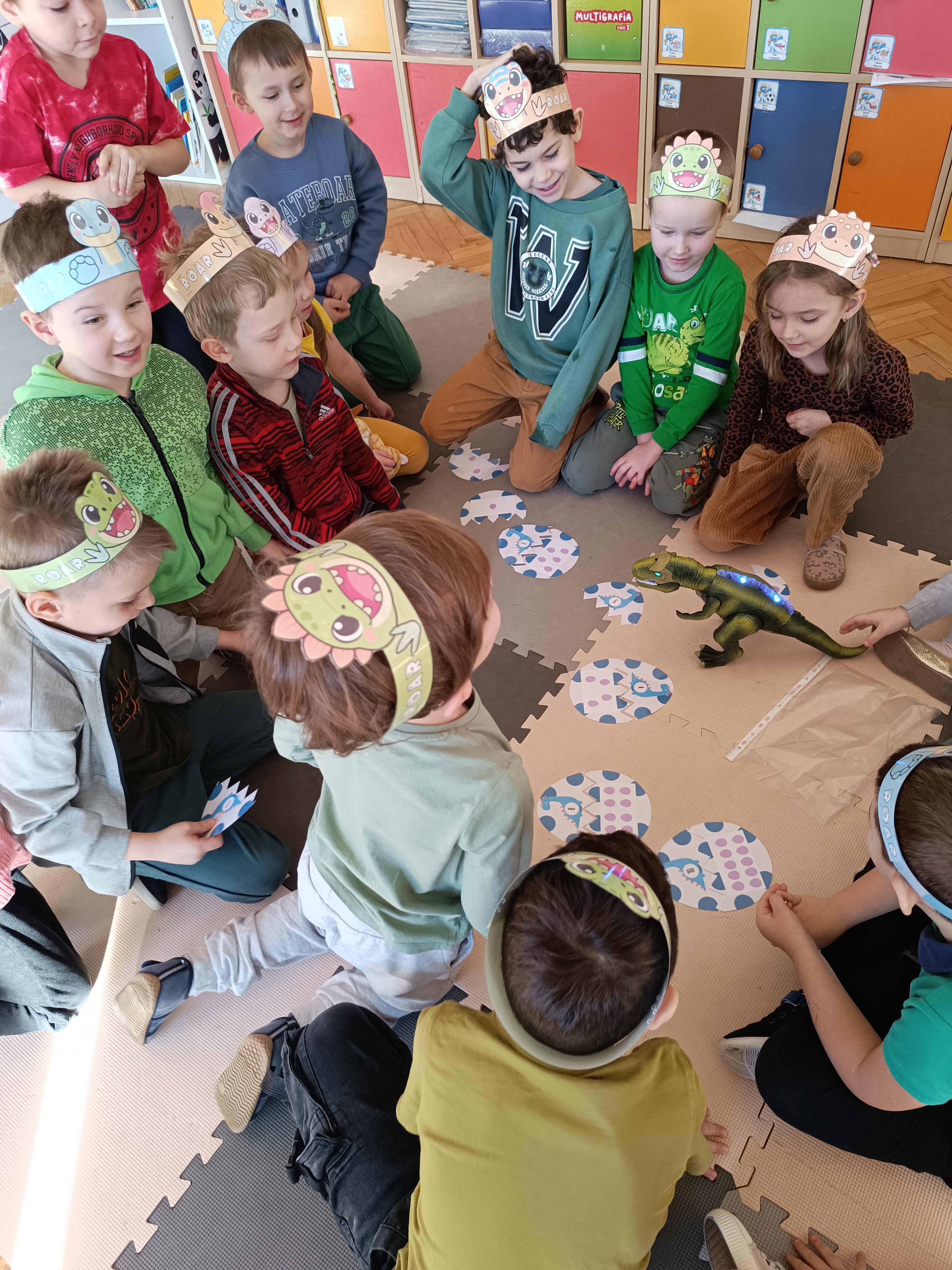 Nie zabrakło również aktywności rozwijających logiczne myślenie i współpracę. Dzieci układały puzzle, które po połączeniu wszystkich elementów tworzyły wielki odcisk stopy dinozaura. Z dużym zaangażowaniem grały w memory dinozaurów, ćwicząc pamięć i koncentrację. Podczas zabaw matematycznych przeliczały elementy na papierowych jajkach oraz dopasowywały do siebie odpowiednie połówki jajek, łącząc je w całość.