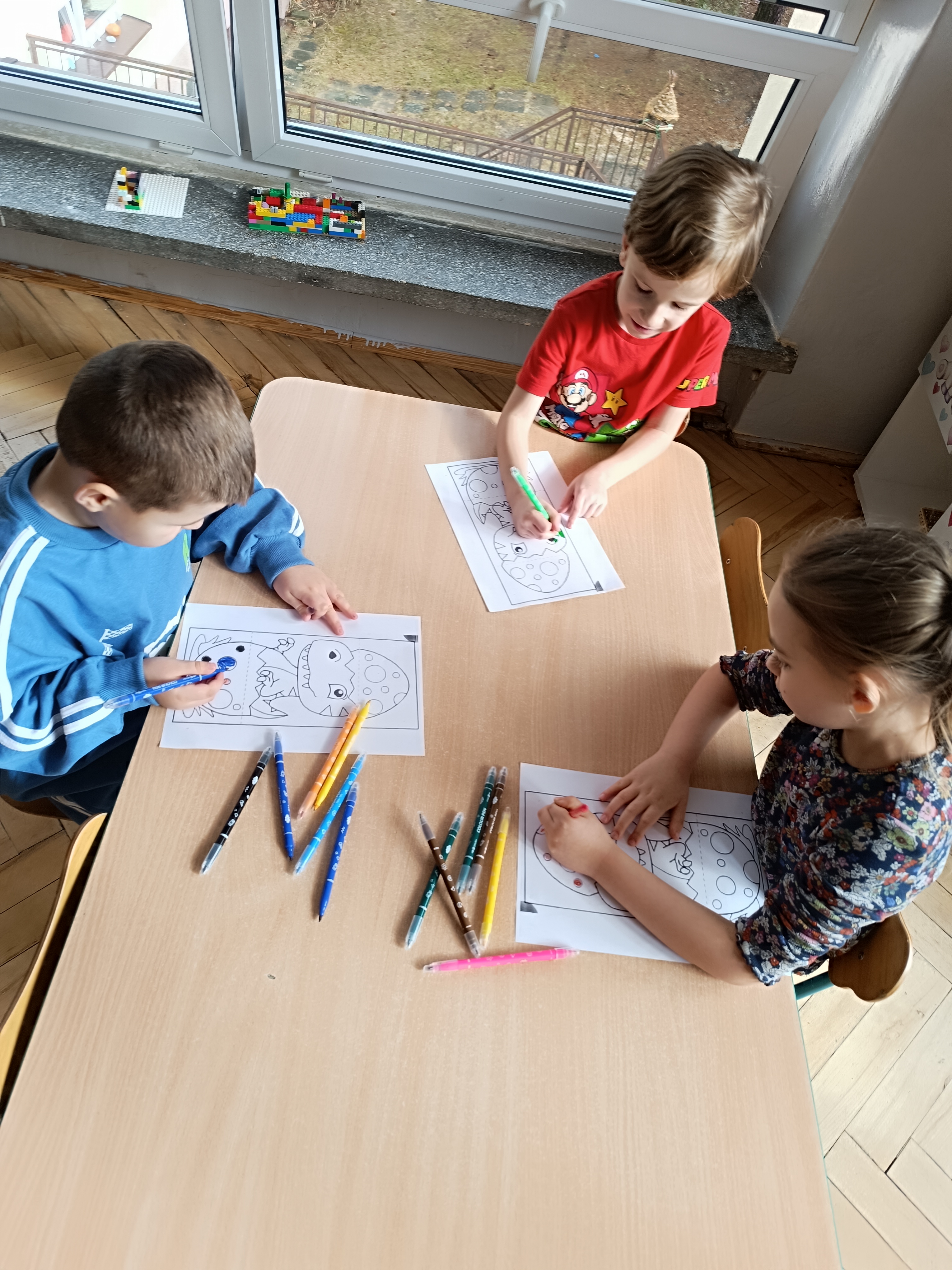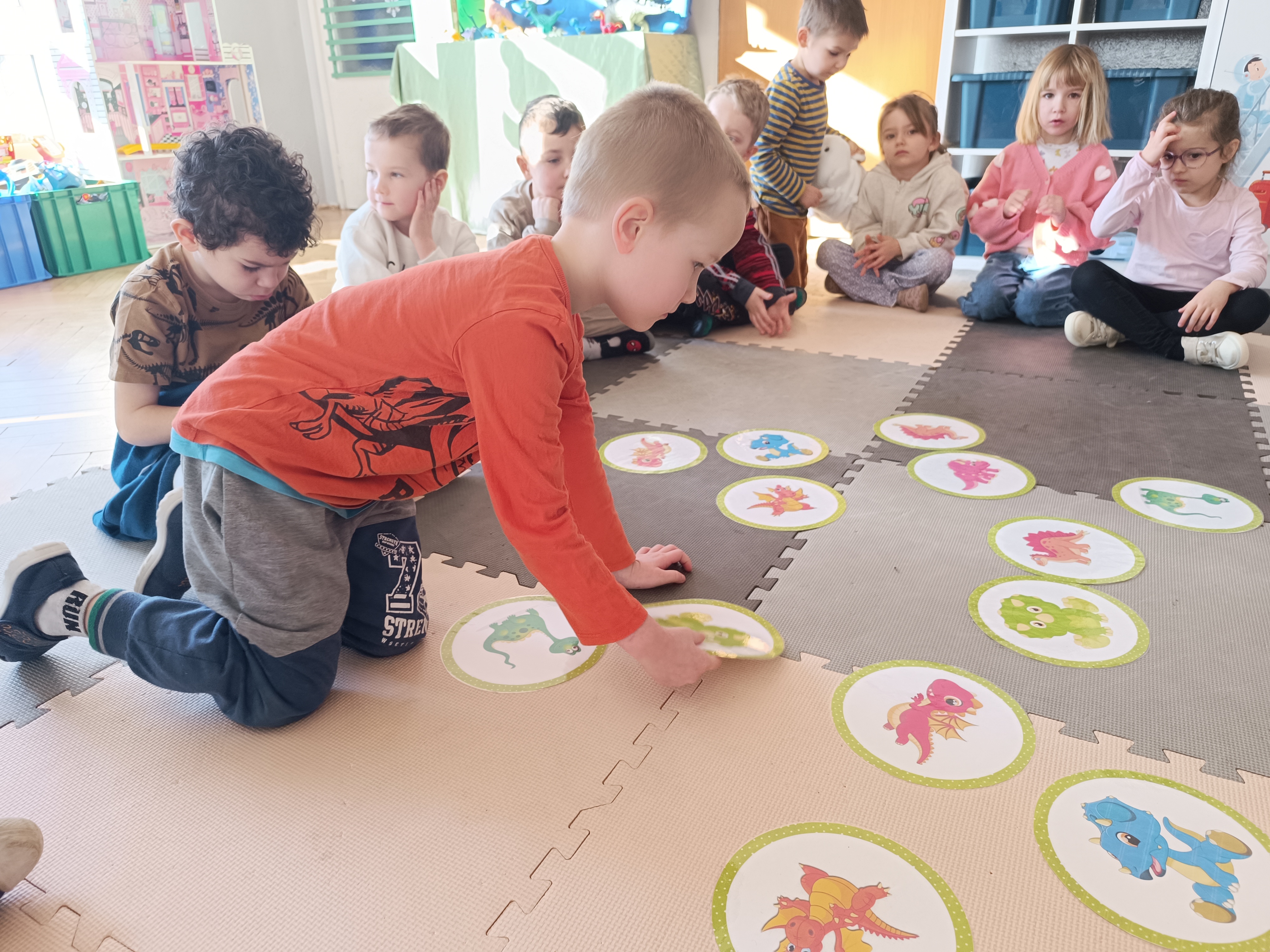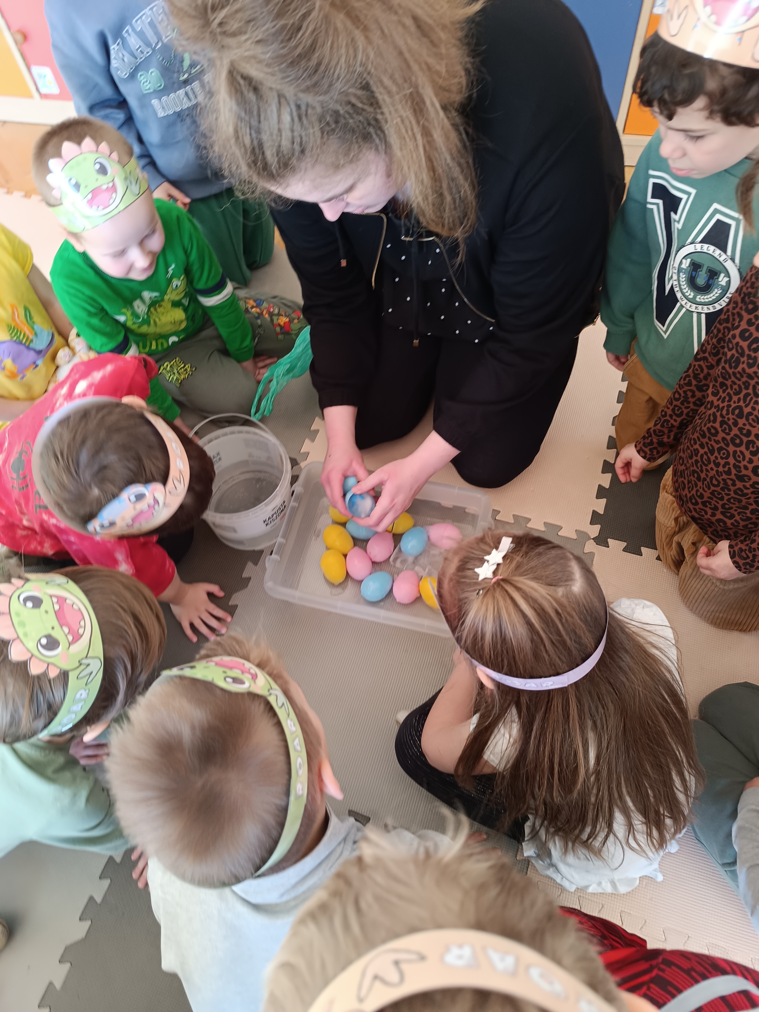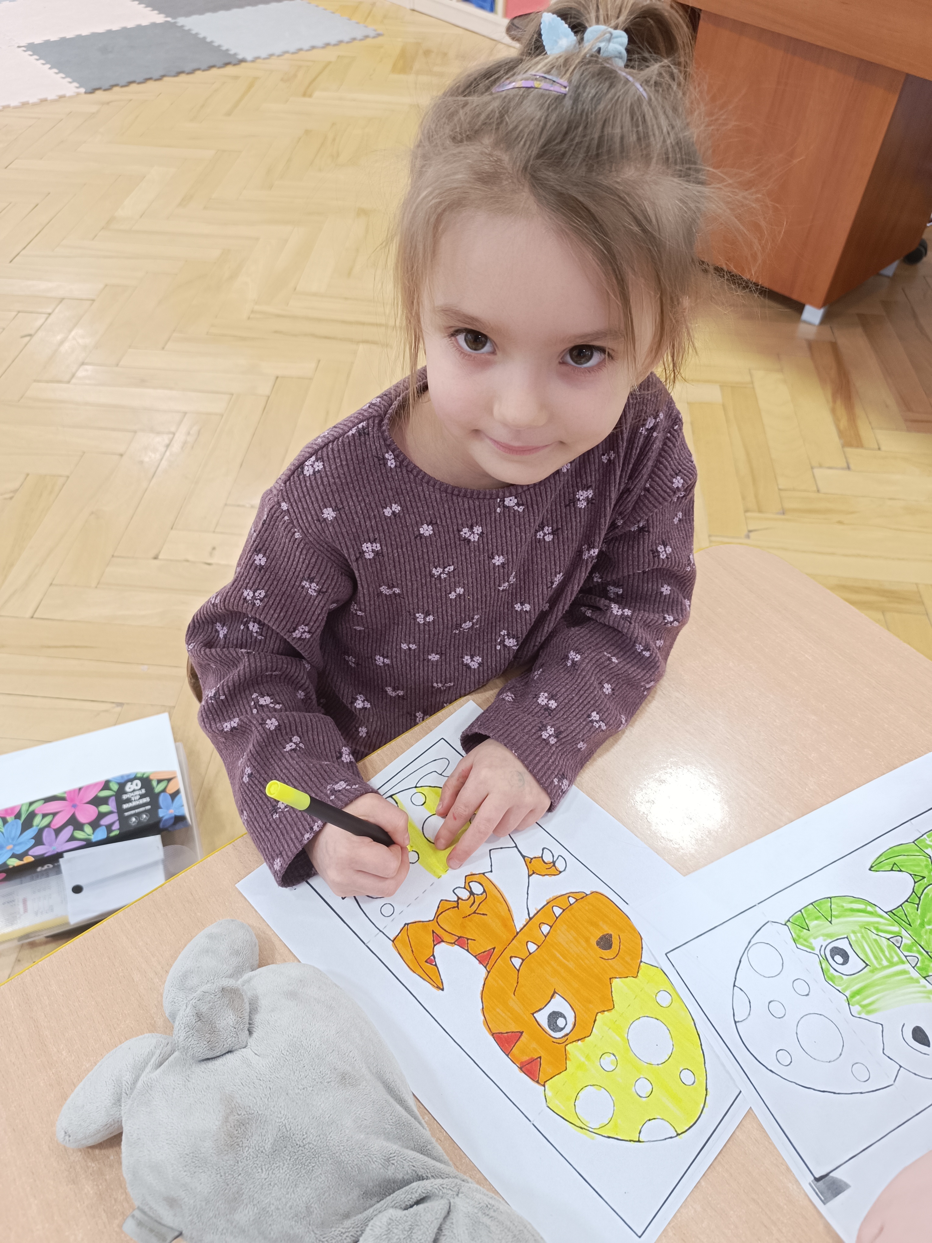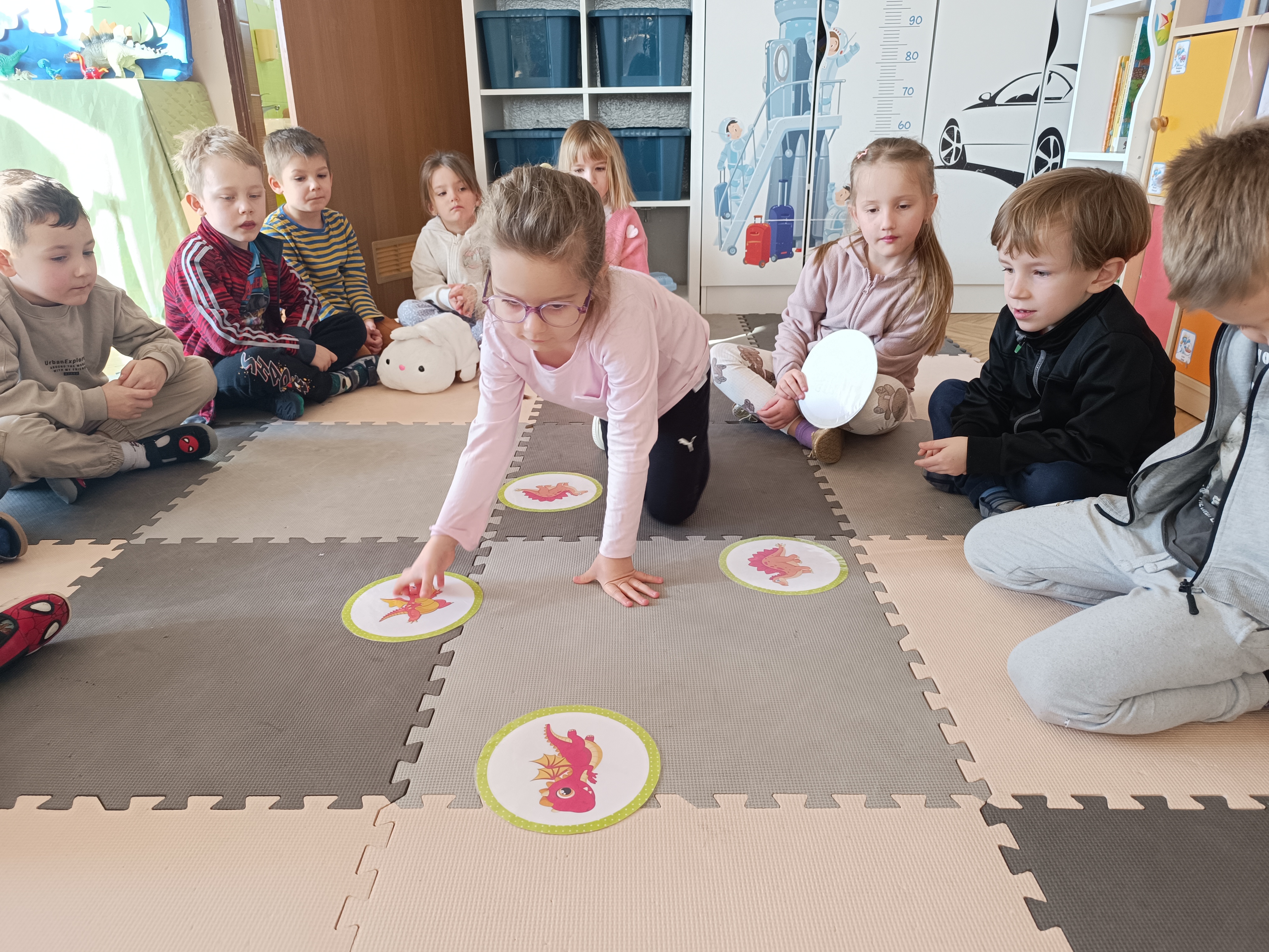 Nie zabrakło również aktywności rozwijających logiczne myślenie i współpracę. Dzieci układały puzzle, które po połączeniu wszystkich elementów tworzyły wielki odcisk stopy dinozaura. Z dużym zaangażowaniem grały w memory dinozaurów, ćwicząc pamięć i koncentrację. Podczas zabaw matematycznych przeliczały elementy na papierowych jajkach oraz dopasowywały do siebie odpowiednie połówki jajek, łącząc je w całość.