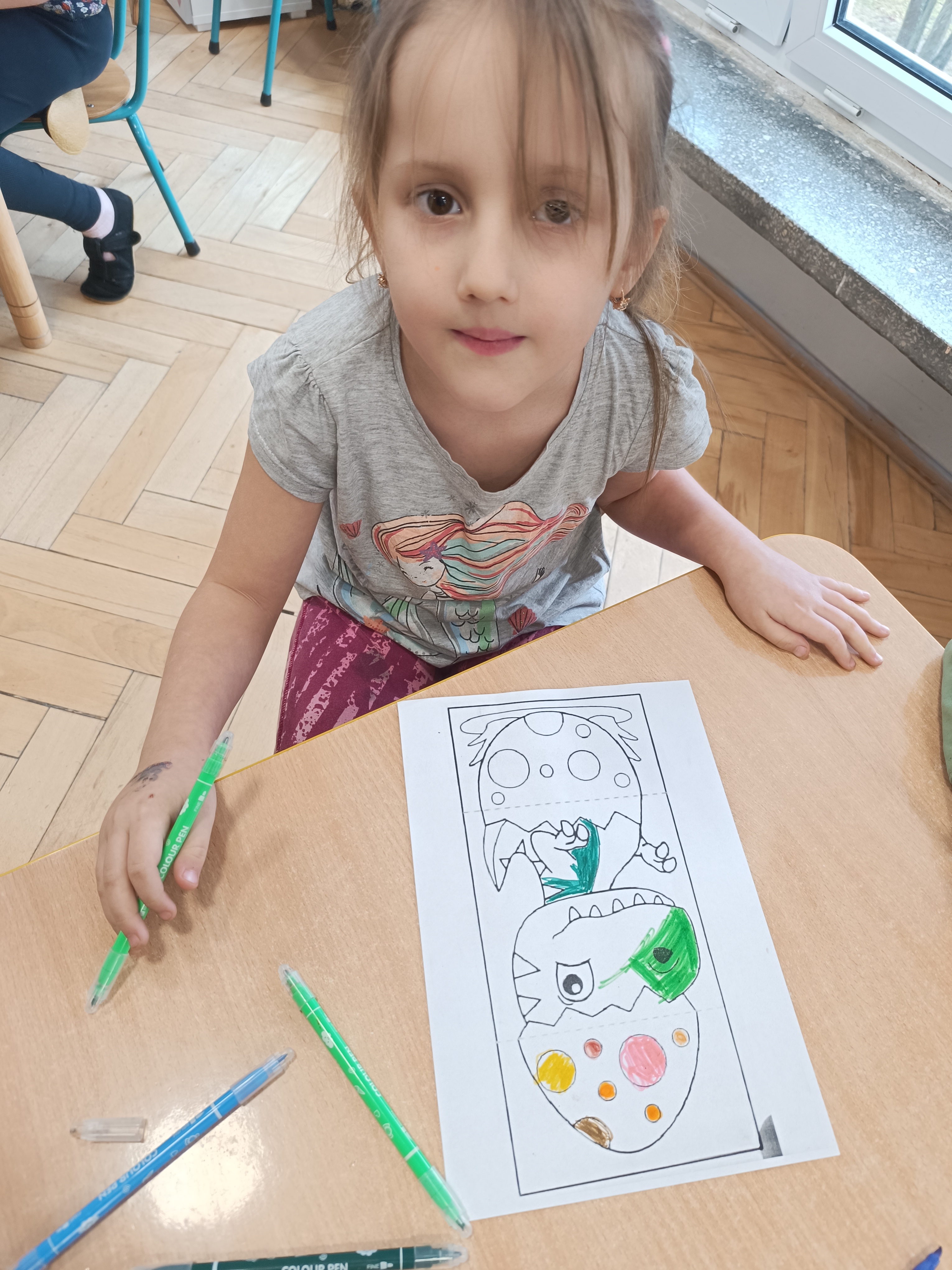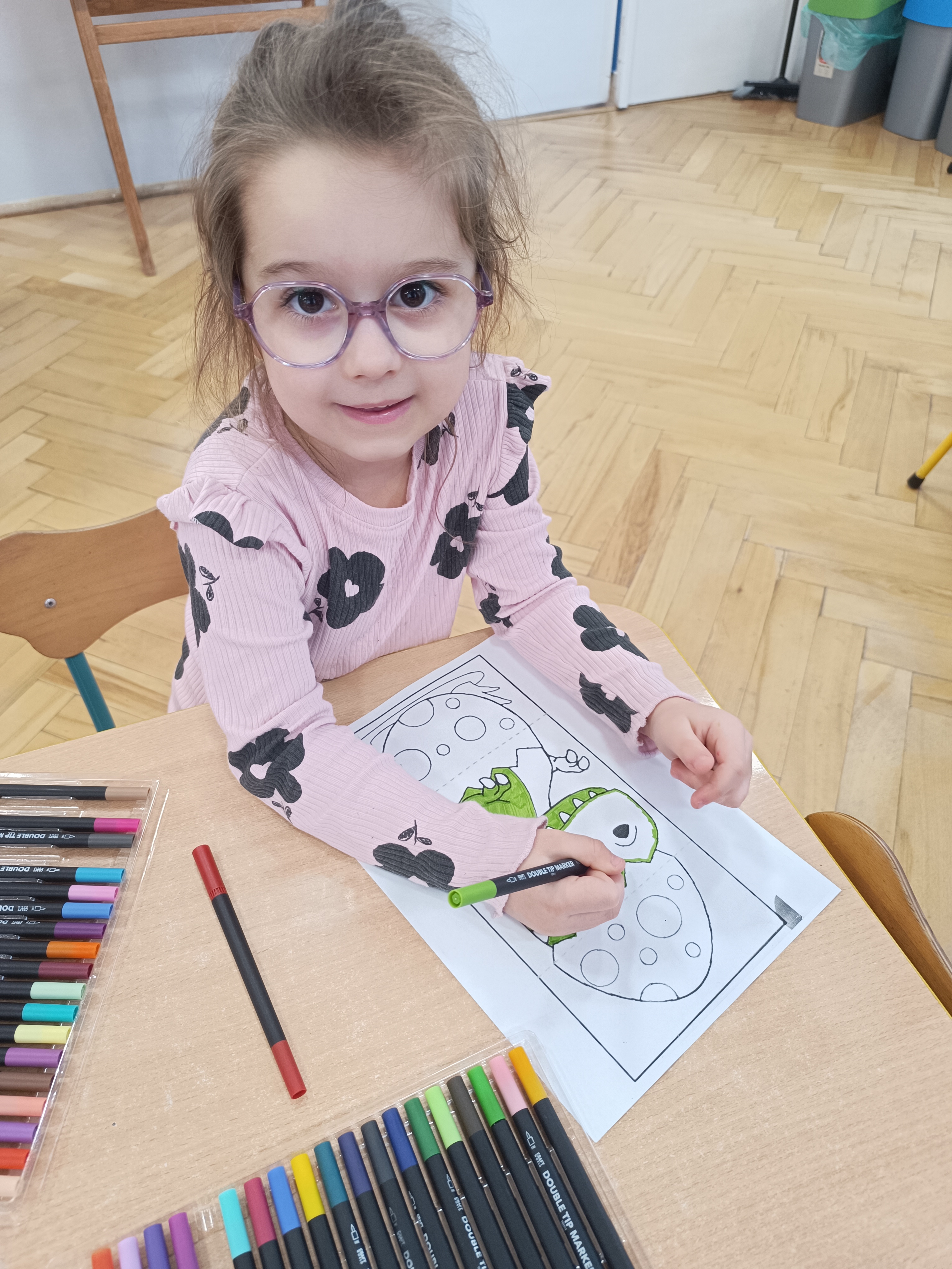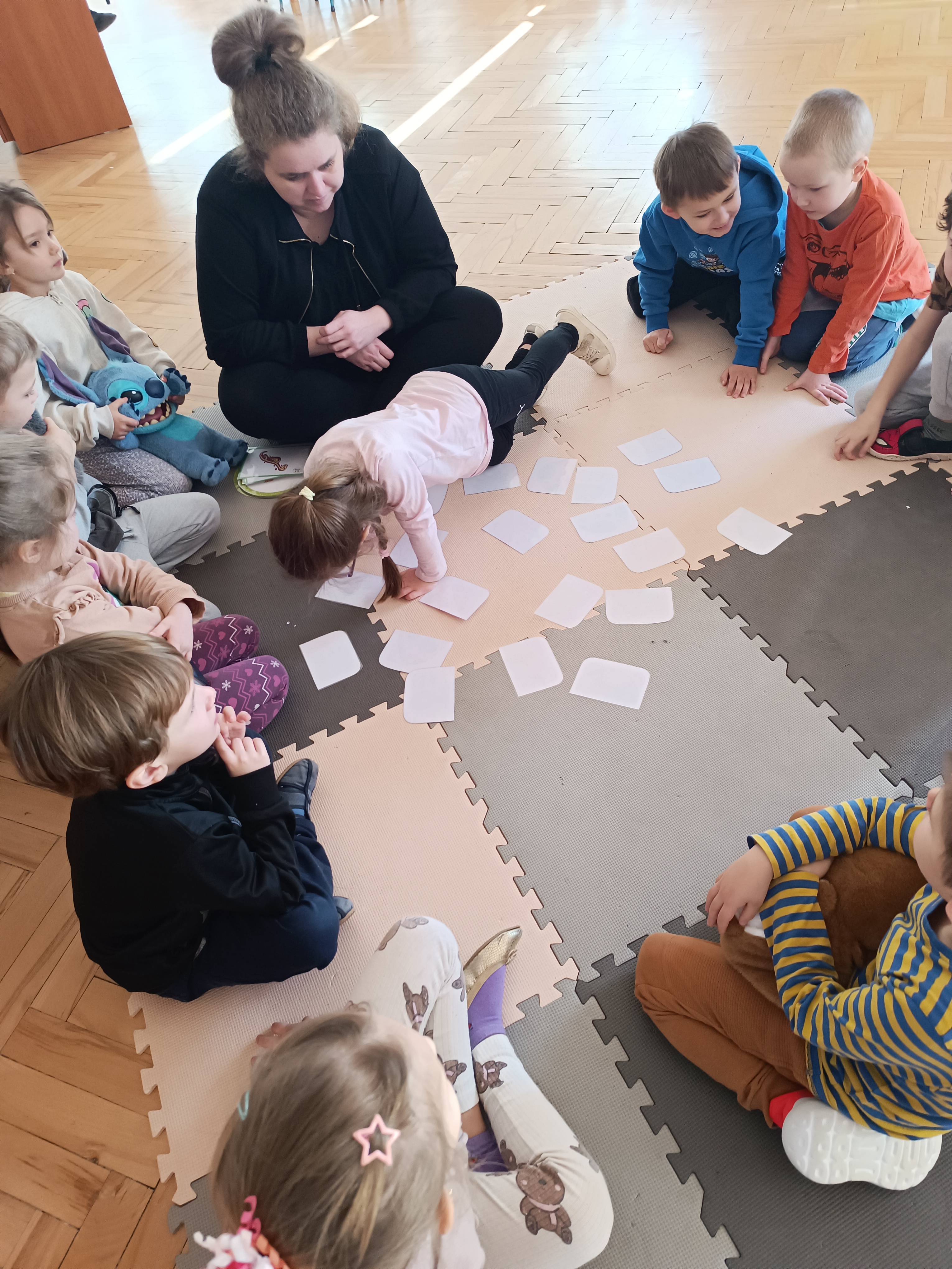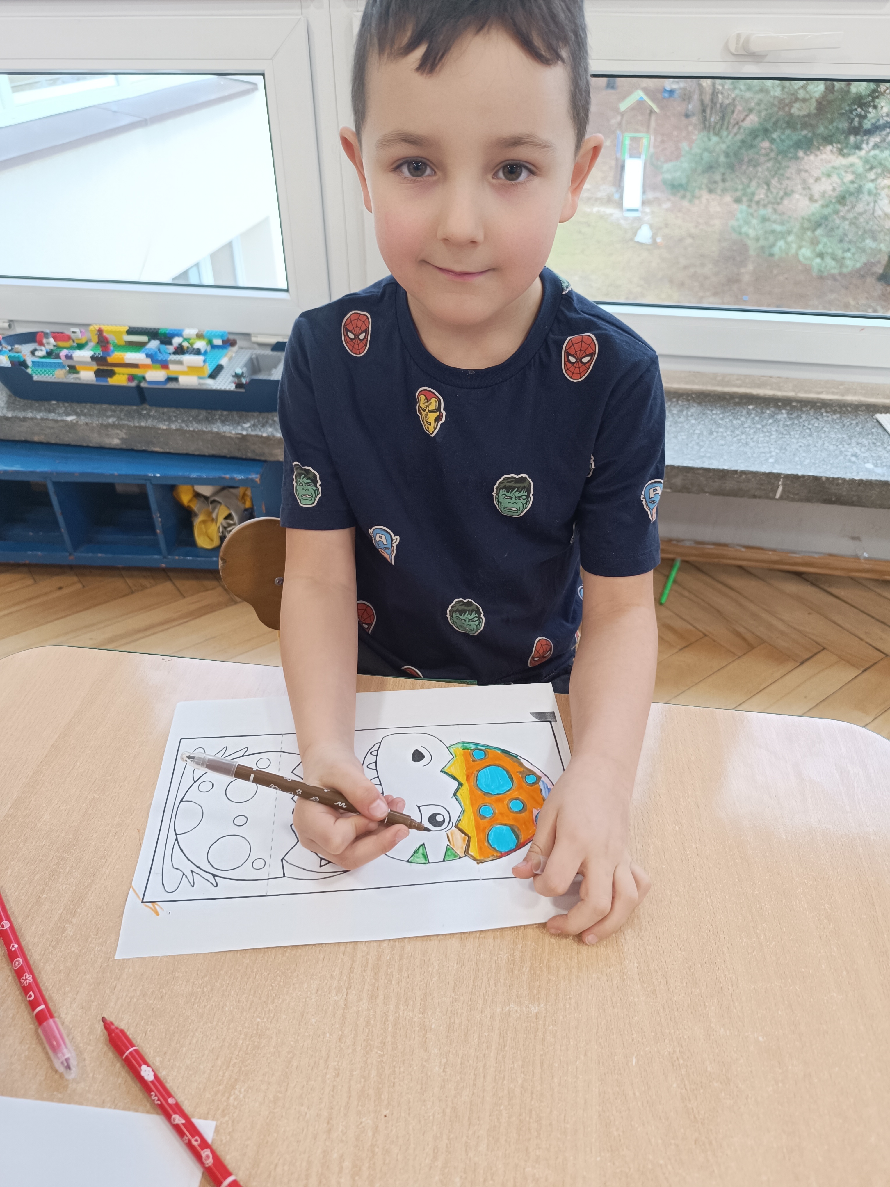 Nie zabrakło również aktywności rozwijających logiczne myślenie i współpracę. Dzieci układały puzzle, które po połączeniu wszystkich elementów tworzyły wielki odcisk stopy dinozaura. Z dużym zaangażowaniem grały w memory dinozaurów, ćwicząc pamięć i koncentrację. Podczas zabaw matematycznych przeliczały elementy na papierowych jajkach oraz dopasowywały do siebie odpowiednie połówki jajek, łącząc je w całość.