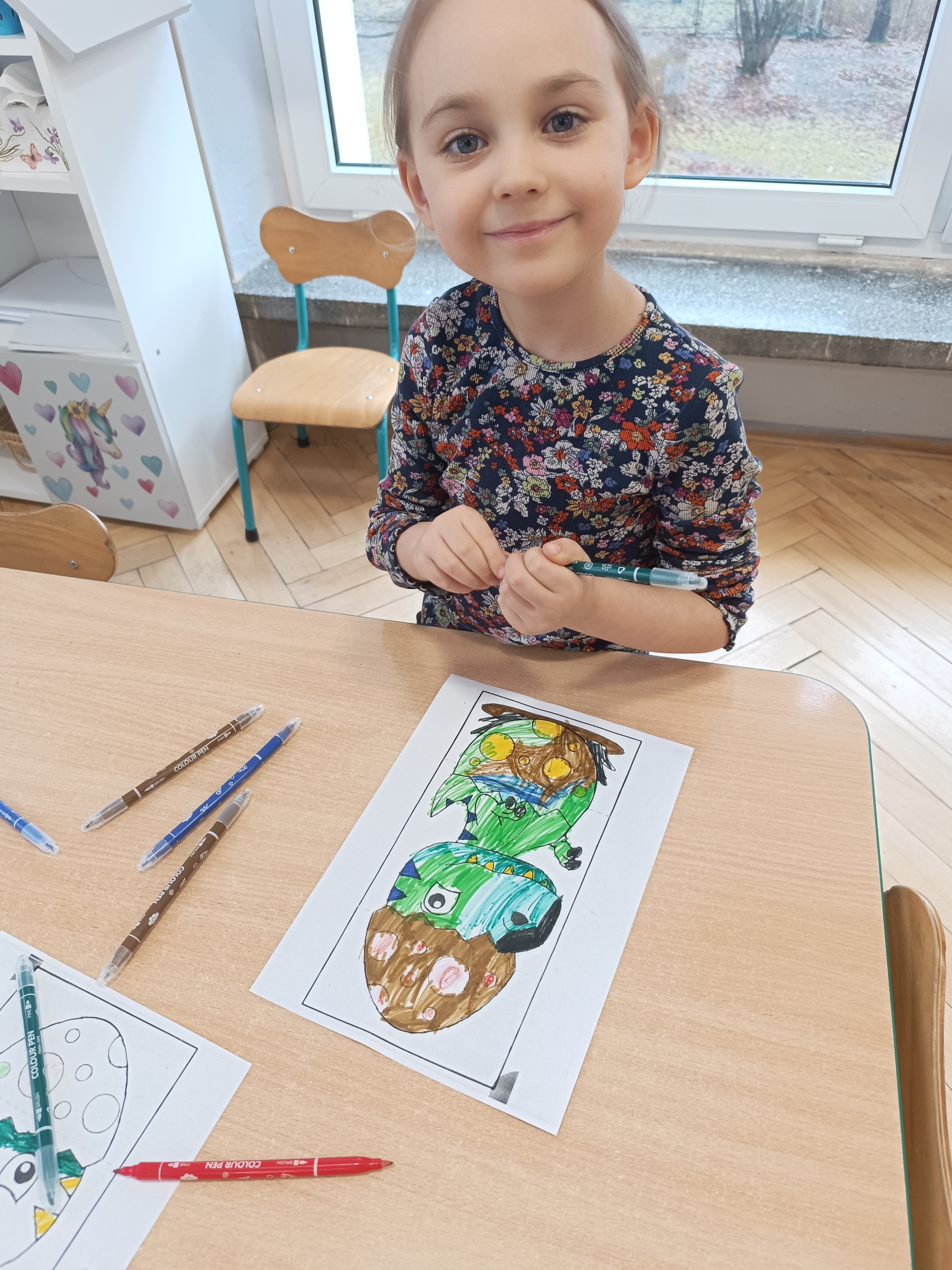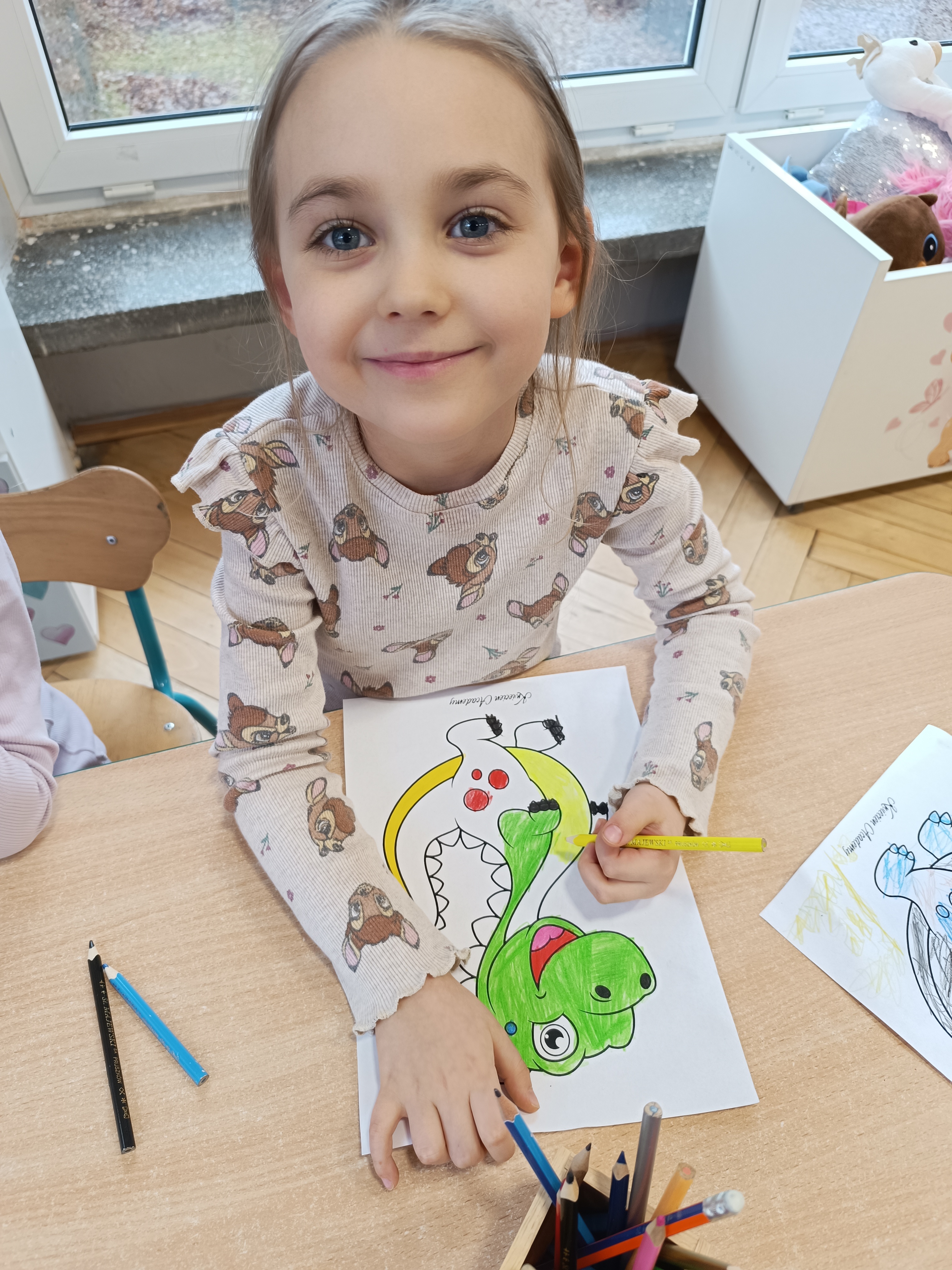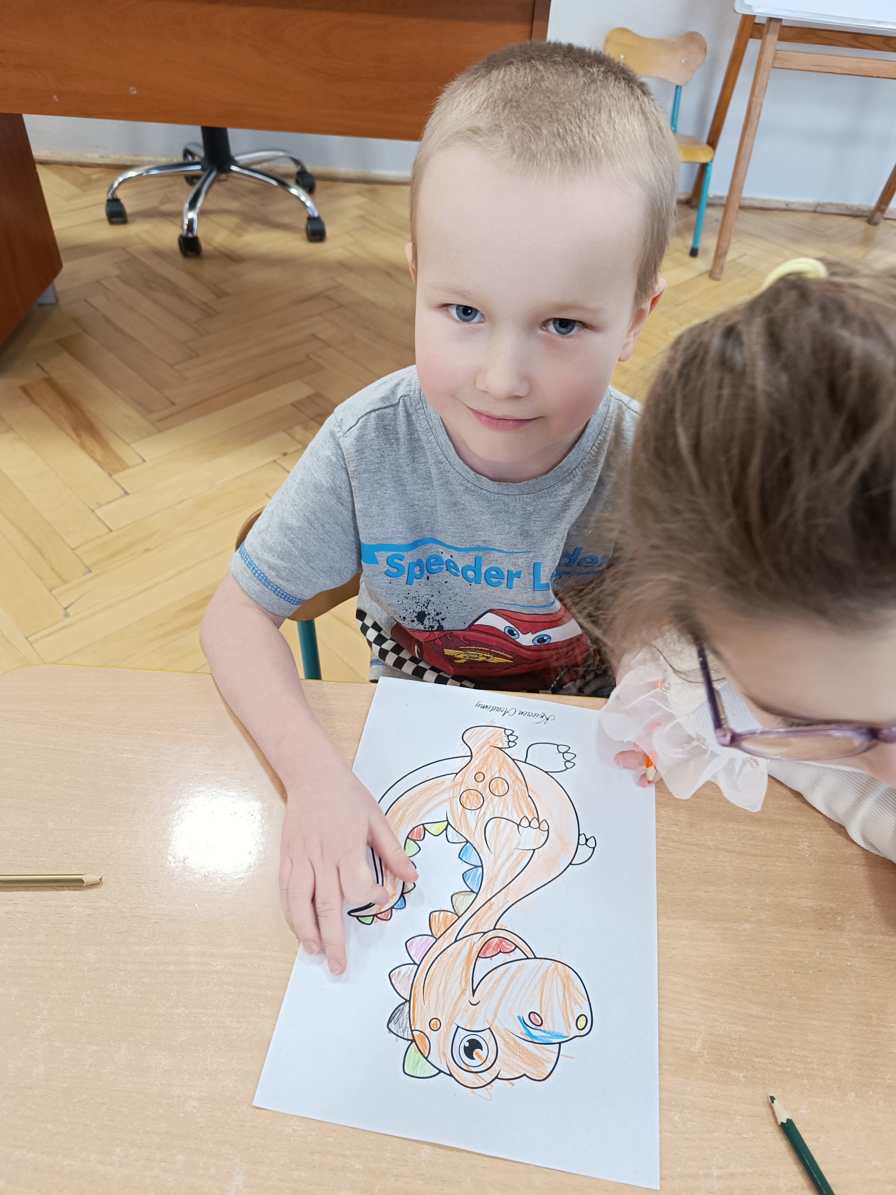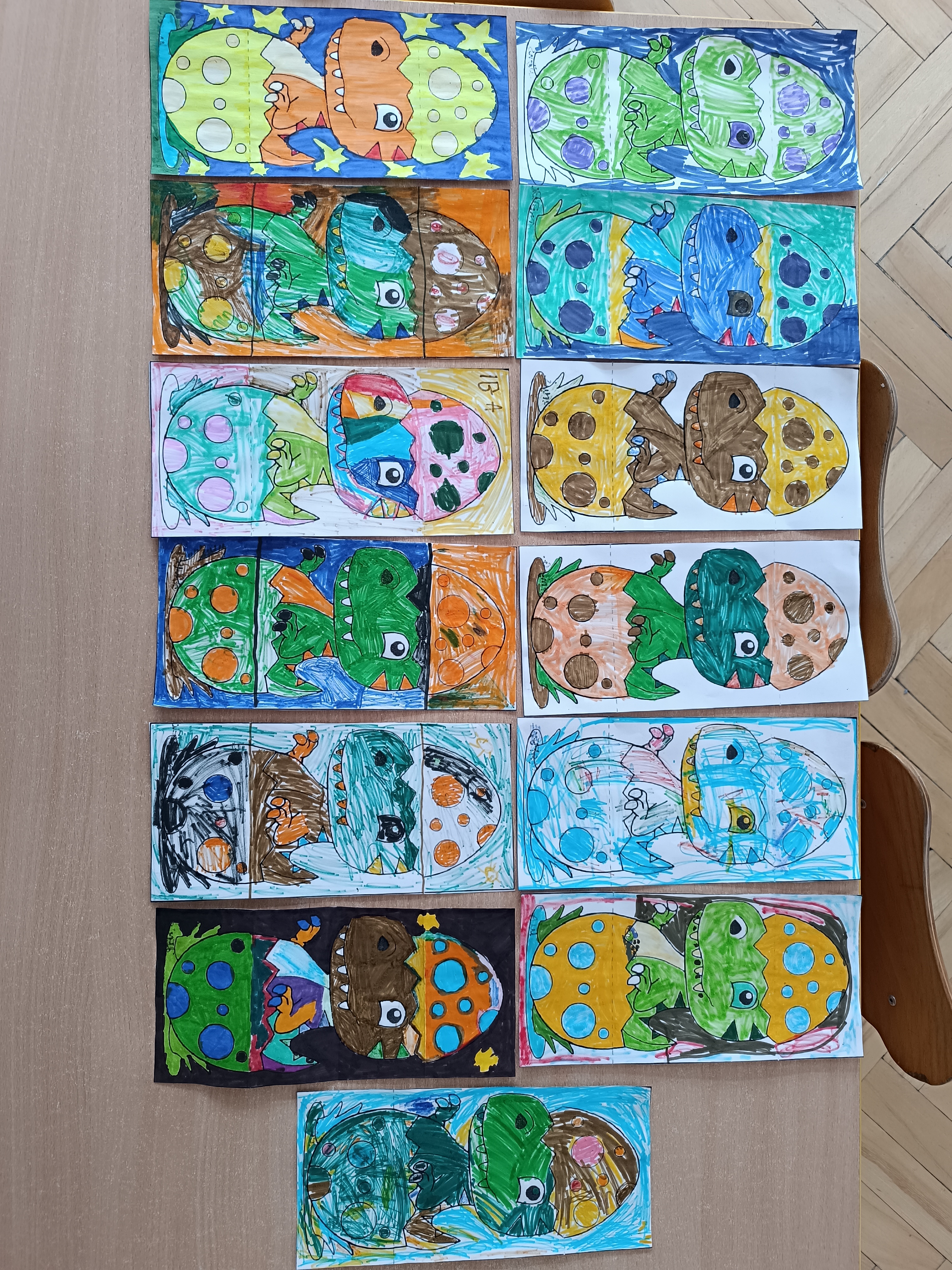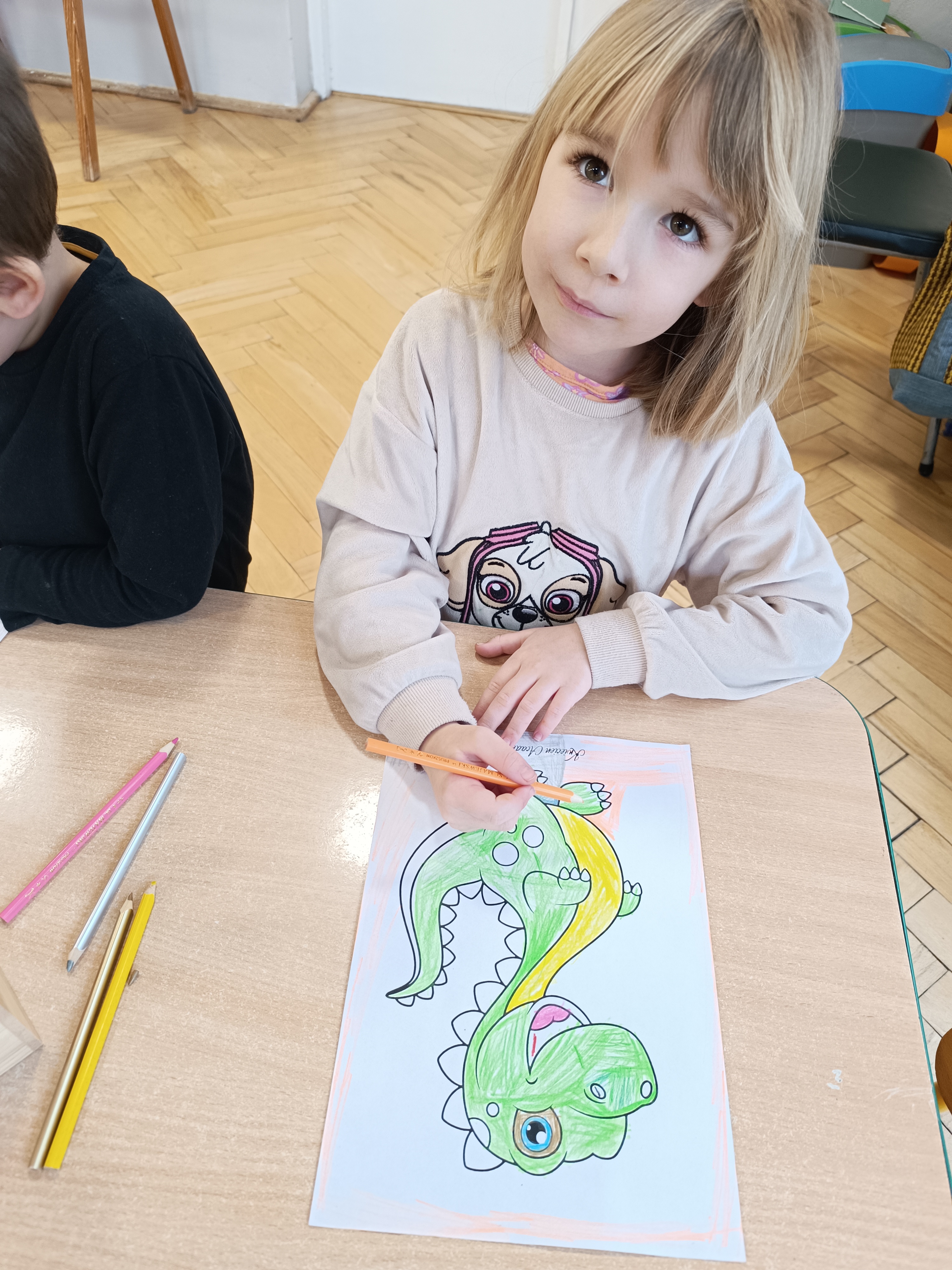 Nie zabrakło również aktywności rozwijających logiczne myślenie i współpracę. Dzieci układały puzzle, które po połączeniu wszystkich elementów tworzyły wielki odcisk stopy dinozaura. Z dużym zaangażowaniem grały w memory dinozaurów, ćwicząc pamięć i koncentrację. Podczas zabaw matematycznych przeliczały elementy na papierowych jajkach oraz dopasowywały do siebie odpowiednie połówki jajek, łącząc je w całość.