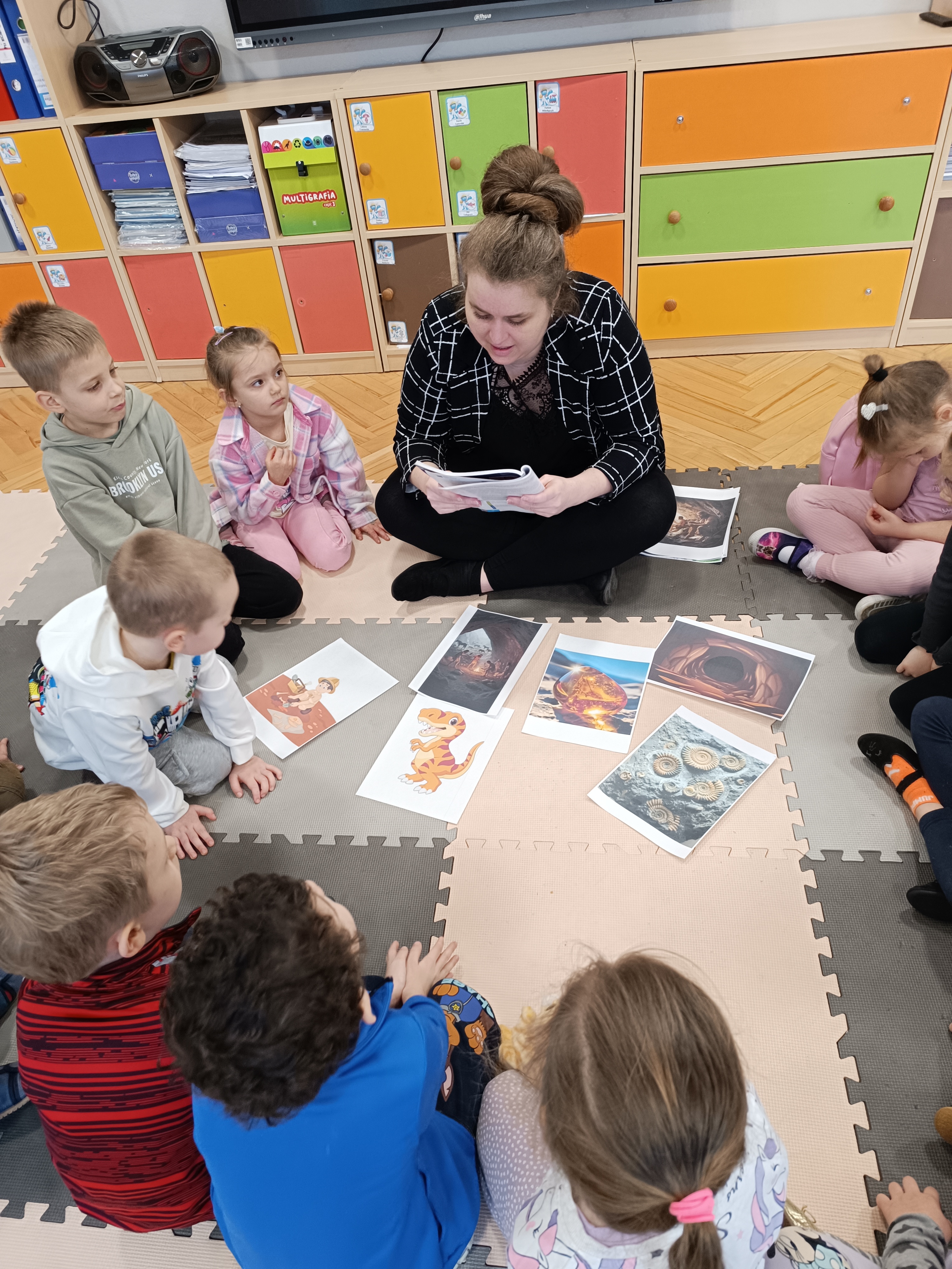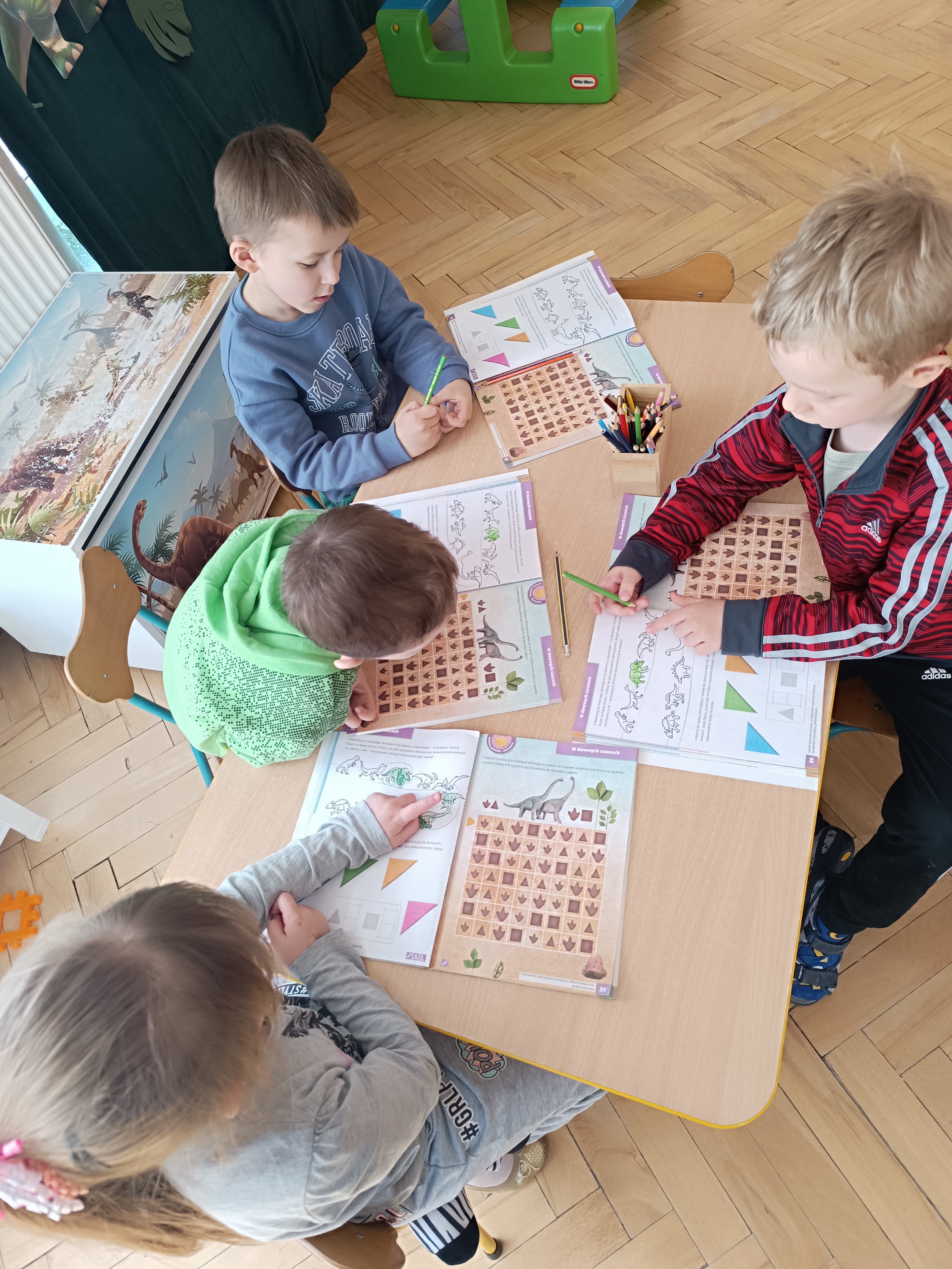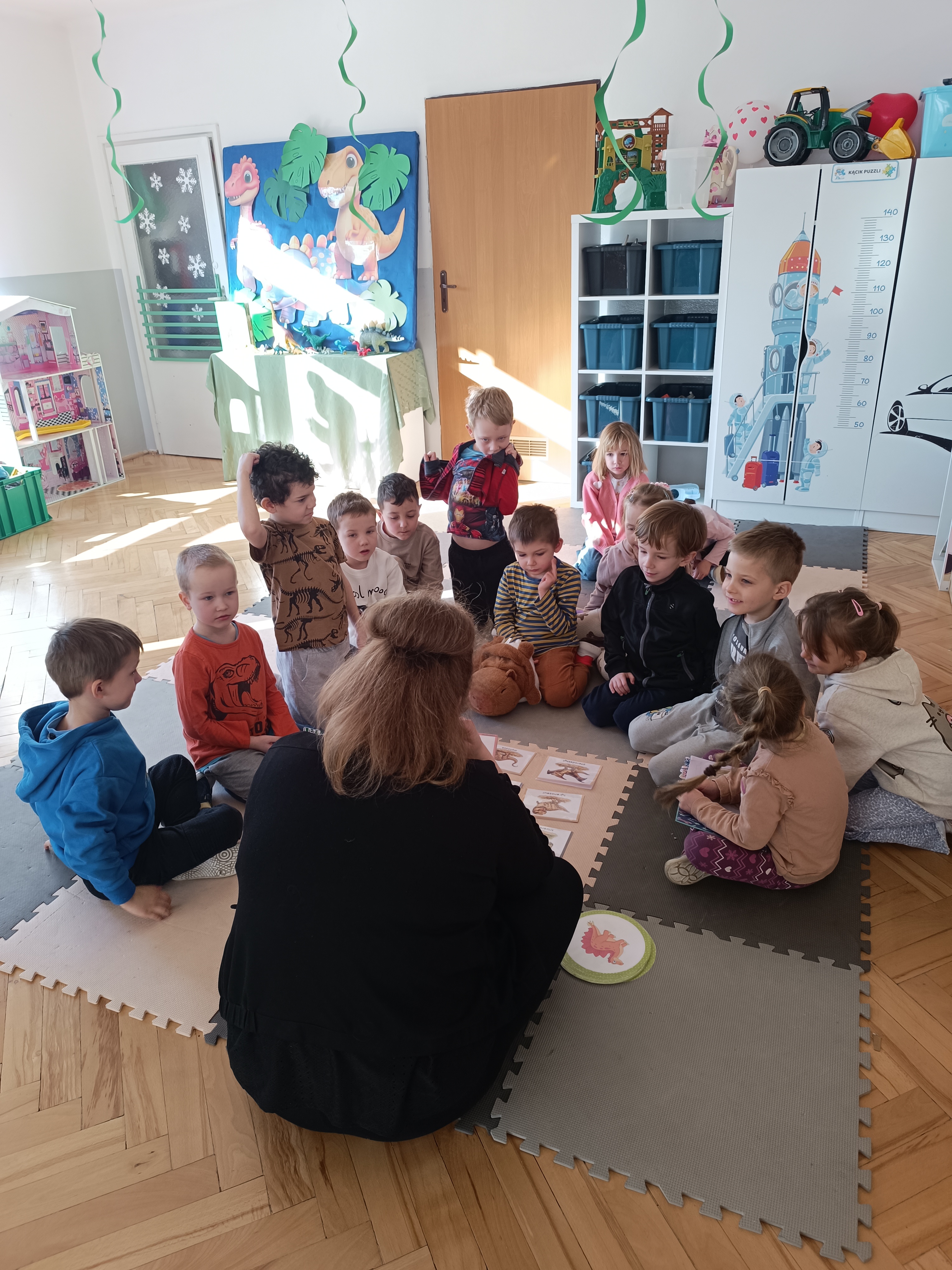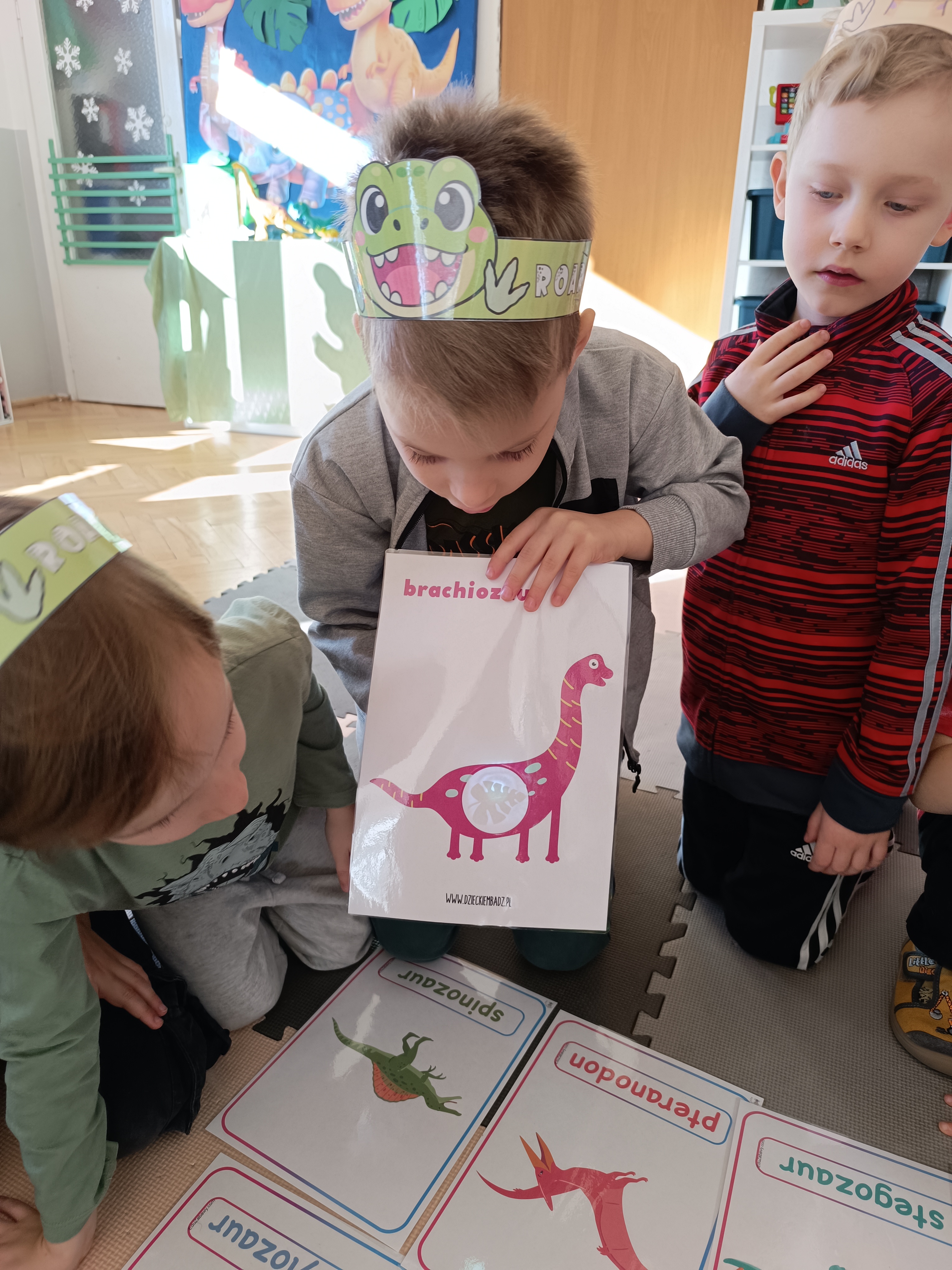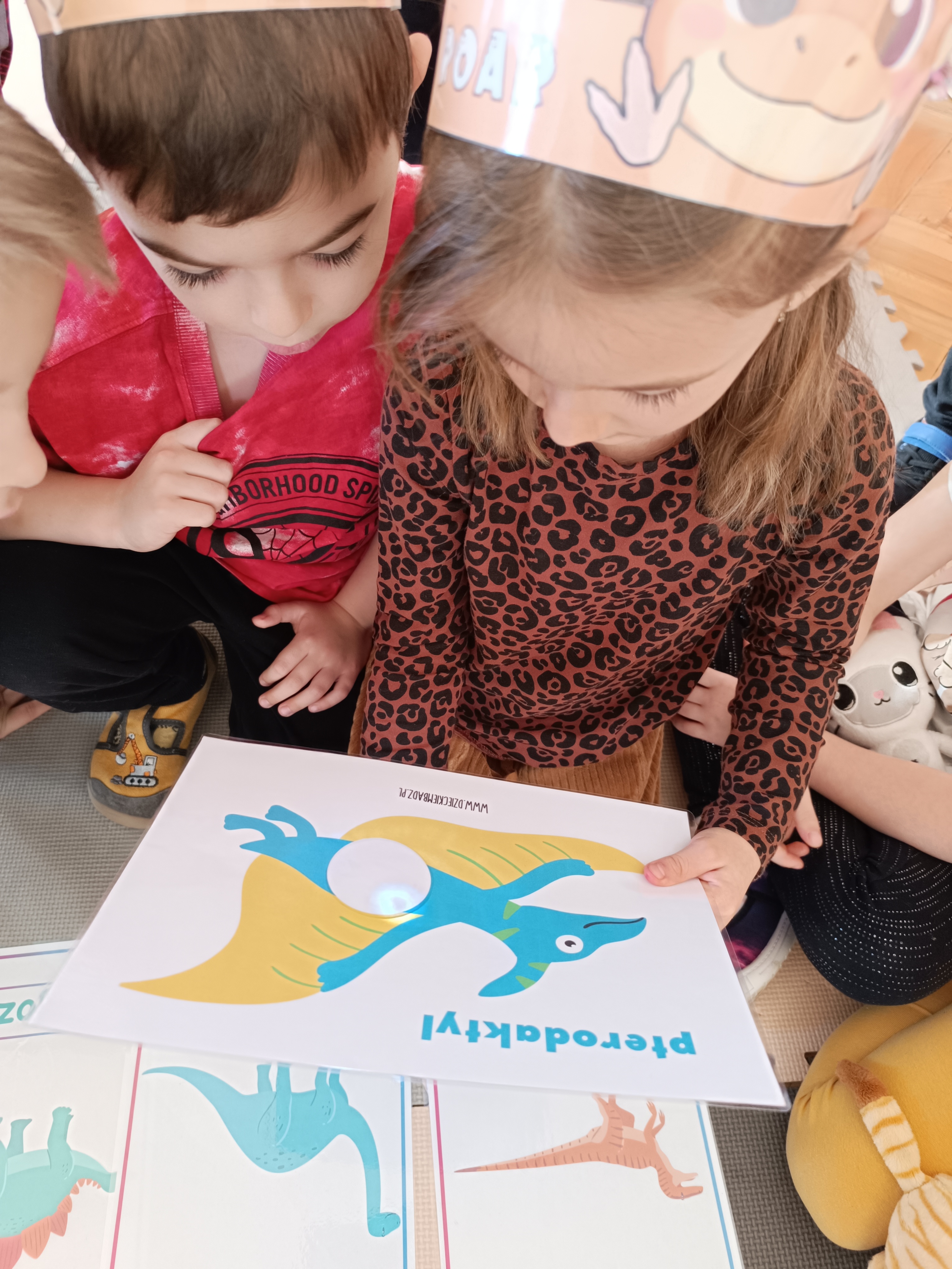 Rozmawialiśmy o tym, jak kiedyś wyglądał świat – dzieci dowiedziały się, że nasza planeta zmieniała się przez miliony lat. Poznały również stworzenia z przeszłości, w szczególności dinozaury, które wzbudziły ogromne zainteresowanie.