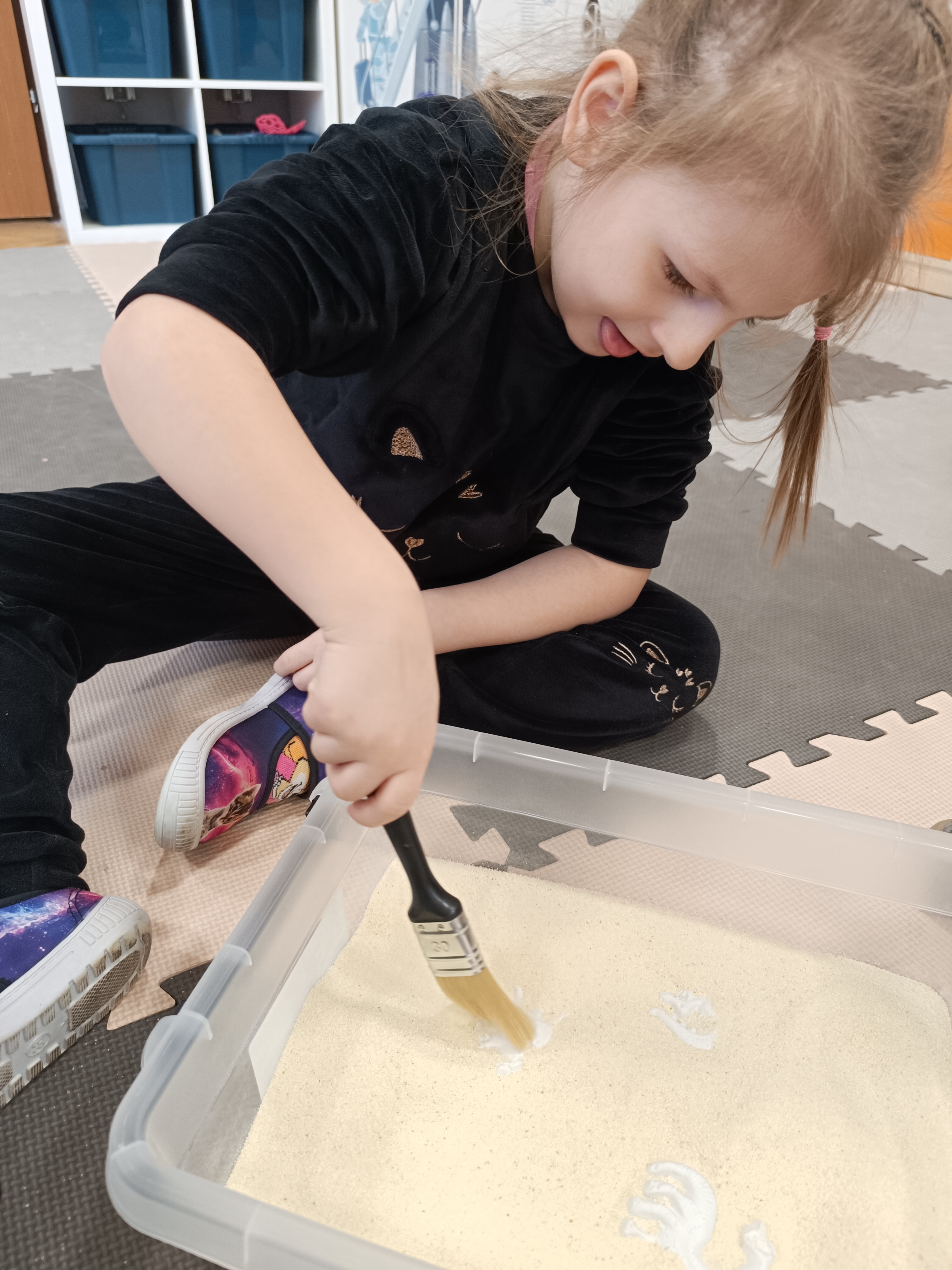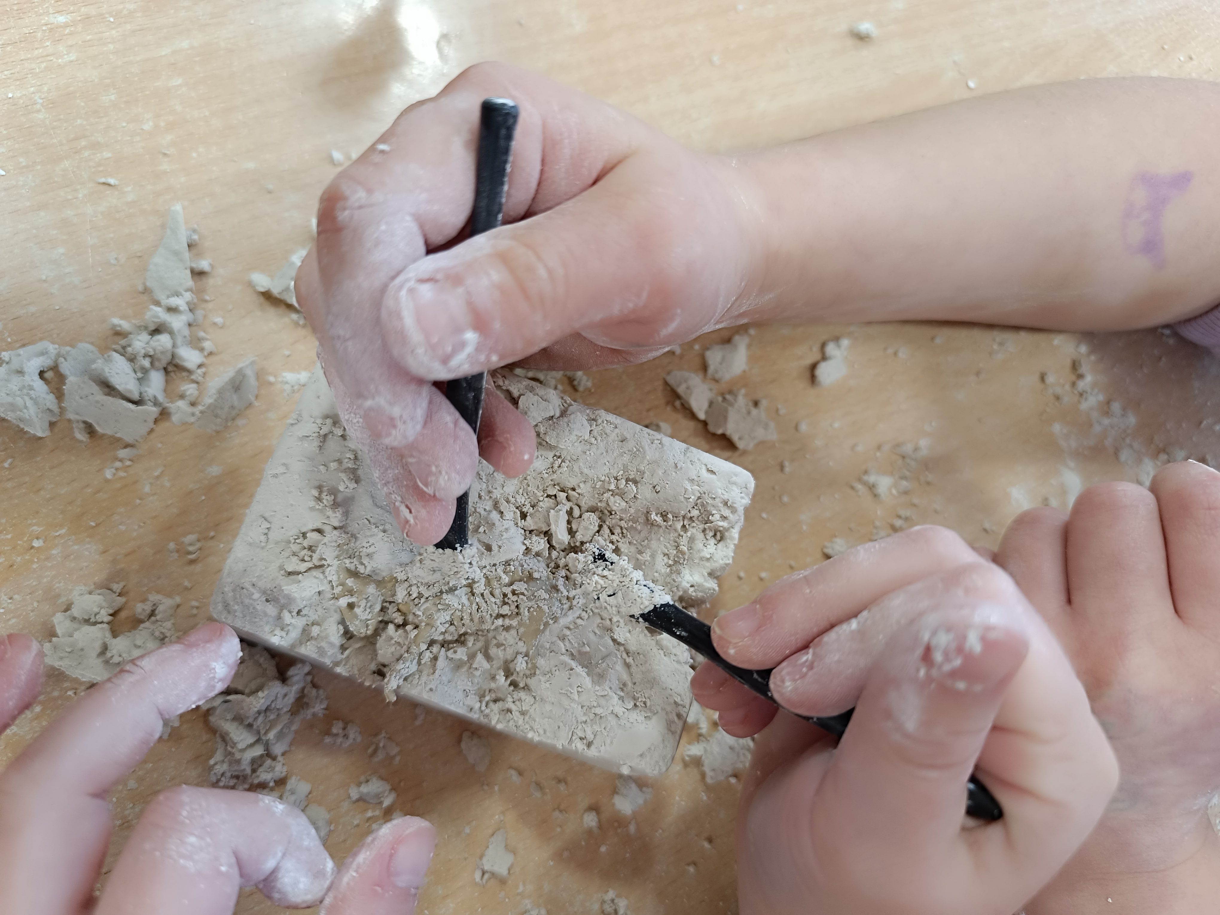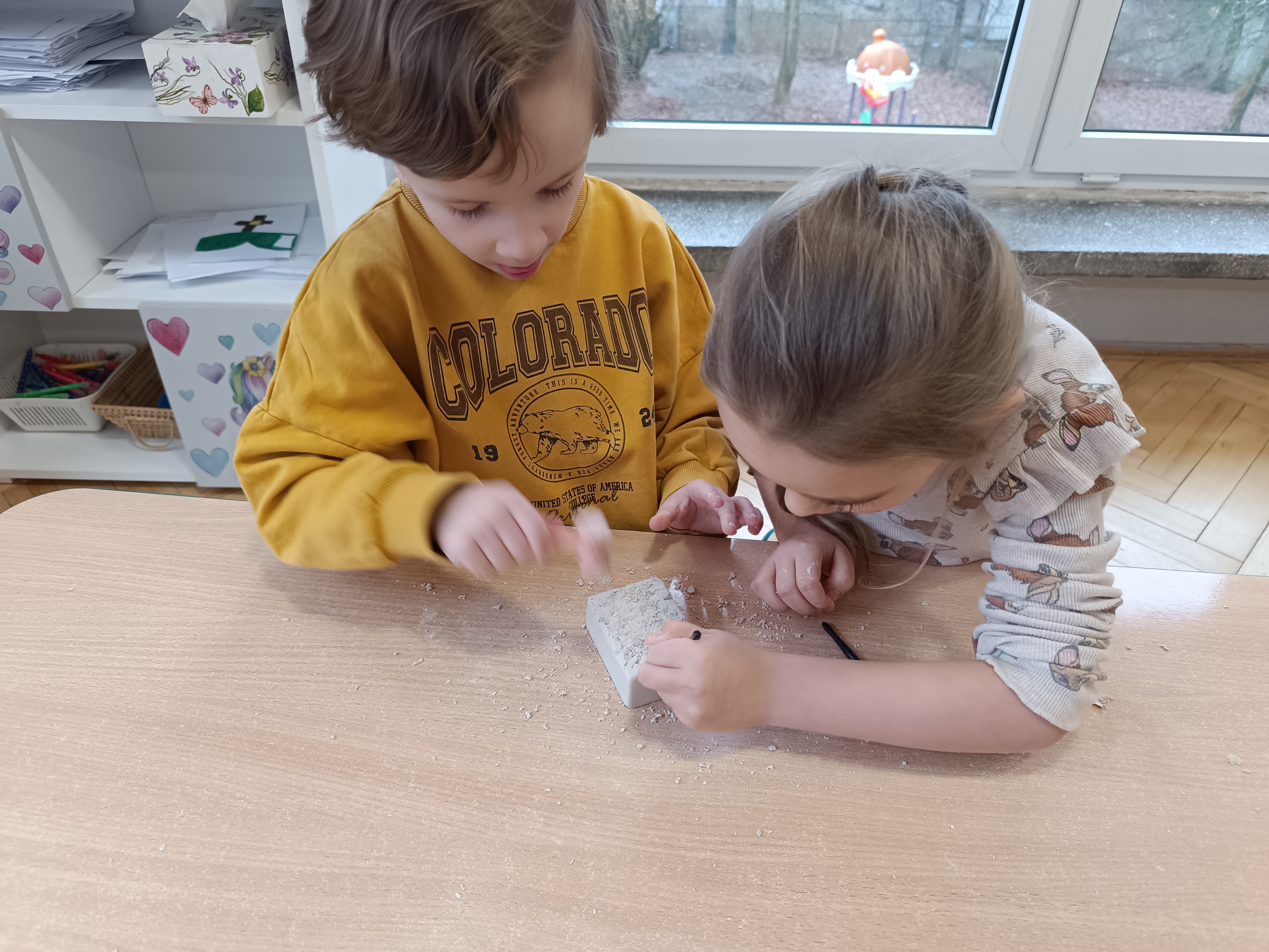 Podążaliśmy również śladami dinozaurów, poznając ich zwyczaje i środowisko życia. Rozmawialiśmy o epoce lodowcowej oraz o tym, jak zmieniał się klimat na przestrzeni dziejów. Dzieci poznały także elementy pradawnej sztuki.