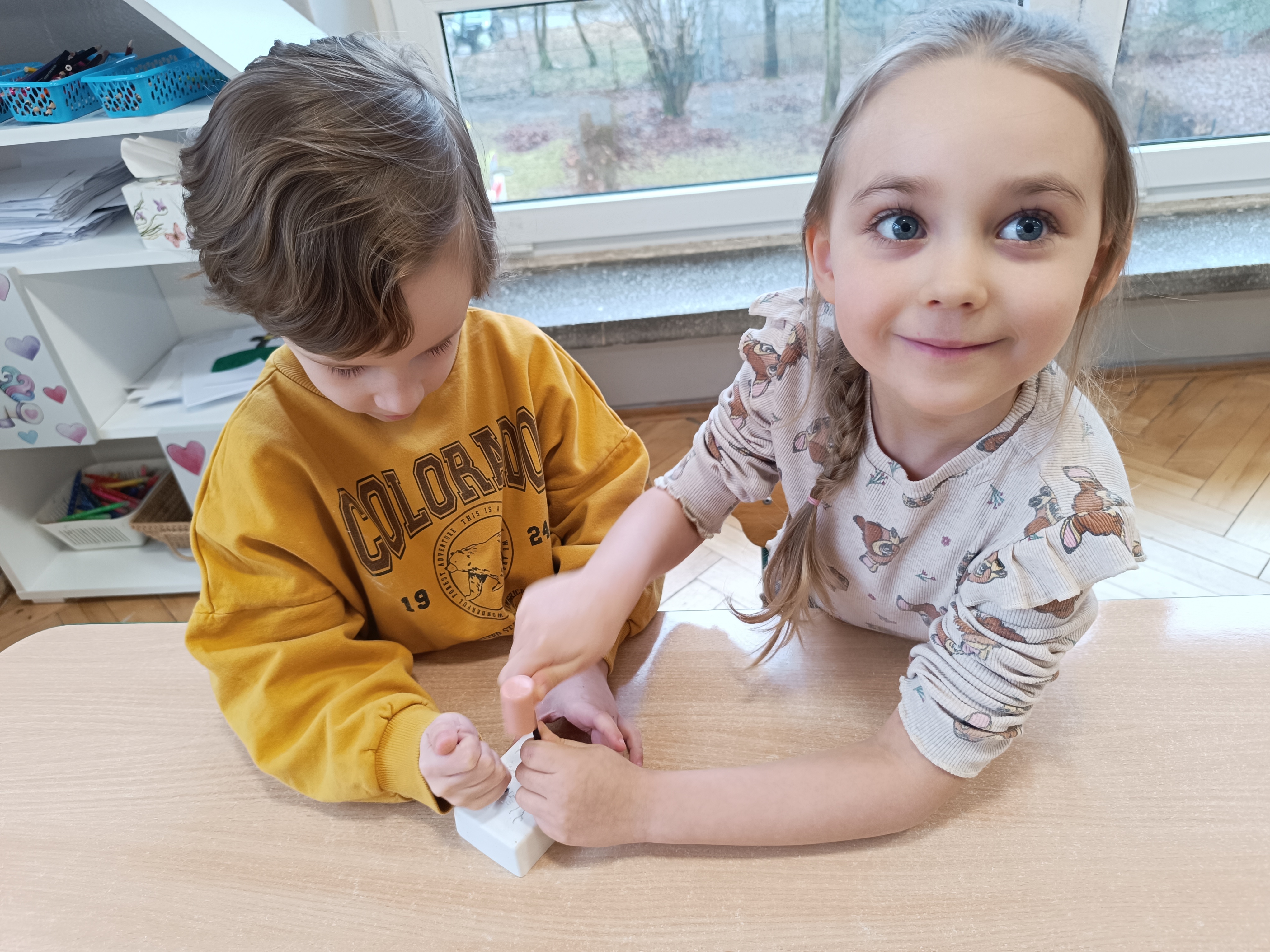 W tym tygodniu wprowadziliśmy również literę J, j. Dzieci poznały jej wygląd, sposób zapisu oraz słowa rozpoczynające się na tę literę, takie jak: jajo, jeż, jabłko. Ćwiczyliśmy prawidłową wymowę, dzieliliśmy wyrazy na sylaby oraz wyszukiwaliśmy głoskę „j” w różnych słowach.