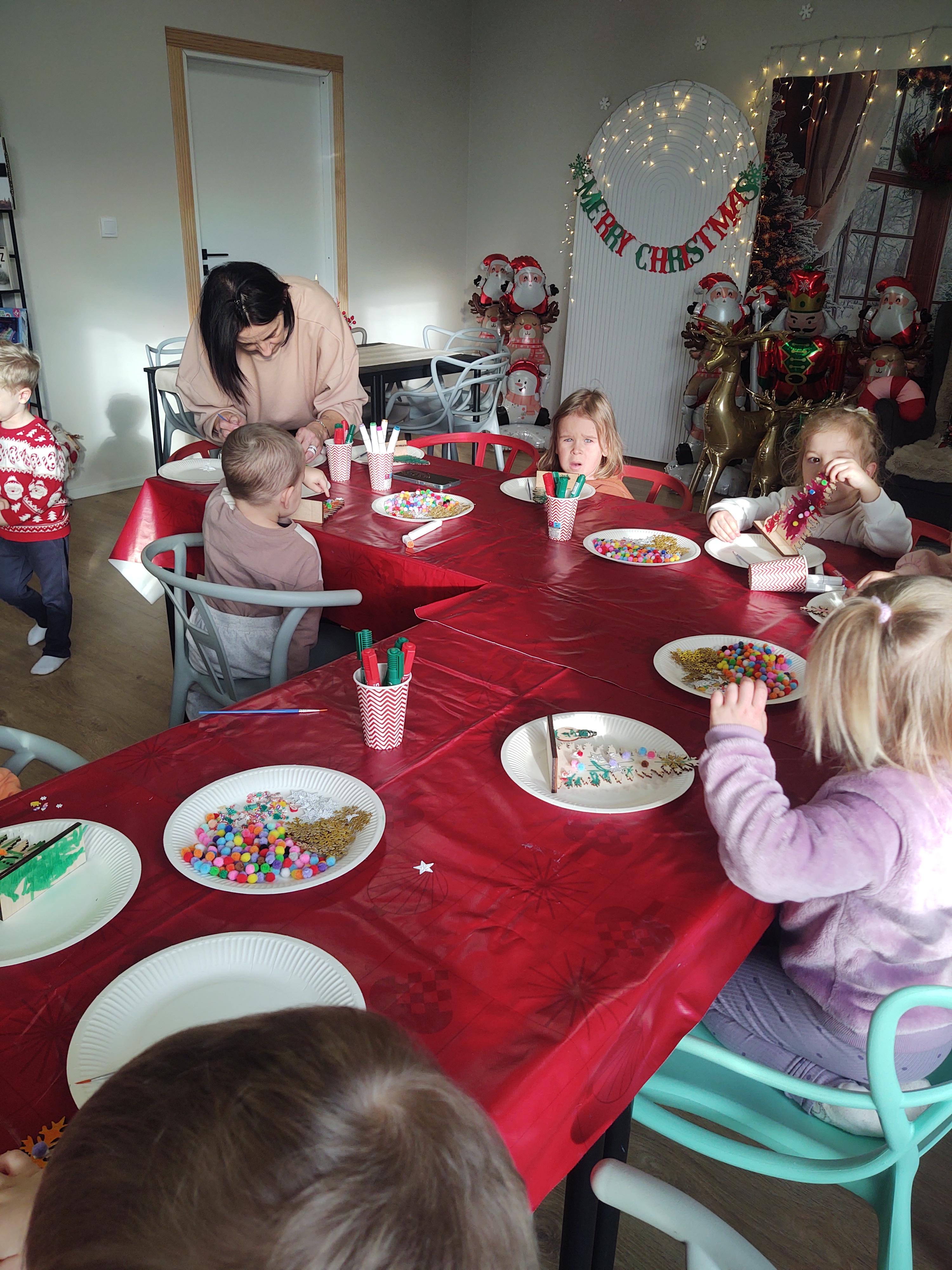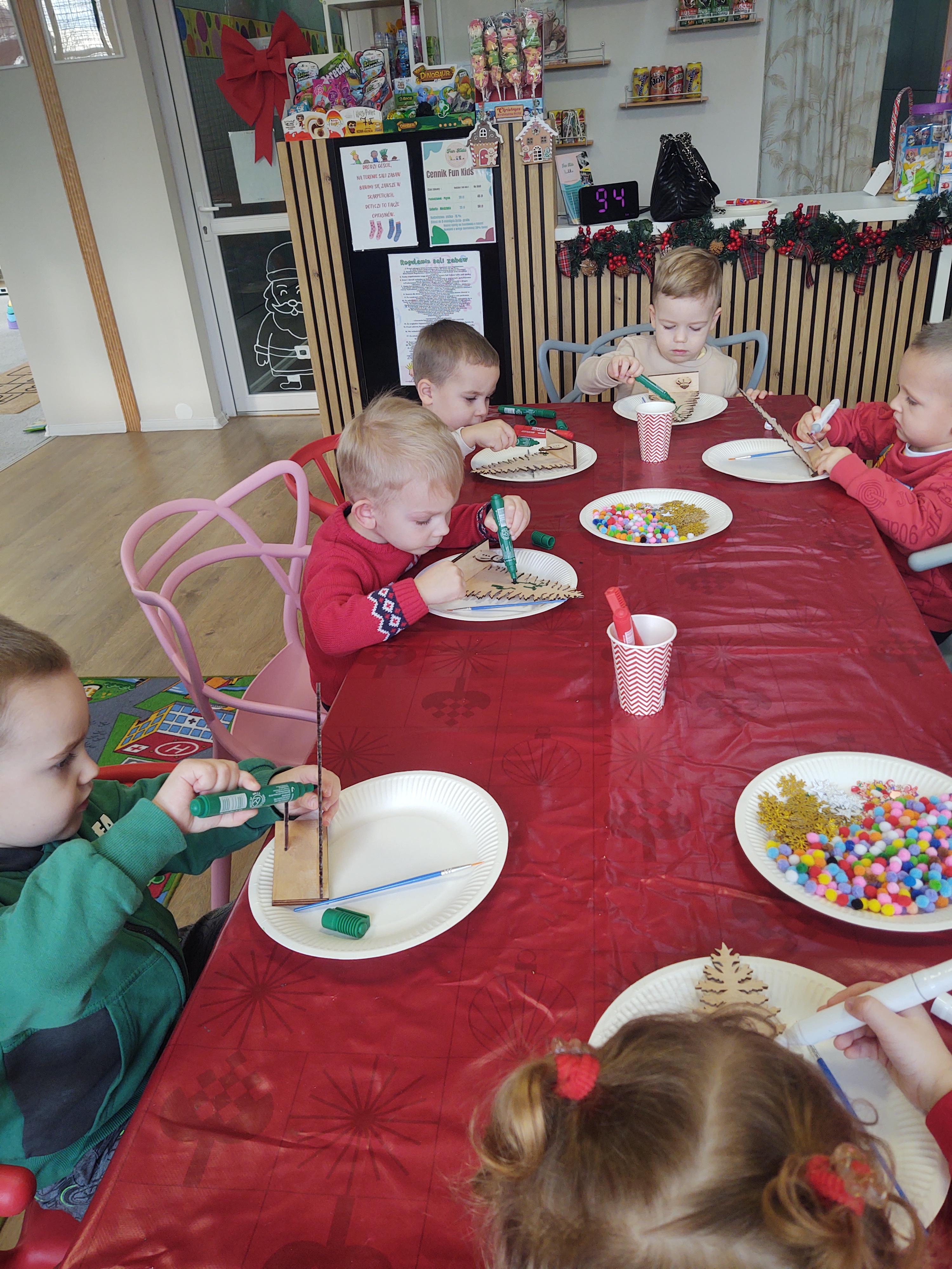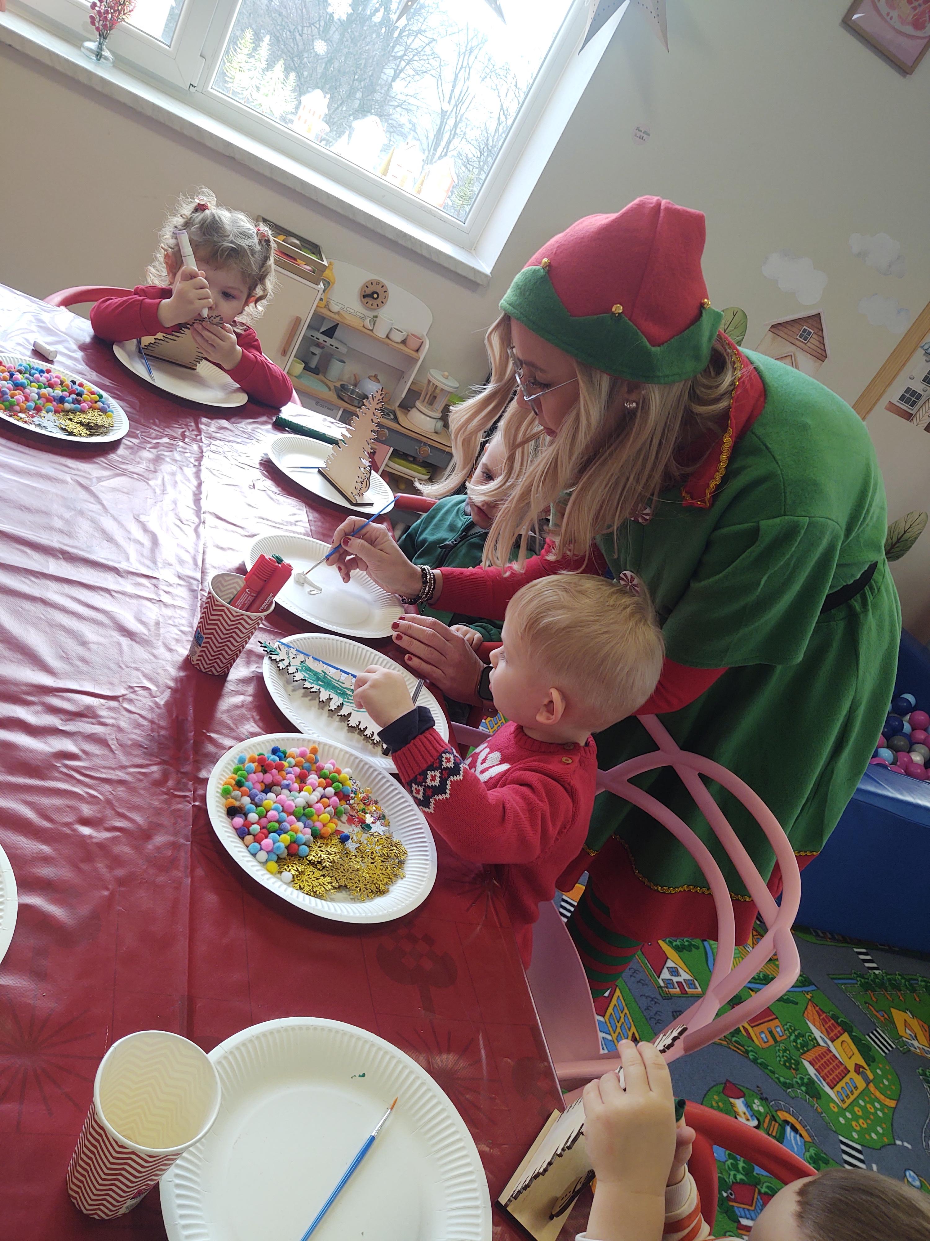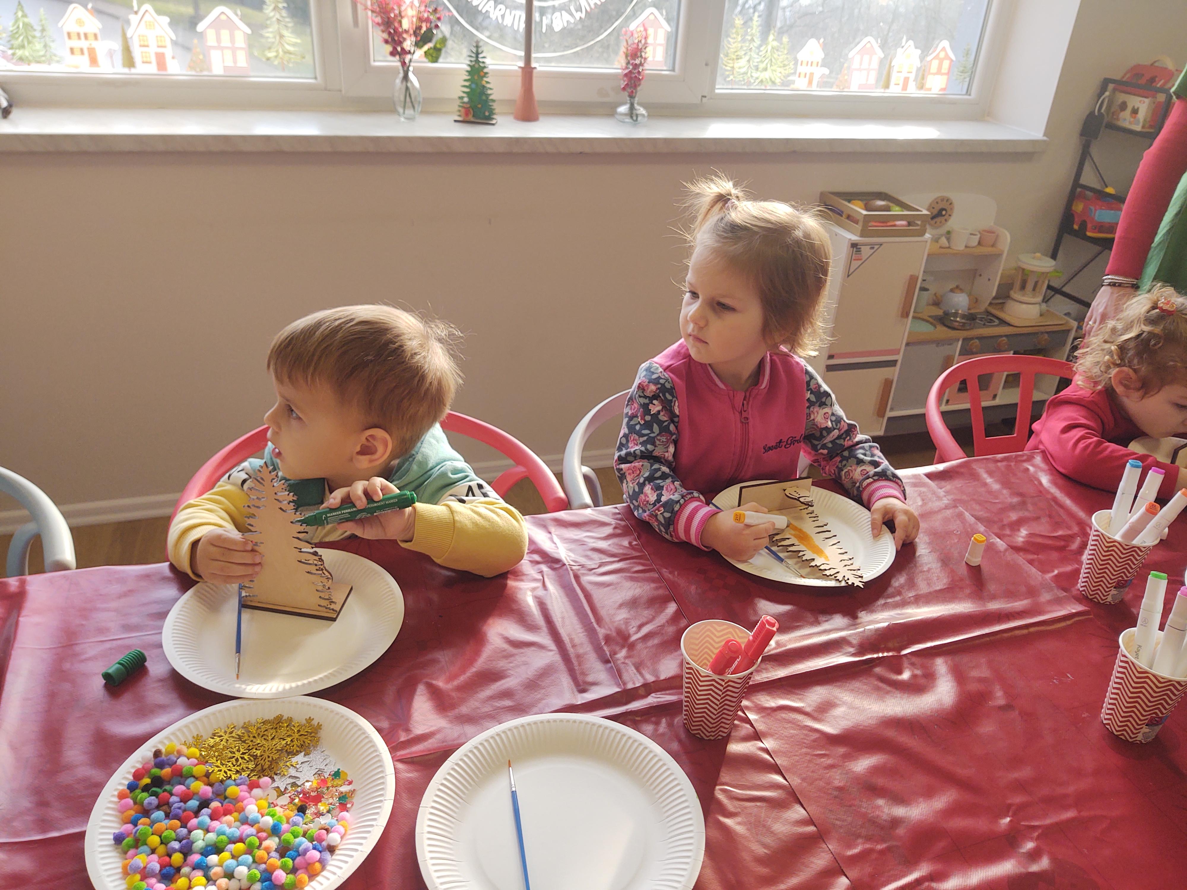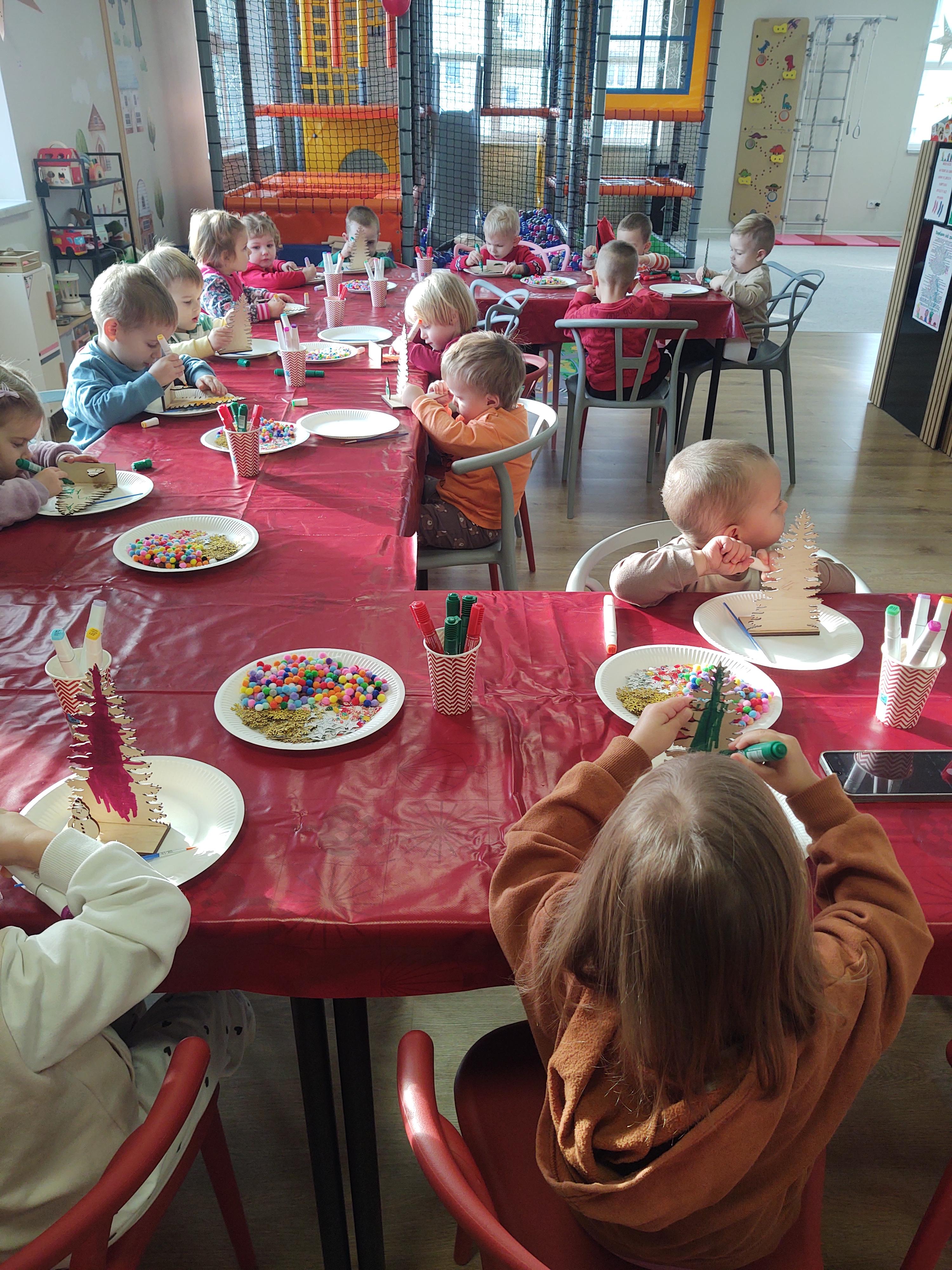 Krasnoludki z radością wzięły udział w twórczych warsztatach plastycznych. Przy dźwiękach świątecznych melodii dzieci zamieniły się w małych elfów Świętego Mikołaja i z ogromnym zaangażowaniem tworzyły bożonarodzeniowe choinki. Każda dekoracja była wyjątkowa, pełna błysku, kolorów i dziecięcej fantazji, a na twarzach maluszków gościła duma i radość z wykonanej pracy.