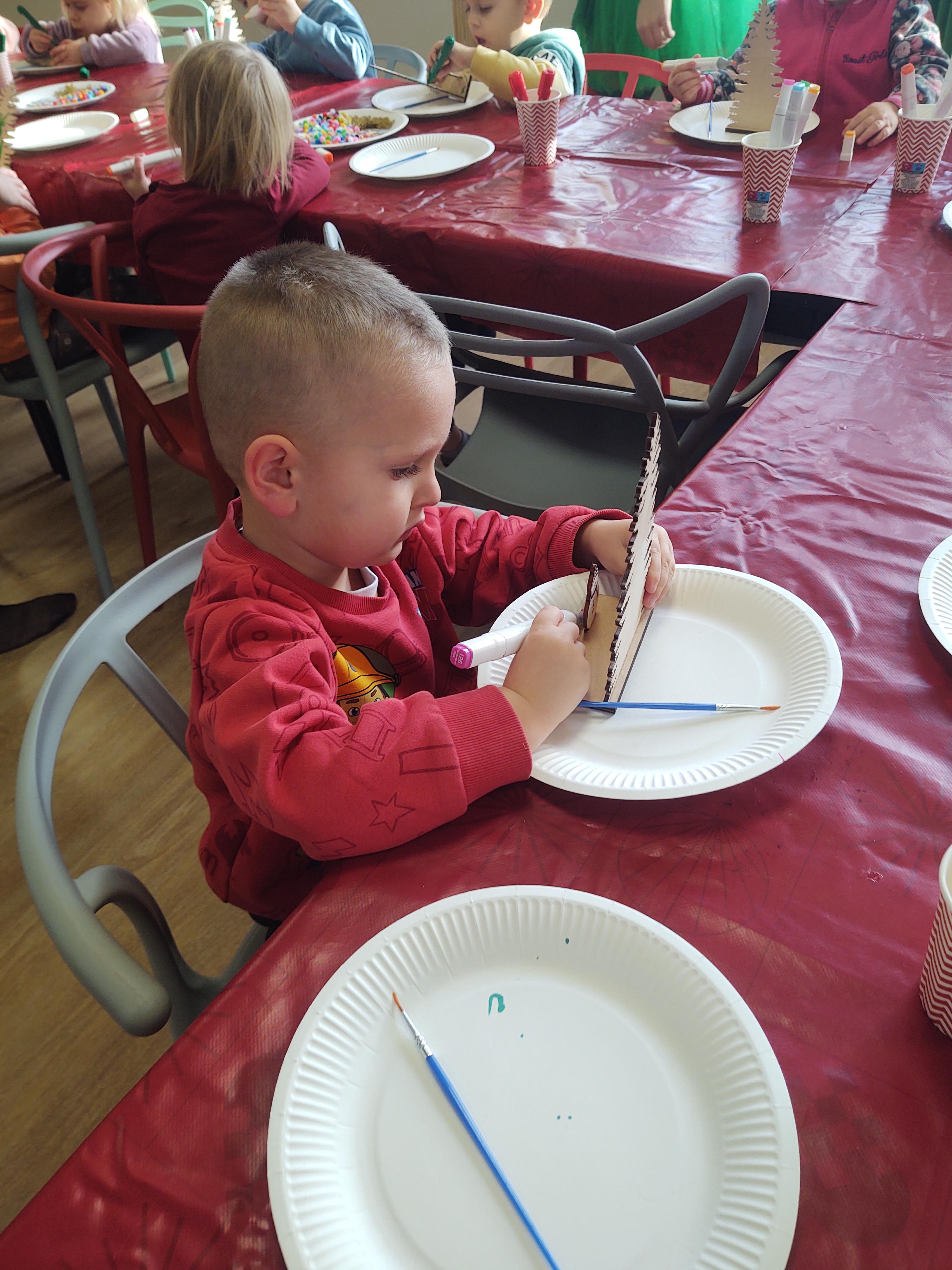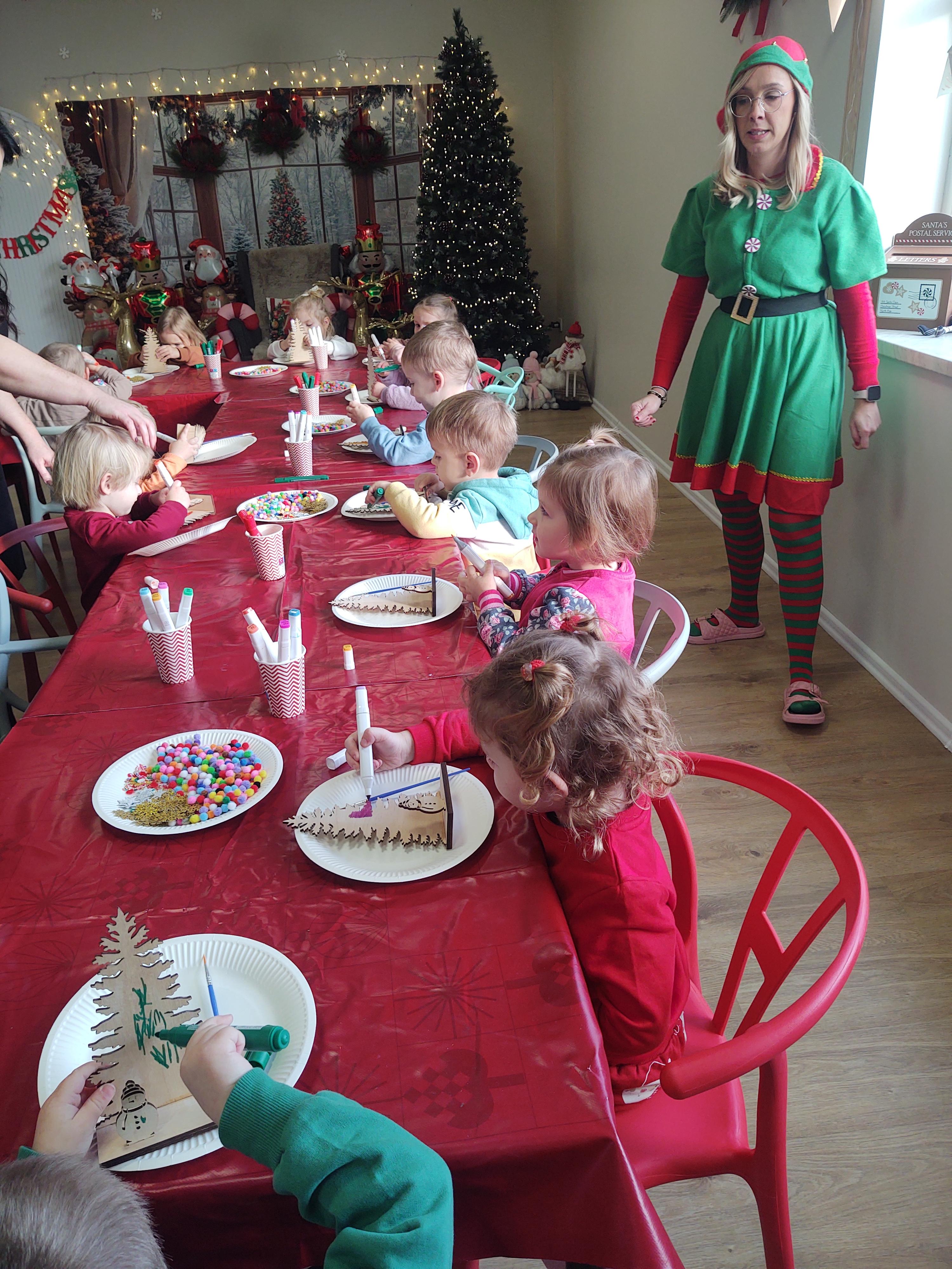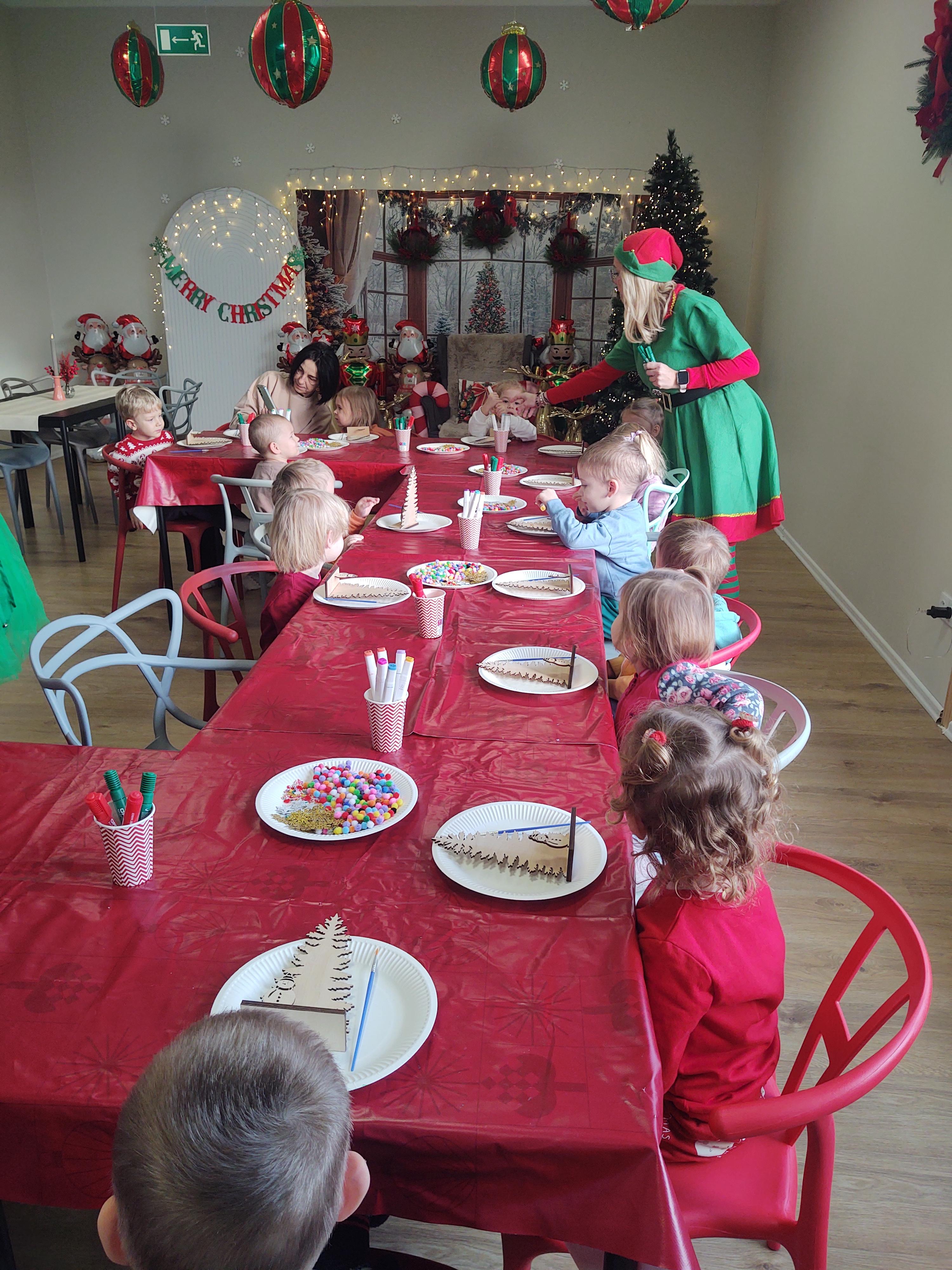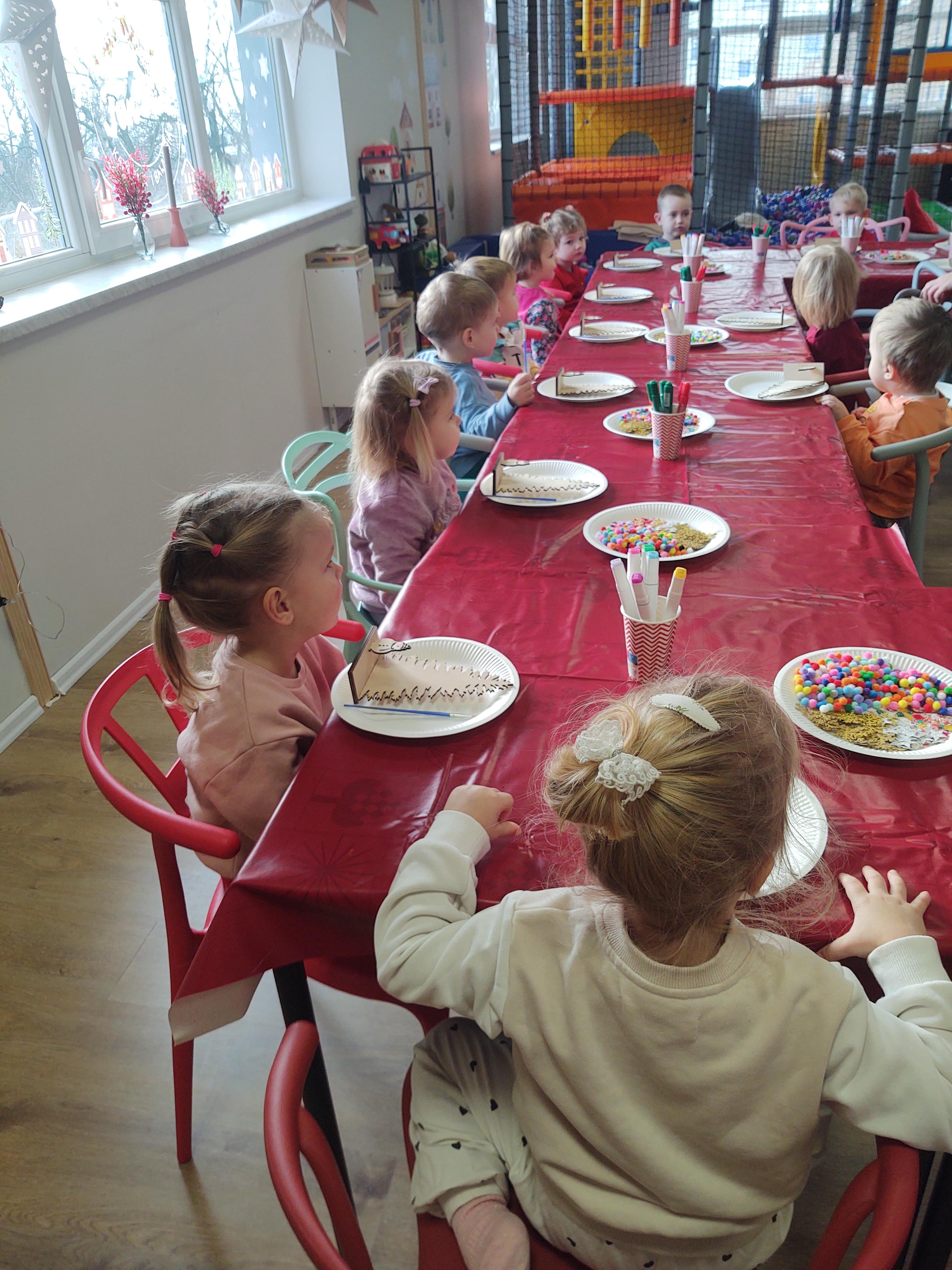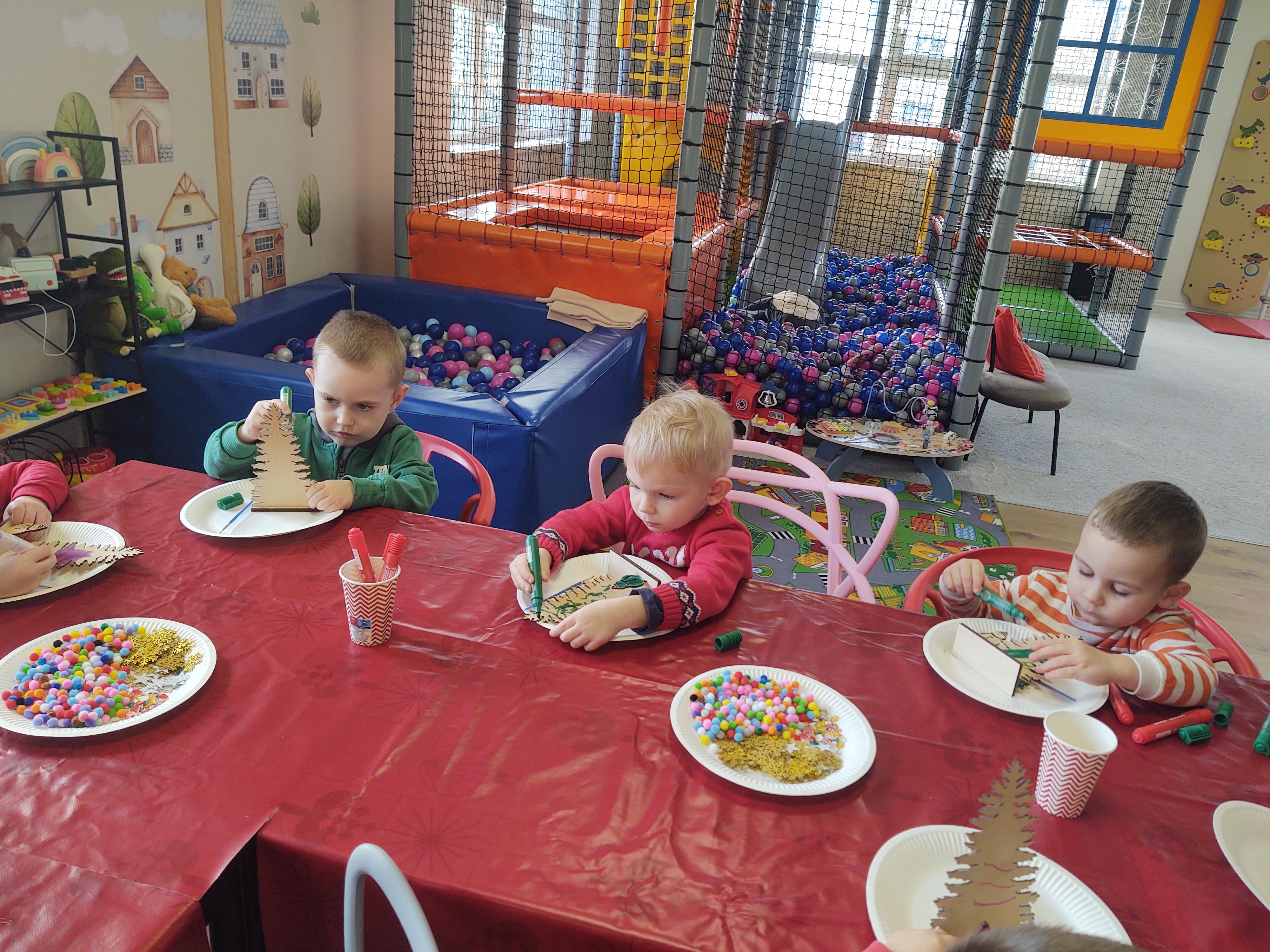 Krasnoludki z radością wzięły udział w twórczych warsztatach plastycznych. Przy dźwiękach świątecznych melodii dzieci zamieniły się w małych elfów Świętego Mikołaja i z ogromnym zaangażowaniem tworzyły bożonarodzeniowe choinki. Każda dekoracja była wyjątkowa, pełna błysku, kolorów i dziecięcej fantazji, a na twarzach maluszków gościła duma i radość z wykonanej pracy.