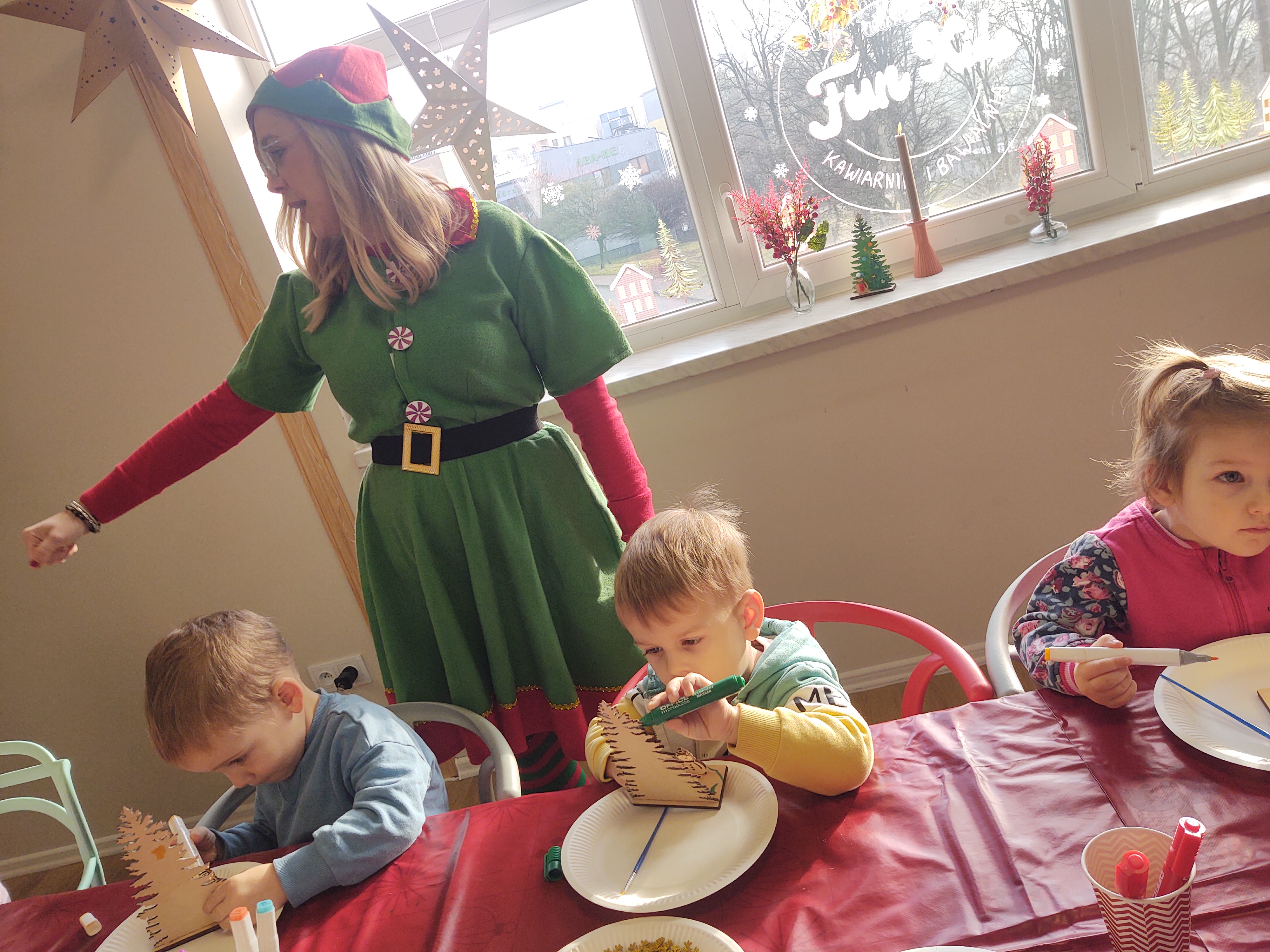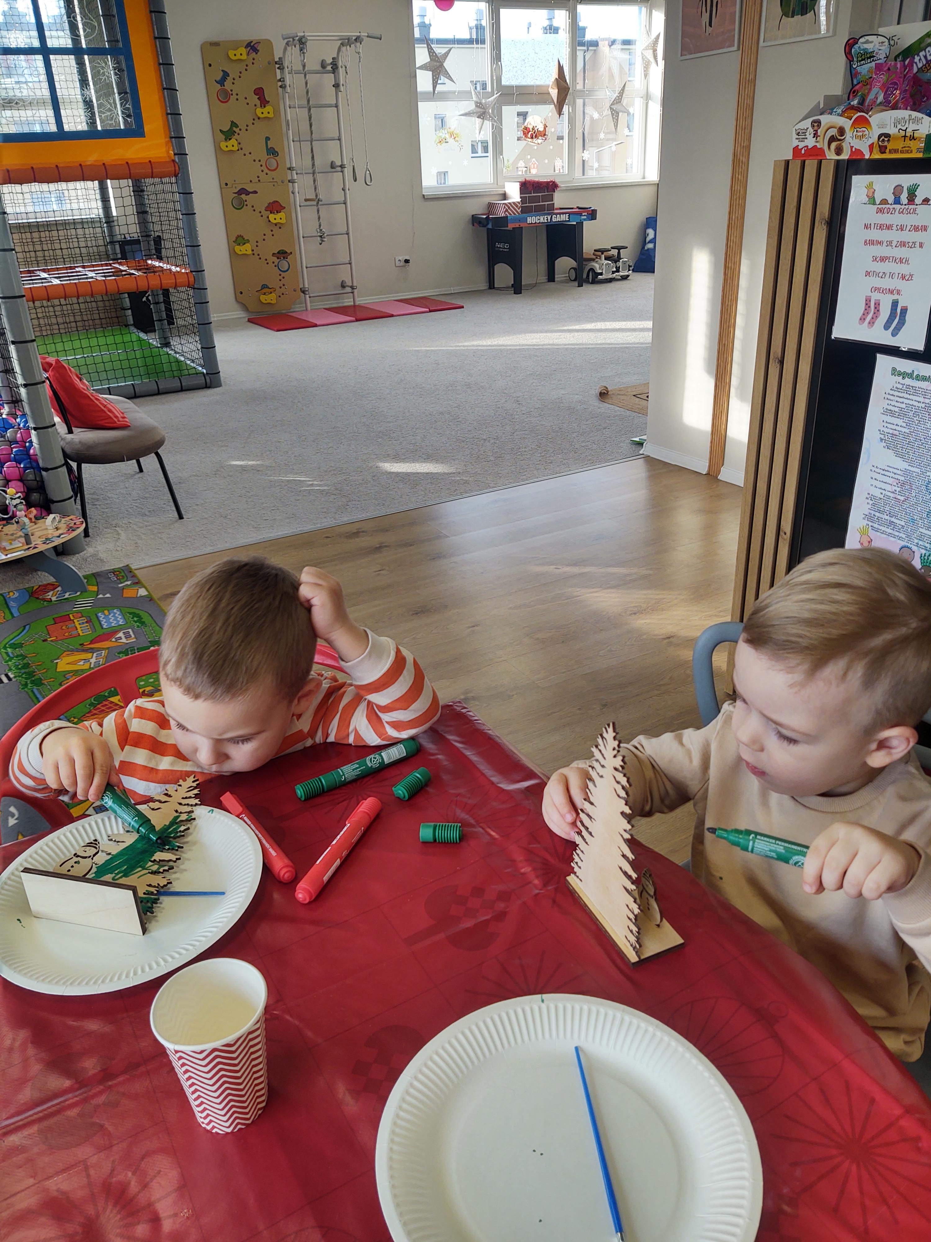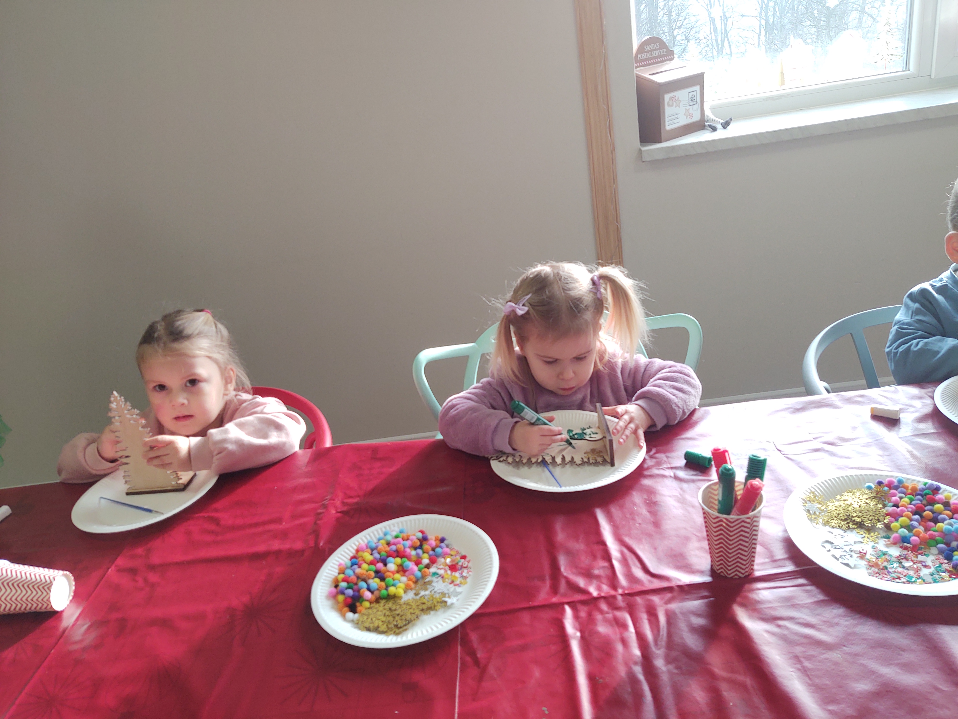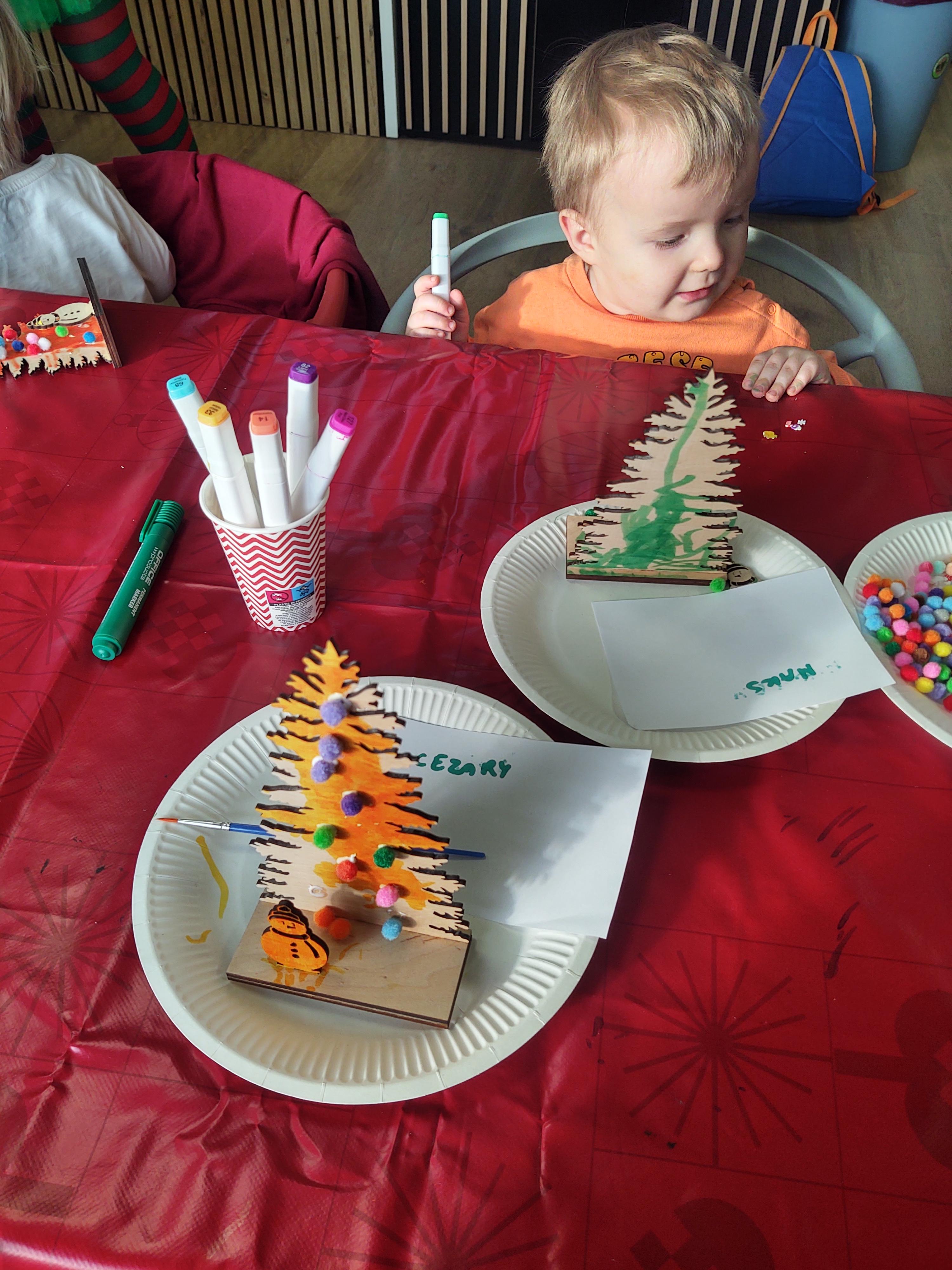 Krasnoludki z radością wzięły udział w twórczych warsztatach plastycznych. Przy dźwiękach świątecznych melodii dzieci zamieniły się w małych elfów Świętego Mikołaja i z ogromnym zaangażowaniem tworzyły bożonarodzeniowe choinki. Każda dekoracja była wyjątkowa, pełna błysku, kolorów i dziecięcej fantazji, a na twarzach maluszków gościła duma i radość z wykonanej pracy.
