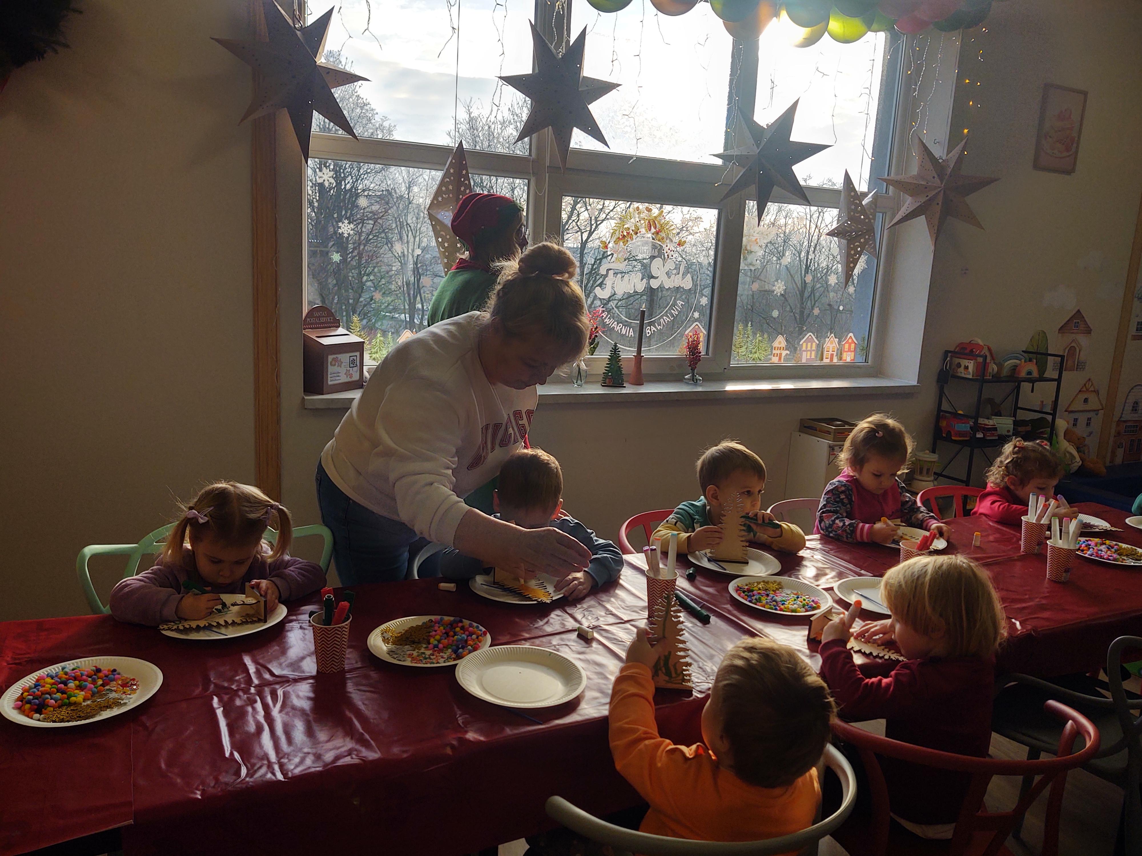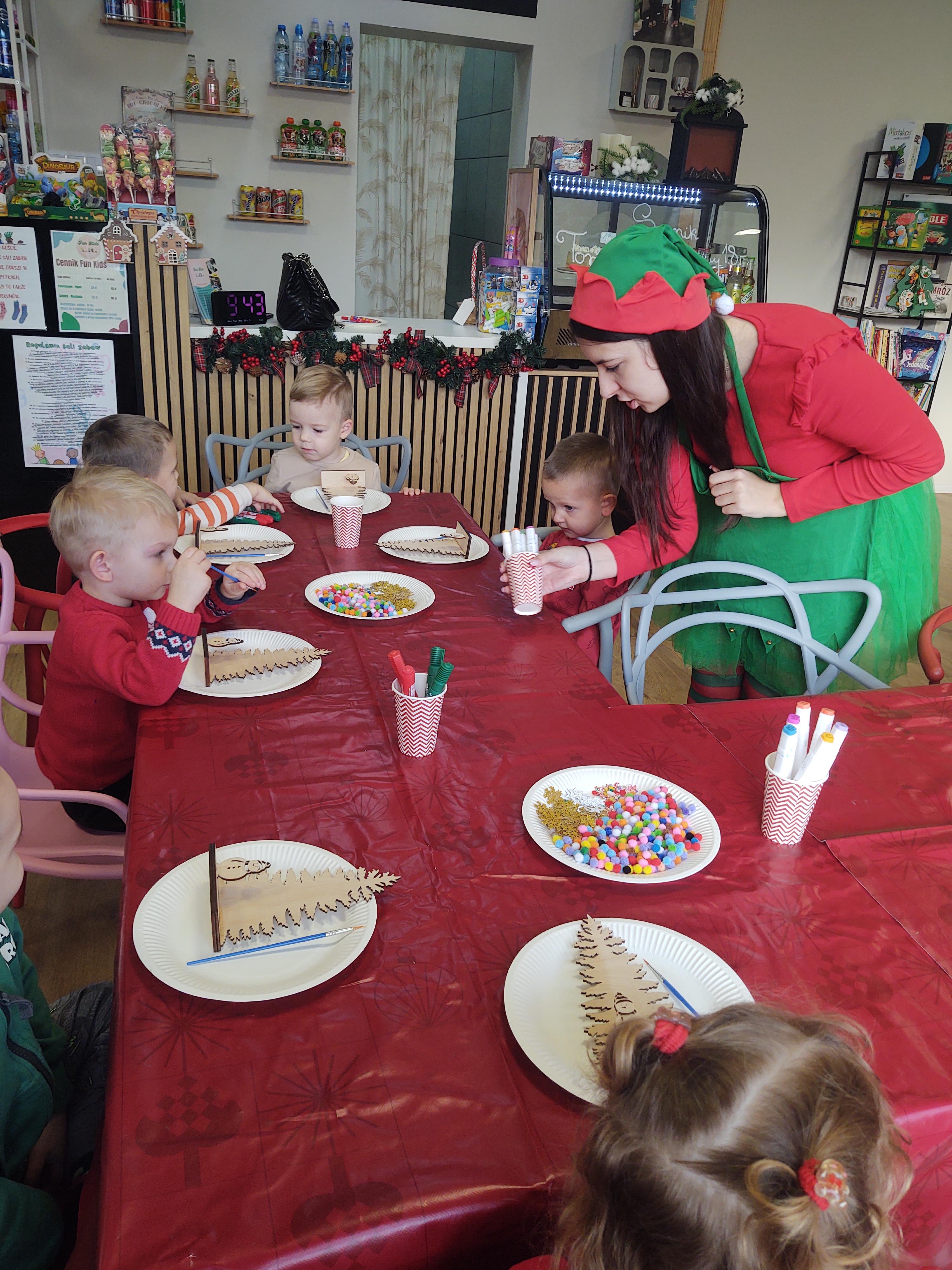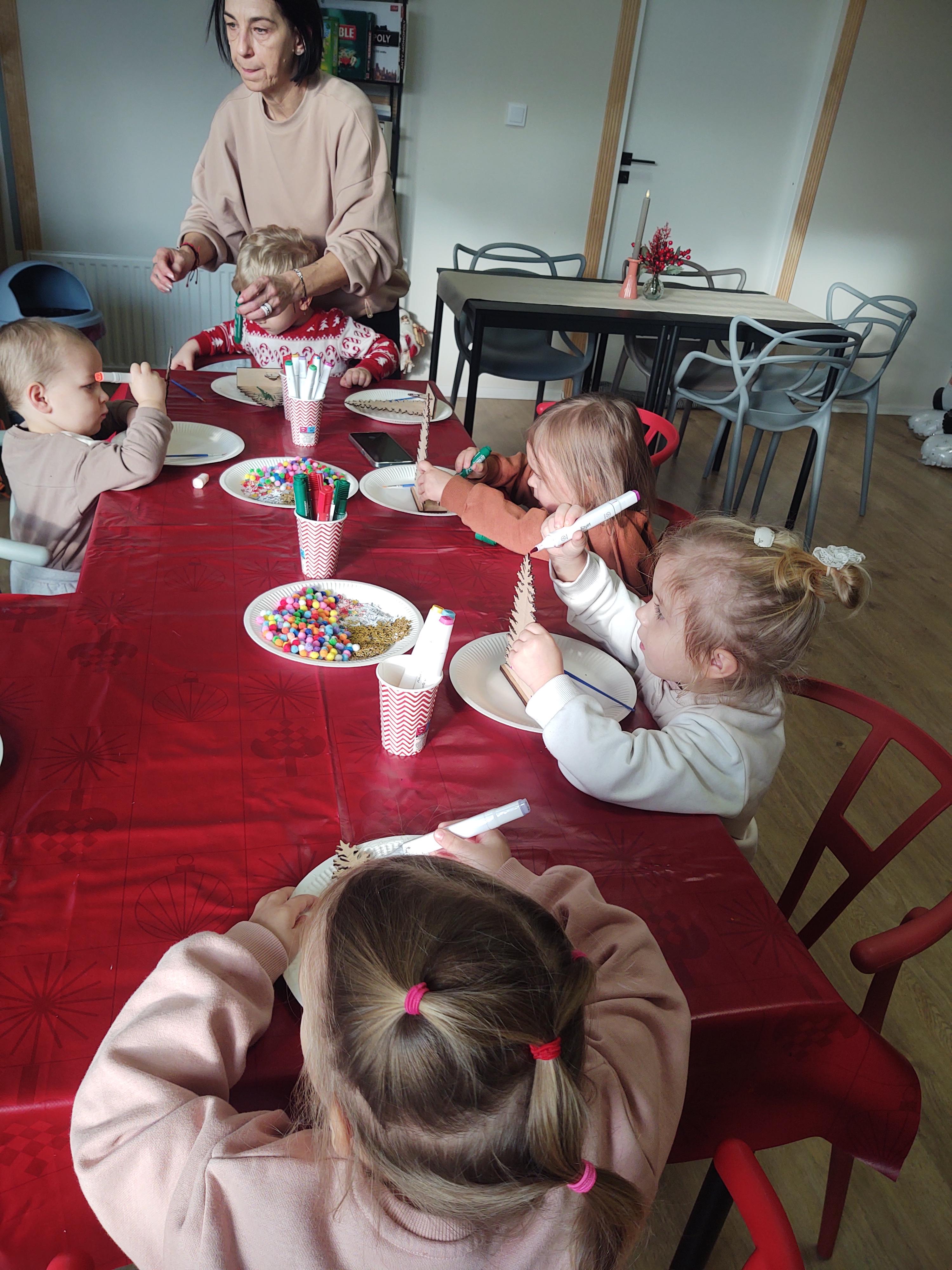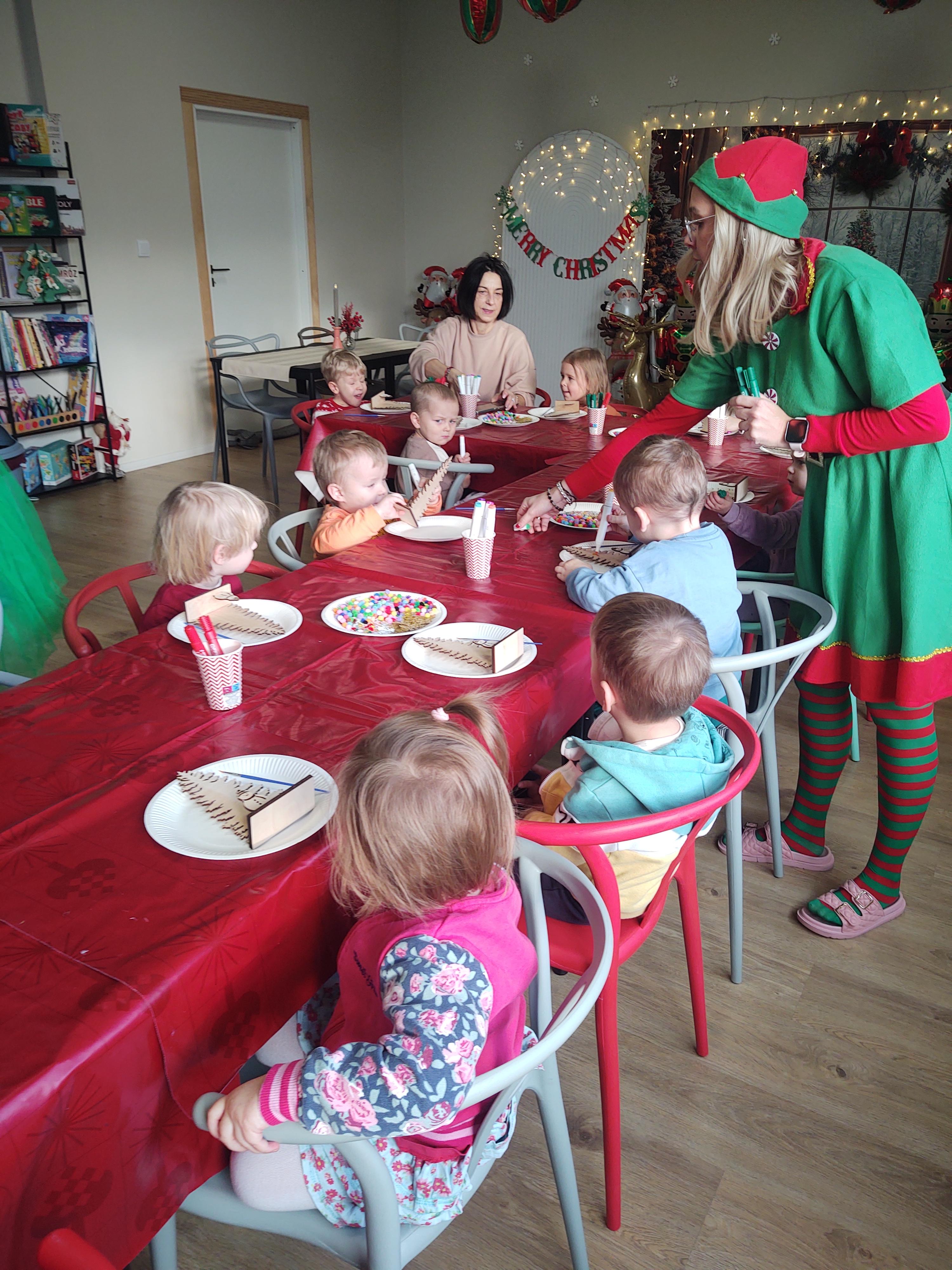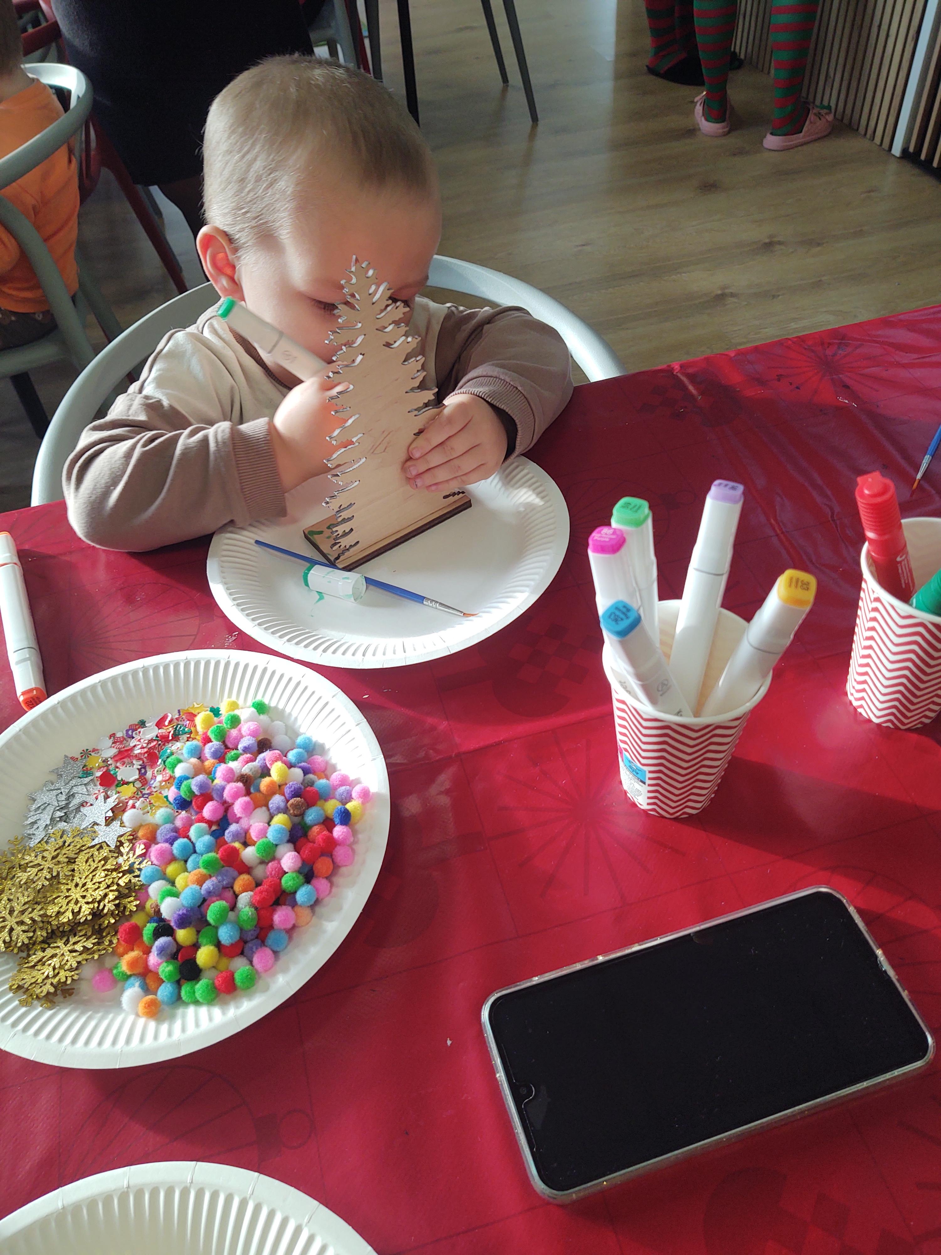 Krasnoludki z radością wzięły udział w twórczych warsztatach plastycznych. Przy dźwiękach świątecznych melodii dzieci zamieniły się w małych elfów Świętego Mikołaja i z ogromnym zaangażowaniem tworzyły bożonarodzeniowe choinki. Każda dekoracja była wyjątkowa, pełna błysku, kolorów i dziecięcej fantazji, a na twarzach maluszków gościła duma i radość z wykonanej pracy.