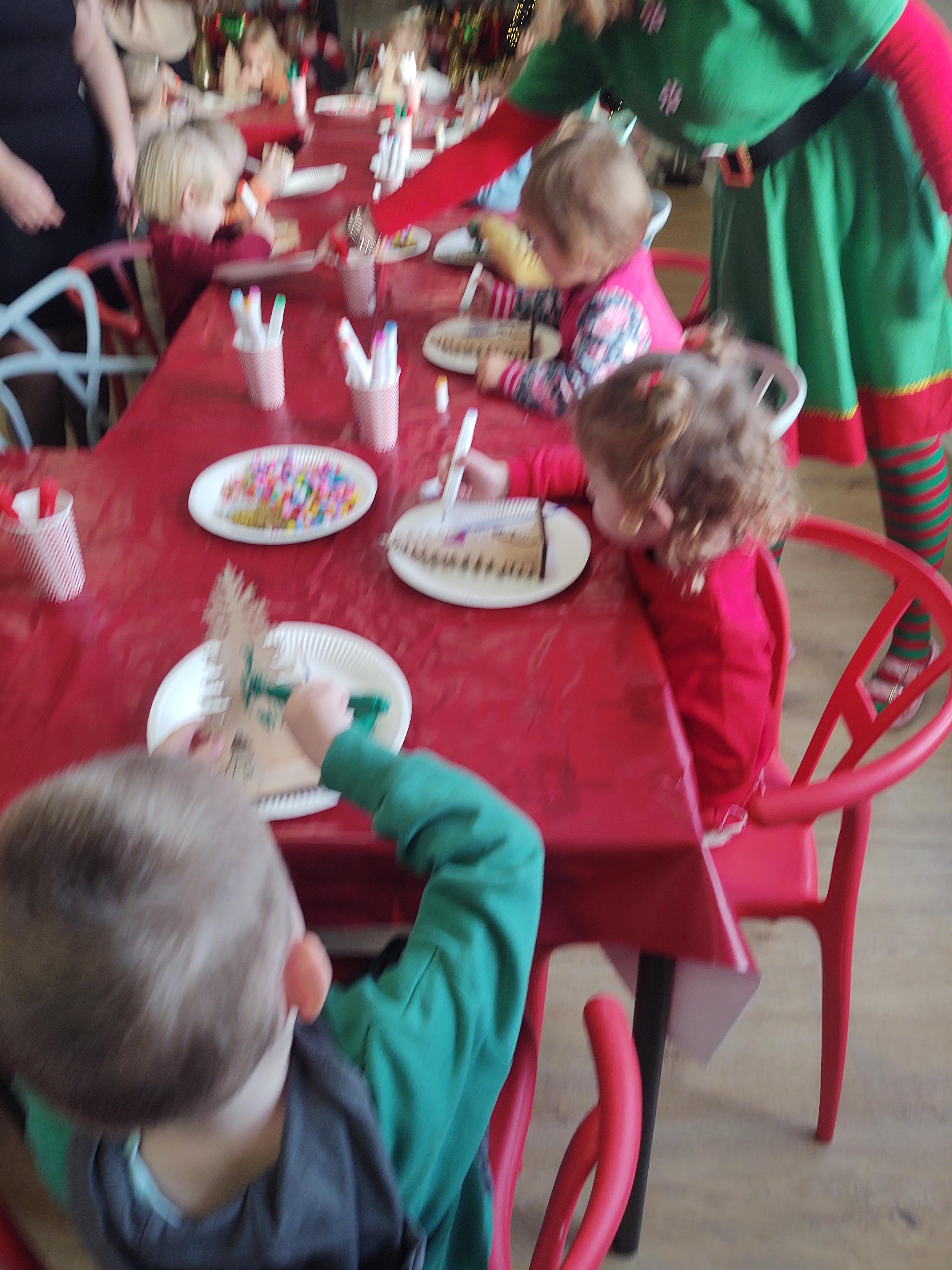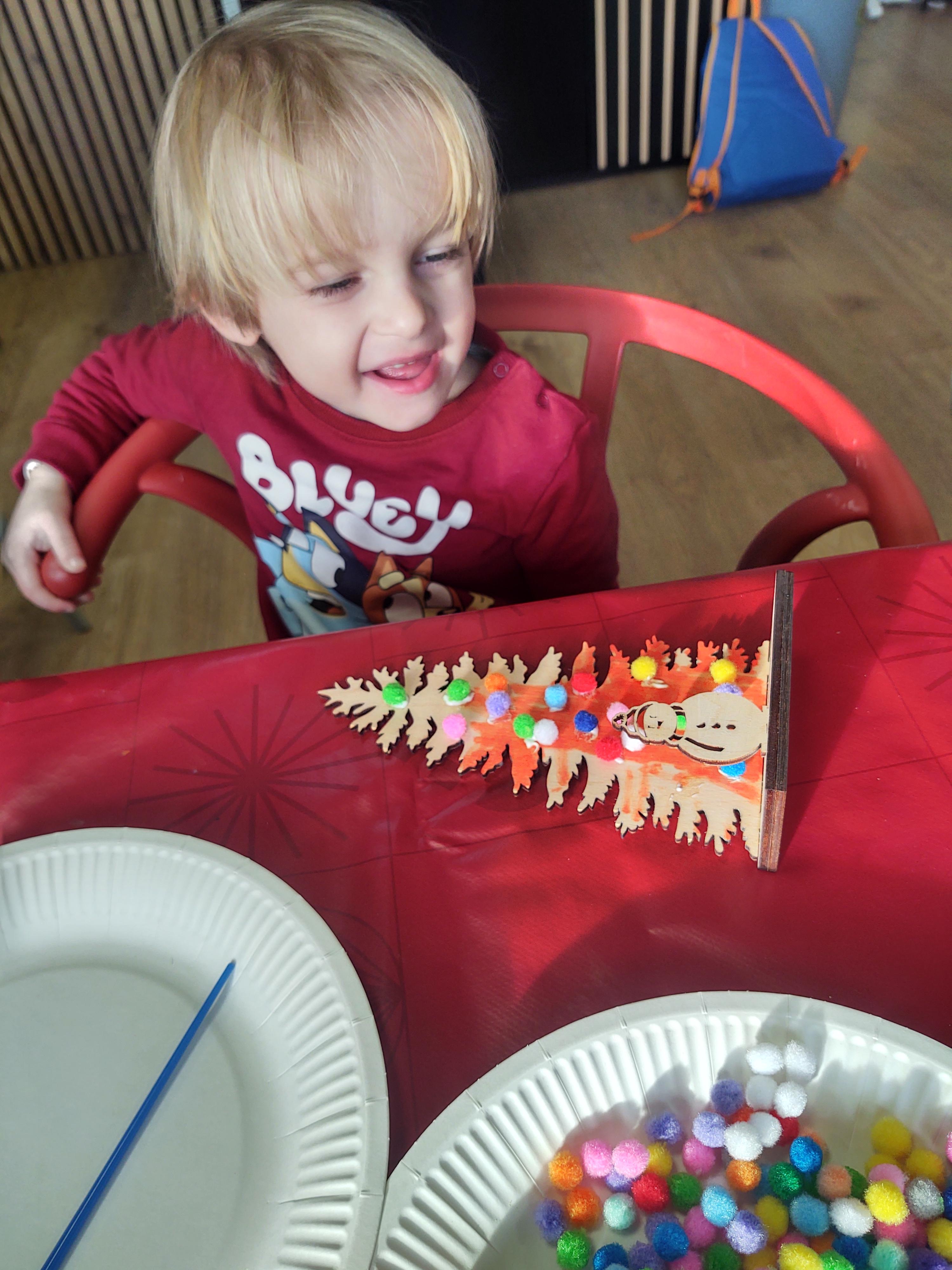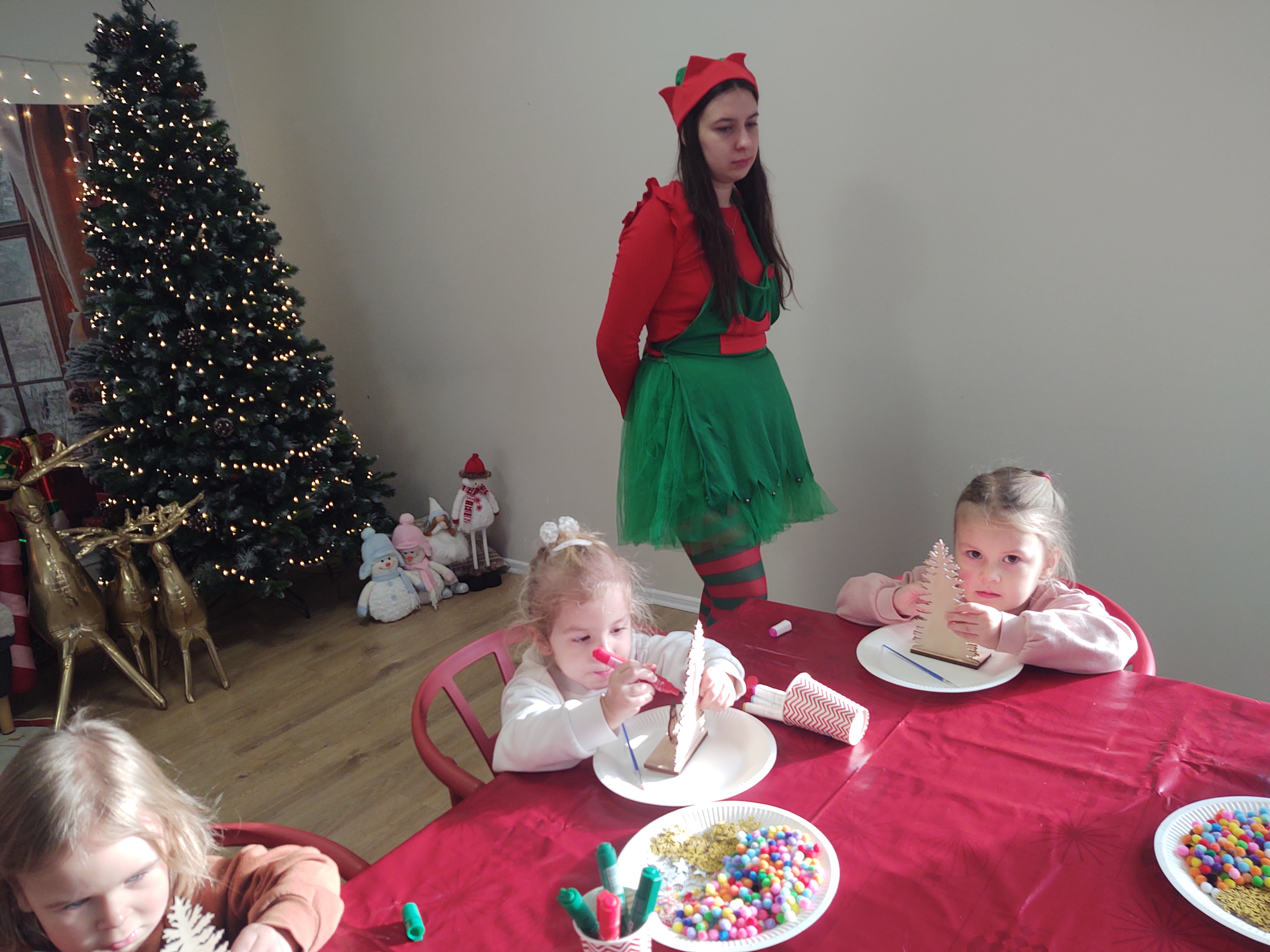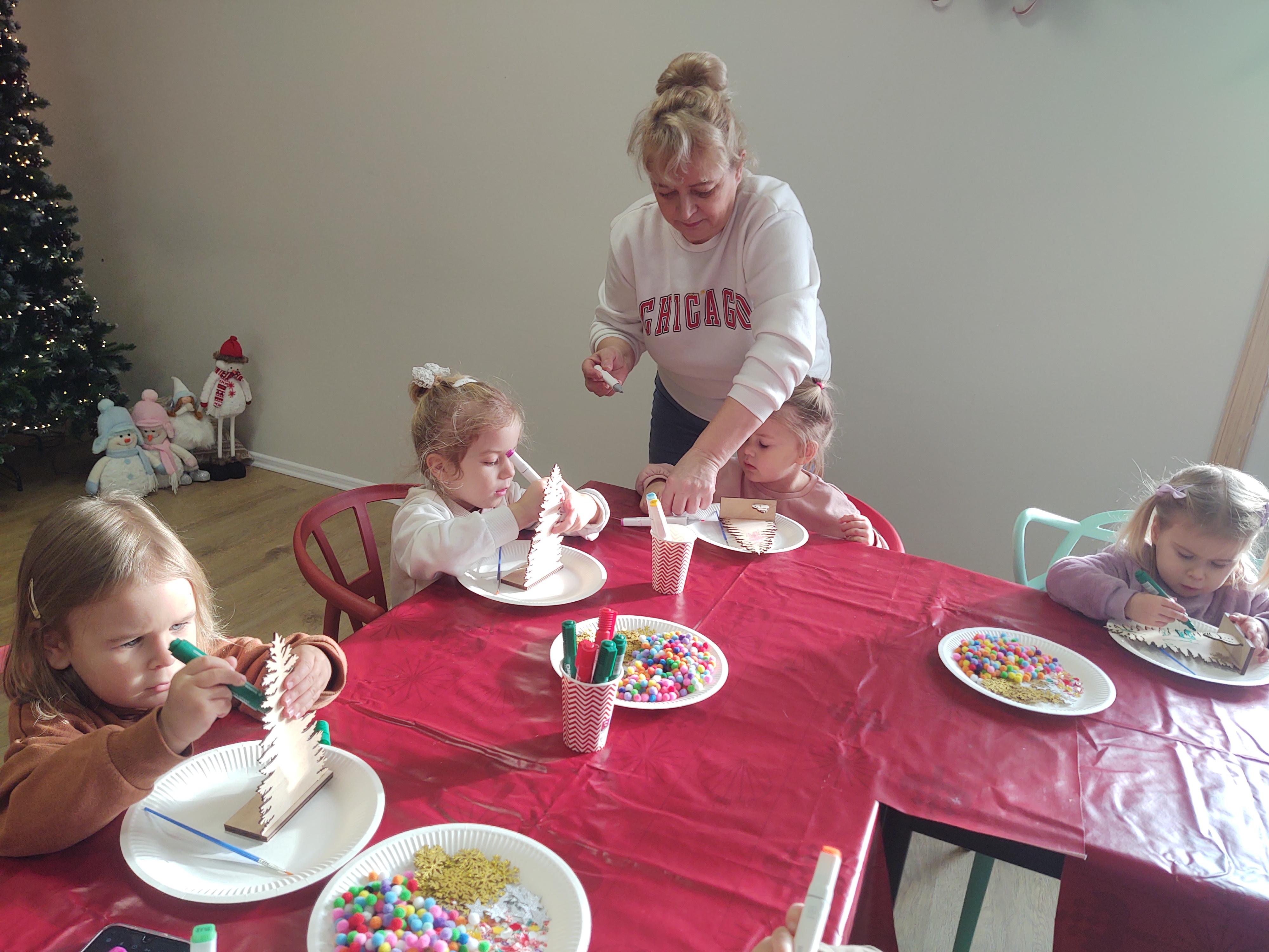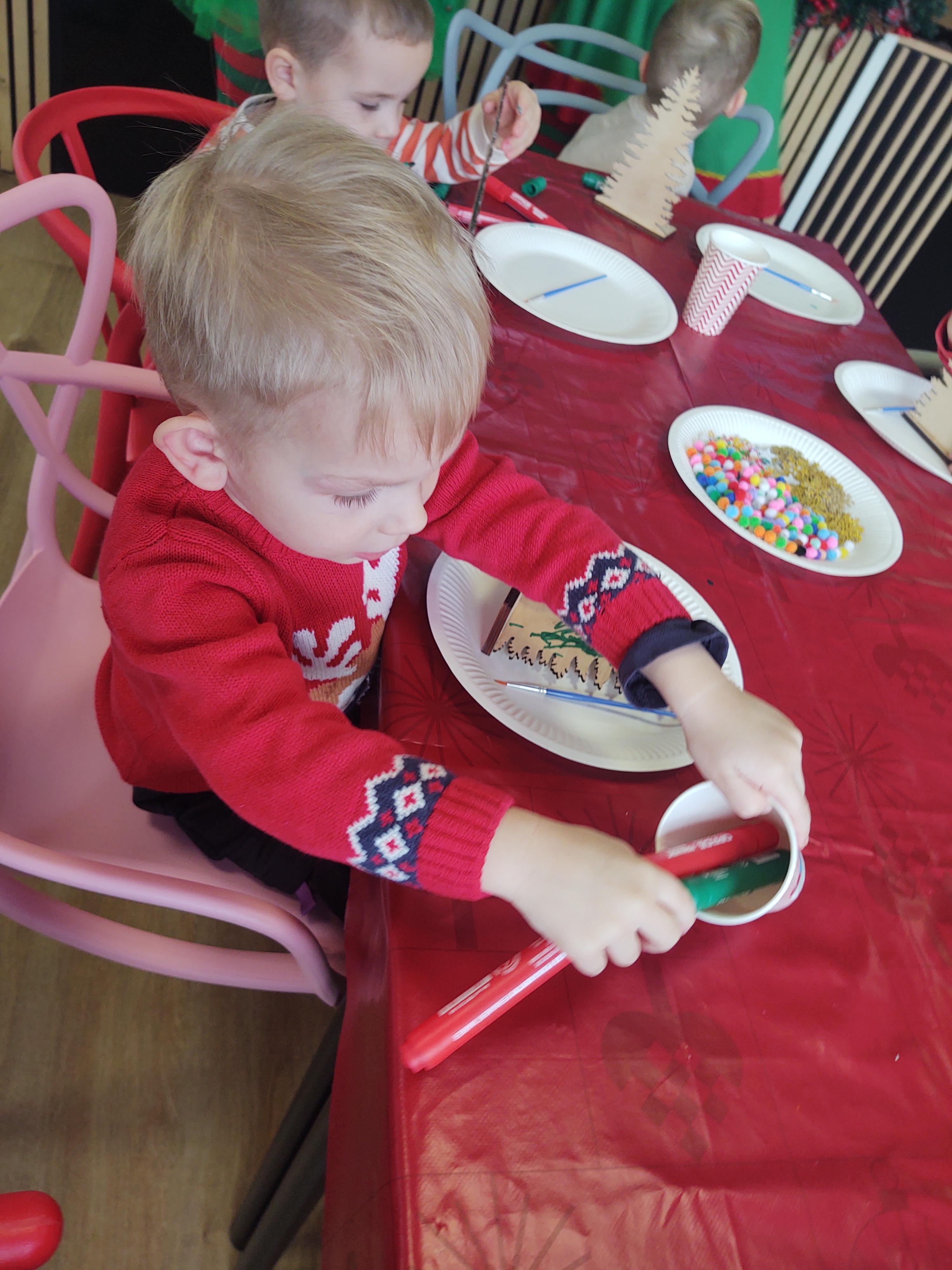 Krasnoludki z radością wzięły udział w twórczych warsztatach plastycznych. Przy dźwiękach świątecznych melodii dzieci zamieniły się w małych elfów Świętego Mikołaja i z ogromnym zaangażowaniem tworzyły bożonarodzeniowe choinki. Każda dekoracja była wyjątkowa, pełna błysku, kolorów i dziecięcej fantazji, a na twarzach maluszków gościła duma i radość z wykonanej pracy.