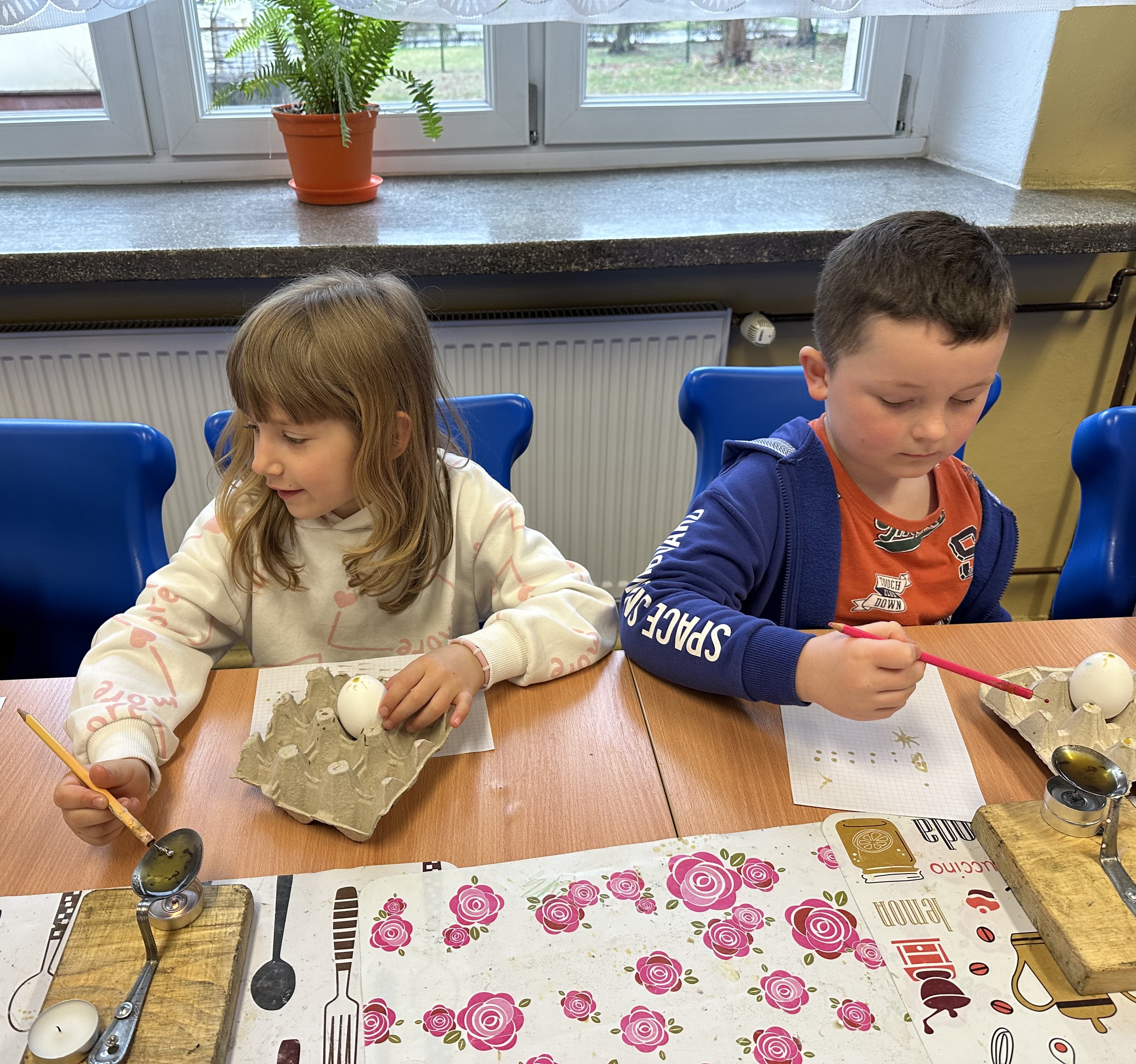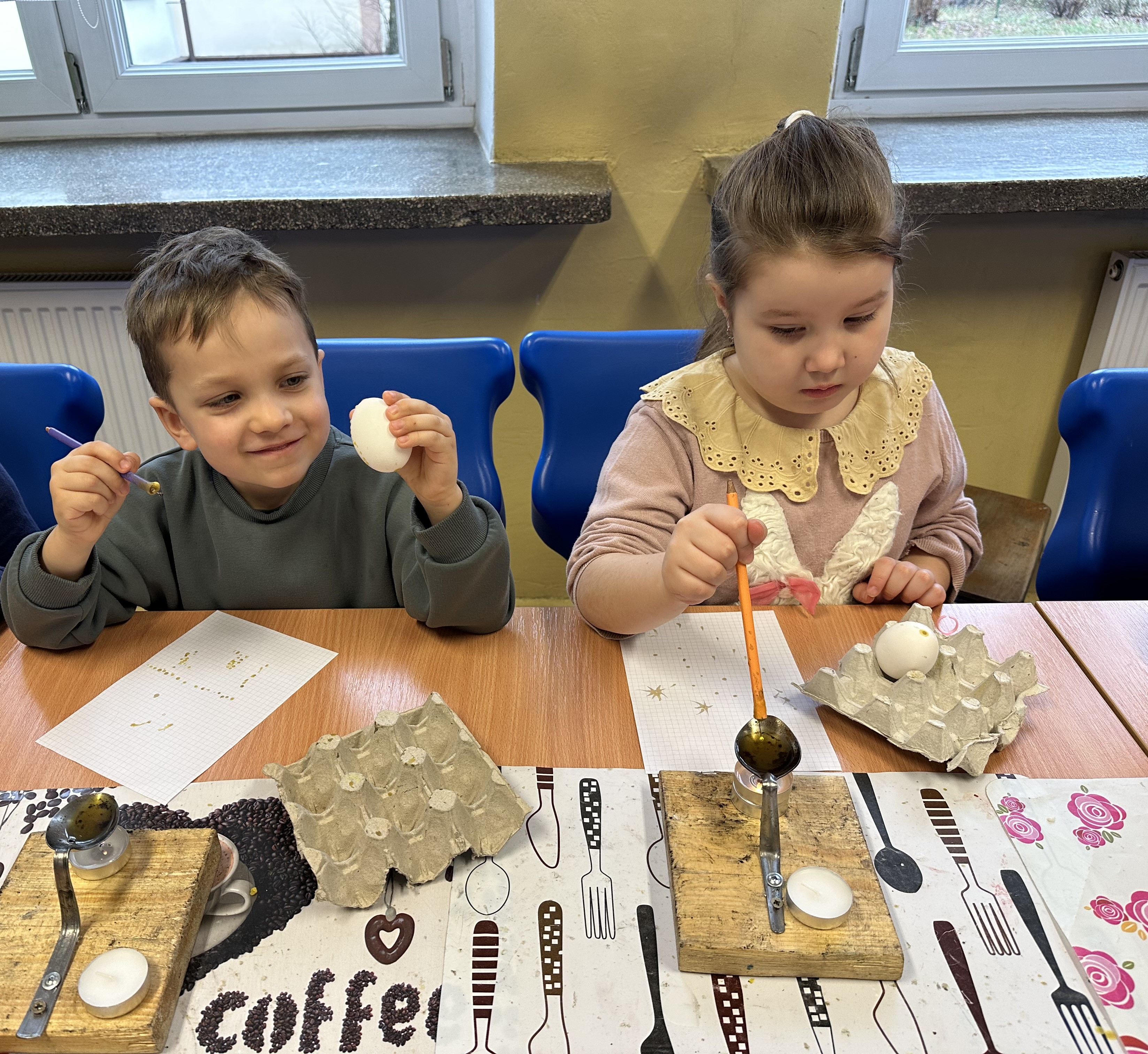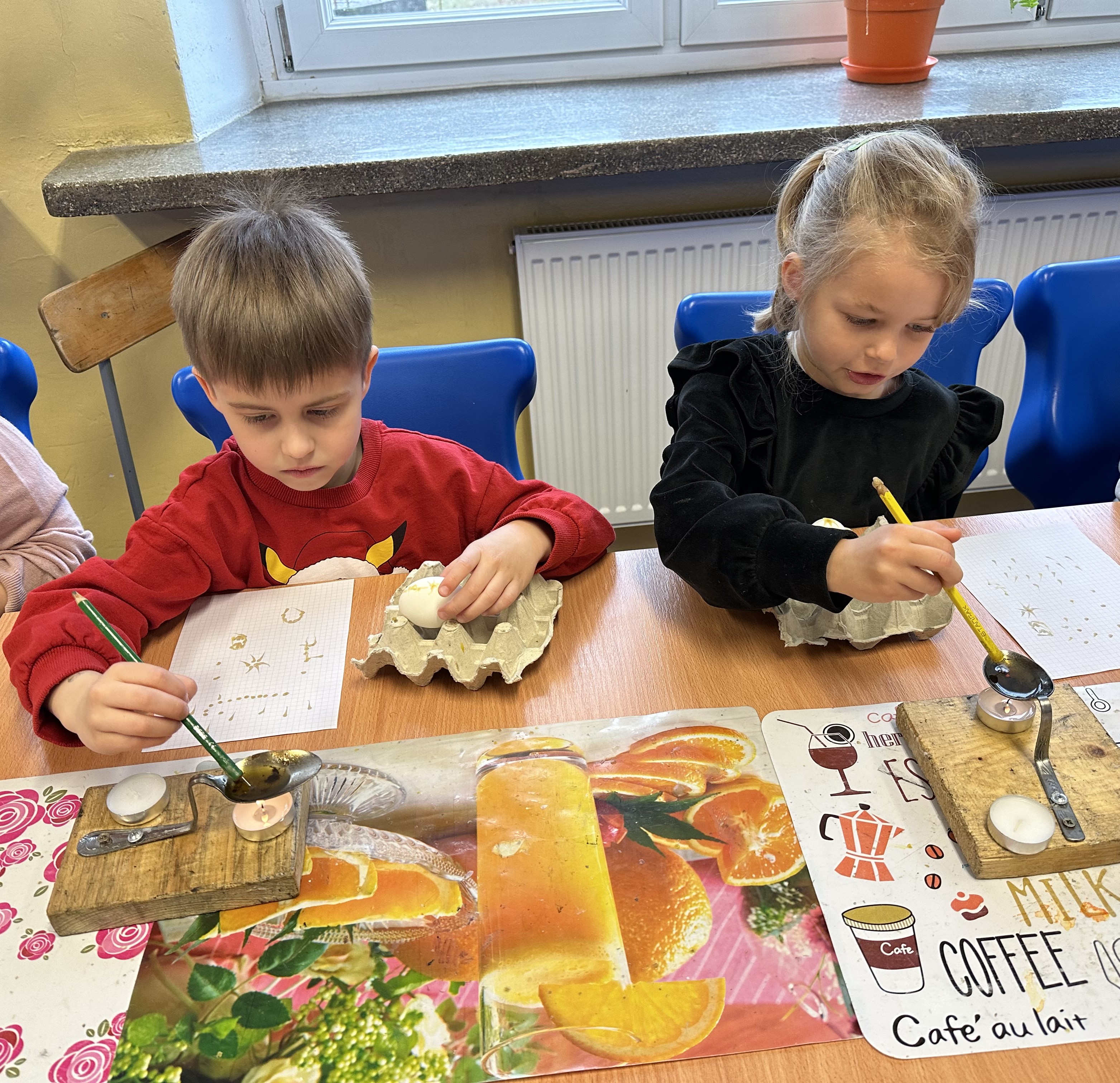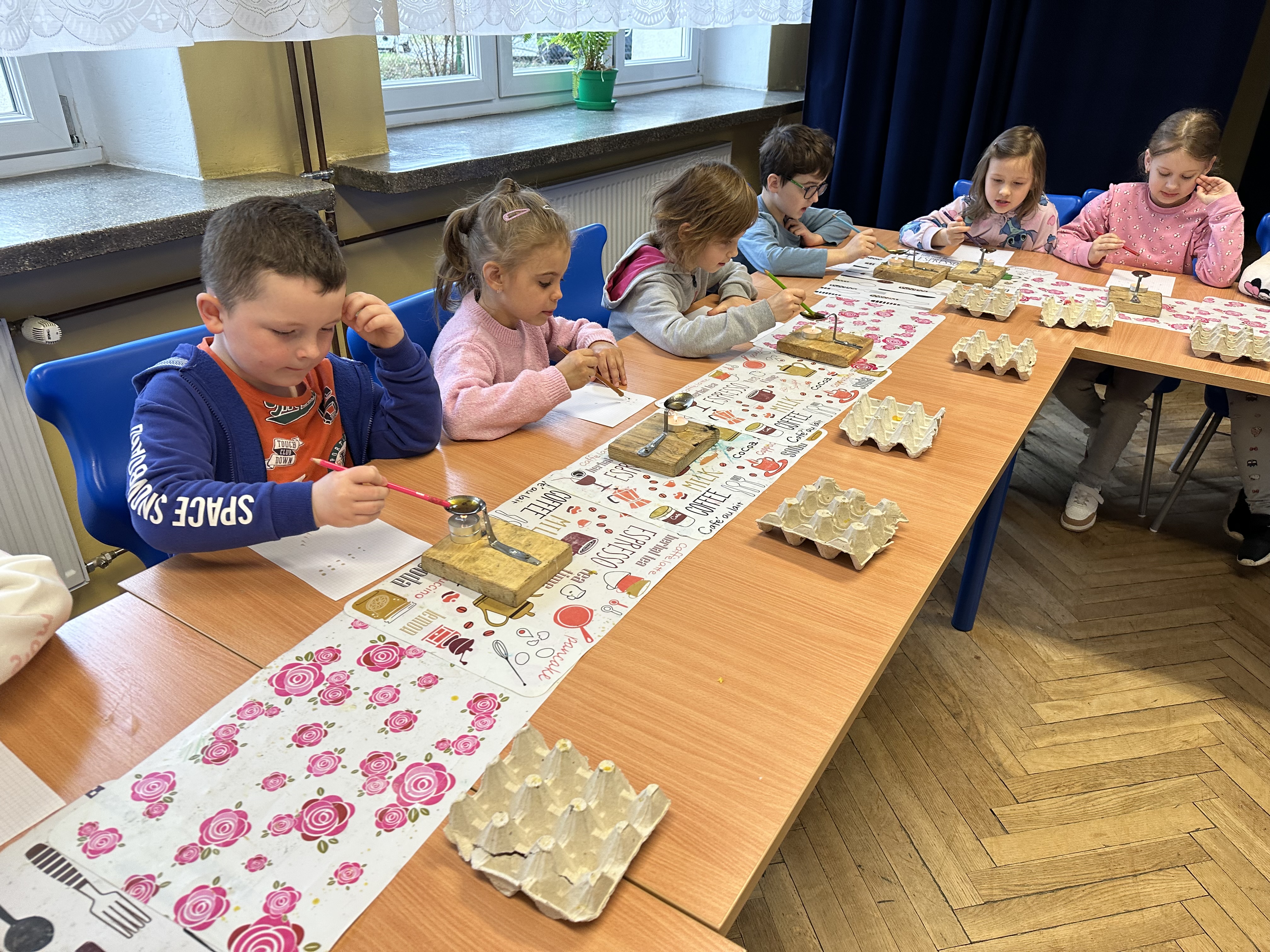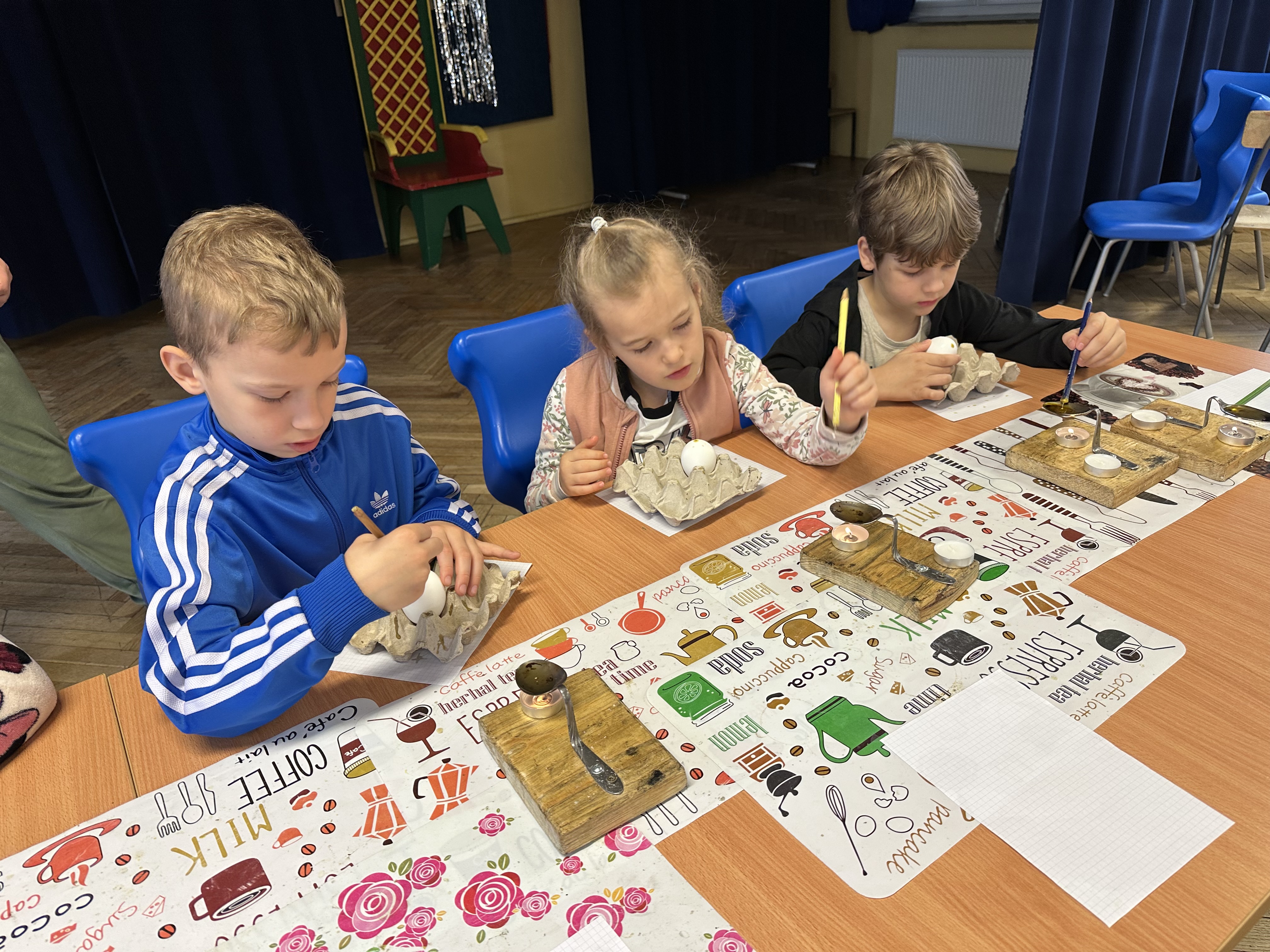 31 marca 2026 roku grupa „Pszczółek” uczestniczyła w warsztatach wielkanocnych zorganizowanych w Szkole Podstawowej nr 6 im. Władysława Broniewskiego w Trzebini pod hasłem „Przygoda z woskiem pszczelim i pisankami”. Celem spotkania było zapoznanie dzieci z techniką szpilkową wykorzystywaną do ozdabiania wydmuszek oraz przybliżenie tradycji wielkanocnych związanych z naszym regionem. Na początku warsztatów osoby prowadzące -pani Ania oraz pan Tytus -przywitały się ze starszakami i nawiązały w rozmowie do zwyczajów wielkanocnych. Następnie dzieci dowiedziały się, na czym polega technika szpilkowa i jak można ją wykorzystać do tworzenia pisanek. Prowadzący zaprezentowali kolejne etapy ozdabiania wydmuszek, zwracając szczególną uwagę na bezpieczeństwo podczas wykonywania prac. Dzieci z dużym zainteresowaniem obserwowały pokaz i chętnie słuchały wskazówek. Po części pokazowej uczestnicy przystąpili do samodzielnej pracy. Każde dziecko wykonało własną, wyjątkową pisankę techniką szpilkową. Warsztaty były dla dzieci nie tylko okazją do rozwijania zdolności manualnych i kreatywności, ale także do poznania wielkanocnych tradycji. Wykonane pisanki dzieci mogły zaprezentować kolegom i koleżankom w przedszkolu, a następnie zabrać do domu. Spotkanie przebiegło w miłej i radosnej atmosferze.