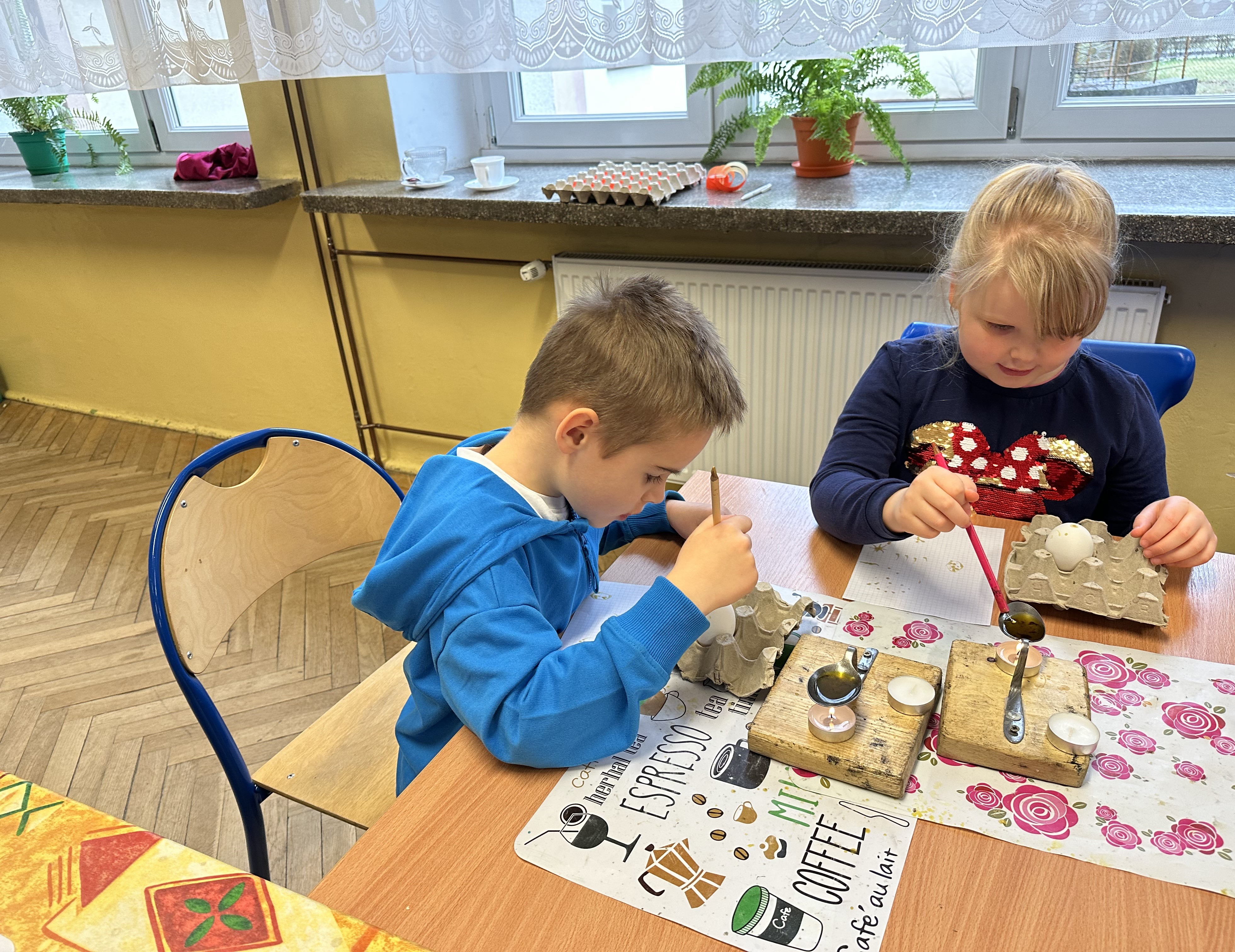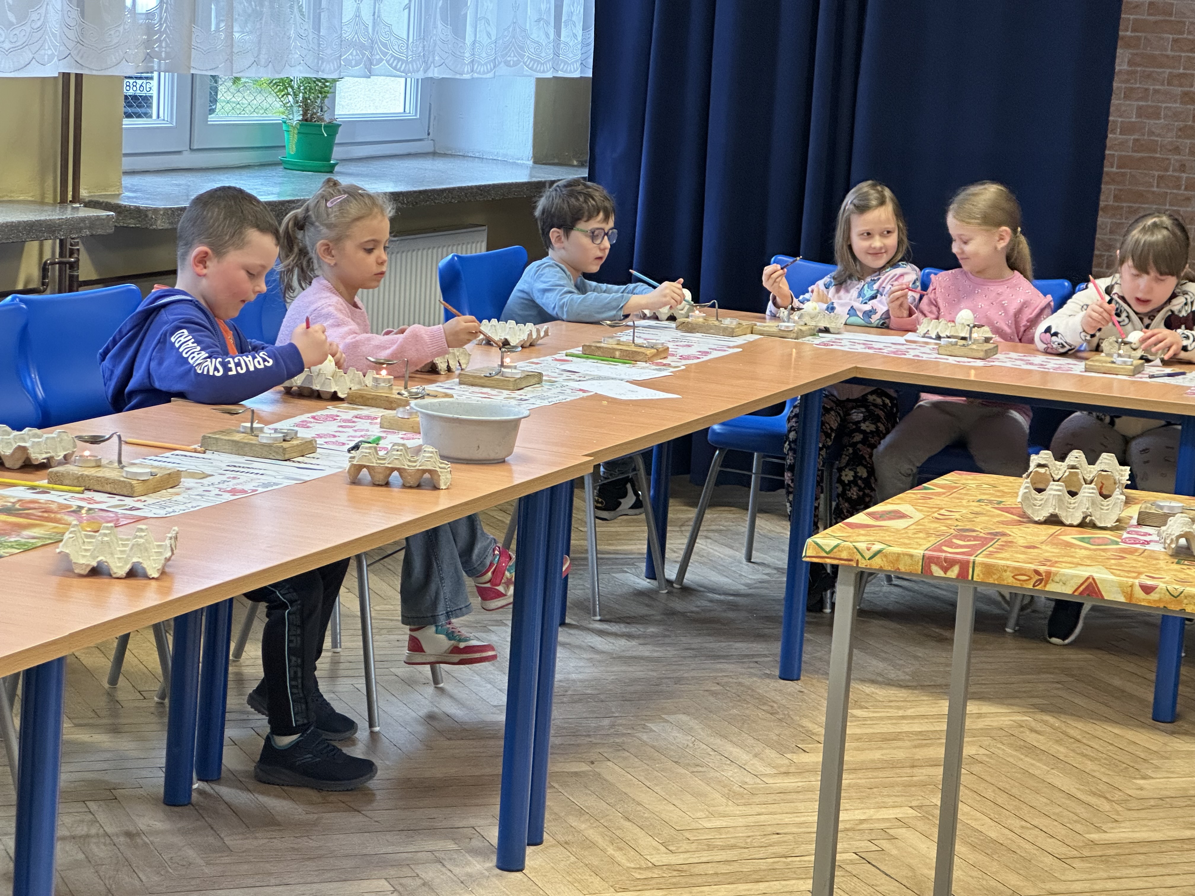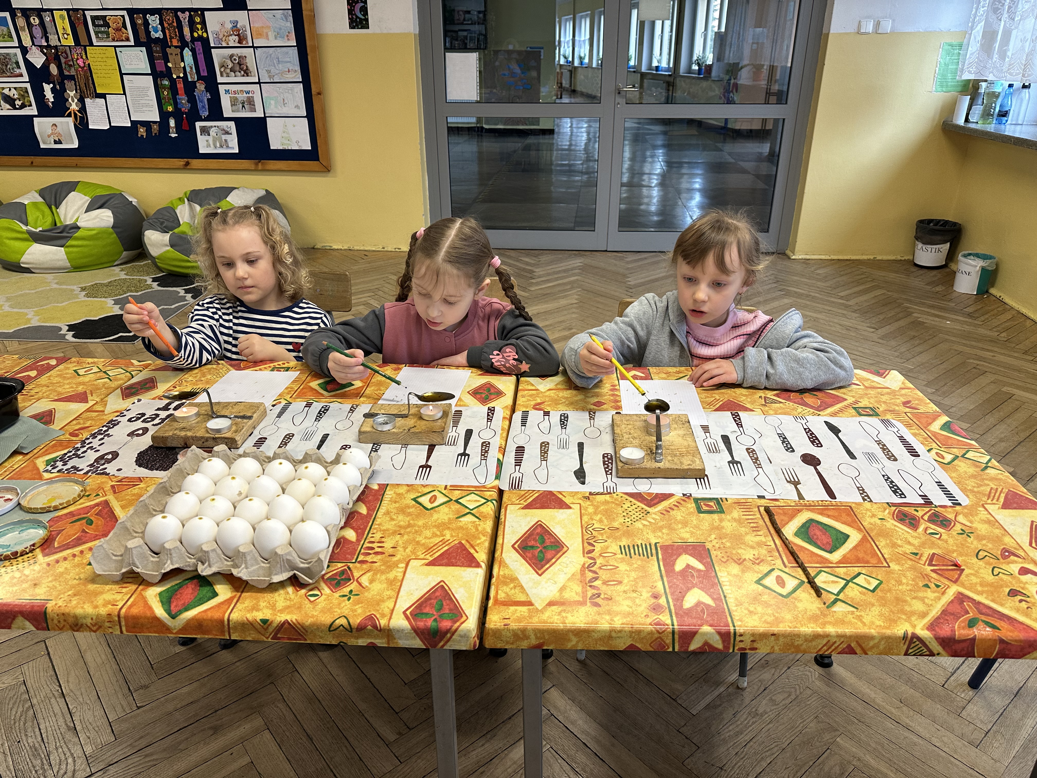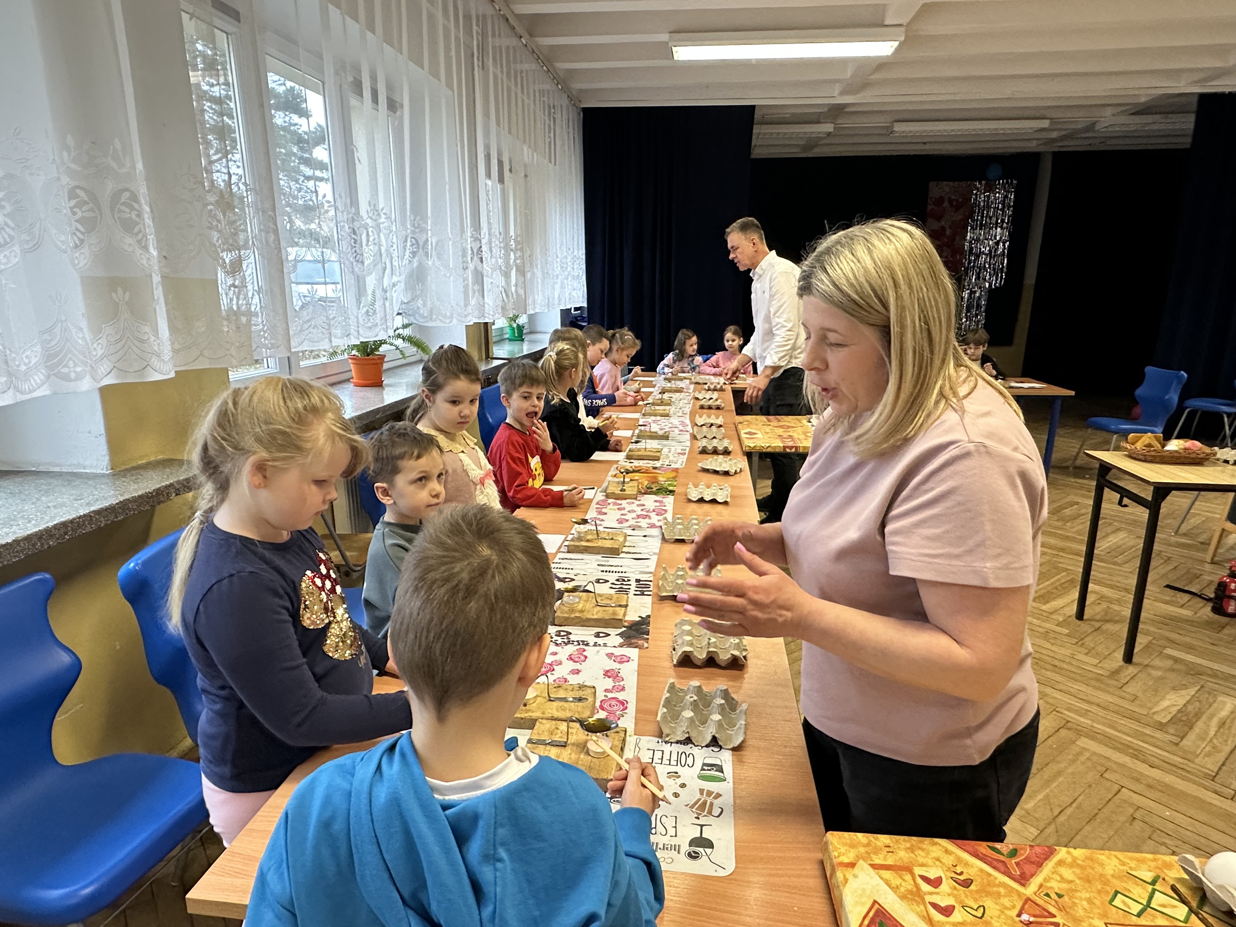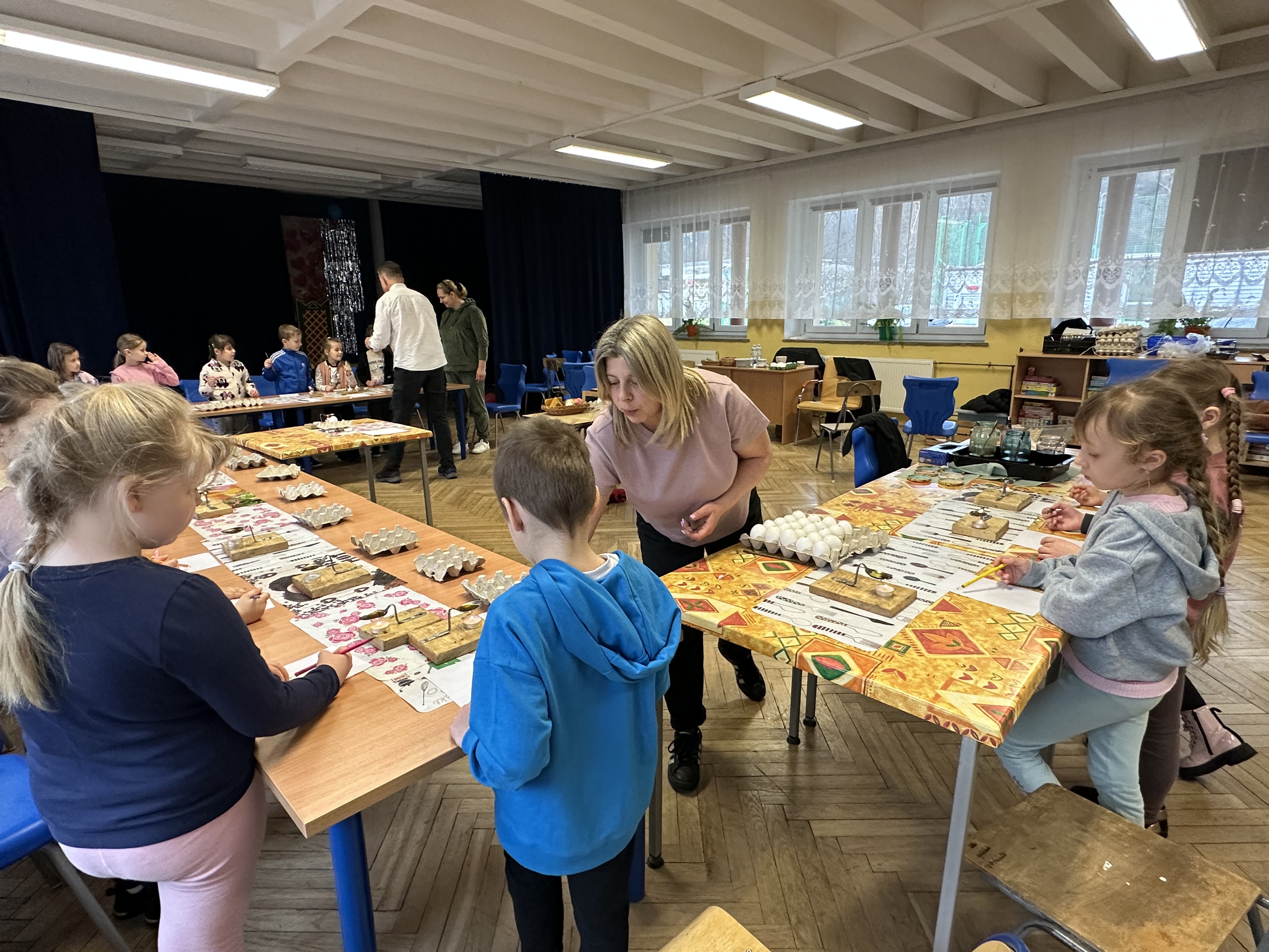31 marca 2026 roku grupa „Pszczółek” uczestniczyła w warsztatach wielkanocnych zorganizowanych w Szkole Podstawowej nr 6 im. Władysława Broniewskiego w Trzebini pod hasłem „Przygoda z woskiem pszczelim i pisankami”. Celem spotkania było zapoznanie dzieci z techniką szpilkową wykorzystywaną do ozdabiania wydmuszek oraz przybliżenie tradycji wielkanocnych związanych z naszym regionem. Na początku warsztatów osoby prowadzące -pani Ania oraz pan Tytus -przywitały się ze starszakami i nawiązały w rozmowie do zwyczajów wielkanocnych. Następnie dzieci dowiedziały się, na czym polega technika szpilkowa i jak można ją wykorzystać do tworzenia pisanek. Prowadzący zaprezentowali kolejne etapy ozdabiania wydmuszek, zwracając szczególną uwagę na bezpieczeństwo podczas wykonywania prac. Dzieci z dużym zainteresowaniem obserwowały pokaz i chętnie słuchały wskazówek. Po części pokazowej uczestnicy przystąpili do samodzielnej pracy. Każde dziecko wykonało własną, wyjątkową pisankę techniką szpilkową. Warsztaty były dla dzieci nie tylko okazją do rozwijania zdolności manualnych i kreatywności, ale także do poznania wielkanocnych tradycji. Wykonane pisanki dzieci mogły zaprezentować kolegom i koleżankom w przedszkolu, a następnie zabrać do domu. Spotkanie przebiegło w miłej i radosnej atmosferze.