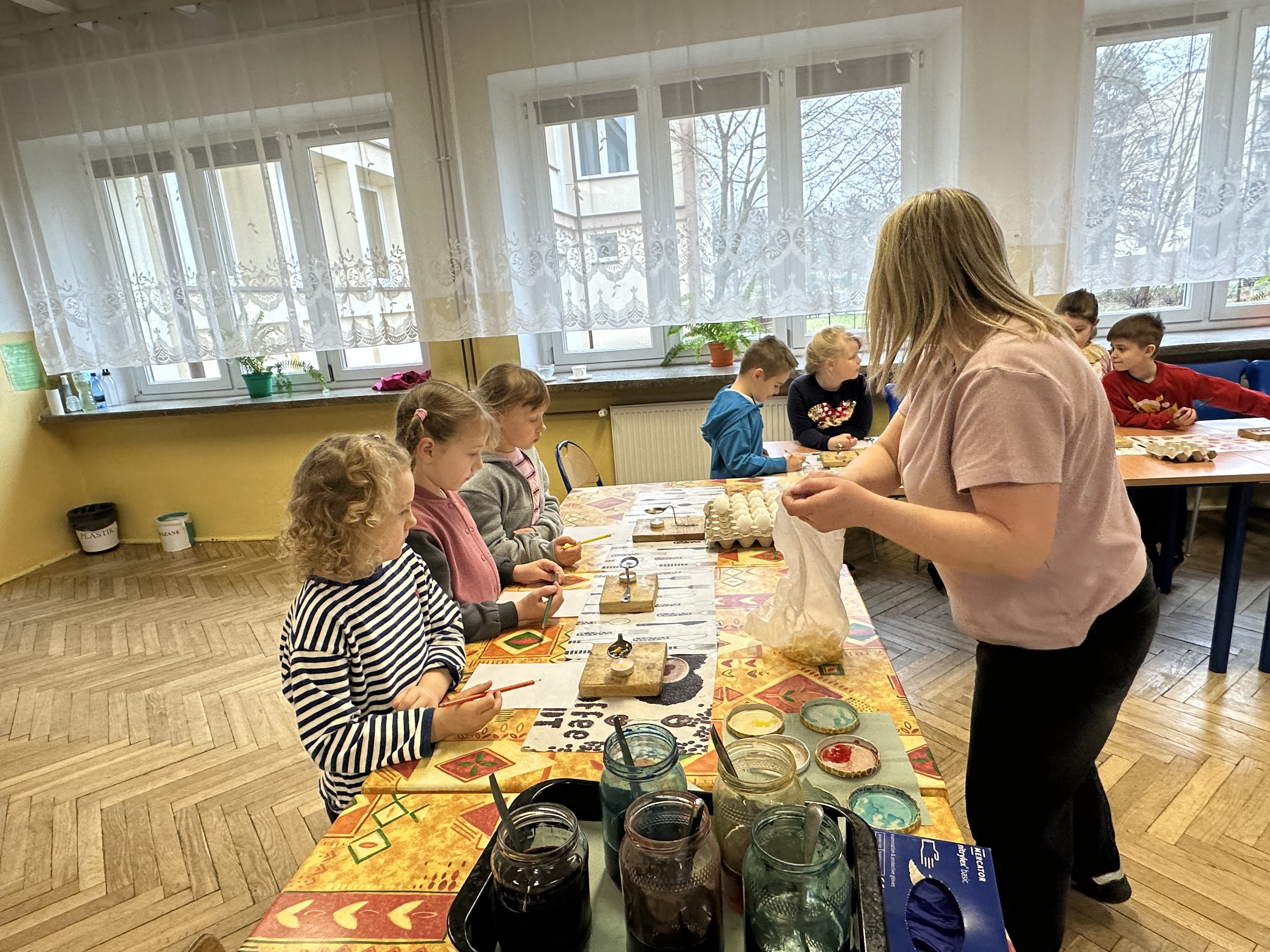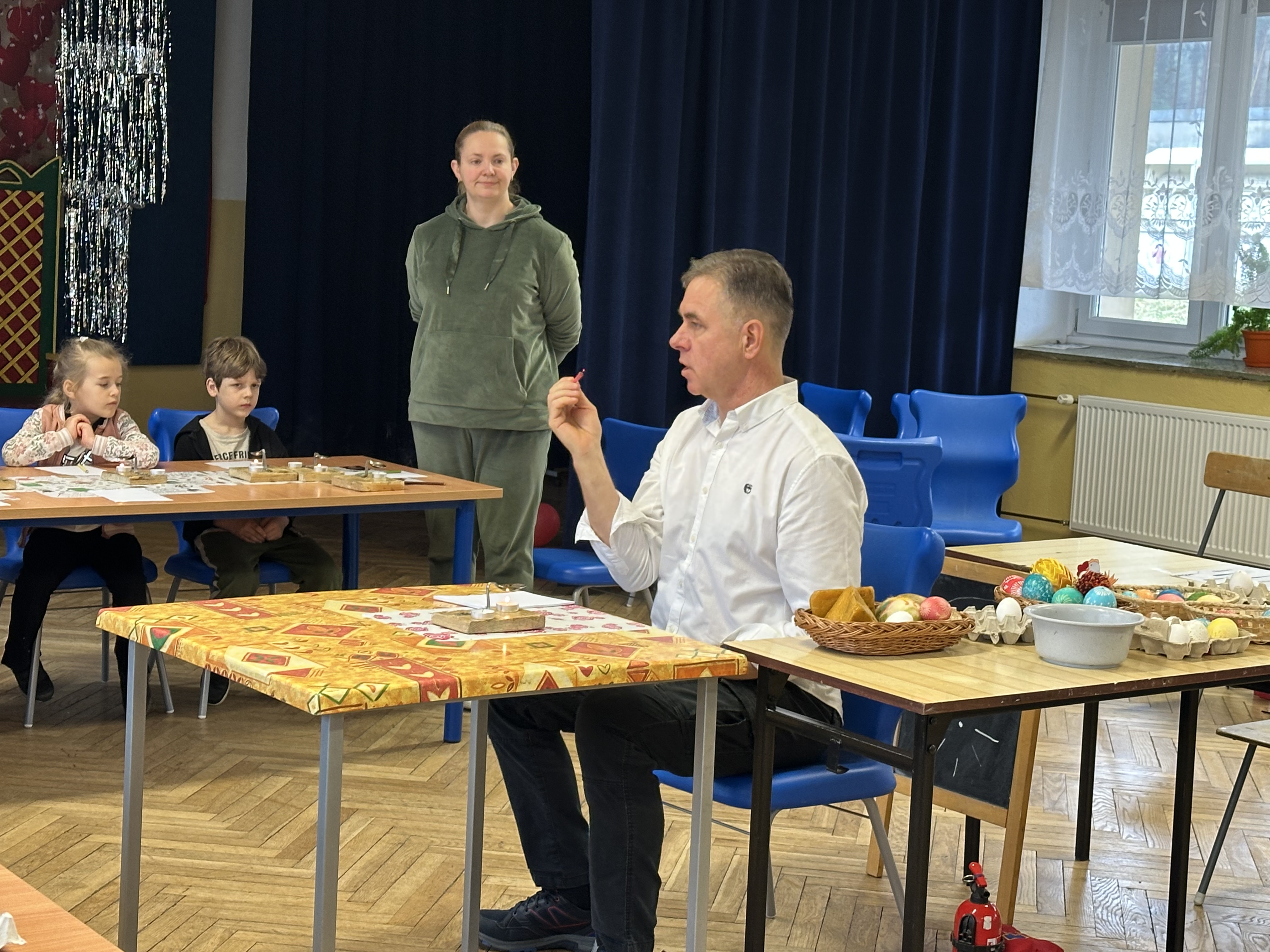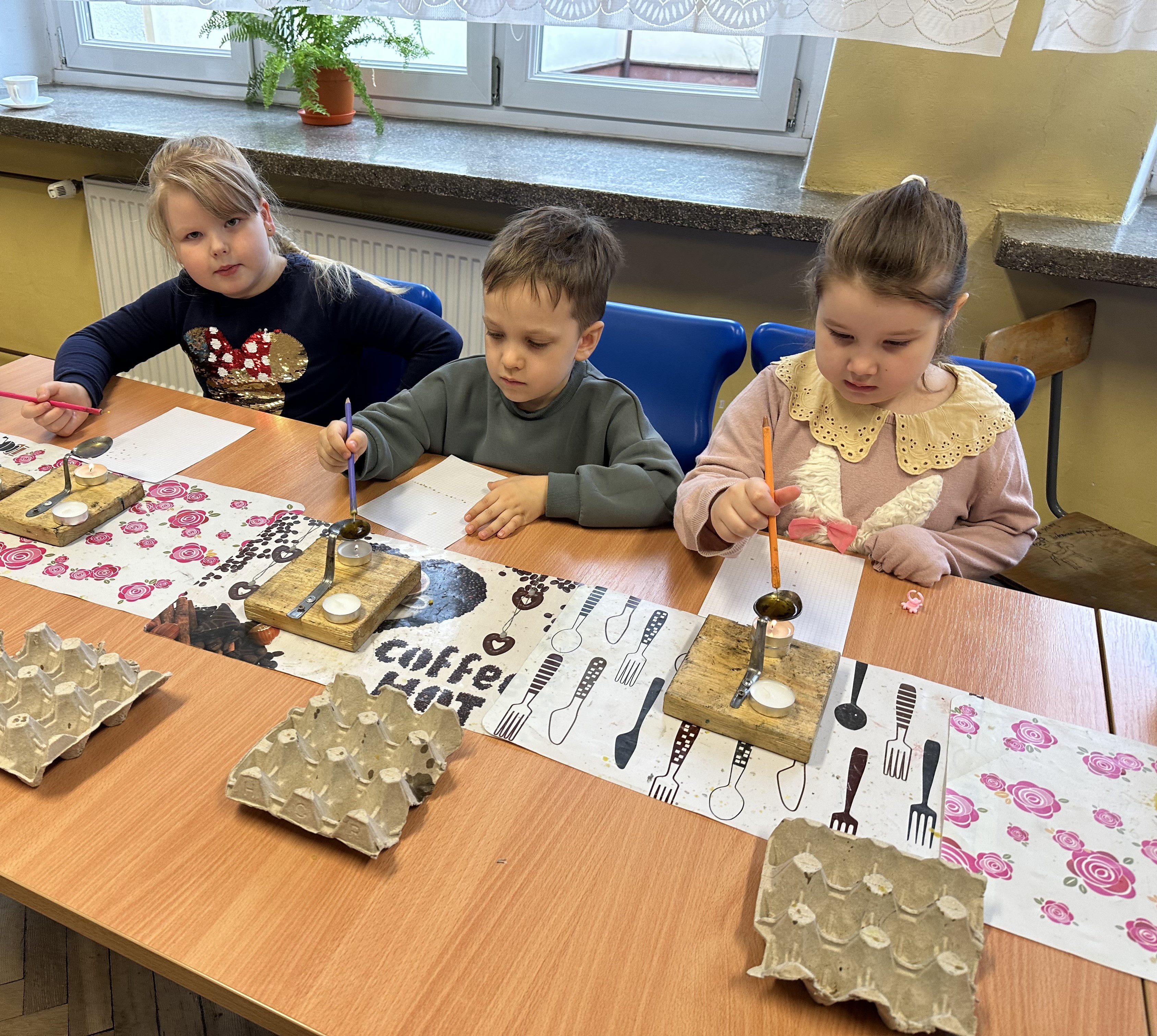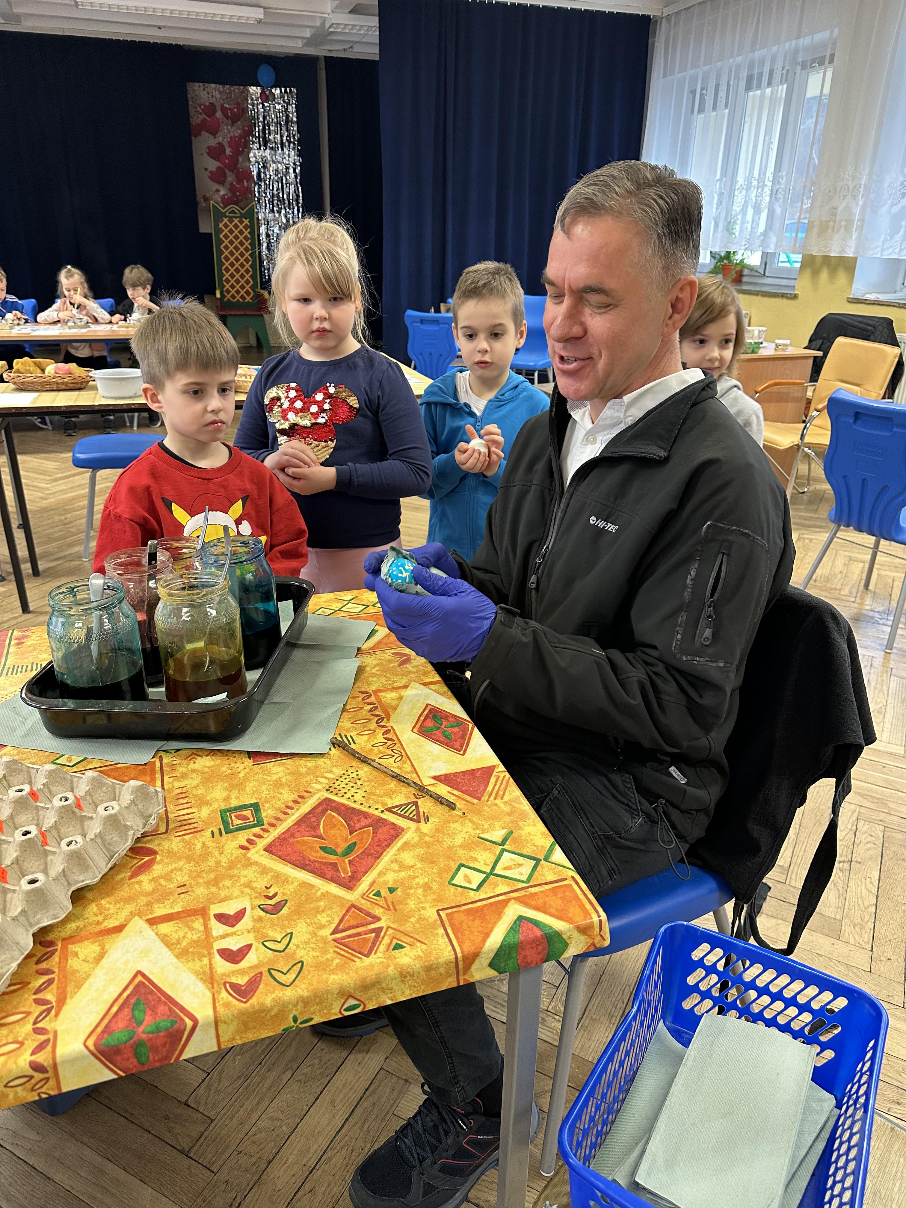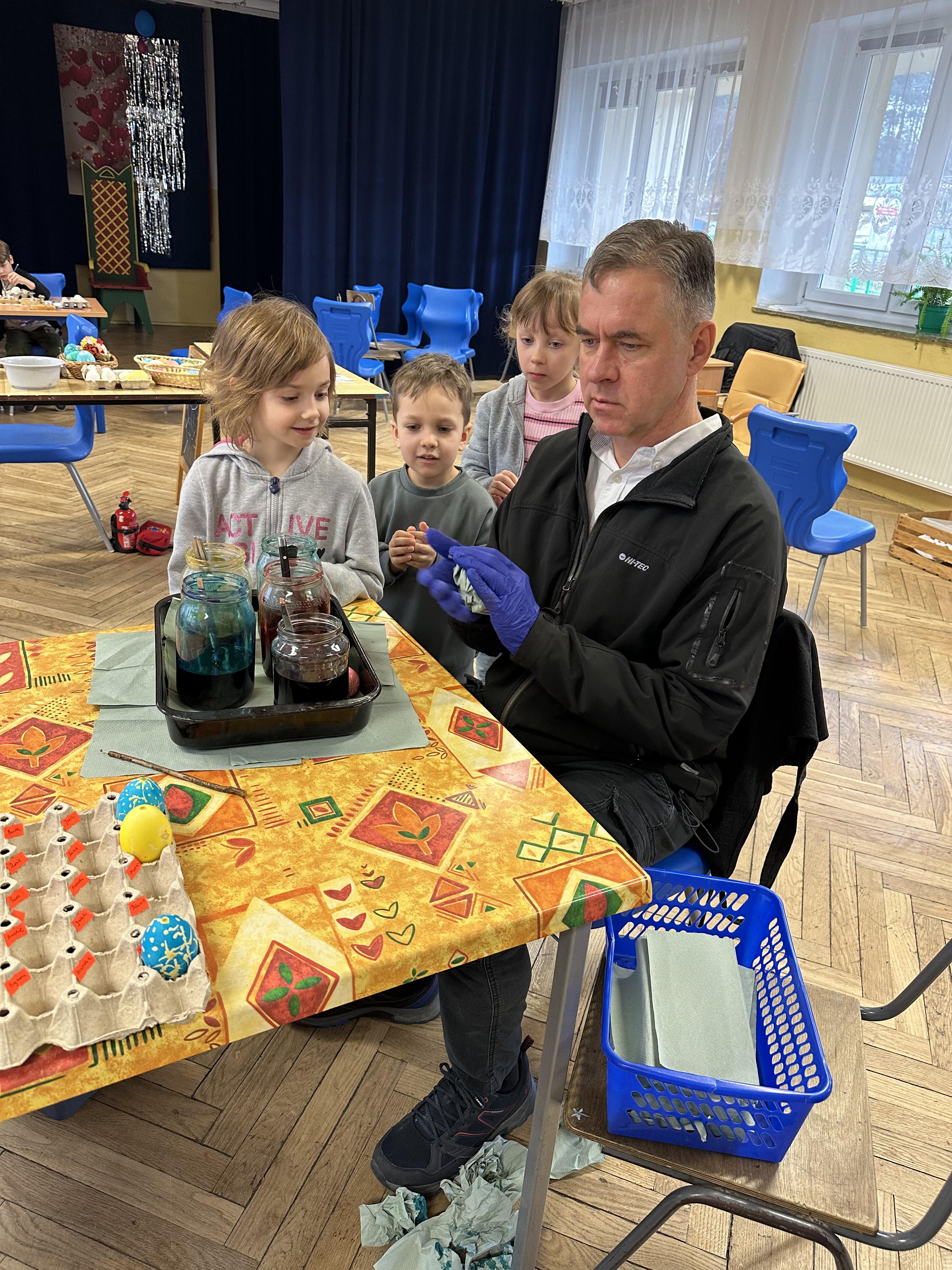 31 marca 2026 roku grupa „Pszczółek” uczestniczyła w warsztatach wielkanocnych zorganizowanych w Szkole Podstawowej nr 6 im. Władysława Broniewskiego w Trzebini pod hasłem „Przygoda z woskiem pszczelim i pisankami”. Celem spotkania było zapoznanie dzieci z techniką szpilkową wykorzystywaną do ozdabiania wydmuszek oraz przybliżenie tradycji wielkanocnych związanych z naszym regionem. Na początku warsztatów osoby prowadzące -pani Ania oraz pan Tytus -przywitały się ze starszakami i nawiązały w rozmowie do zwyczajów wielkanocnych. Następnie dzieci dowiedziały się, na czym polega technika szpilkowa i jak można ją wykorzystać do tworzenia pisanek. Prowadzący zaprezentowali kolejne etapy ozdabiania wydmuszek, zwracając szczególną uwagę na bezpieczeństwo podczas wykonywania prac. Dzieci z dużym zainteresowaniem obserwowały pokaz i chętnie słuchały wskazówek. Po części pokazowej uczestnicy przystąpili do samodzielnej pracy. Każde dziecko wykonało własną, wyjątkową pisankę techniką szpilkową. Warsztaty były dla dzieci nie tylko okazją do rozwijania zdolności manualnych i kreatywności, ale także do poznania wielkanocnych tradycji. Wykonane pisanki dzieci mogły zaprezentować kolegom i koleżankom w przedszkolu, a następnie zabrać do domu. Spotkanie przebiegło w miłej i radosnej atmosferze.