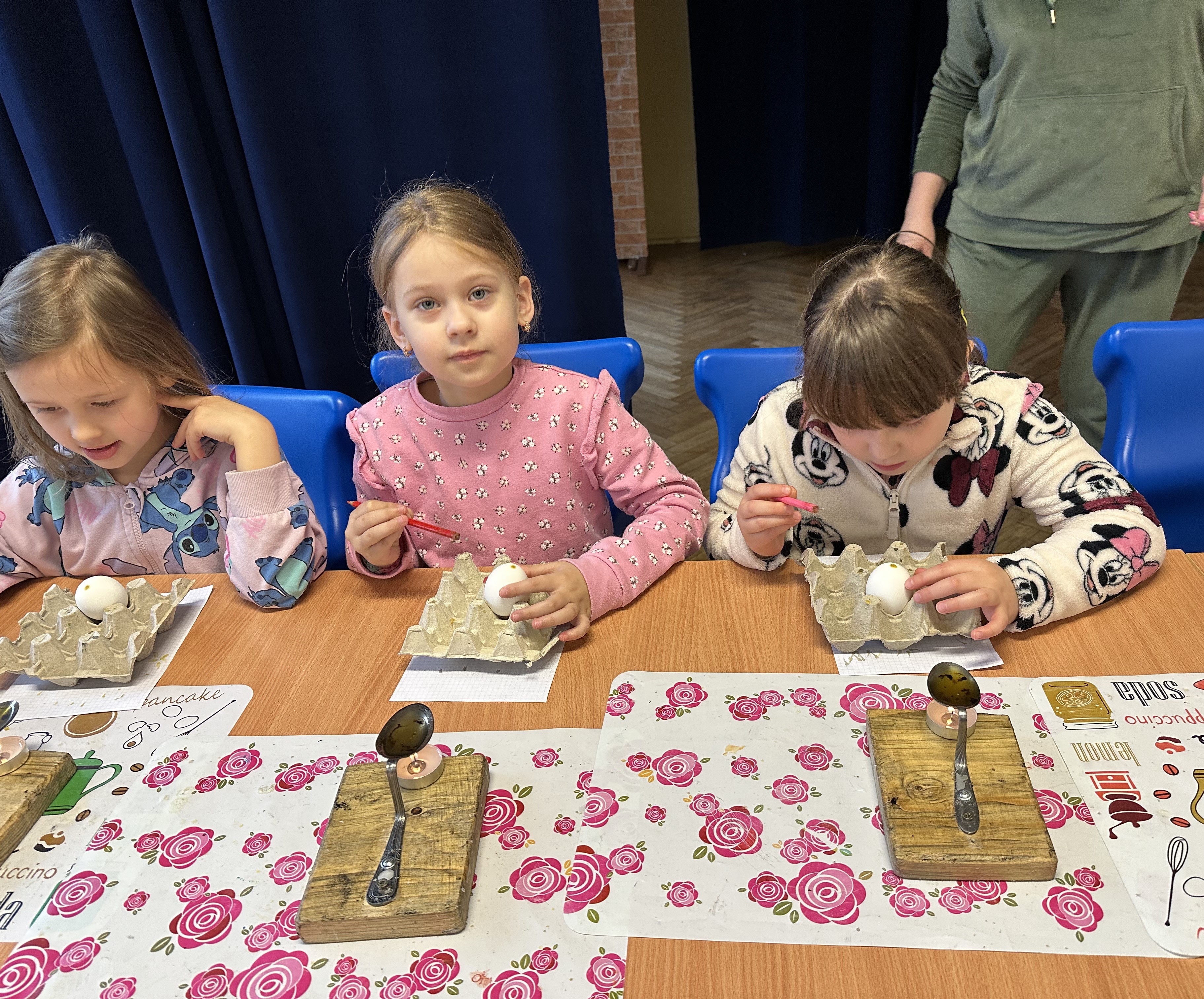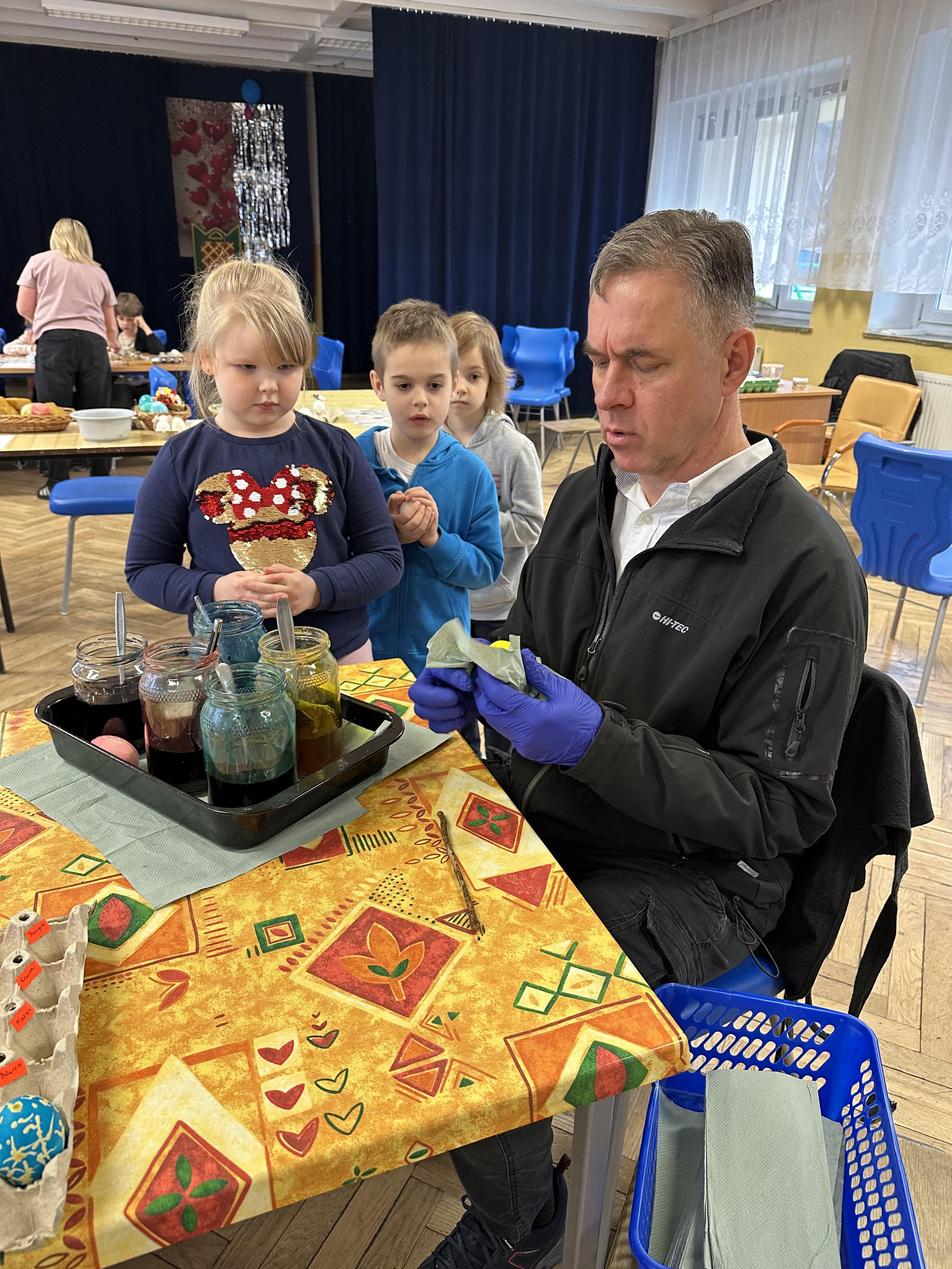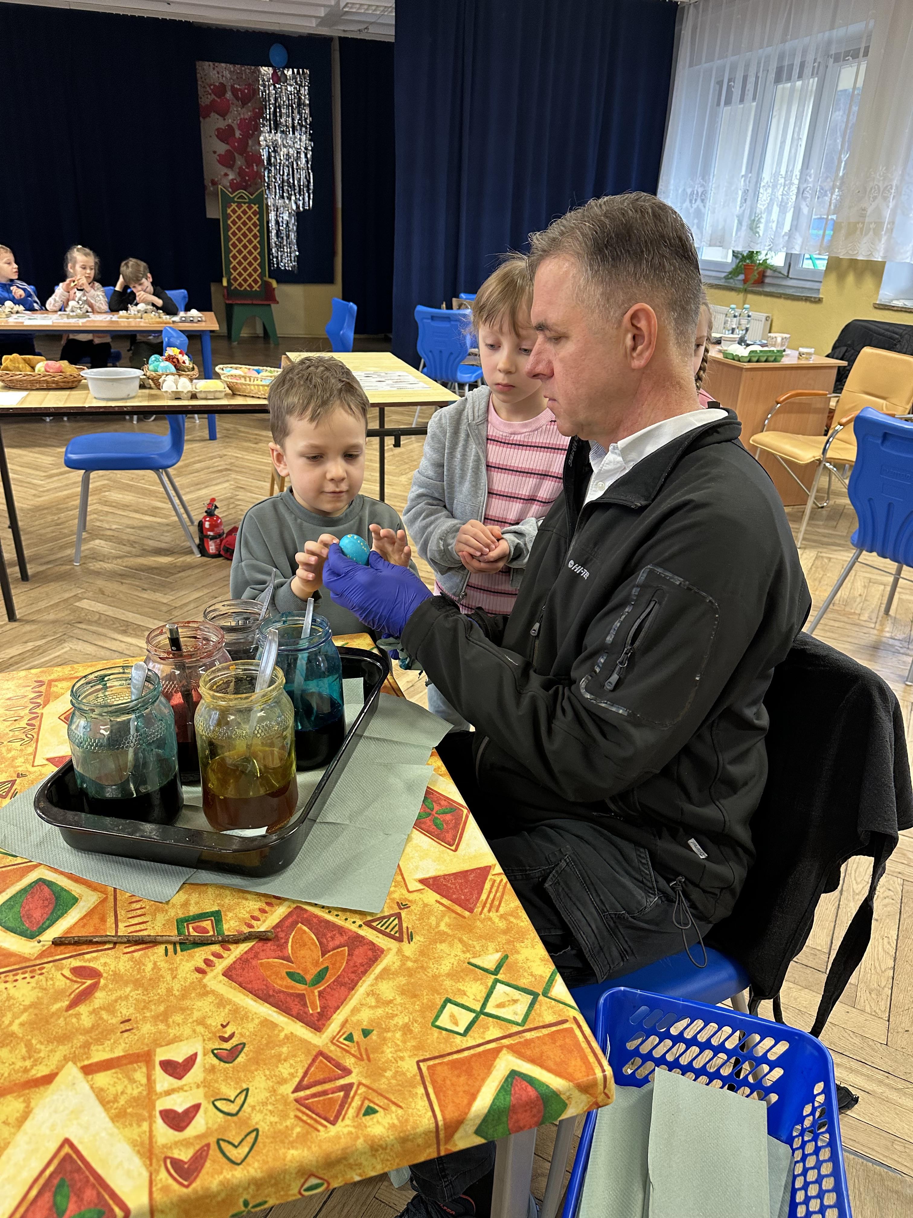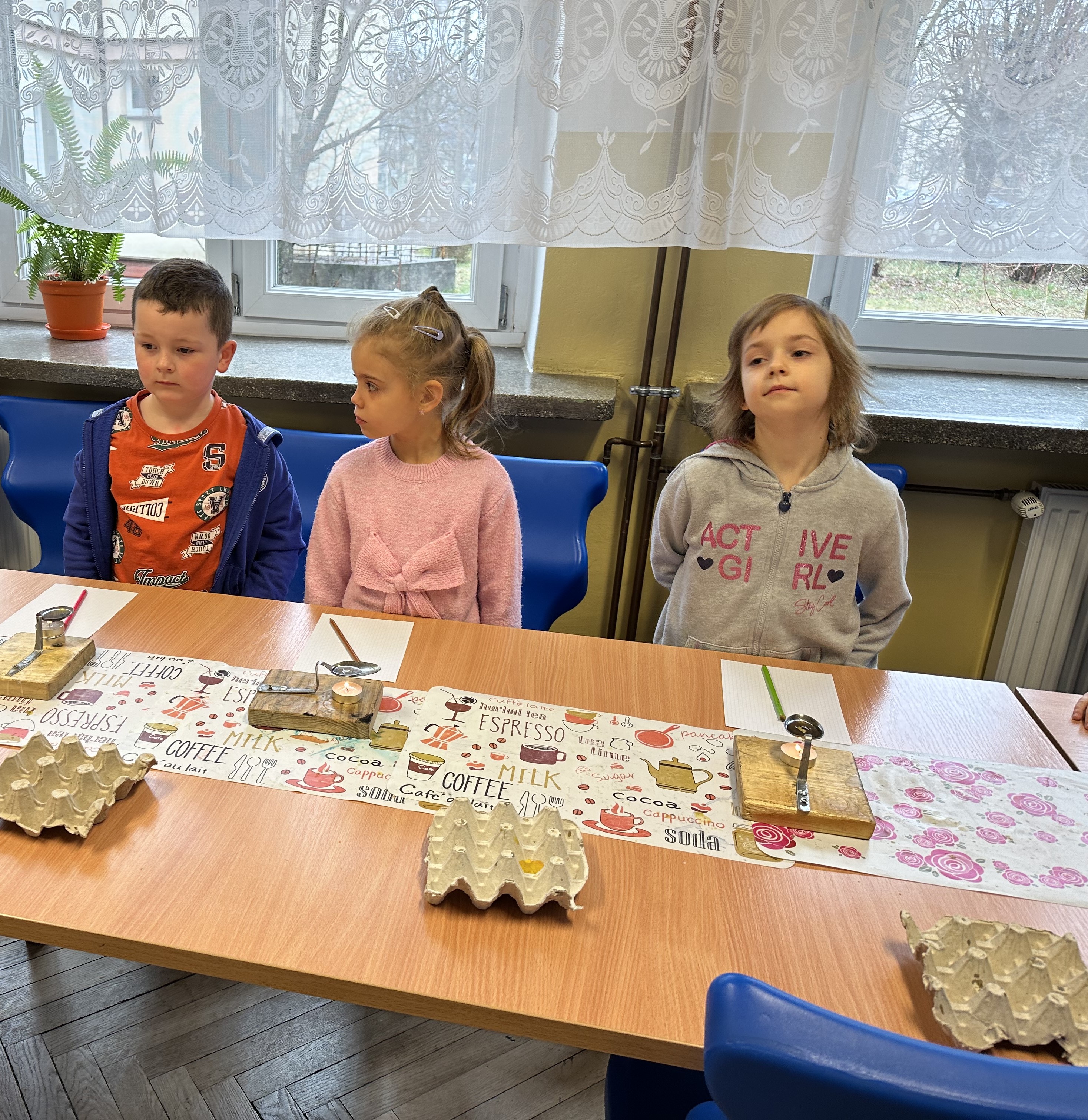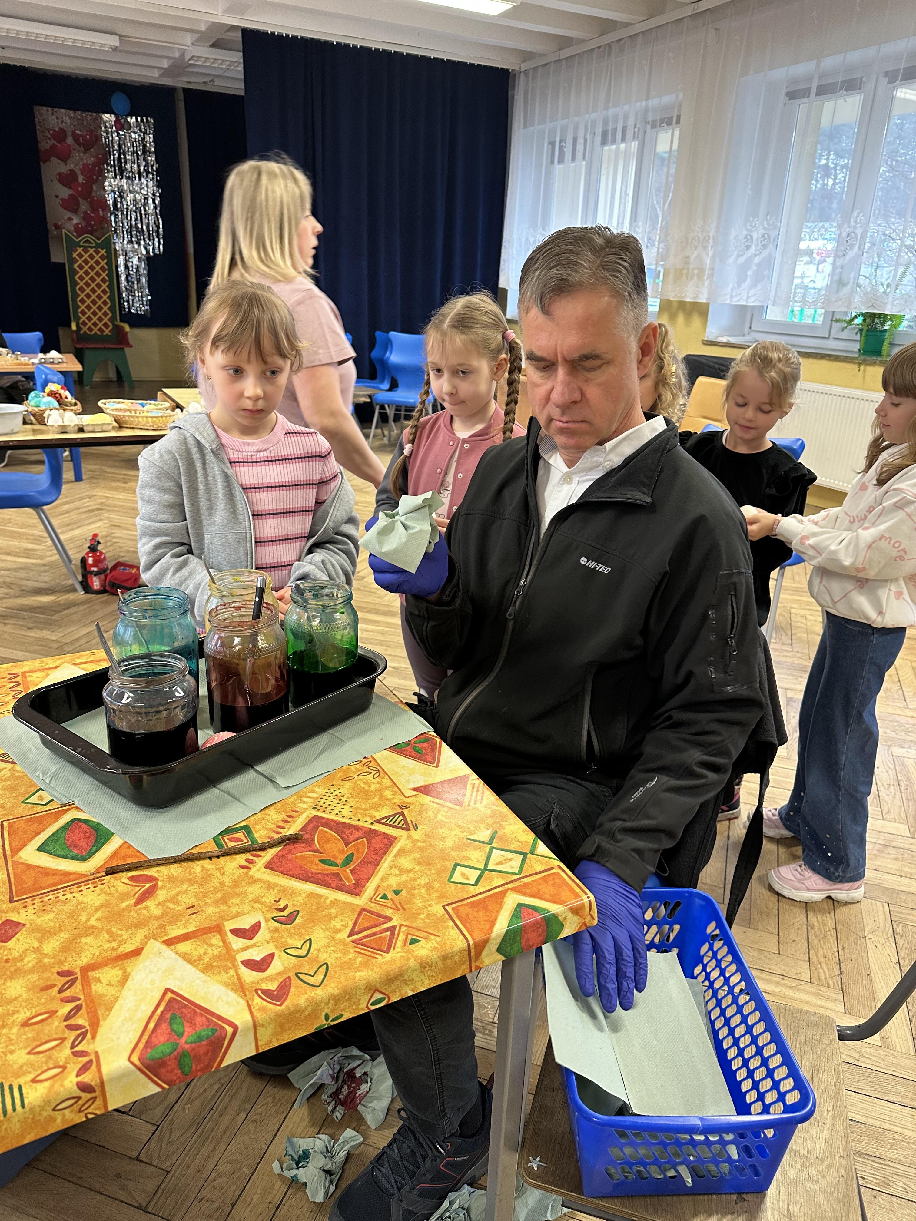 31 marca 2026 roku grupa „Pszczółek” uczestniczyła w warsztatach wielkanocnych zorganizowanych w Szkole Podstawowej nr 6 im. Władysława Broniewskiego w Trzebini pod hasłem „Przygoda z woskiem pszczelim i pisankami”. Celem spotkania było zapoznanie dzieci z techniką szpilkową wykorzystywaną do ozdabiania wydmuszek oraz przybliżenie tradycji wielkanocnych związanych z naszym regionem. Na początku warsztatów osoby prowadzące -pani Ania oraz pan Tytus -przywitały się ze starszakami i nawiązały w rozmowie do zwyczajów wielkanocnych. Następnie dzieci dowiedziały się, na czym polega technika szpilkowa i jak można ją wykorzystać do tworzenia pisanek. Prowadzący zaprezentowali kolejne etapy ozdabiania wydmuszek, zwracając szczególną uwagę na bezpieczeństwo podczas wykonywania prac. Dzieci z dużym zainteresowaniem obserwowały pokaz i chętnie słuchały wskazówek. Po części pokazowej uczestnicy przystąpili do samodzielnej pracy. Każde dziecko wykonało własną, wyjątkową pisankę techniką szpilkową. Warsztaty były dla dzieci nie tylko okazją do rozwijania zdolności manualnych i kreatywności, ale także do poznania wielkanocnych tradycji. Wykonane pisanki dzieci mogły zaprezentować kolegom i koleżankom w przedszkolu, a następnie zabrać do domu. Spotkanie przebiegło w miłej i radosnej atmosferze.