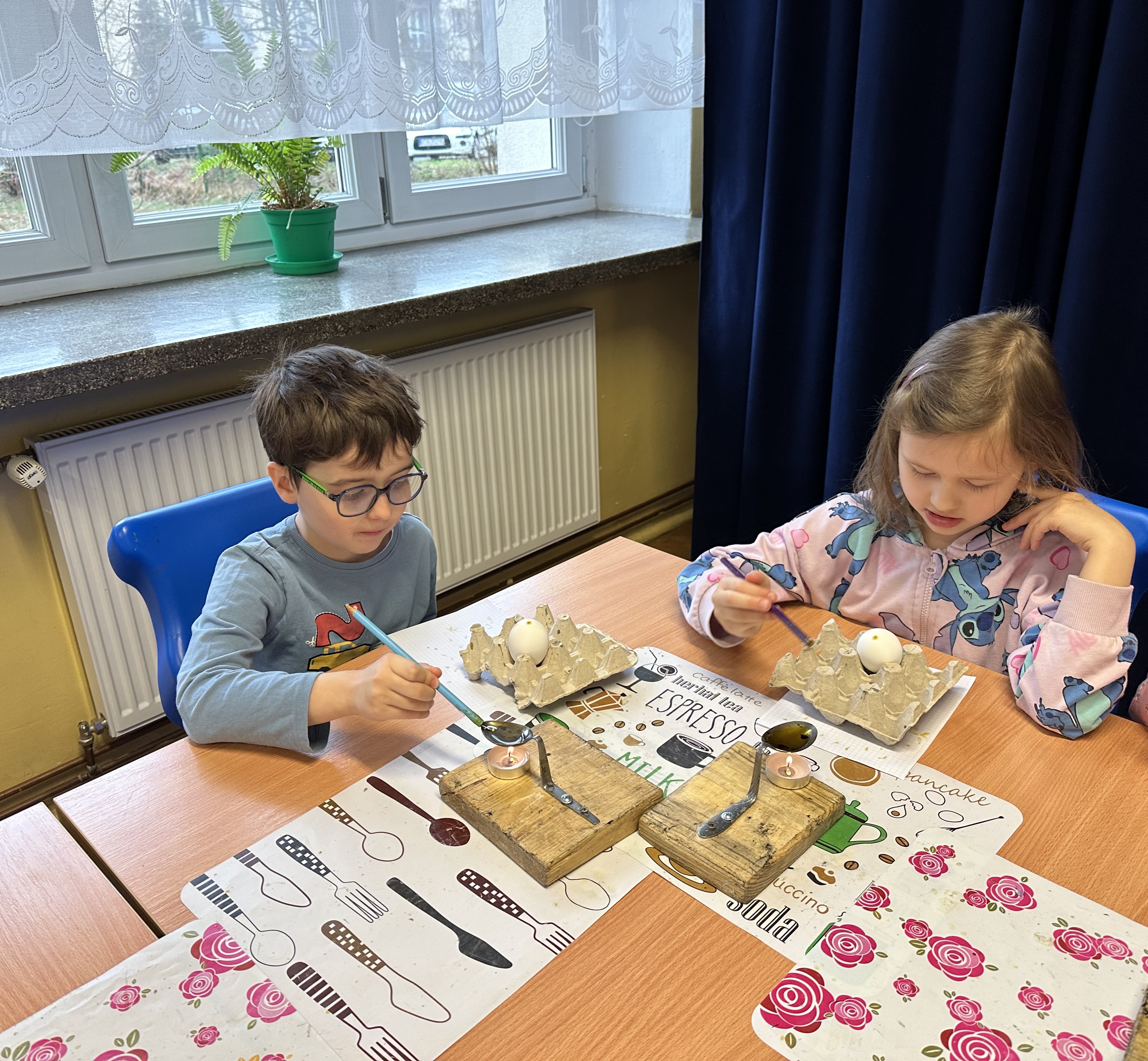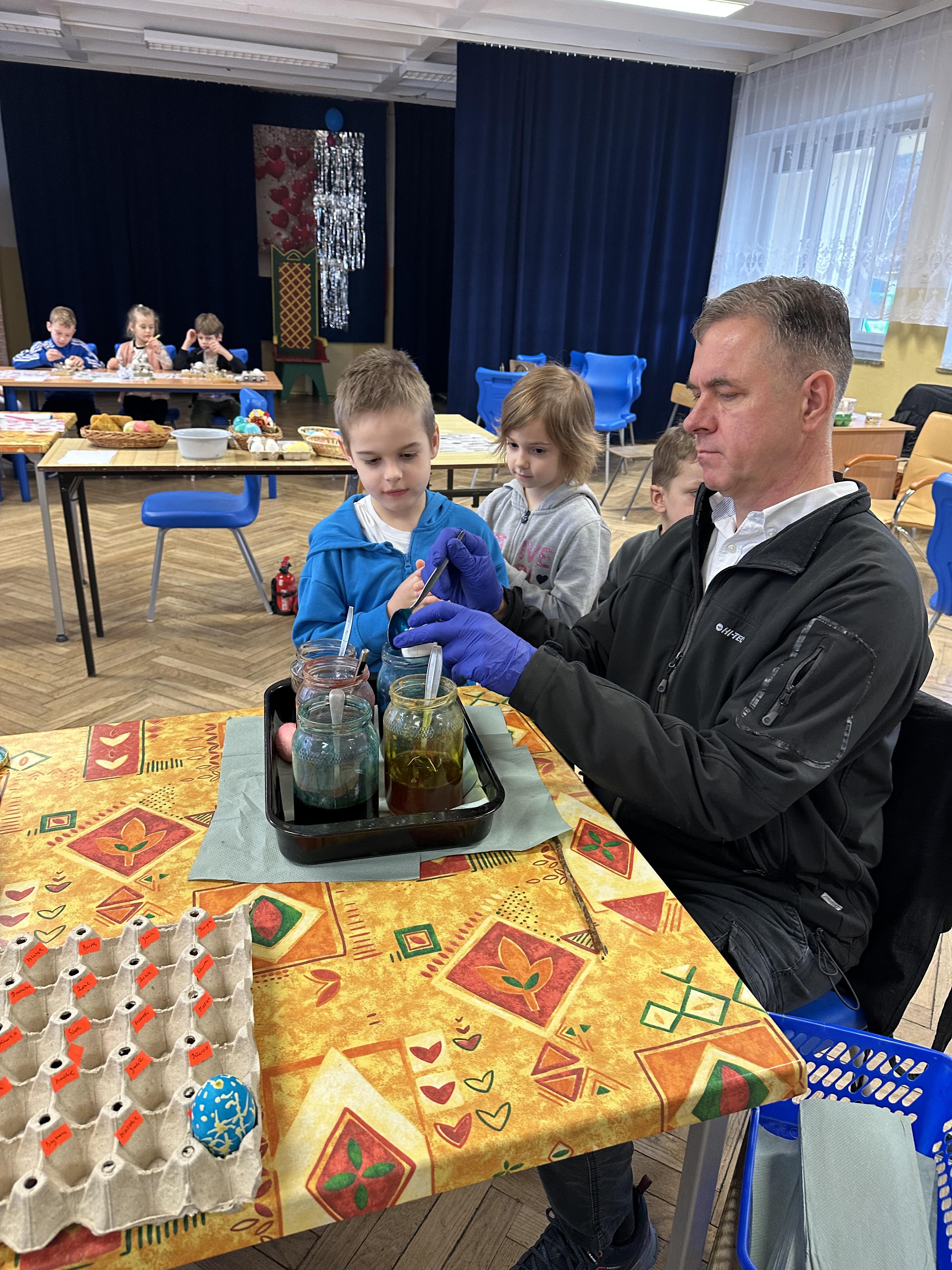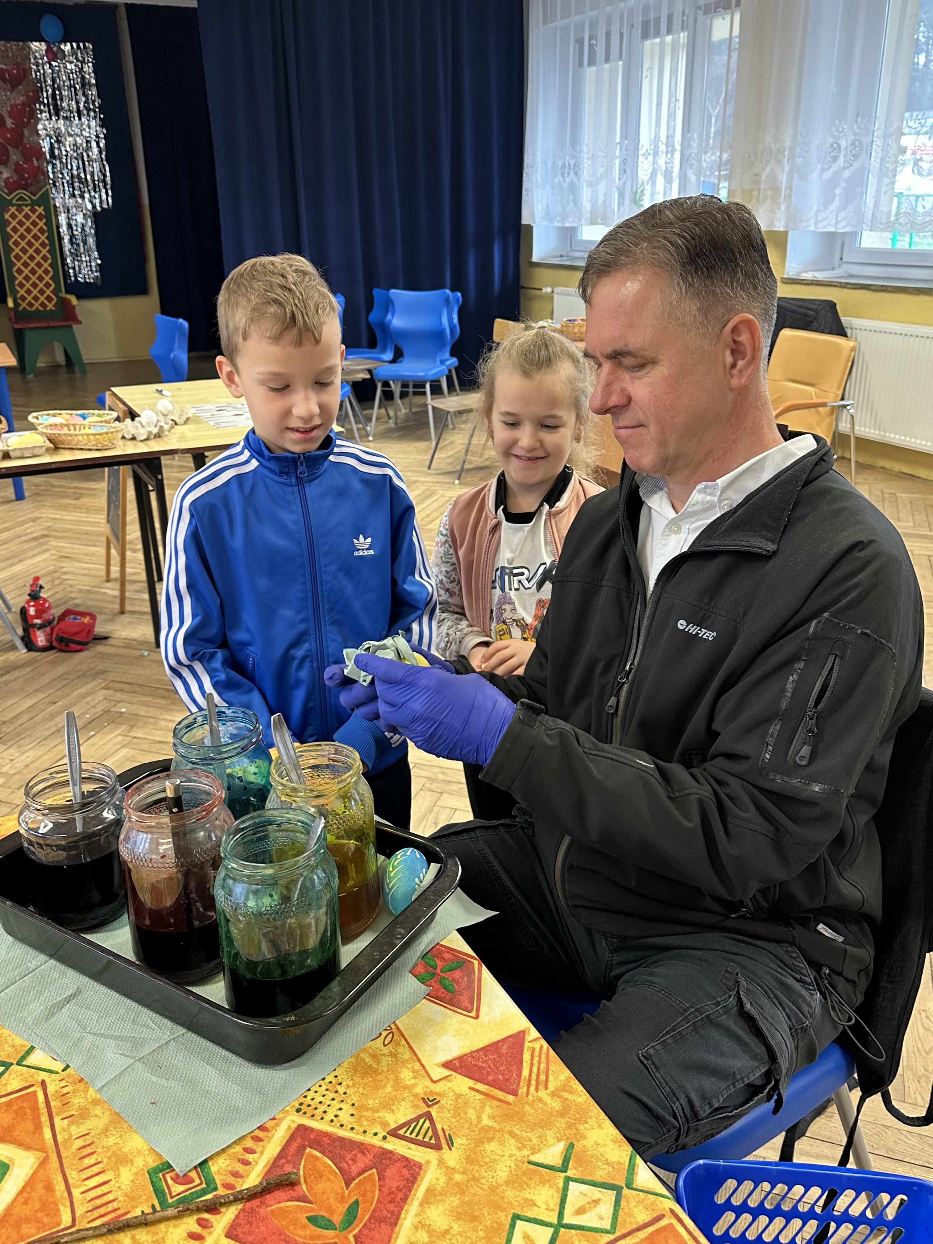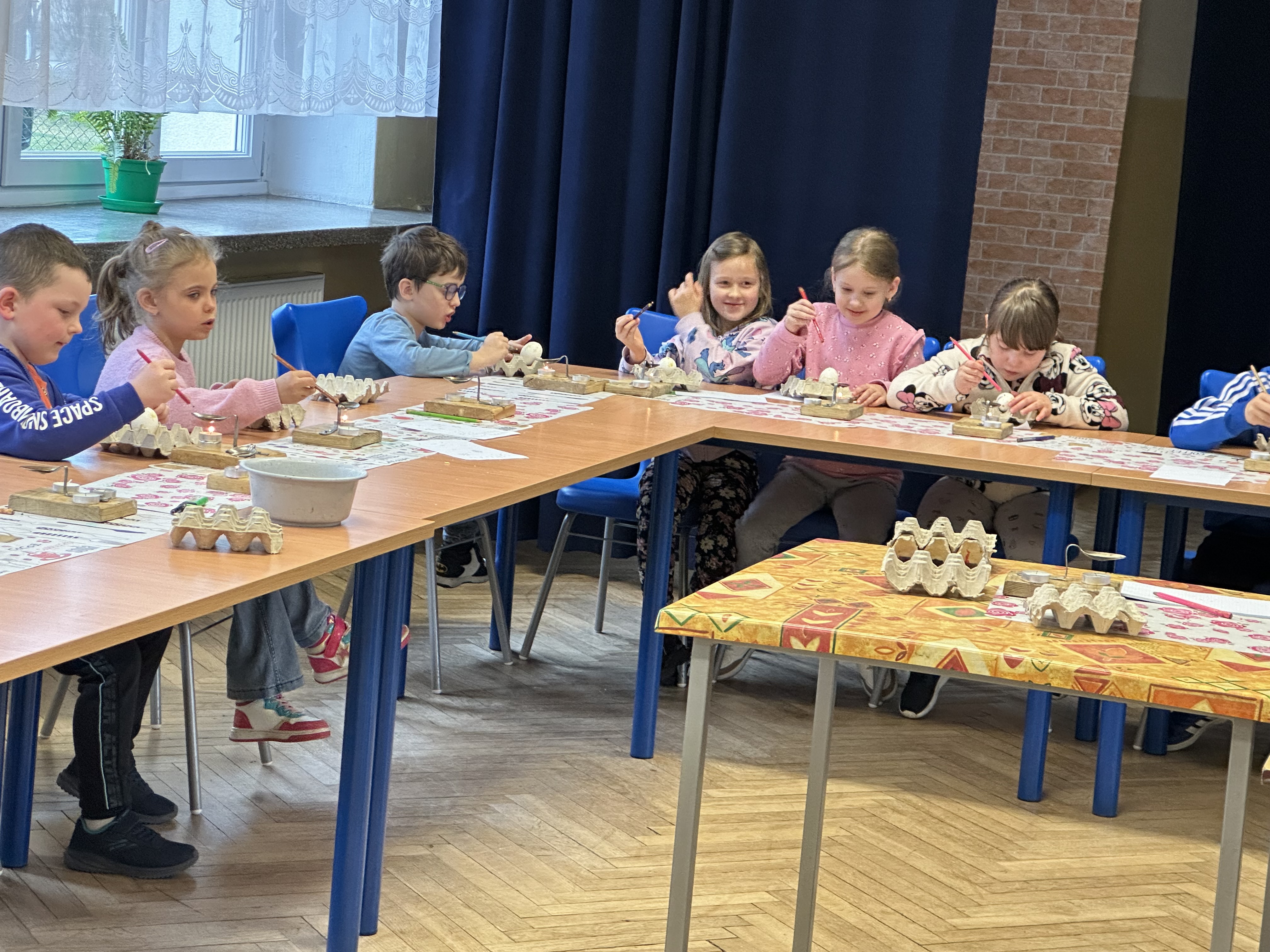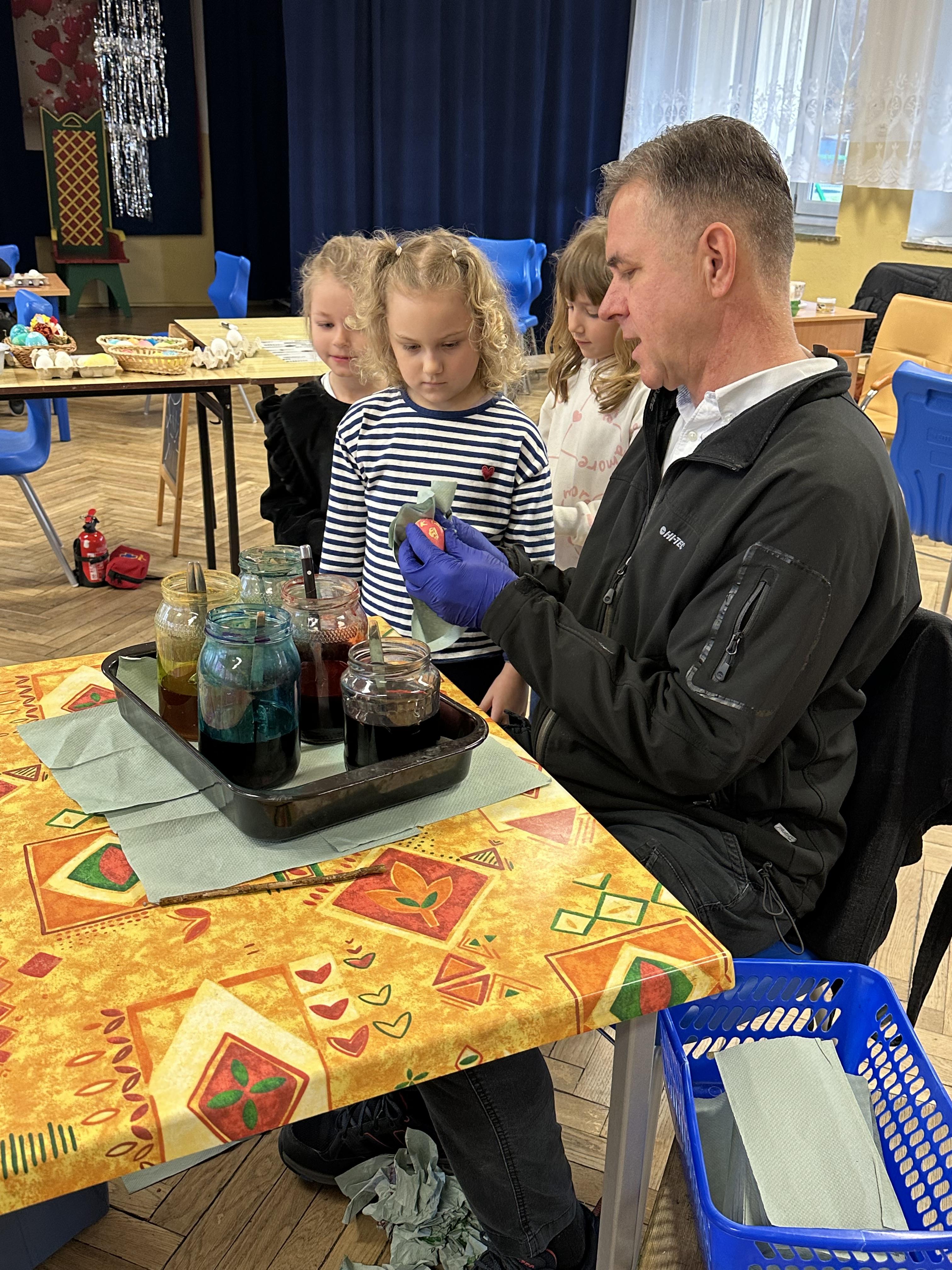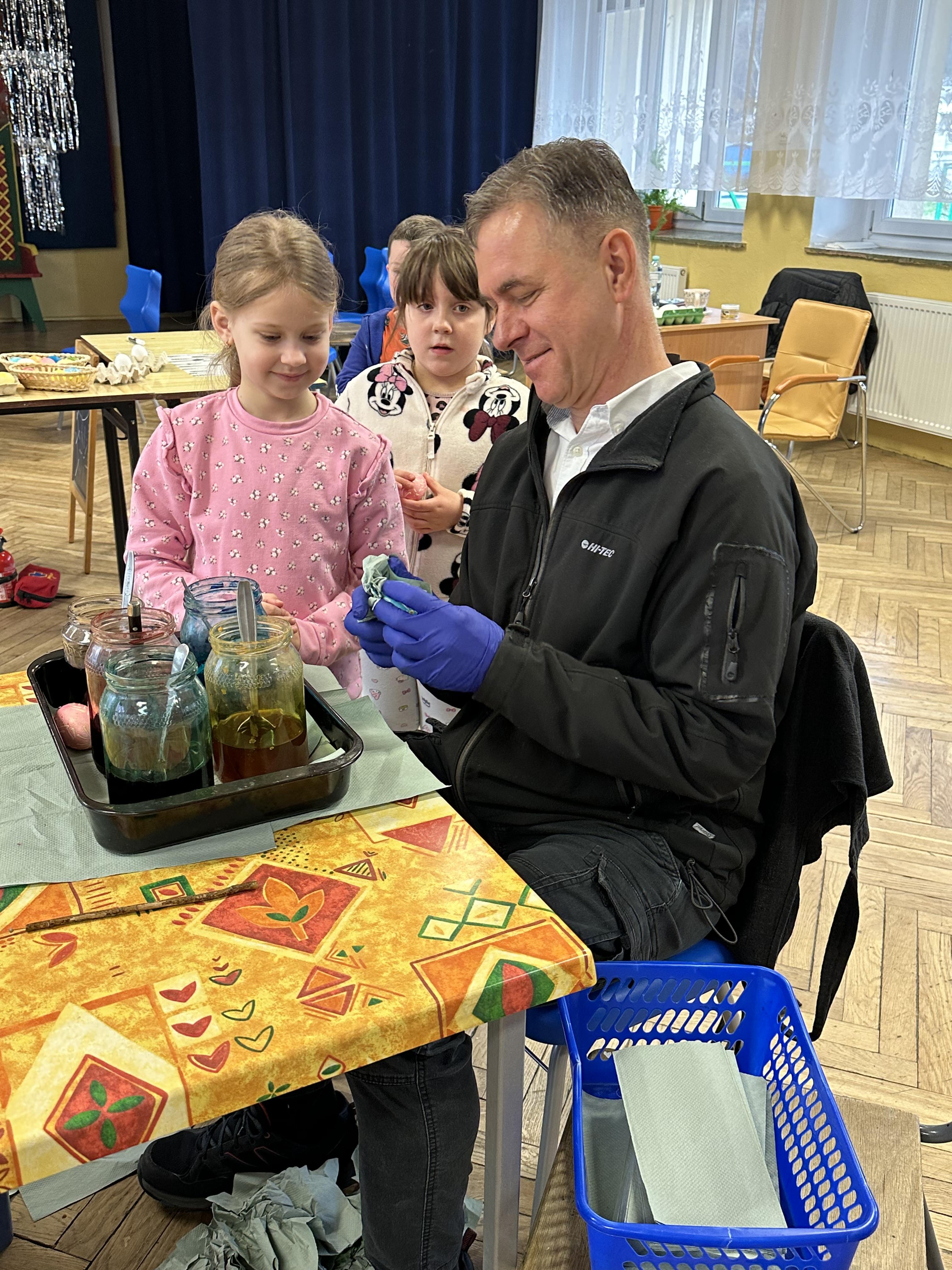 31 marca 2026 roku grupa „Pszczółek” uczestniczyła w warsztatach wielkanocnych zorganizowanych w Szkole Podstawowej nr 6 im. Władysława Broniewskiego w Trzebini pod hasłem „Przygoda z woskiem pszczelim i pisankami”. Celem spotkania było zapoznanie dzieci z techniką szpilkową wykorzystywaną do ozdabiania wydmuszek oraz przybliżenie tradycji wielkanocnych związanych z naszym regionem. Na początku warsztatów osoby prowadzące -pani Ania oraz pan Tytus -przywitały się ze starszakami i nawiązały w rozmowie do zwyczajów wielkanocnych. Następnie dzieci dowiedziały się, na czym polega technika szpilkowa i jak można ją wykorzystać do tworzenia pisanek. Prowadzący zaprezentowali kolejne etapy ozdabiania wydmuszek, zwracając szczególną uwagę na bezpieczeństwo podczas wykonywania prac. Dzieci z dużym zainteresowaniem obserwowały pokaz i chętnie słuchały wskazówek. Po części pokazowej uczestnicy przystąpili do samodzielnej pracy. Każde dziecko wykonało własną, wyjątkową pisankę techniką szpilkową. Warsztaty były dla dzieci nie tylko okazją do rozwijania zdolności manualnych i kreatywności, ale także do poznania wielkanocnych tradycji. Wykonane pisanki dzieci mogły zaprezentować kolegom i koleżankom w przedszkolu, a następnie zabrać do domu. Spotkanie przebiegło w miłej i radosnej atmosferze.