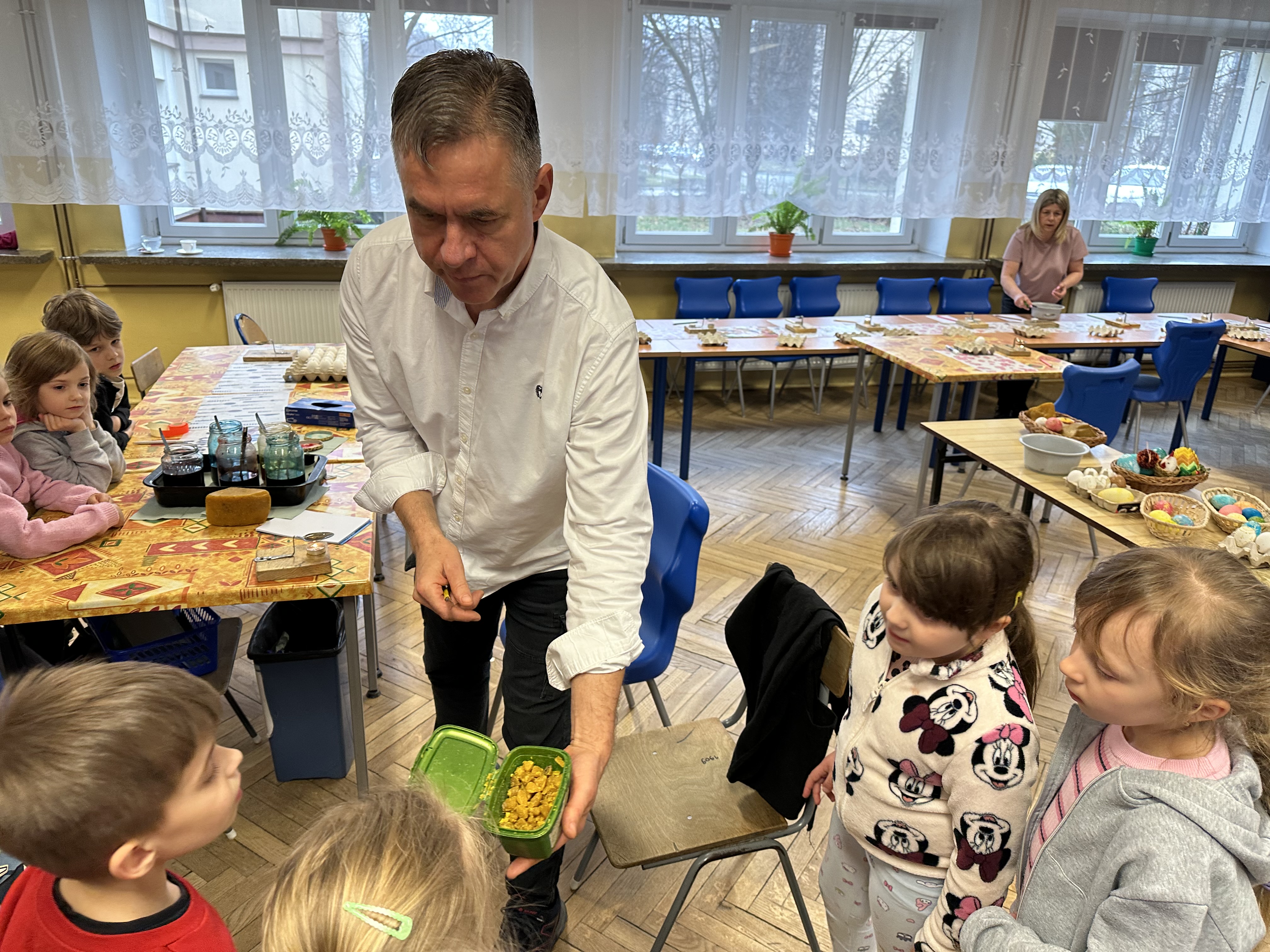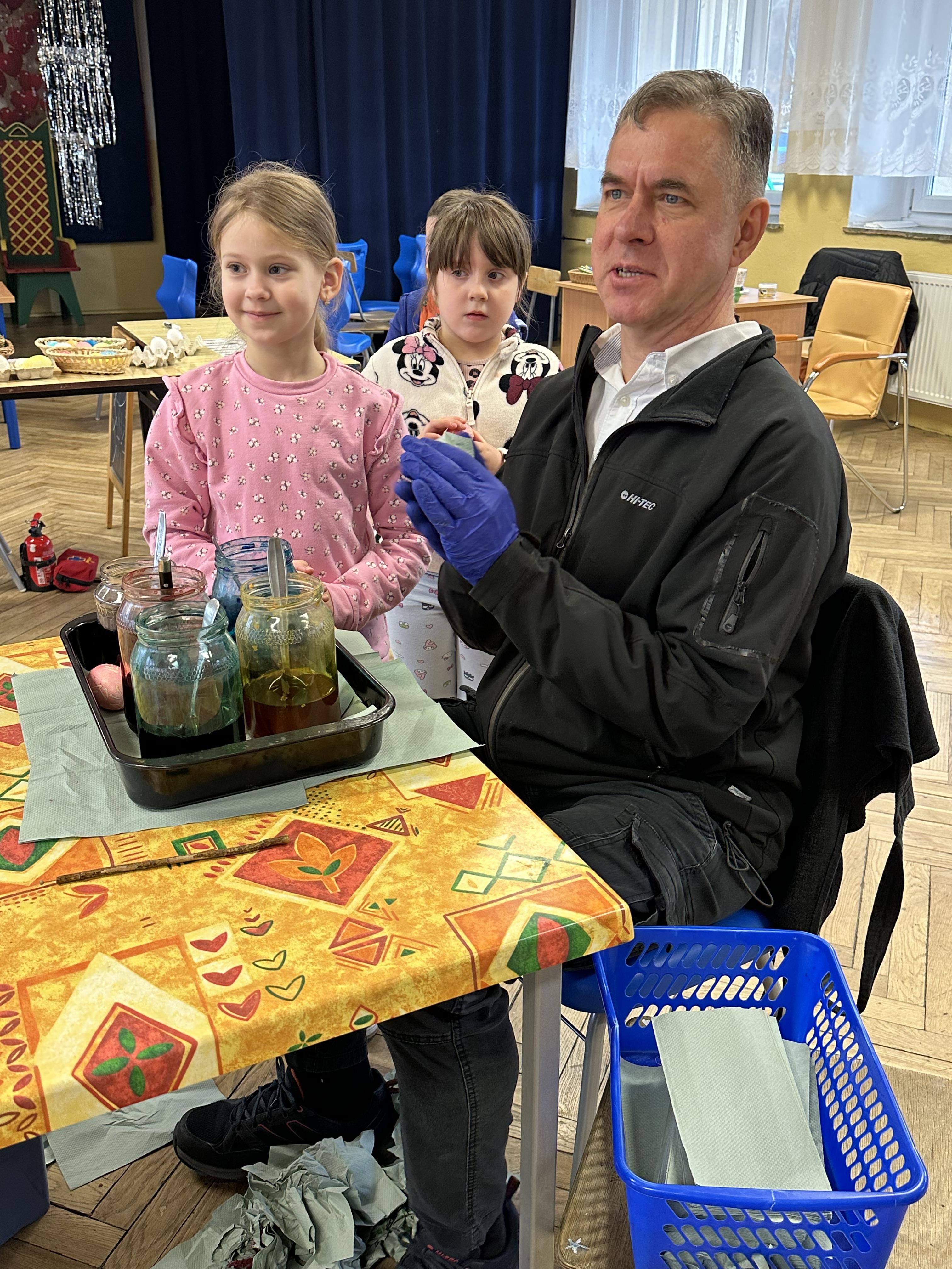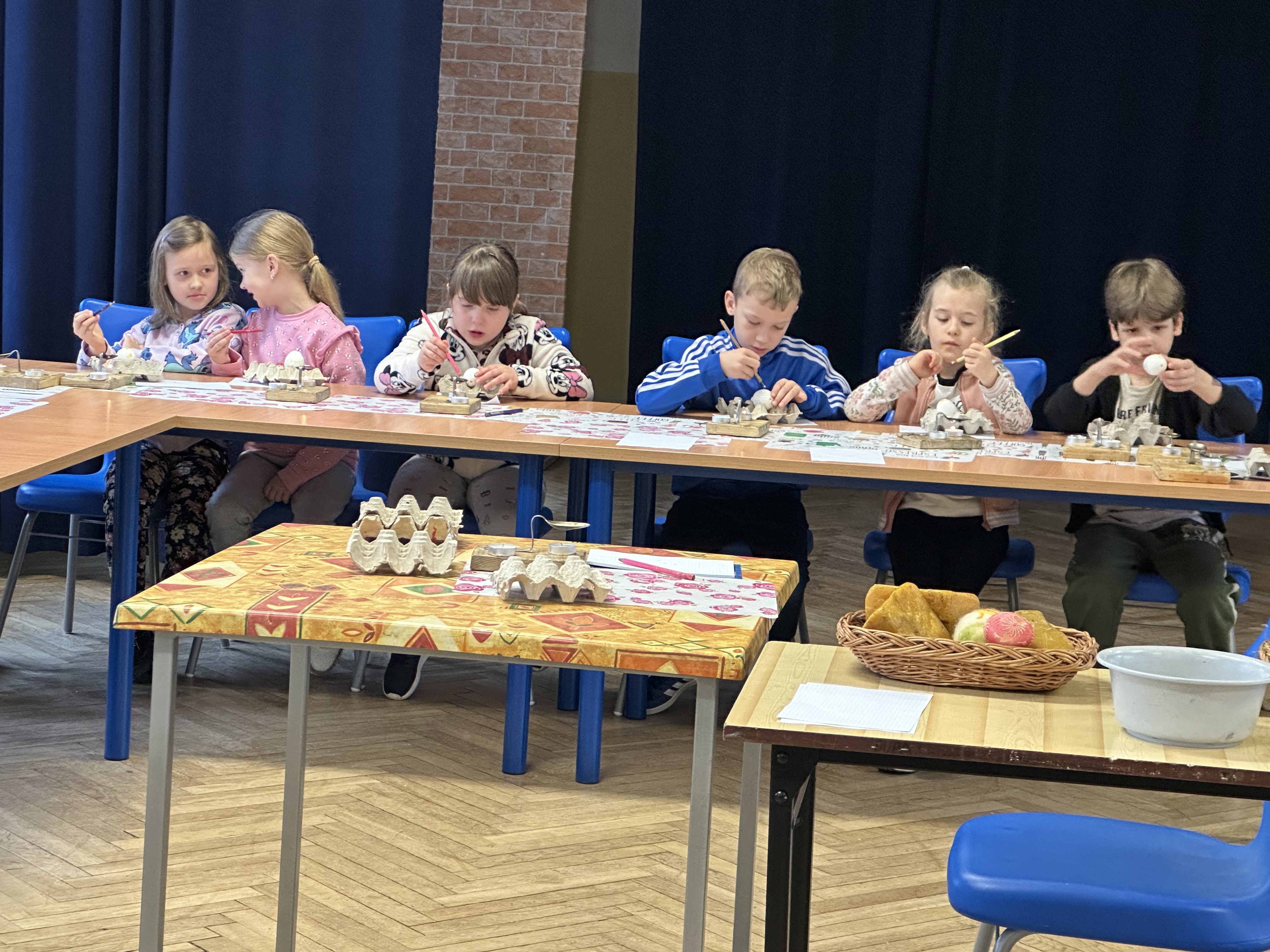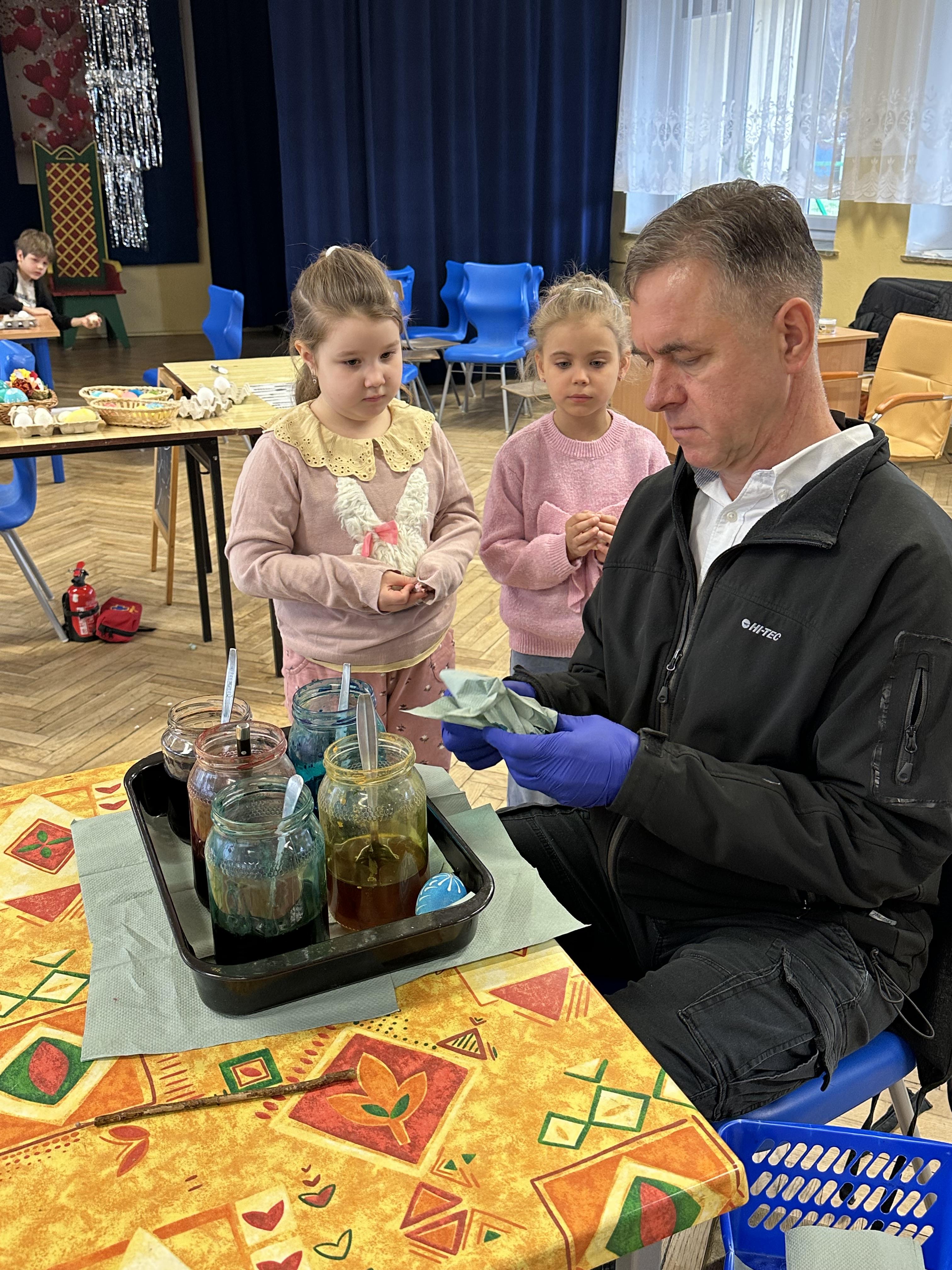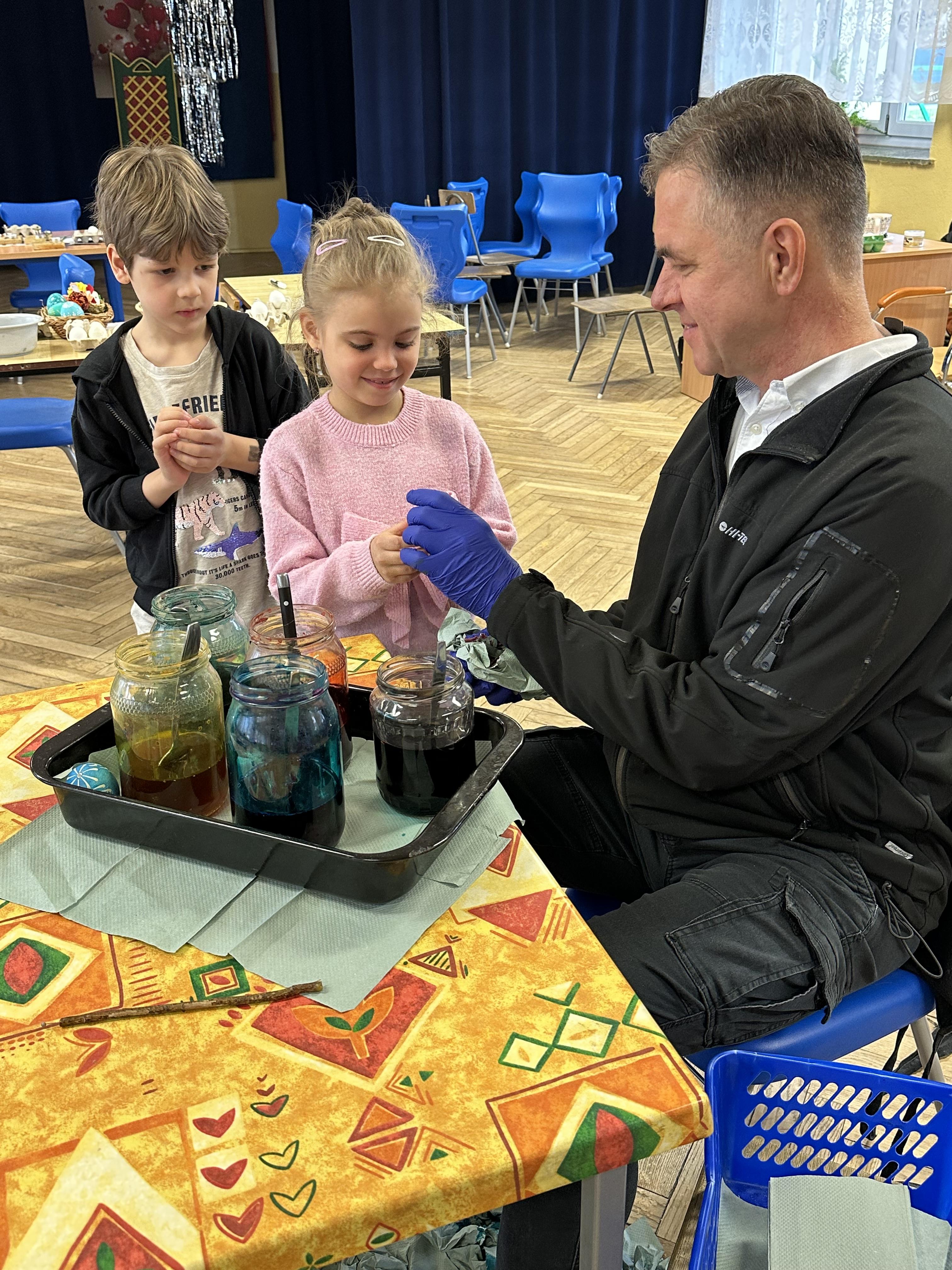 31 marca 2026 roku grupa „Pszczółek” uczestniczyła w warsztatach wielkanocnych zorganizowanych w Szkole Podstawowej nr 6 im. Władysława Broniewskiego w Trzebini pod hasłem „Przygoda z woskiem pszczelim i pisankami”. Celem spotkania było zapoznanie dzieci z techniką szpilkową wykorzystywaną do ozdabiania wydmuszek oraz przybliżenie tradycji wielkanocnych związanych z naszym regionem. Na początku warsztatów osoby prowadzące -pani Ania oraz pan Tytus -przywitały się ze starszakami i nawiązały w rozmowie do zwyczajów wielkanocnych. Następnie dzieci dowiedziały się, na czym polega technika szpilkowa i jak można ją wykorzystać do tworzenia pisanek. Prowadzący zaprezentowali kolejne etapy ozdabiania wydmuszek, zwracając szczególną uwagę na bezpieczeństwo podczas wykonywania prac. Dzieci z dużym zainteresowaniem obserwowały pokaz i chętnie słuchały wskazówek. Po części pokazowej uczestnicy przystąpili do samodzielnej pracy. Każde dziecko wykonało własną, wyjątkową pisankę techniką szpilkową. Warsztaty były dla dzieci nie tylko okazją do rozwijania zdolności manualnych i kreatywności, ale także do poznania wielkanocnych tradycji. Wykonane pisanki dzieci mogły zaprezentować kolegom i koleżankom w przedszkolu, a następnie zabrać do domu. Spotkanie przebiegło w miłej i radosnej atmosferze.