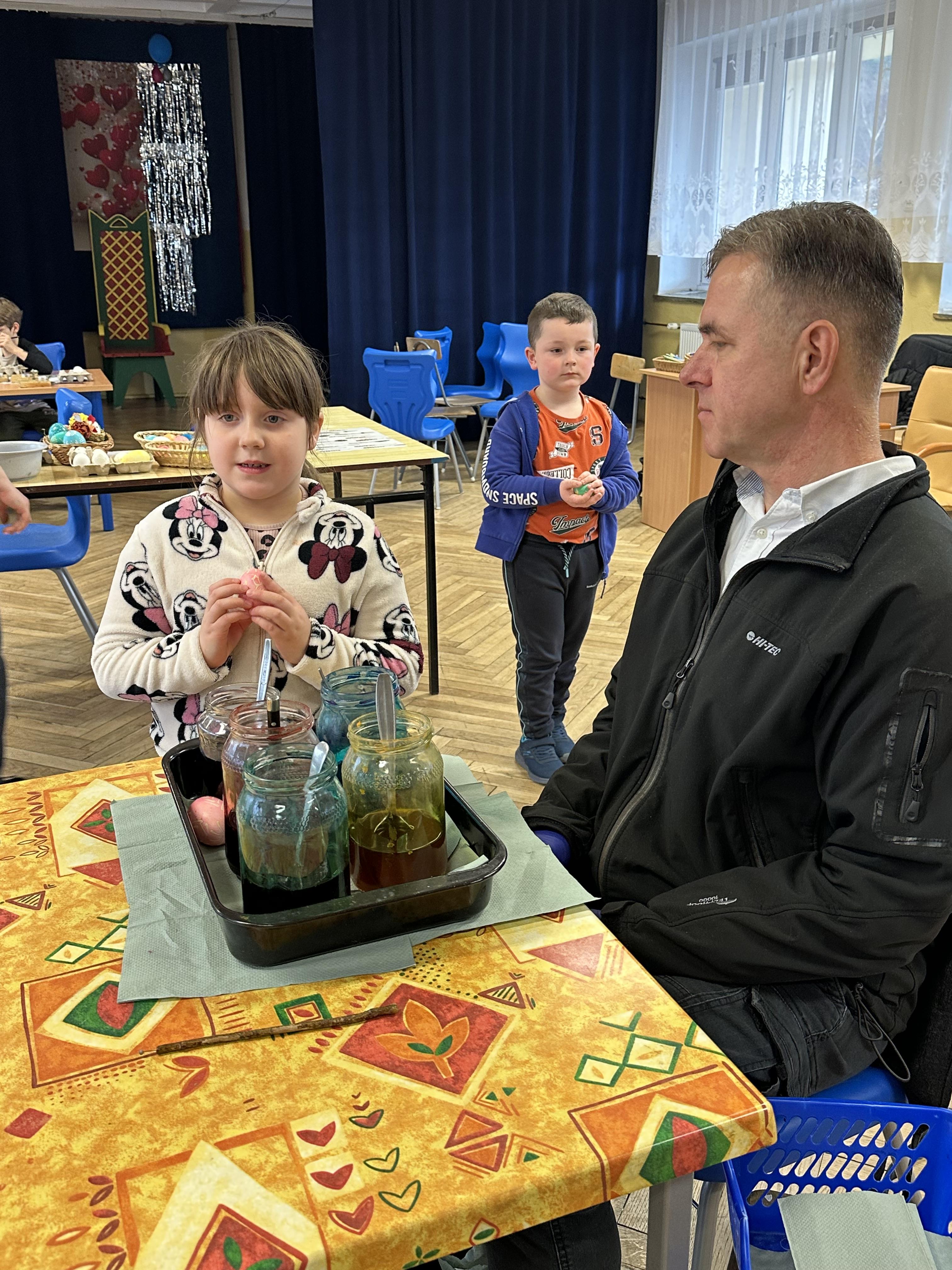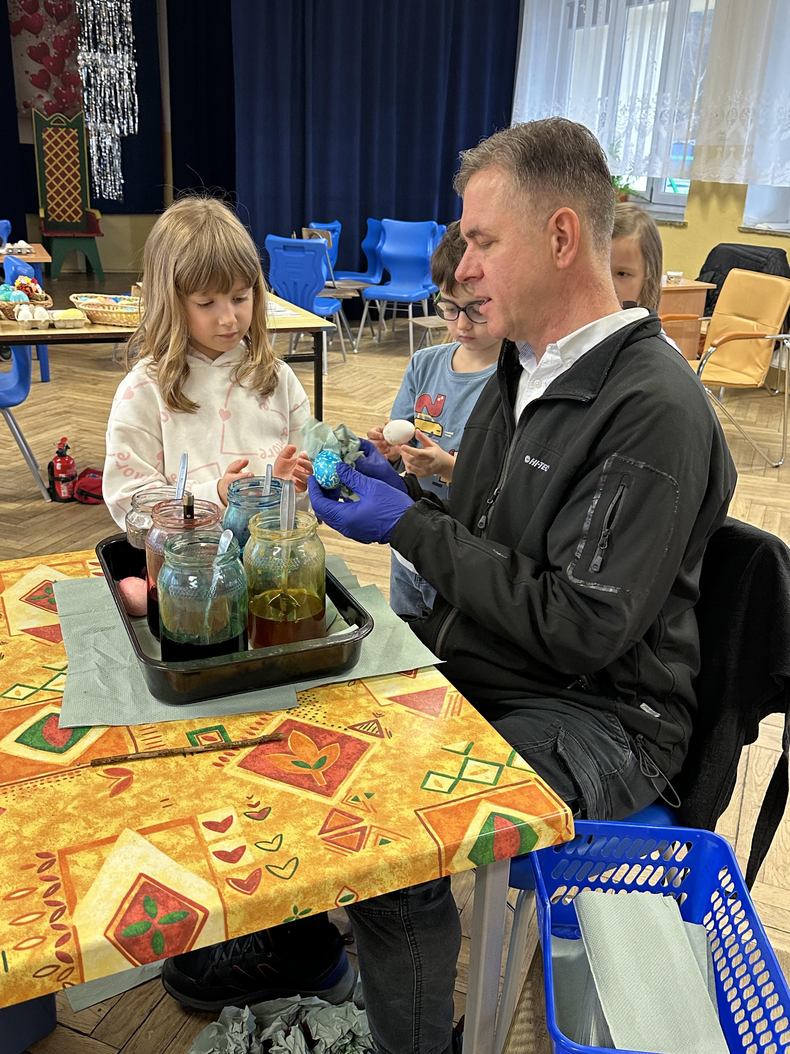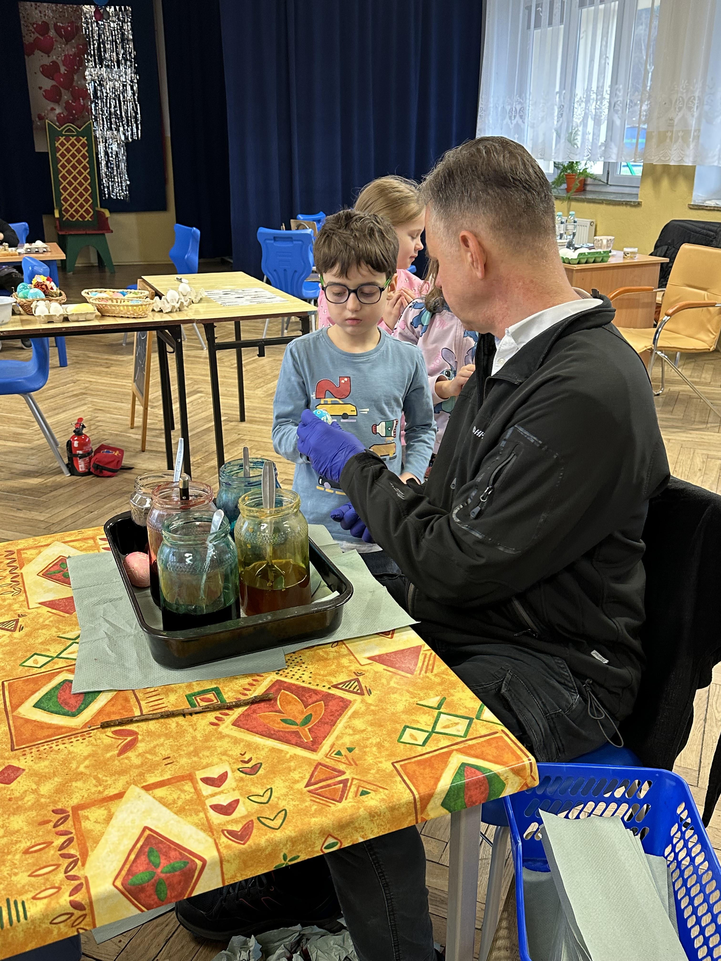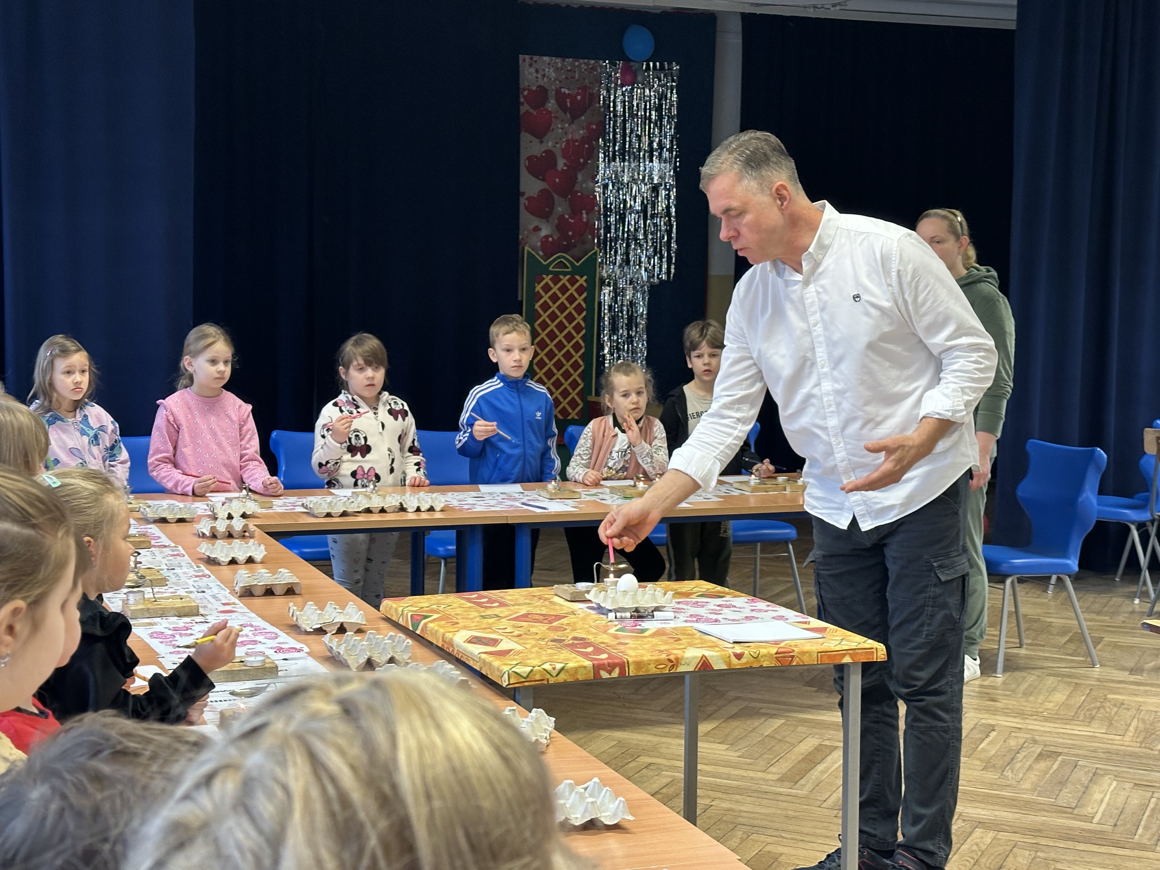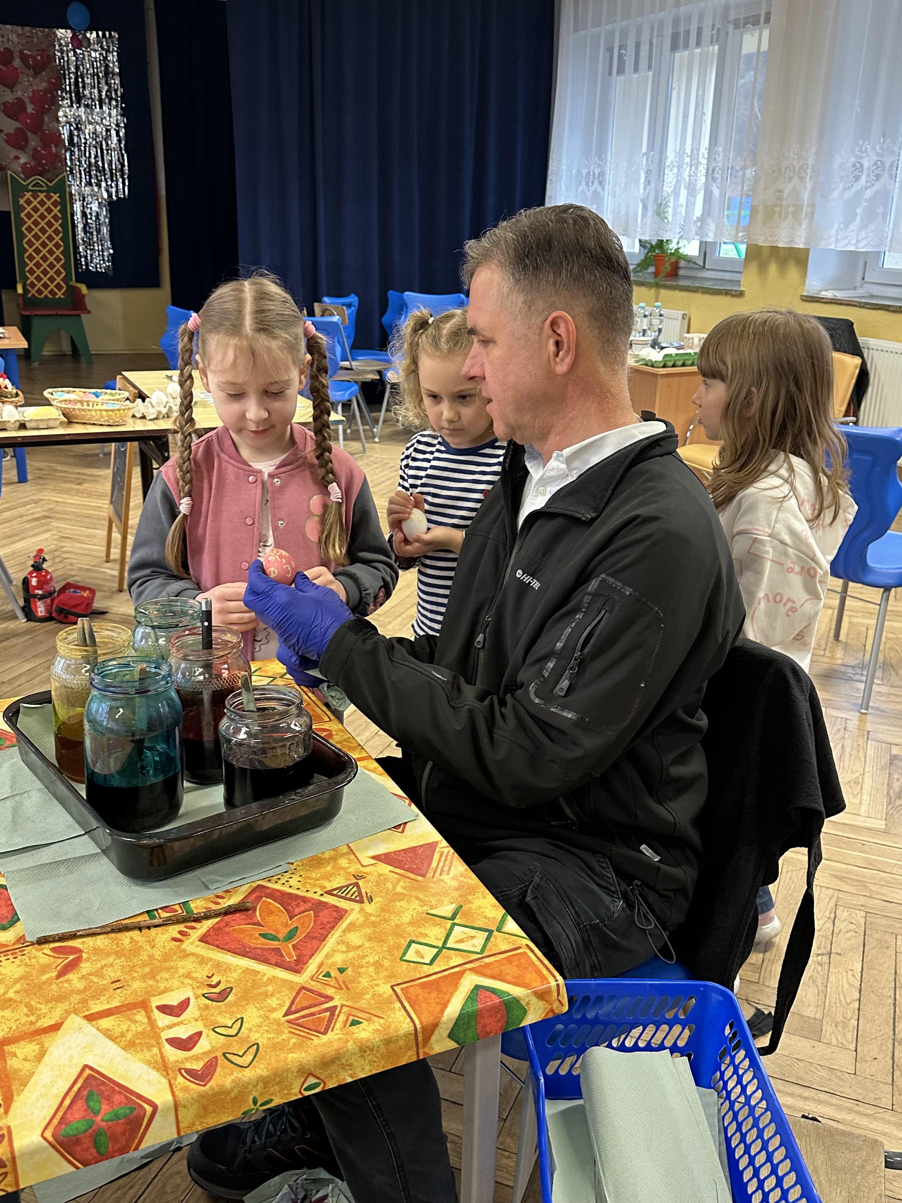 31 marca 2026 roku grupa „Pszczółek” uczestniczyła w warsztatach wielkanocnych zorganizowanych w Szkole Podstawowej nr 6 im. Władysława Broniewskiego w Trzebini pod hasłem „Przygoda z woskiem pszczelim i pisankami”. Celem spotkania było zapoznanie dzieci z techniką szpilkową wykorzystywaną do ozdabiania wydmuszek oraz przybliżenie tradycji wielkanocnych związanych z naszym regionem. Na początku warsztatów osoby prowadzące -pani Ania oraz pan Tytus -przywitały się ze starszakami i nawiązały w rozmowie do zwyczajów wielkanocnych. Następnie dzieci dowiedziały się, na czym polega technika szpilkowa i jak można ją wykorzystać do tworzenia pisanek. Prowadzący zaprezentowali kolejne etapy ozdabiania wydmuszek, zwracając szczególną uwagę na bezpieczeństwo podczas wykonywania prac. Dzieci z dużym zainteresowaniem obserwowały pokaz i chętnie słuchały wskazówek. Po części pokazowej uczestnicy przystąpili do samodzielnej pracy. Każde dziecko wykonało własną, wyjątkową pisankę techniką szpilkową. Warsztaty były dla dzieci nie tylko okazją do rozwijania zdolności manualnych i kreatywności, ale także do poznania wielkanocnych tradycji. Wykonane pisanki dzieci mogły zaprezentować kolegom i koleżankom w przedszkolu, a następnie zabrać do domu. Spotkanie przebiegło w miłej i radosnej atmosferze.