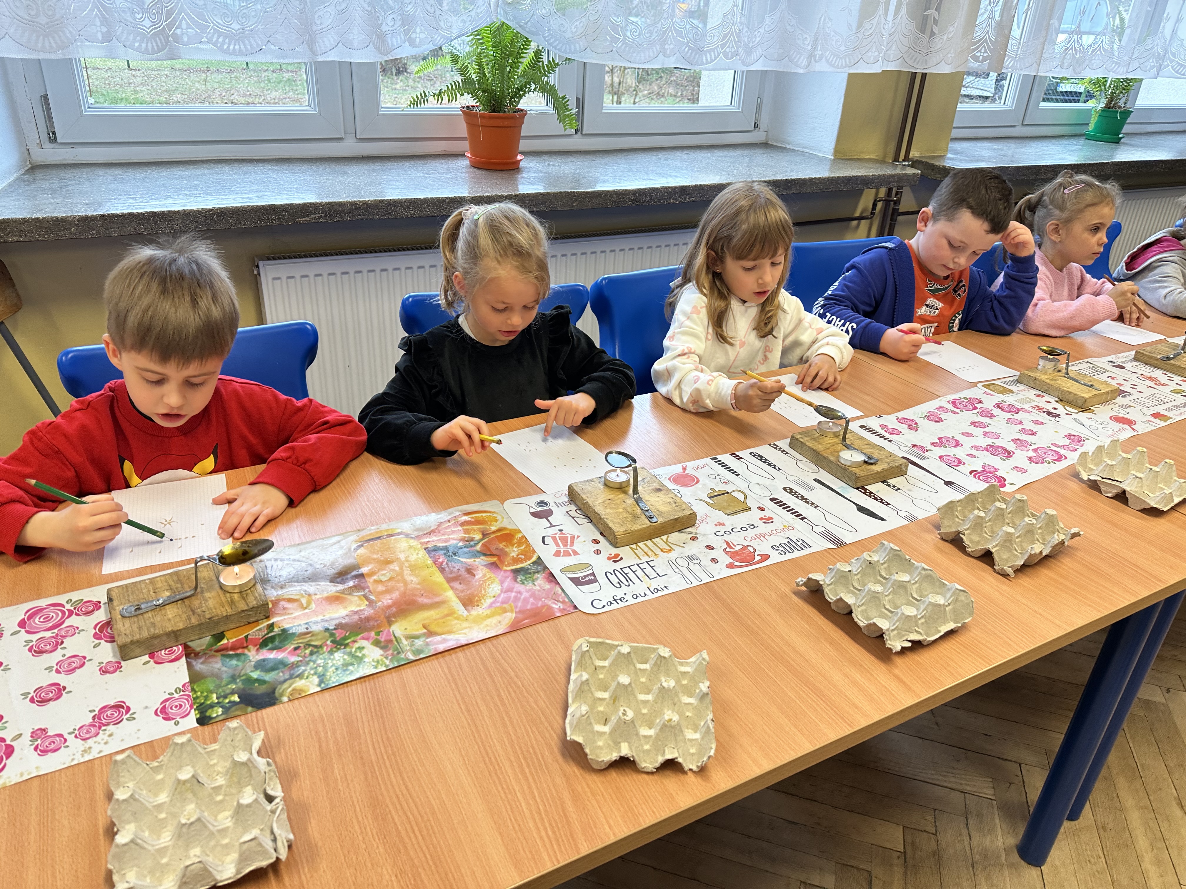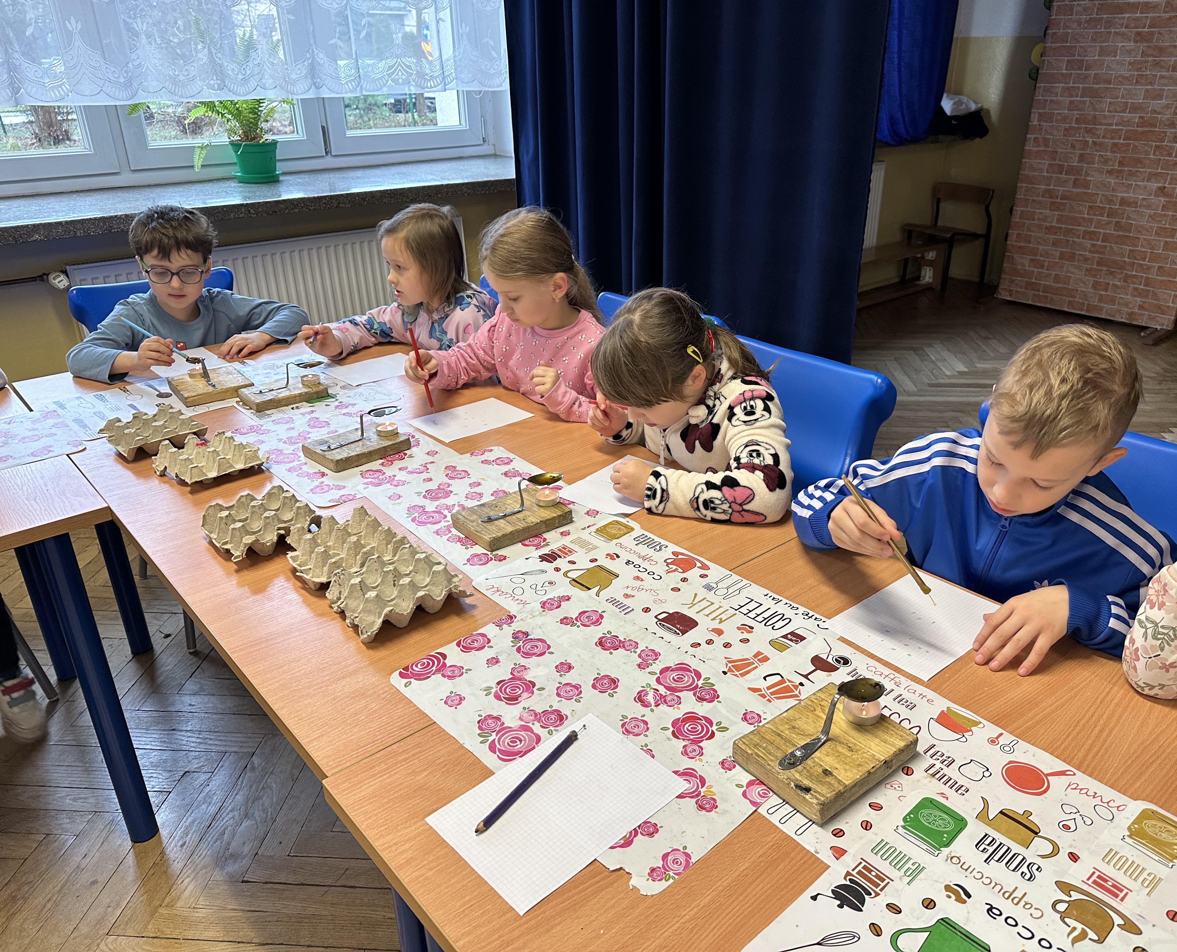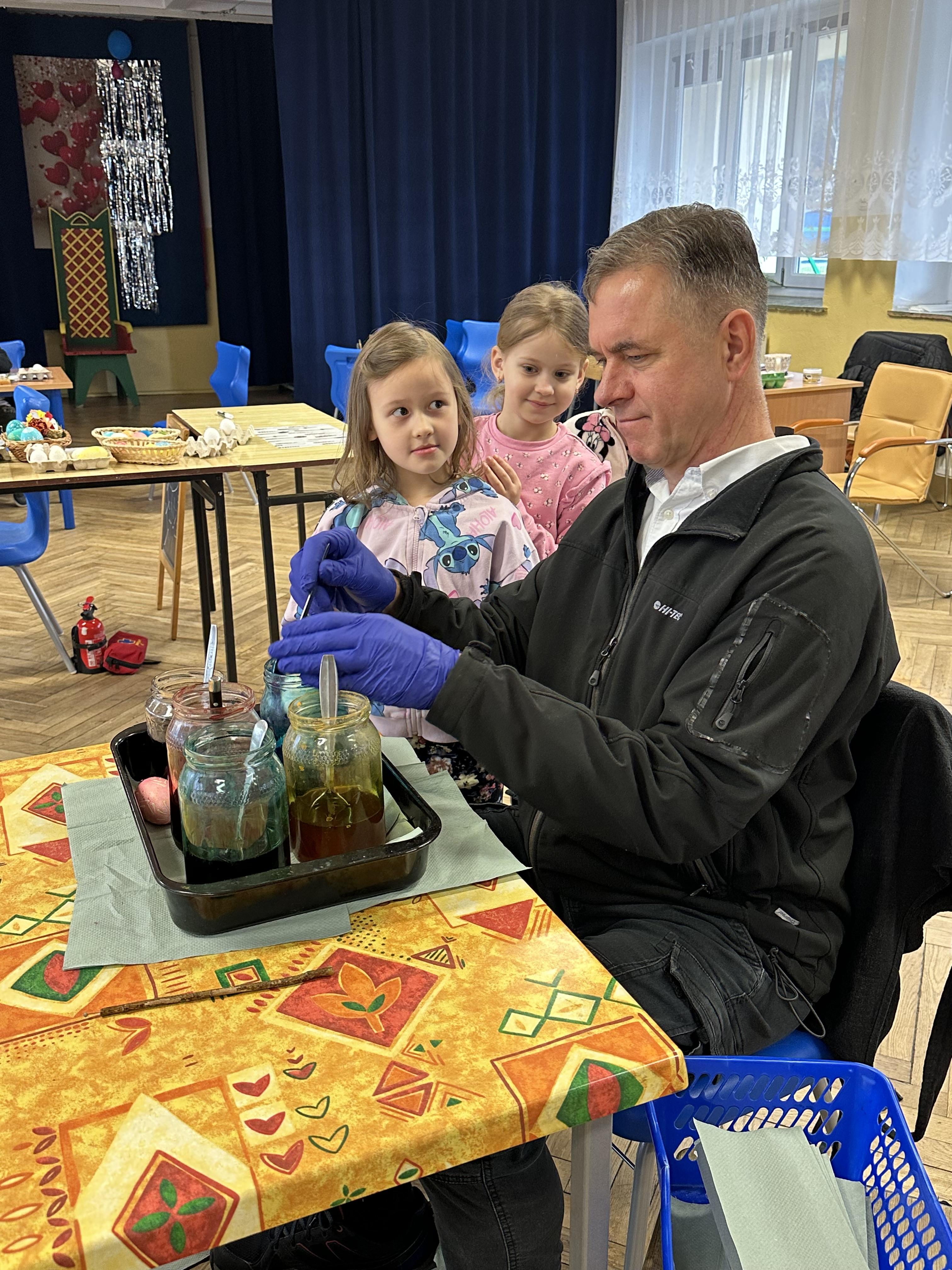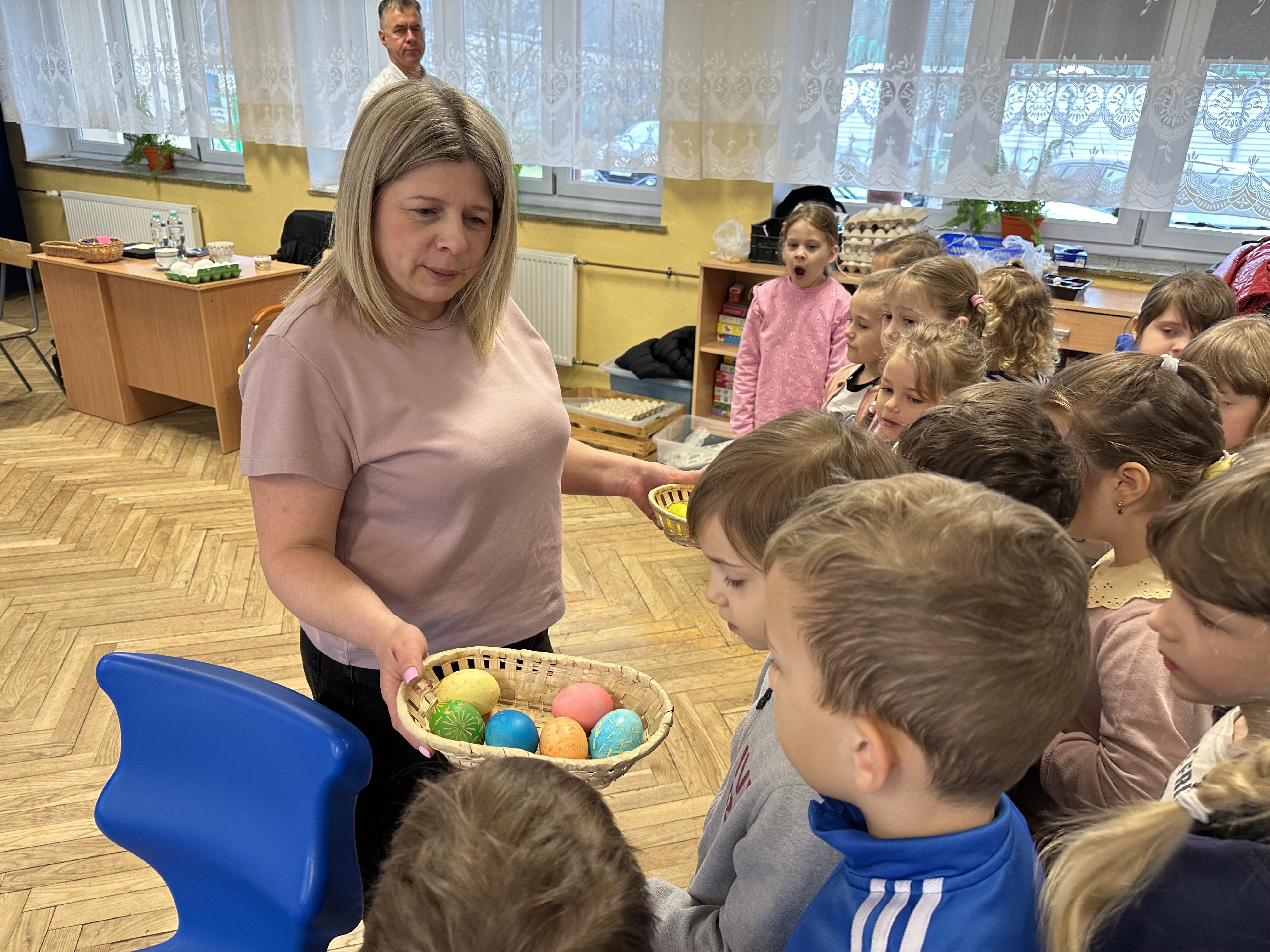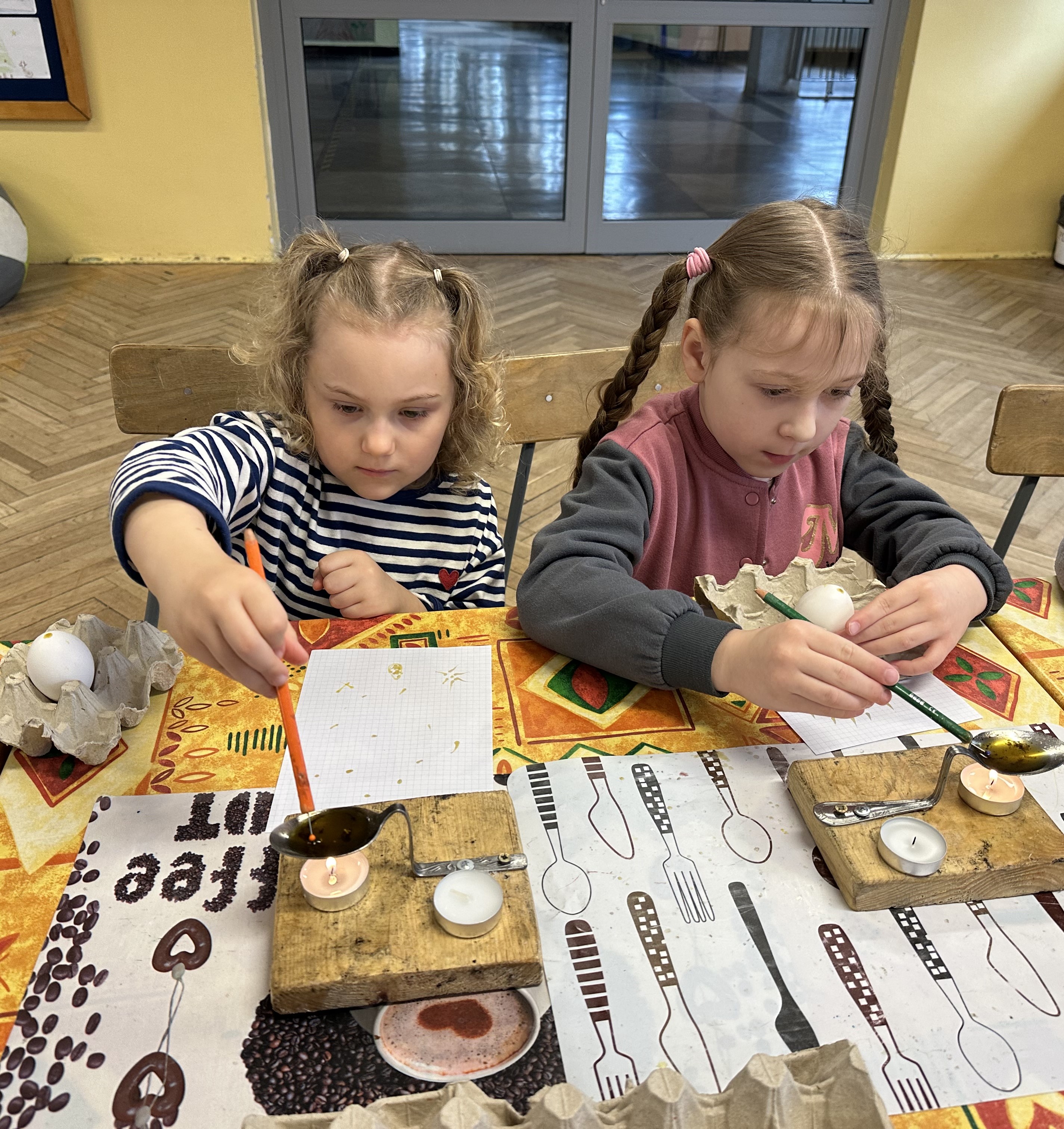 31 marca 2026 roku grupa „Pszczółek” uczestniczyła w warsztatach wielkanocnych zorganizowanych w Szkole Podstawowej nr 6 im. Władysława Broniewskiego w Trzebini pod hasłem „Przygoda z woskiem pszczelim i pisankami”. Celem spotkania było zapoznanie dzieci z techniką szpilkową wykorzystywaną do ozdabiania wydmuszek oraz przybliżenie tradycji wielkanocnych związanych z naszym regionem. Na początku warsztatów osoby prowadzące -pani Ania oraz pan Tytus -przywitały się ze starszakami i nawiązały w rozmowie do zwyczajów wielkanocnych. Następnie dzieci dowiedziały się, na czym polega technika szpilkowa i jak można ją wykorzystać do tworzenia pisanek. Prowadzący zaprezentowali kolejne etapy ozdabiania wydmuszek, zwracając szczególną uwagę na bezpieczeństwo podczas wykonywania prac. Dzieci z dużym zainteresowaniem obserwowały pokaz i chętnie słuchały wskazówek. Po części pokazowej uczestnicy przystąpili do samodzielnej pracy. Każde dziecko wykonało własną, wyjątkową pisankę techniką szpilkową. Warsztaty były dla dzieci nie tylko okazją do rozwijania zdolności manualnych i kreatywności, ale także do poznania wielkanocnych tradycji. Wykonane pisanki dzieci mogły zaprezentować kolegom i koleżankom w przedszkolu, a następnie zabrać do domu. Spotkanie przebiegło w miłej i radosnej atmosferze.