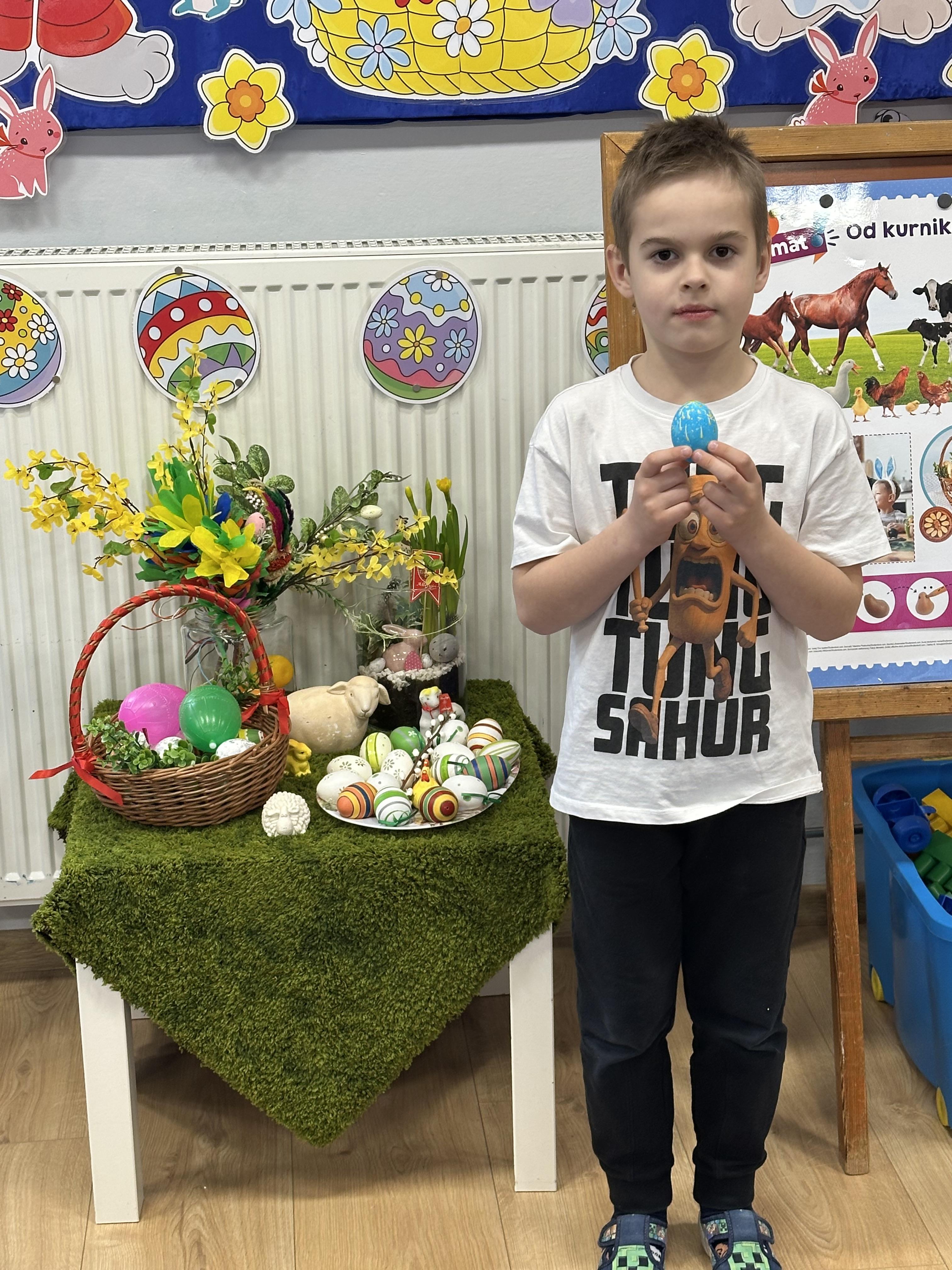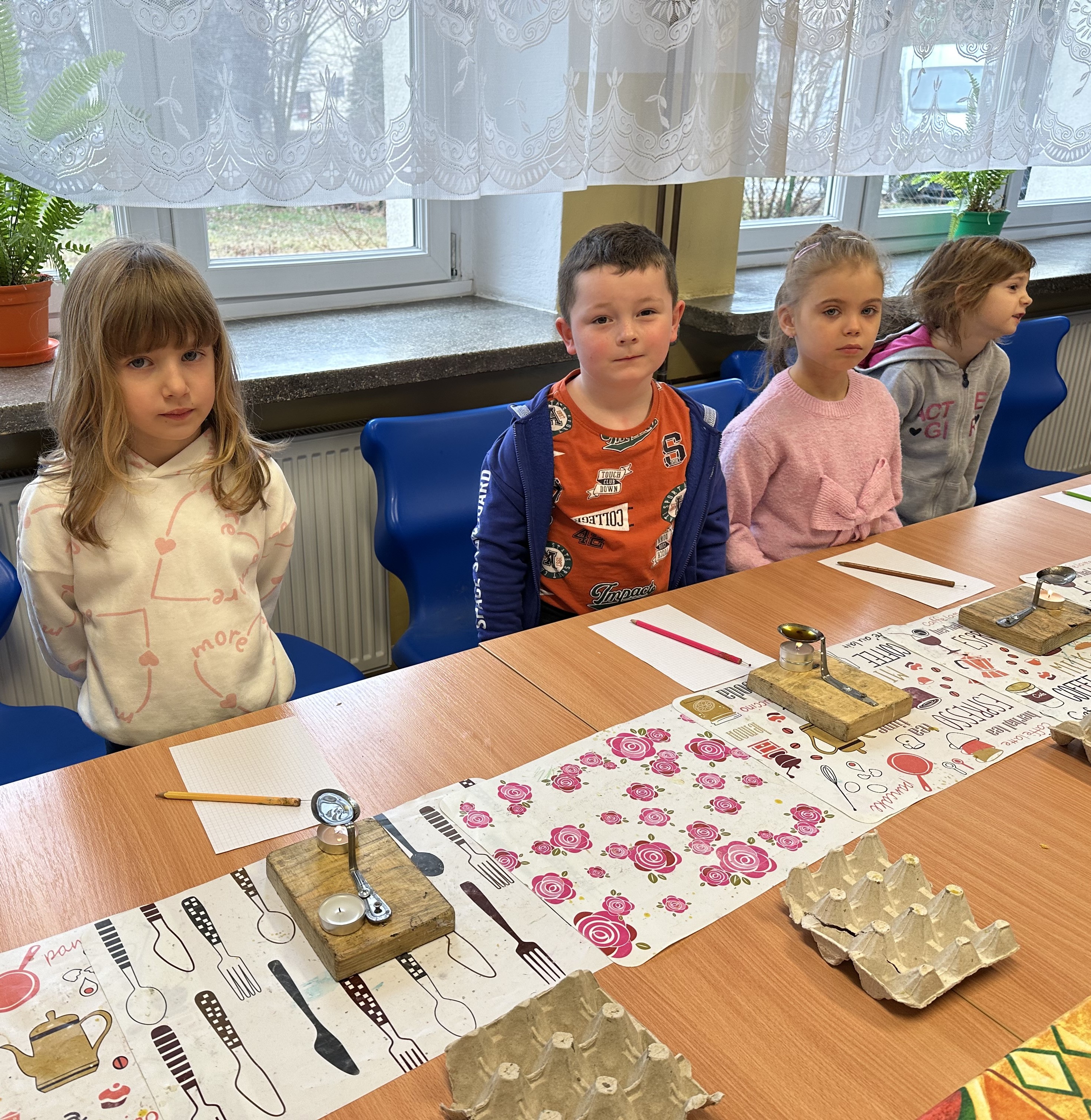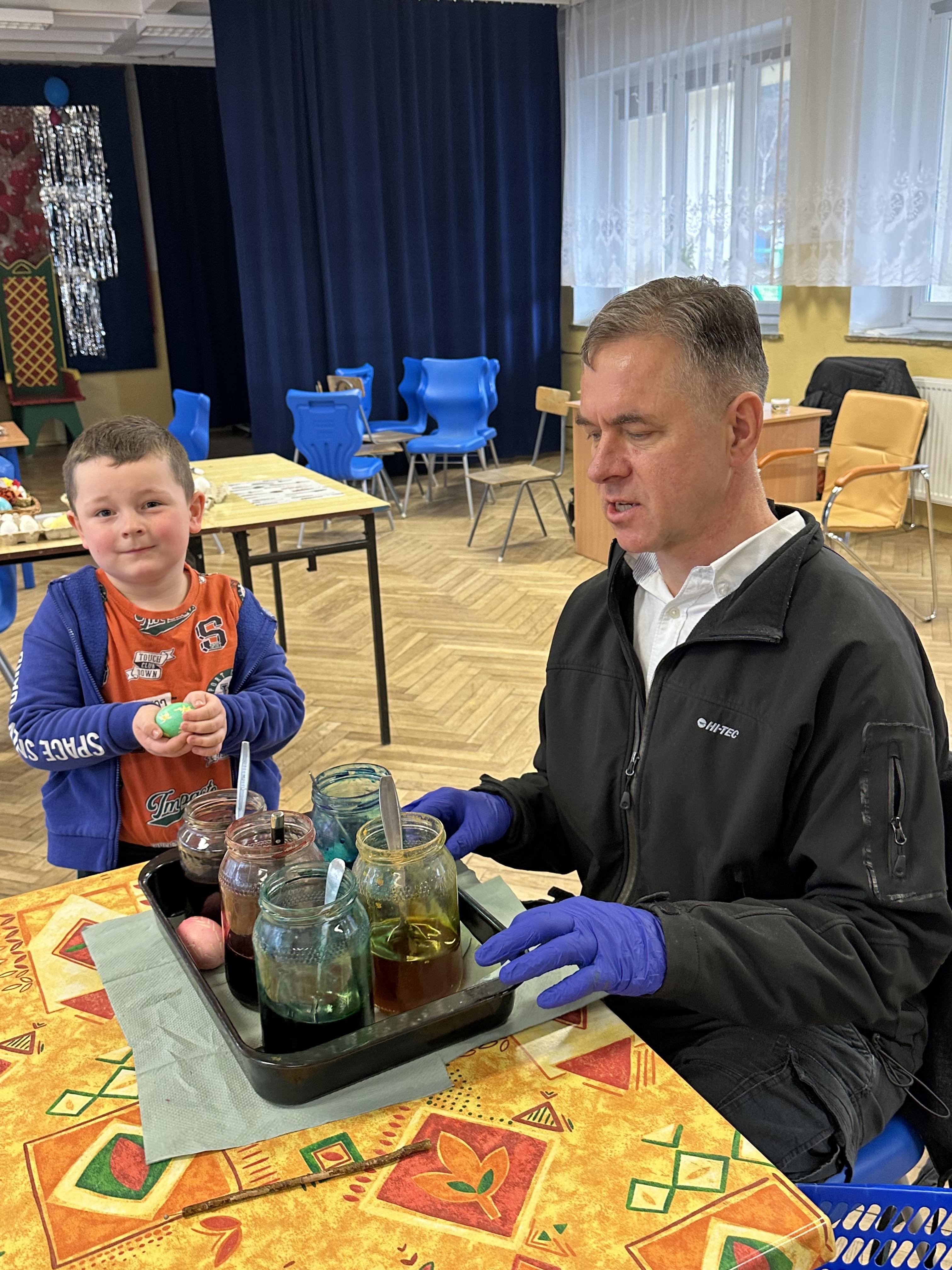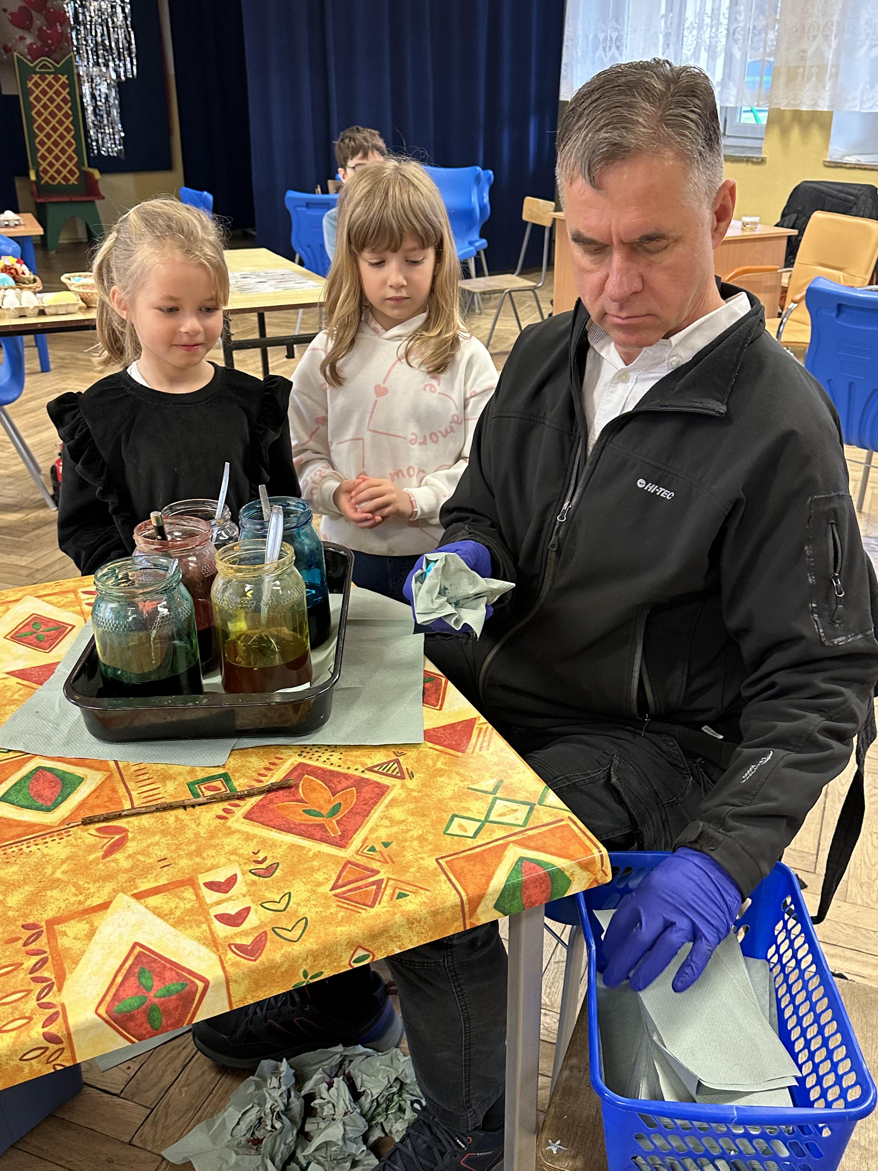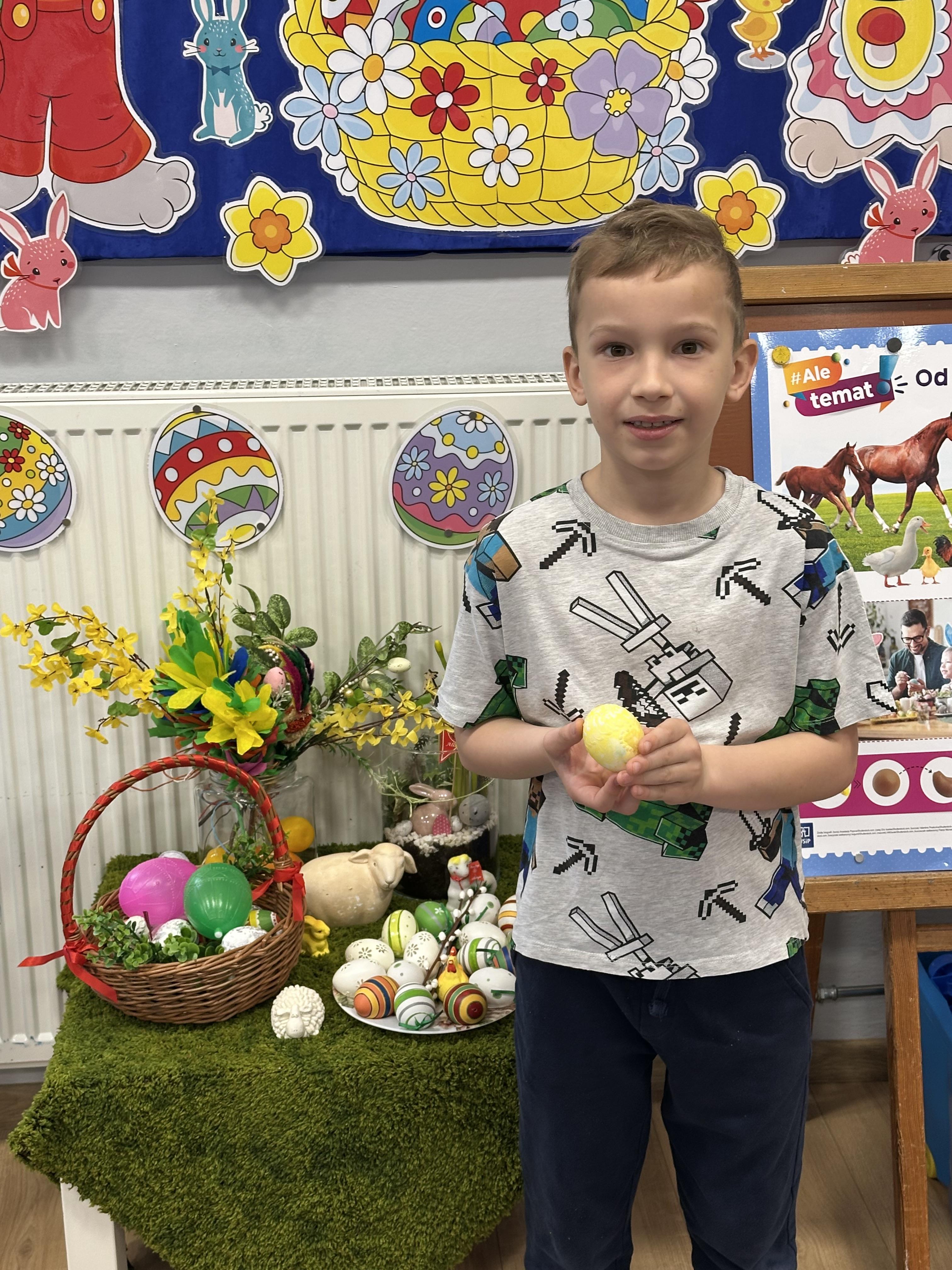 31 marca 2026 roku grupa „Pszczółek” uczestniczyła w warsztatach wielkanocnych zorganizowanych w Szkole Podstawowej nr 6 im. Władysława Broniewskiego w Trzebini pod hasłem „Przygoda z woskiem pszczelim i pisankami”. Celem spotkania było zapoznanie dzieci z techniką szpilkową wykorzystywaną do ozdabiania wydmuszek oraz przybliżenie tradycji wielkanocnych związanych z naszym regionem. Na początku warsztatów osoby prowadzące -pani Ania oraz pan Tytus -przywitały się ze starszakami i nawiązały w rozmowie do zwyczajów wielkanocnych. Następnie dzieci dowiedziały się, na czym polega technika szpilkowa i jak można ją wykorzystać do tworzenia pisanek. Prowadzący zaprezentowali kolejne etapy ozdabiania wydmuszek, zwracając szczególną uwagę na bezpieczeństwo podczas wykonywania prac. Dzieci z dużym zainteresowaniem obserwowały pokaz i chętnie słuchały wskazówek. Po części pokazowej uczestnicy przystąpili do samodzielnej pracy. Każde dziecko wykonało własną, wyjątkową pisankę techniką szpilkową. Warsztaty były dla dzieci nie tylko okazją do rozwijania zdolności manualnych i kreatywności, ale także do poznania wielkanocnych tradycji. Wykonane pisanki dzieci mogły zaprezentować kolegom i koleżankom w przedszkolu, a następnie zabrać do domu. Spotkanie przebiegło w miłej i radosnej atmosferze.
