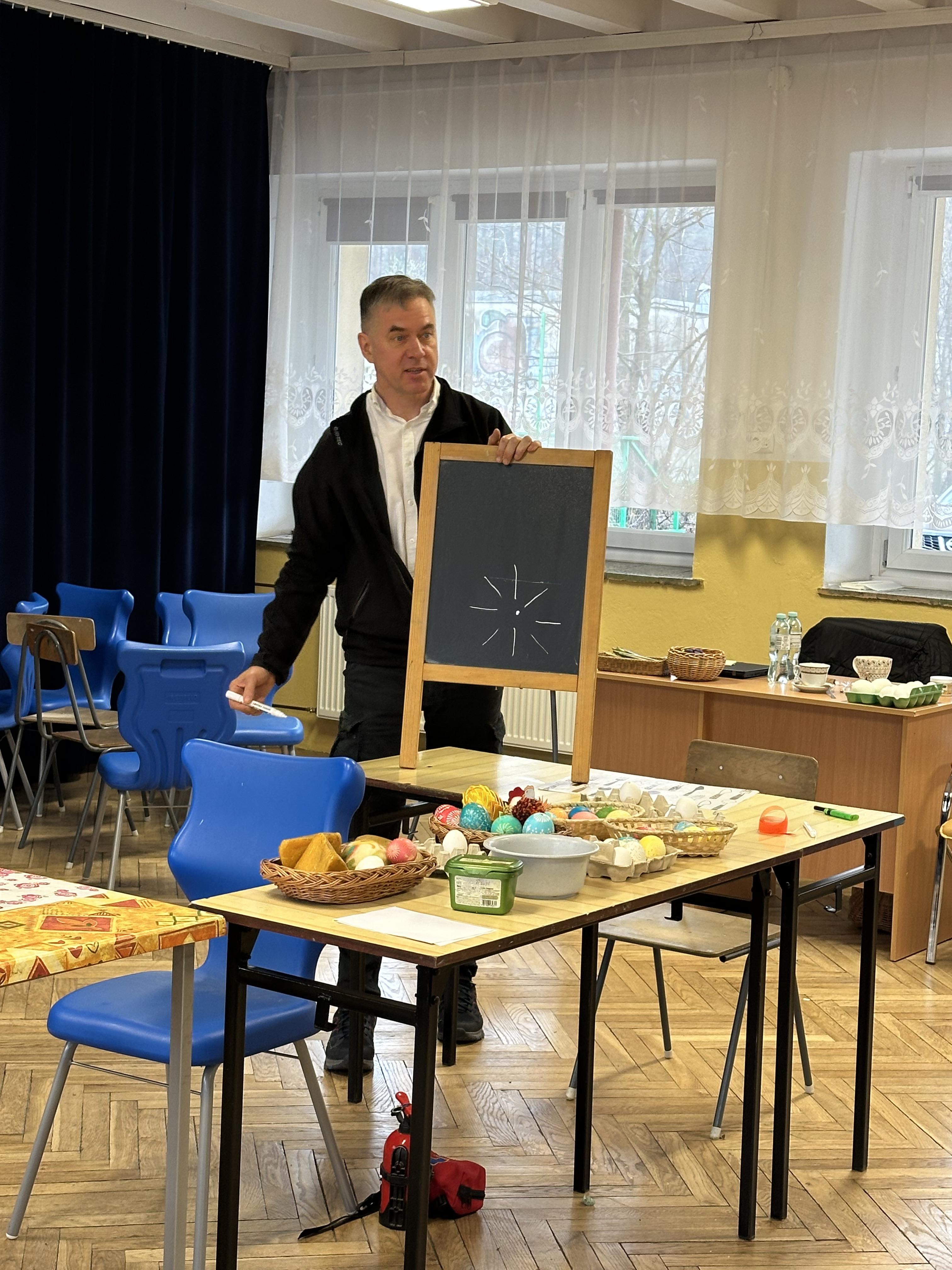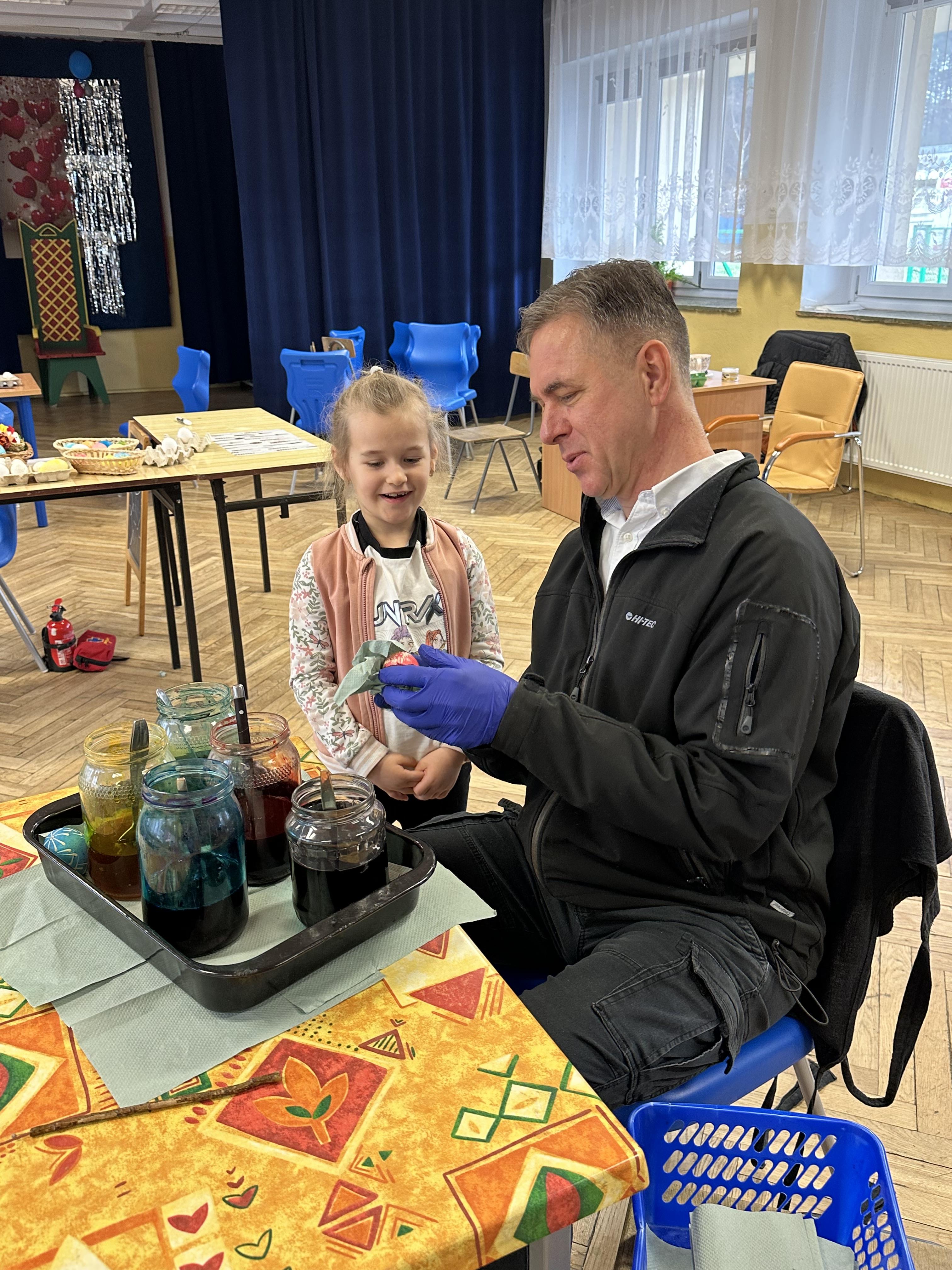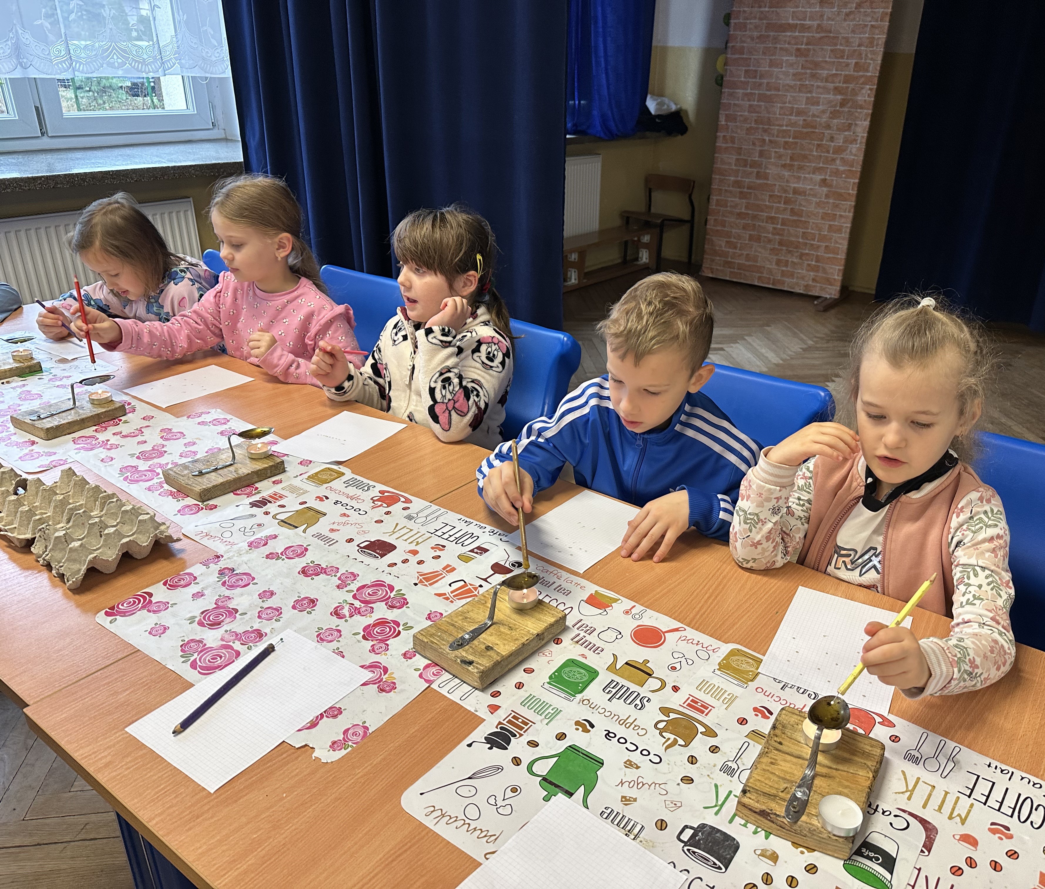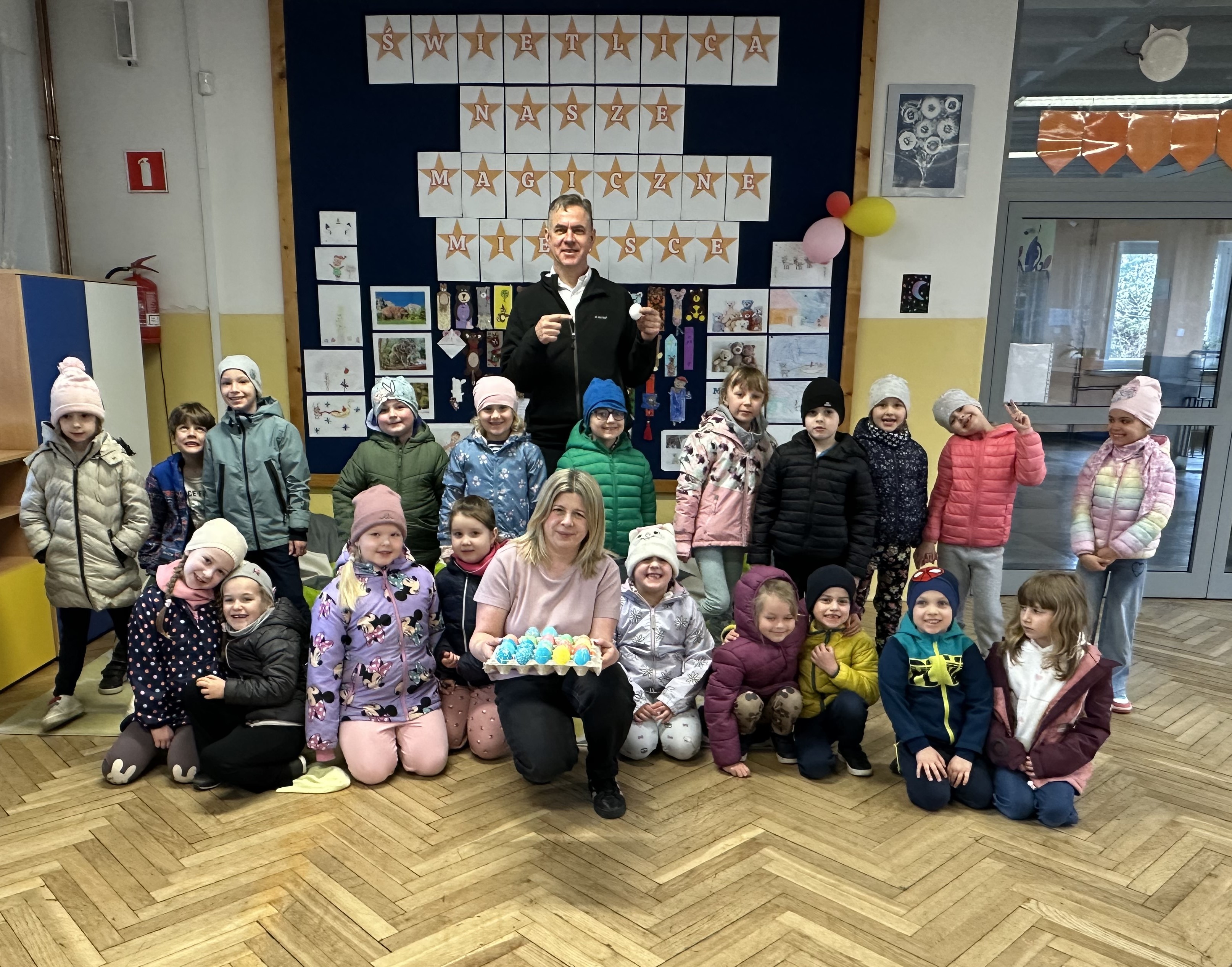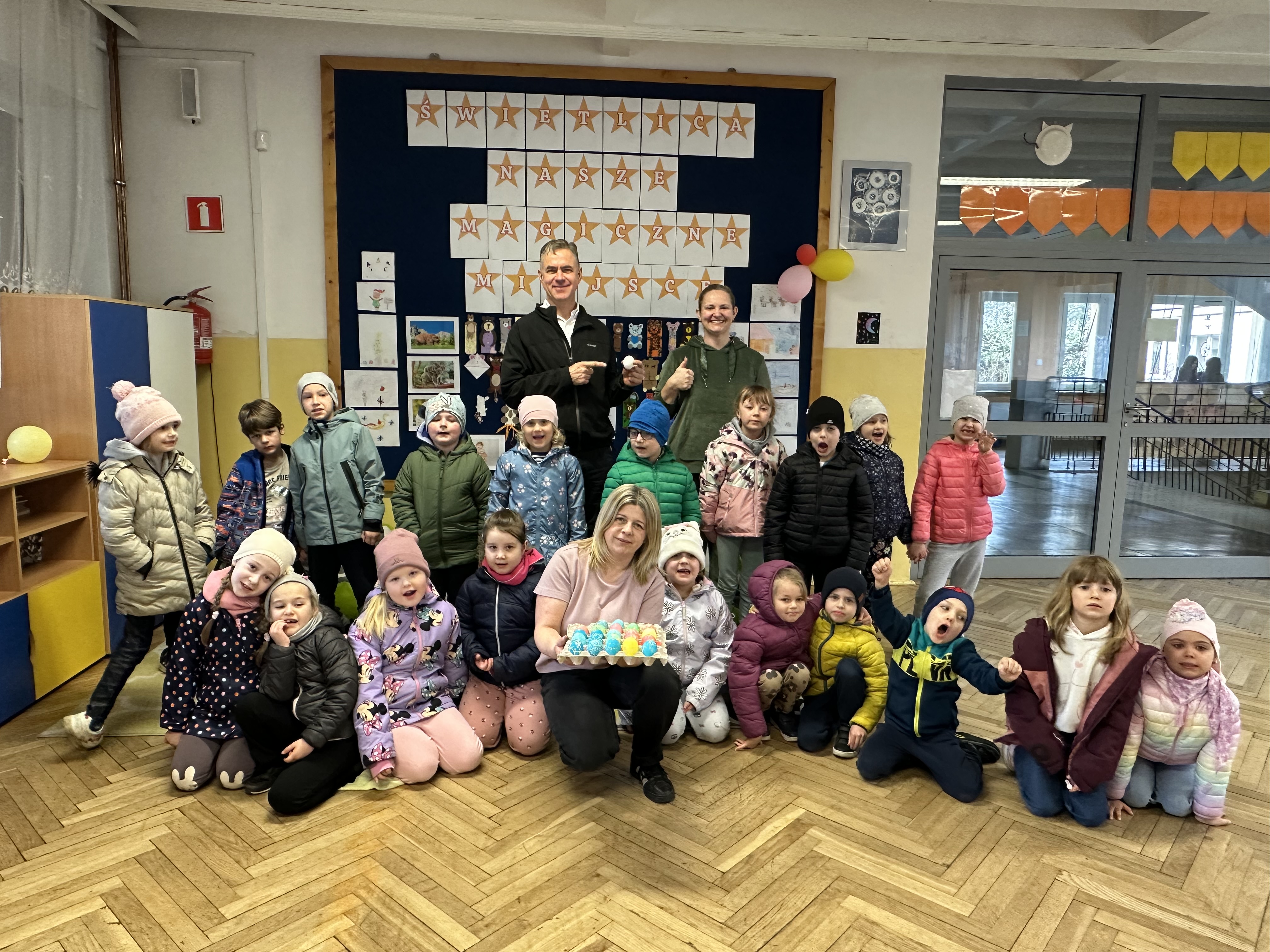 31 marca 2026 roku grupa „Pszczółek” uczestniczyła w warsztatach wielkanocnych zorganizowanych w Szkole Podstawowej nr 6 im. Władysława Broniewskiego w Trzebini pod hasłem „Przygoda z woskiem pszczelim i pisankami”. Celem spotkania było zapoznanie dzieci z techniką szpilkową wykorzystywaną do ozdabiania wydmuszek oraz przybliżenie tradycji wielkanocnych związanych z naszym regionem. Na początku warsztatów osoby prowadzące -pani Ania oraz pan Tytus -przywitały się ze starszakami i nawiązały w rozmowie do zwyczajów wielkanocnych. Następnie dzieci dowiedziały się, na czym polega technika szpilkowa i jak można ją wykorzystać do tworzenia pisanek. Prowadzący zaprezentowali kolejne etapy ozdabiania wydmuszek, zwracając szczególną uwagę na bezpieczeństwo podczas wykonywania prac. Dzieci z dużym zainteresowaniem obserwowały pokaz i chętnie słuchały wskazówek. Po części pokazowej uczestnicy przystąpili do samodzielnej pracy. Każde dziecko wykonało własną, wyjątkową pisankę techniką szpilkową. Warsztaty były dla dzieci nie tylko okazją do rozwijania zdolności manualnych i kreatywności, ale także do poznania wielkanocnych tradycji. Wykonane pisanki dzieci mogły zaprezentować kolegom i koleżankom w przedszkolu, a następnie zabrać do domu. Spotkanie przebiegło w miłej i radosnej atmosferze.