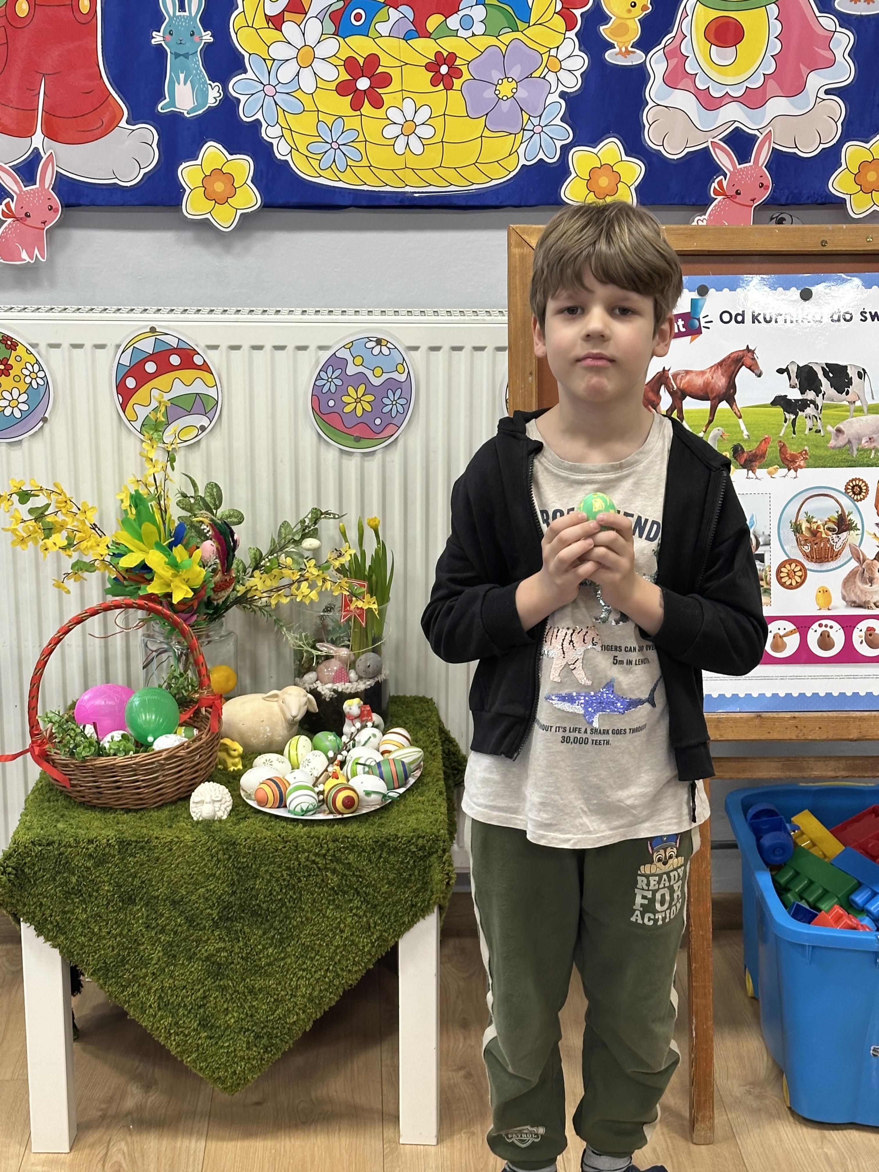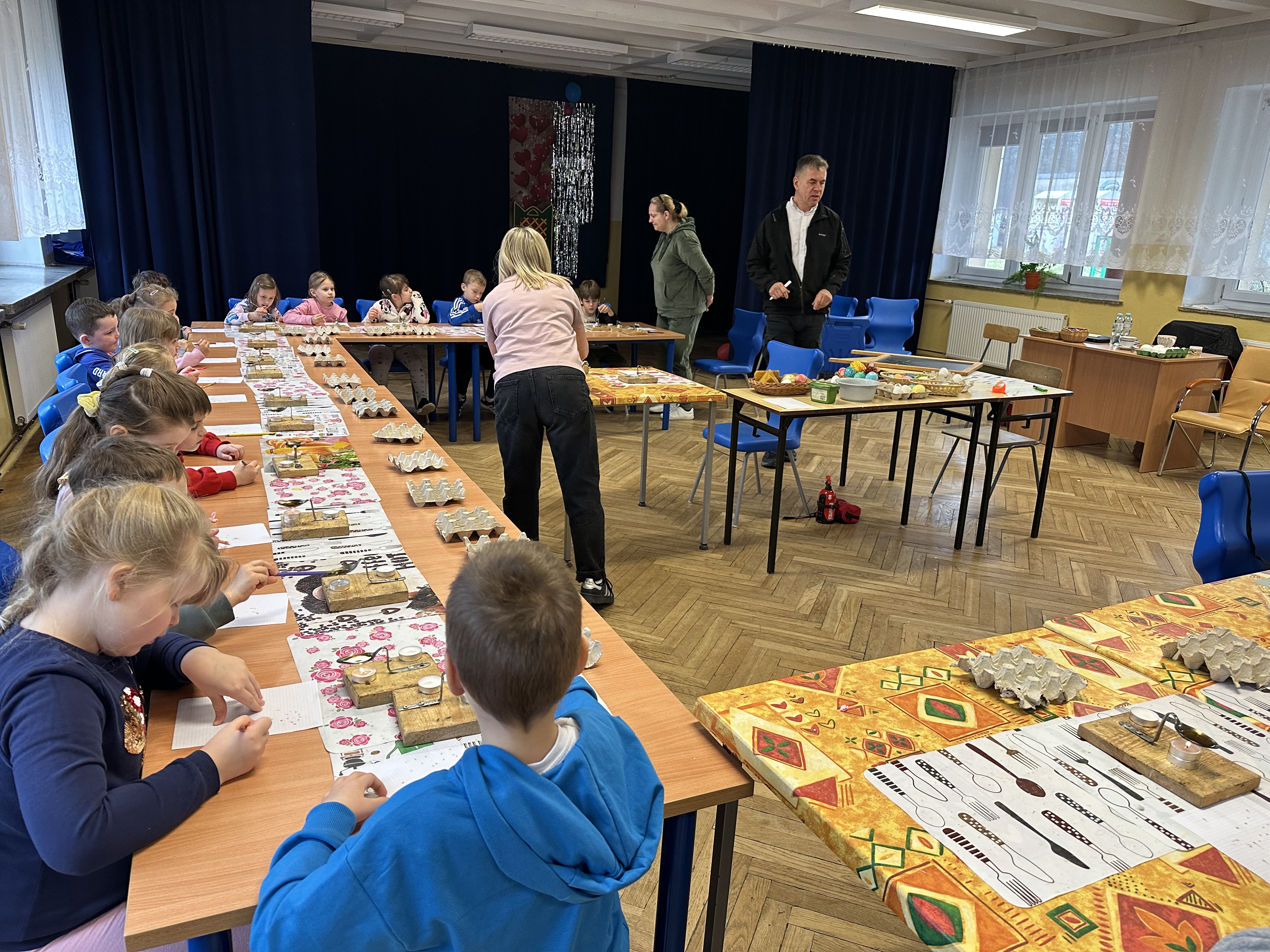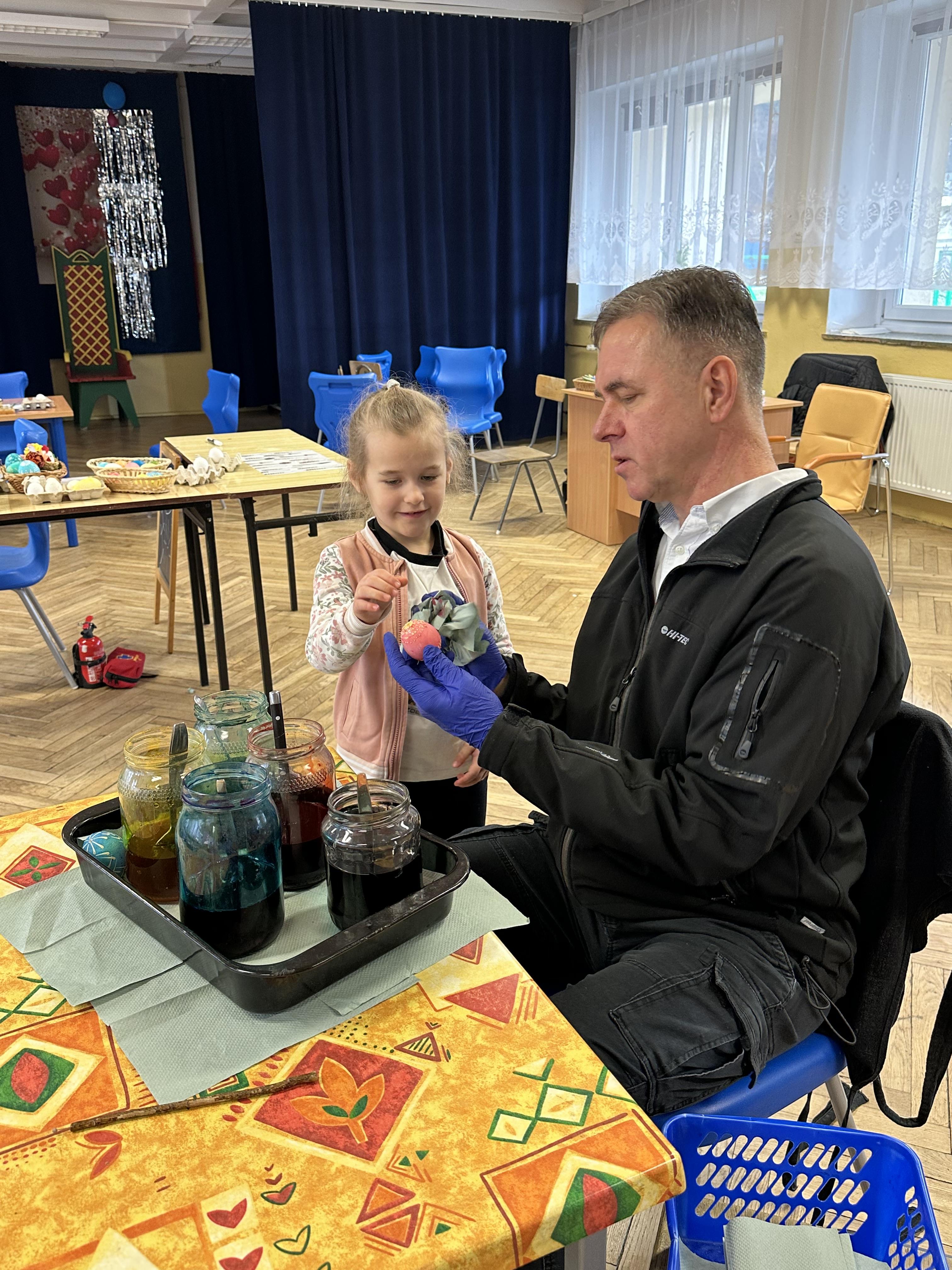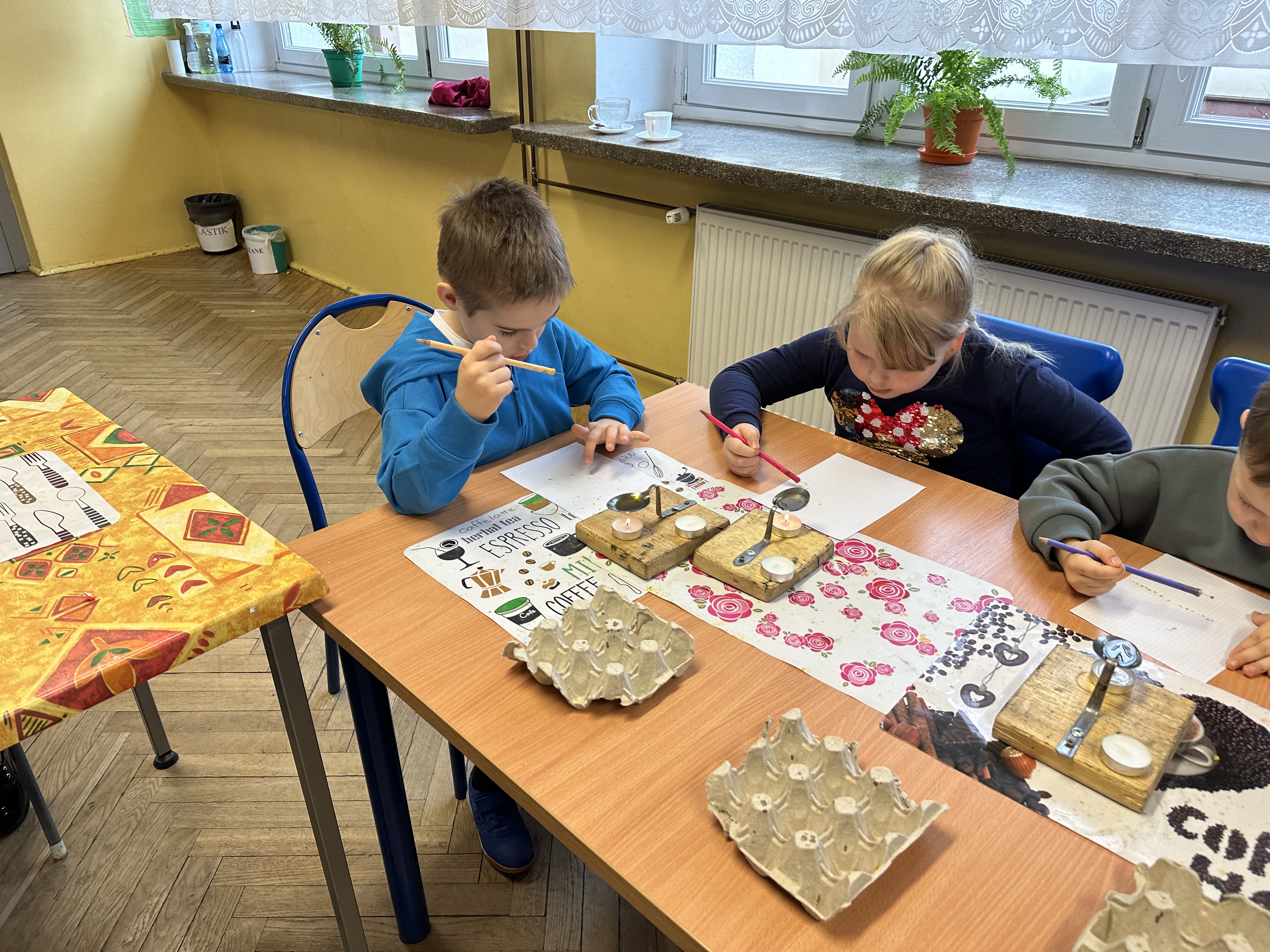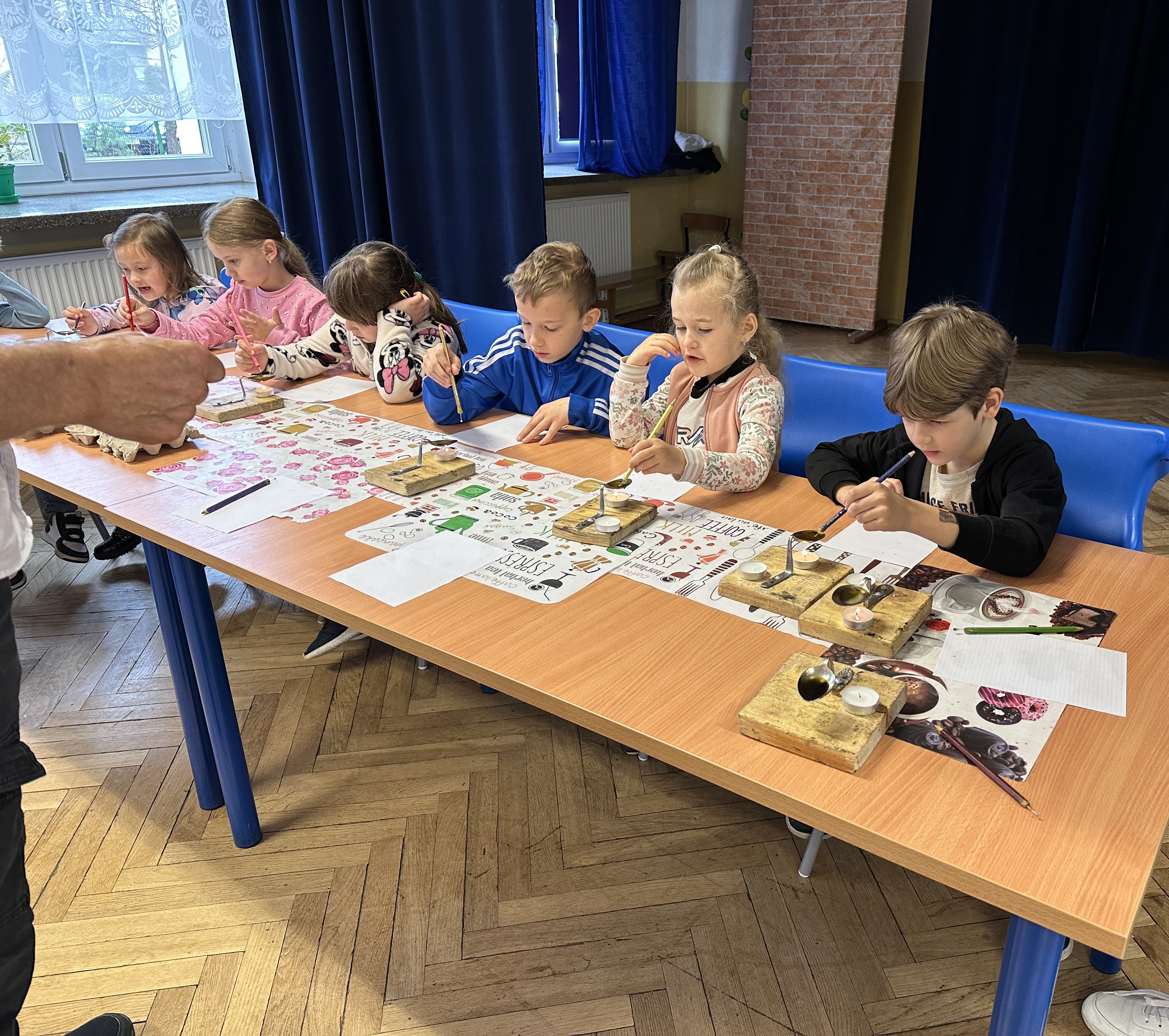 31 marca 2026 roku grupa „Pszczółek” uczestniczyła w warsztatach wielkanocnych zorganizowanych w Szkole Podstawowej nr 6 im. Władysława Broniewskiego w Trzebini pod hasłem „Przygoda z woskiem pszczelim i pisankami”. Celem spotkania było zapoznanie dzieci z techniką szpilkową wykorzystywaną do ozdabiania wydmuszek oraz przybliżenie tradycji wielkanocnych związanych z naszym regionem. Na początku warsztatów osoby prowadzące -pani Ania oraz pan Tytus -przywitały się ze starszakami i nawiązały w rozmowie do zwyczajów wielkanocnych. Następnie dzieci dowiedziały się, na czym polega technika szpilkowa i jak można ją wykorzystać do tworzenia pisanek. Prowadzący zaprezentowali kolejne etapy ozdabiania wydmuszek, zwracając szczególną uwagę na bezpieczeństwo podczas wykonywania prac. Dzieci z dużym zainteresowaniem obserwowały pokaz i chętnie słuchały wskazówek. Po części pokazowej uczestnicy przystąpili do samodzielnej pracy. Każde dziecko wykonało własną, wyjątkową pisankę techniką szpilkową. Warsztaty były dla dzieci nie tylko okazją do rozwijania zdolności manualnych i kreatywności, ale także do poznania wielkanocnych tradycji. Wykonane pisanki dzieci mogły zaprezentować kolegom i koleżankom w przedszkolu, a następnie zabrać do domu. Spotkanie przebiegło w miłej i radosnej atmosferze.