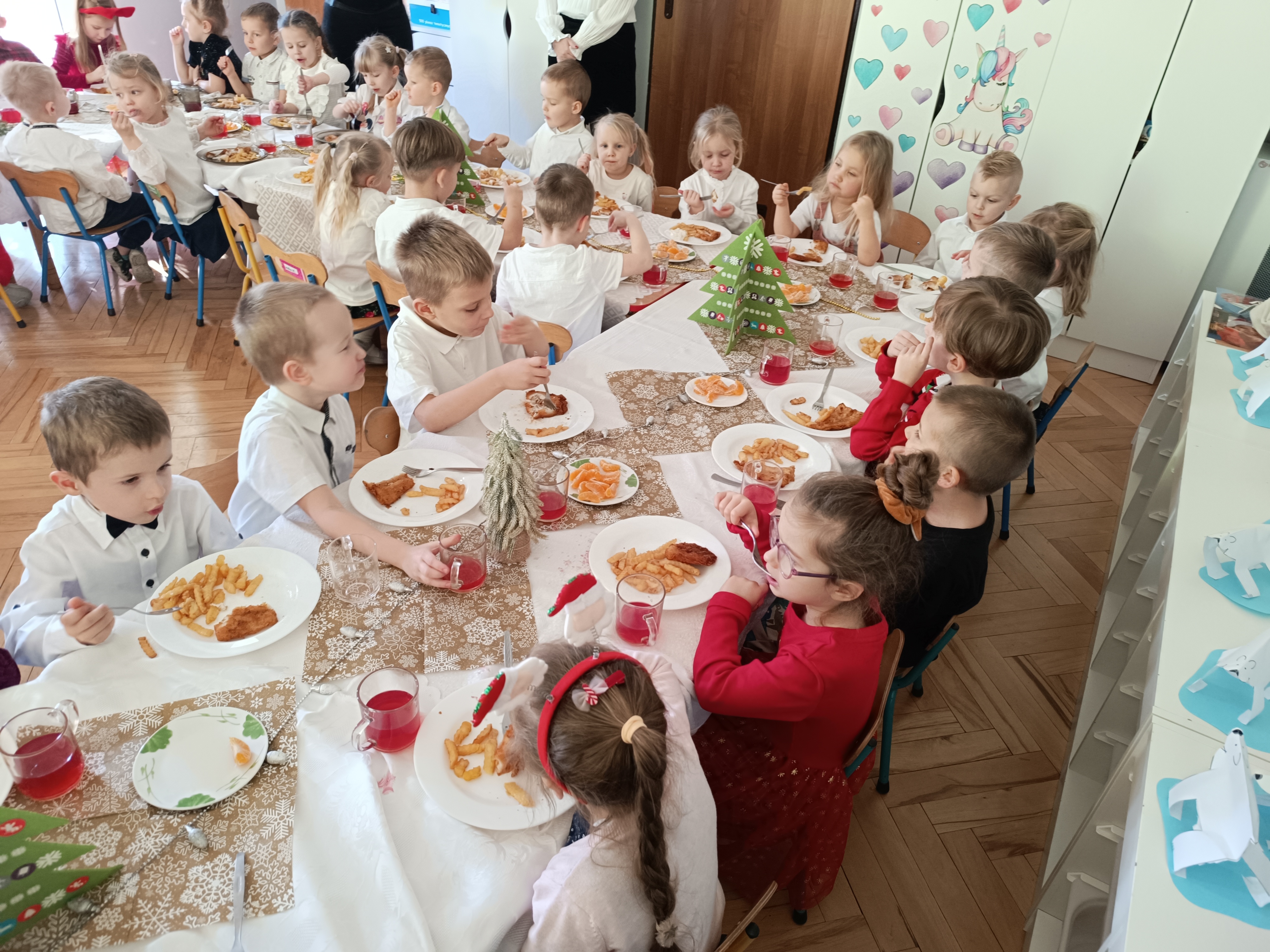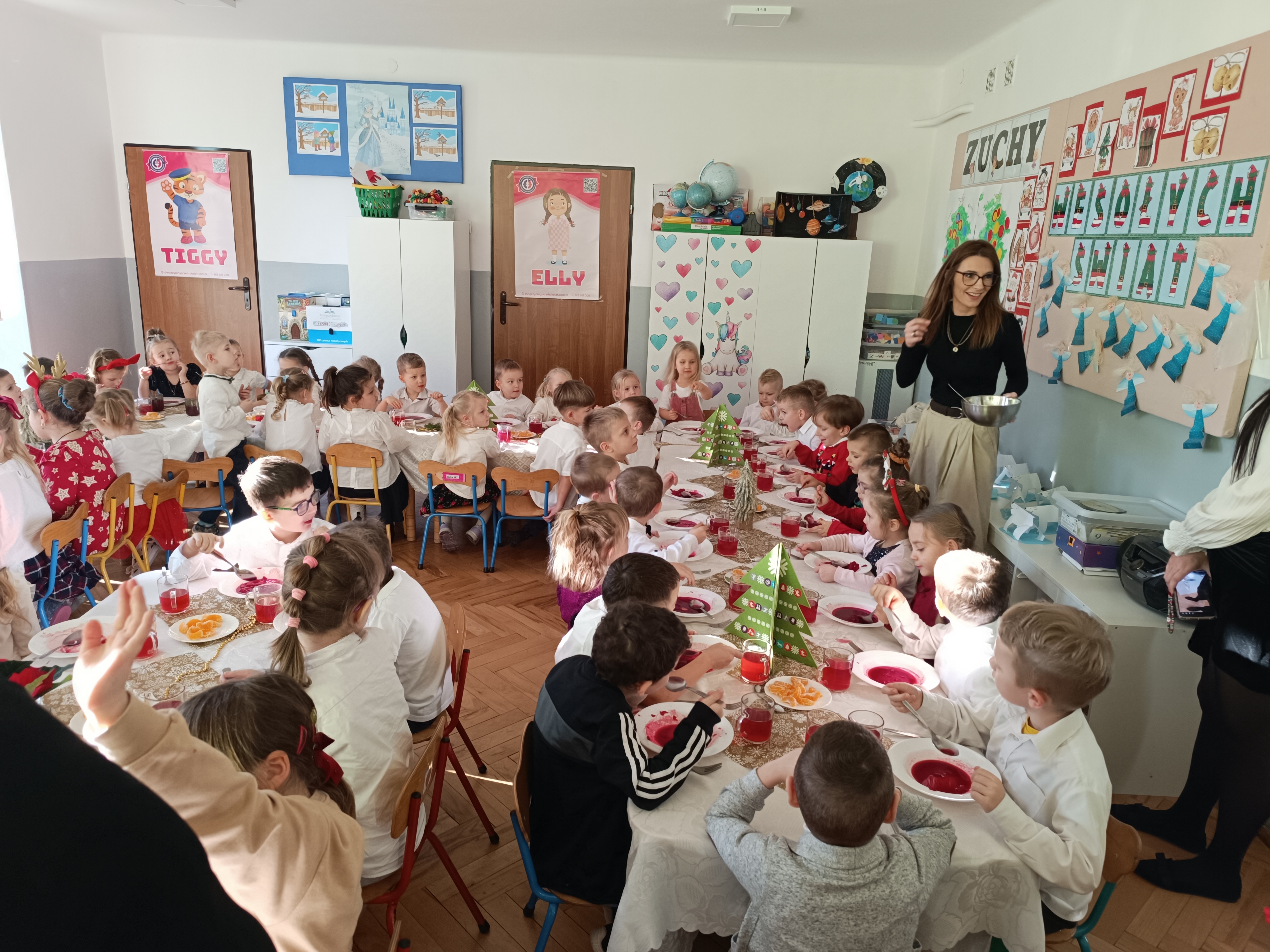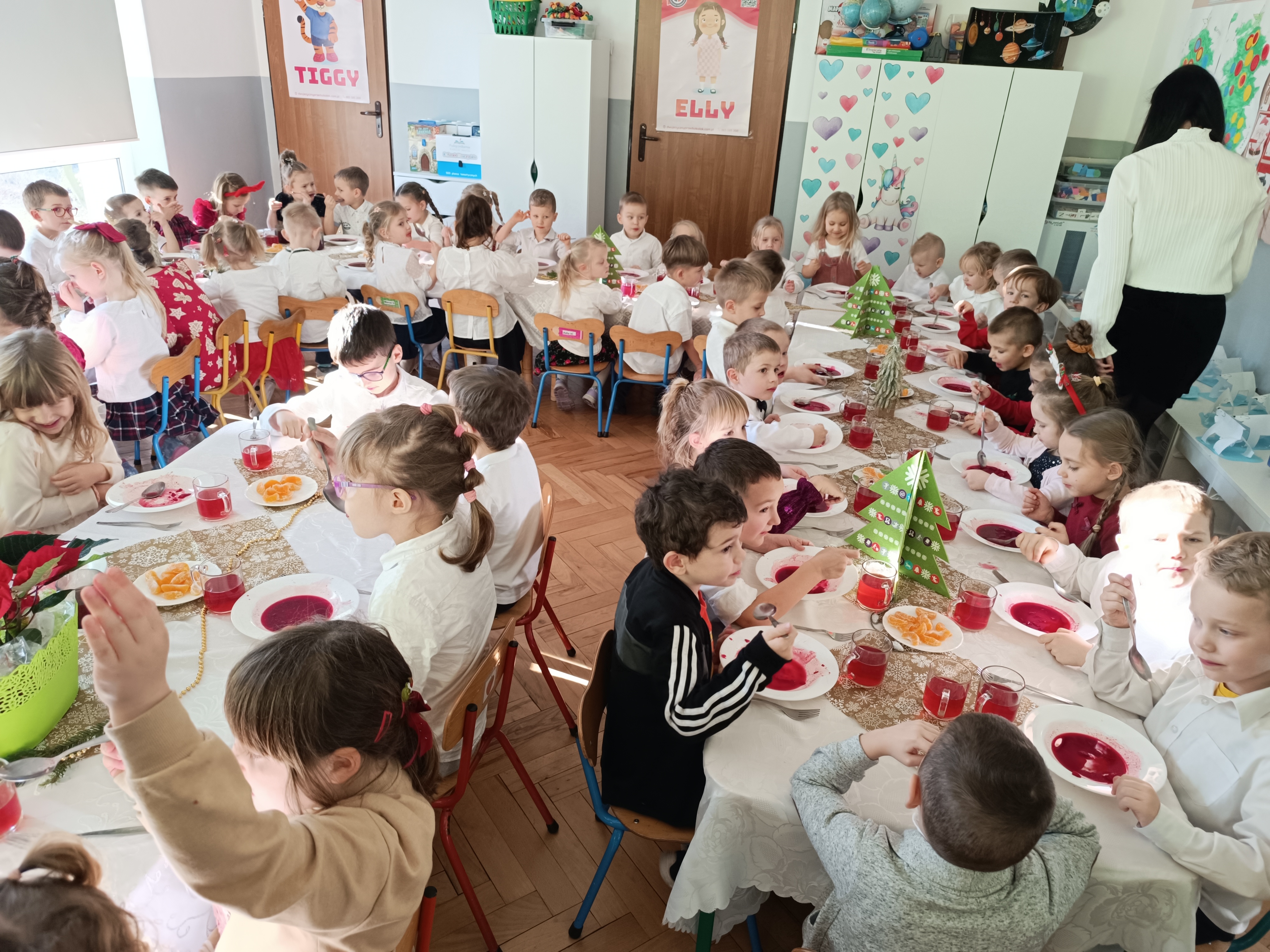 W piątek w całym przedszkolu panowała radosna, ożywiona atmosfera. Świąteczne dekoracje oraz dzieci w odświętnych strojach wprowadzały nastrój oczekiwania na wyjątkowe, niecodzienne wydarzenia.