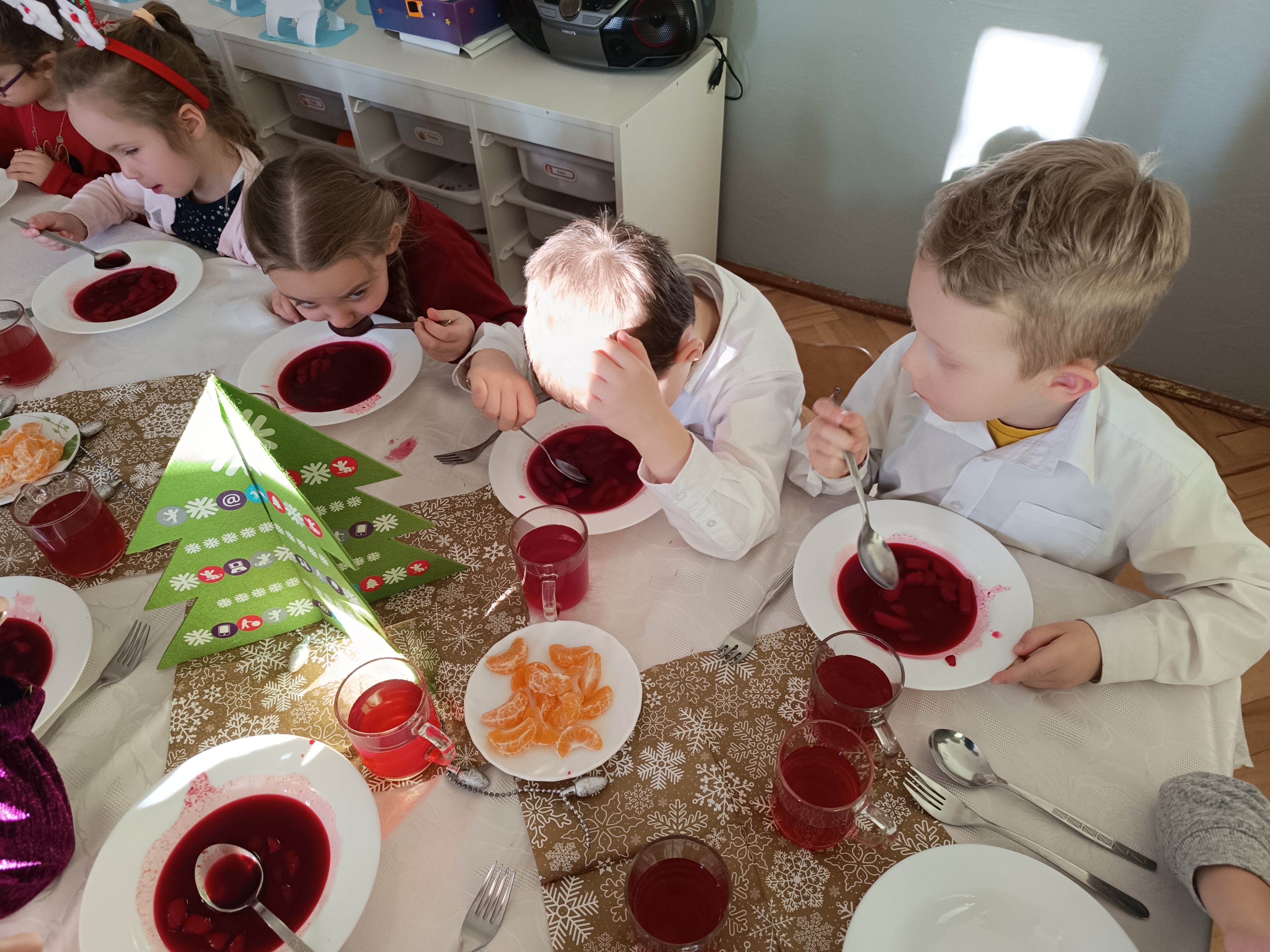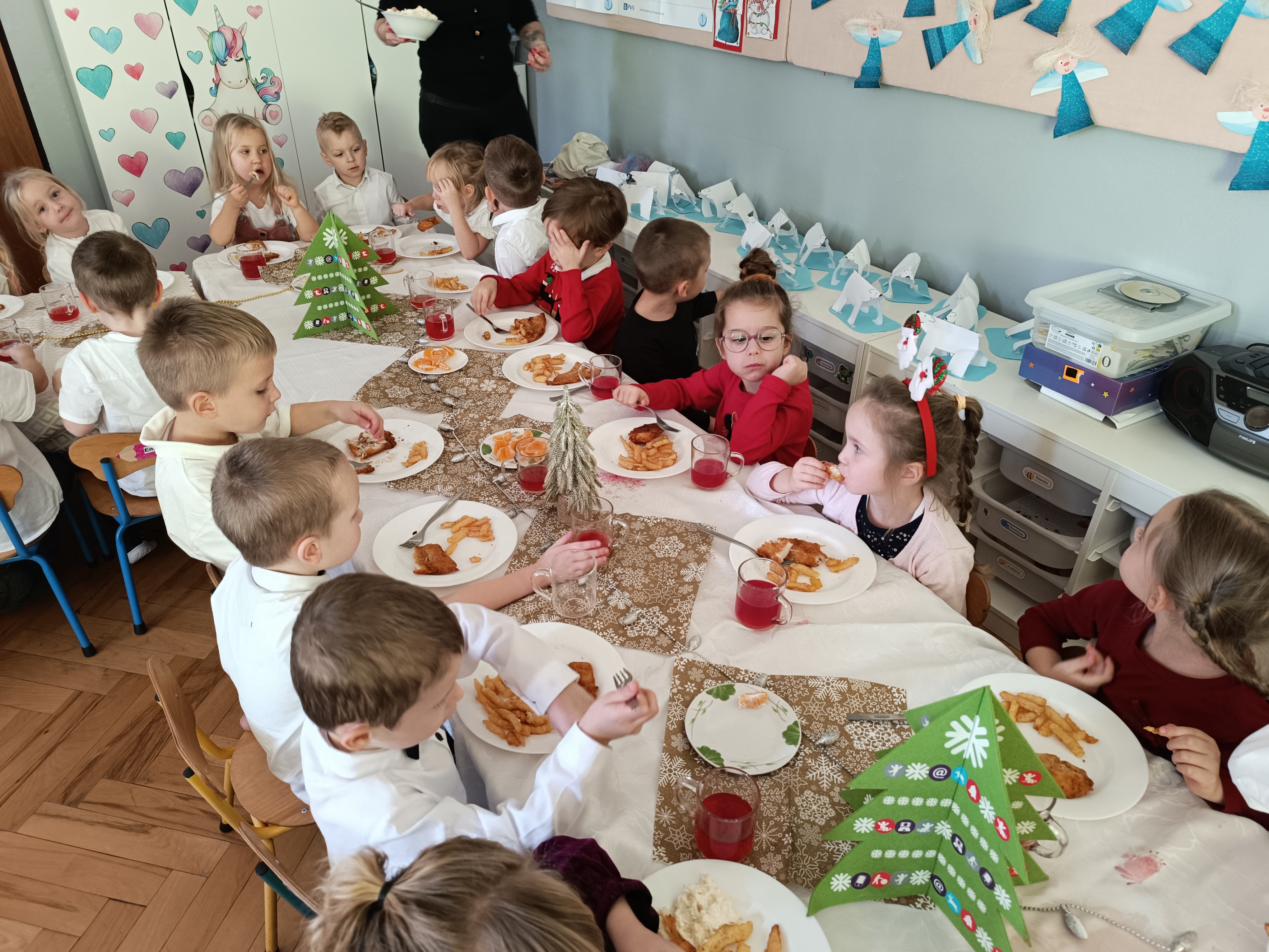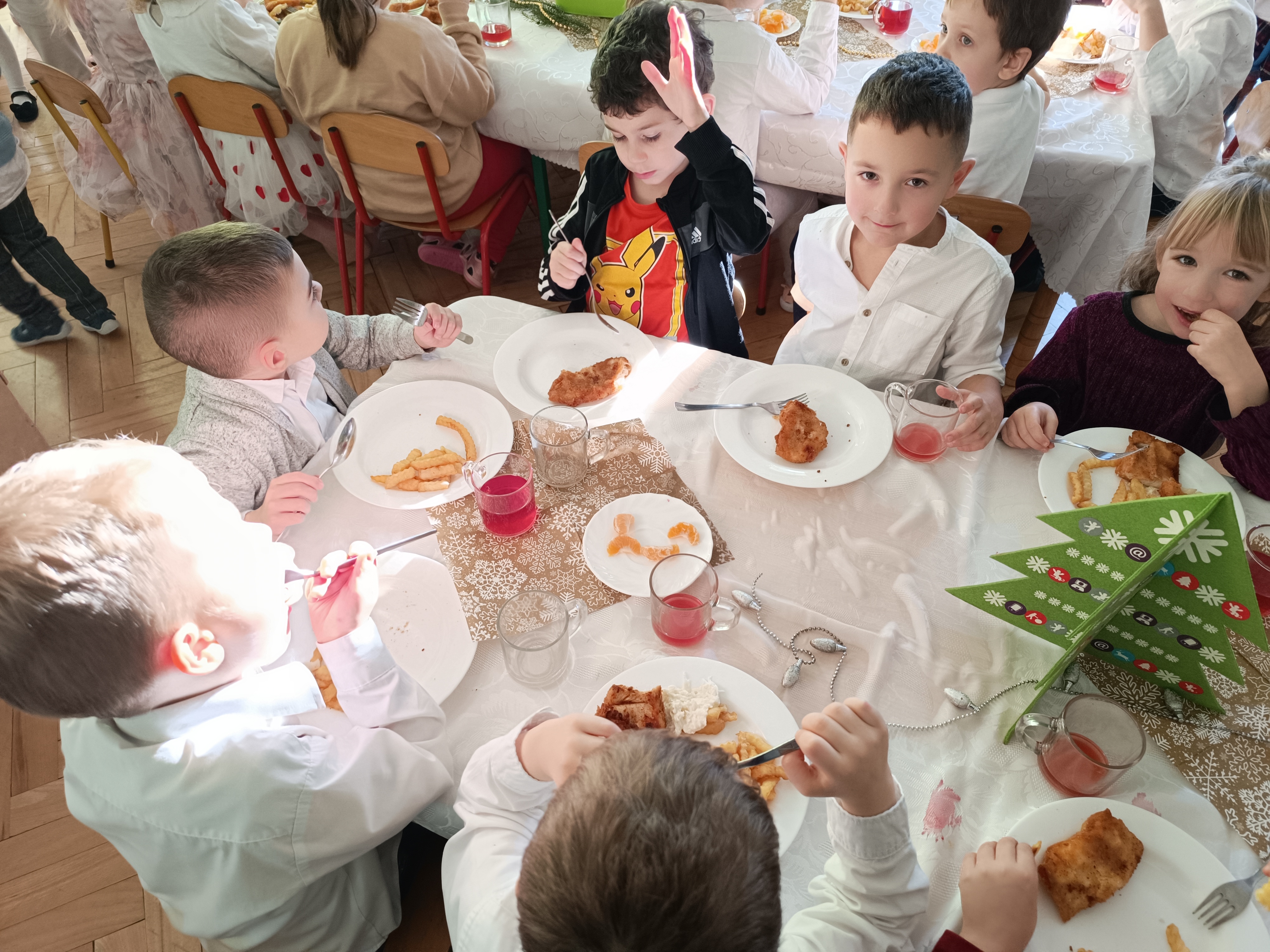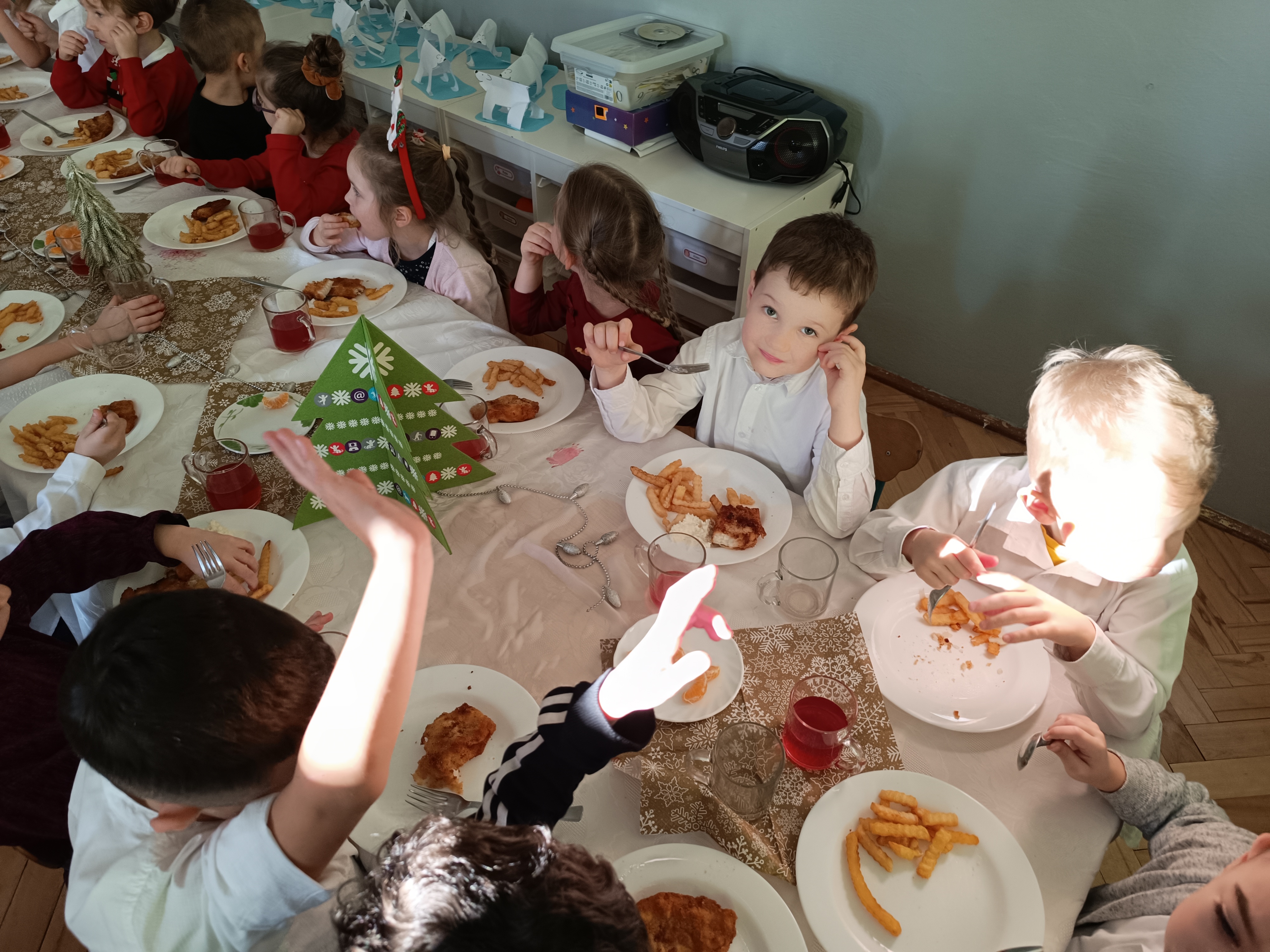 W piątek w całym przedszkolu panowała radosna, ożywiona atmosfera. Świąteczne dekoracje oraz dzieci w odświętnych strojach wprowadzały nastrój oczekiwania na wyjątkowe, niecodzienne wydarzenia.