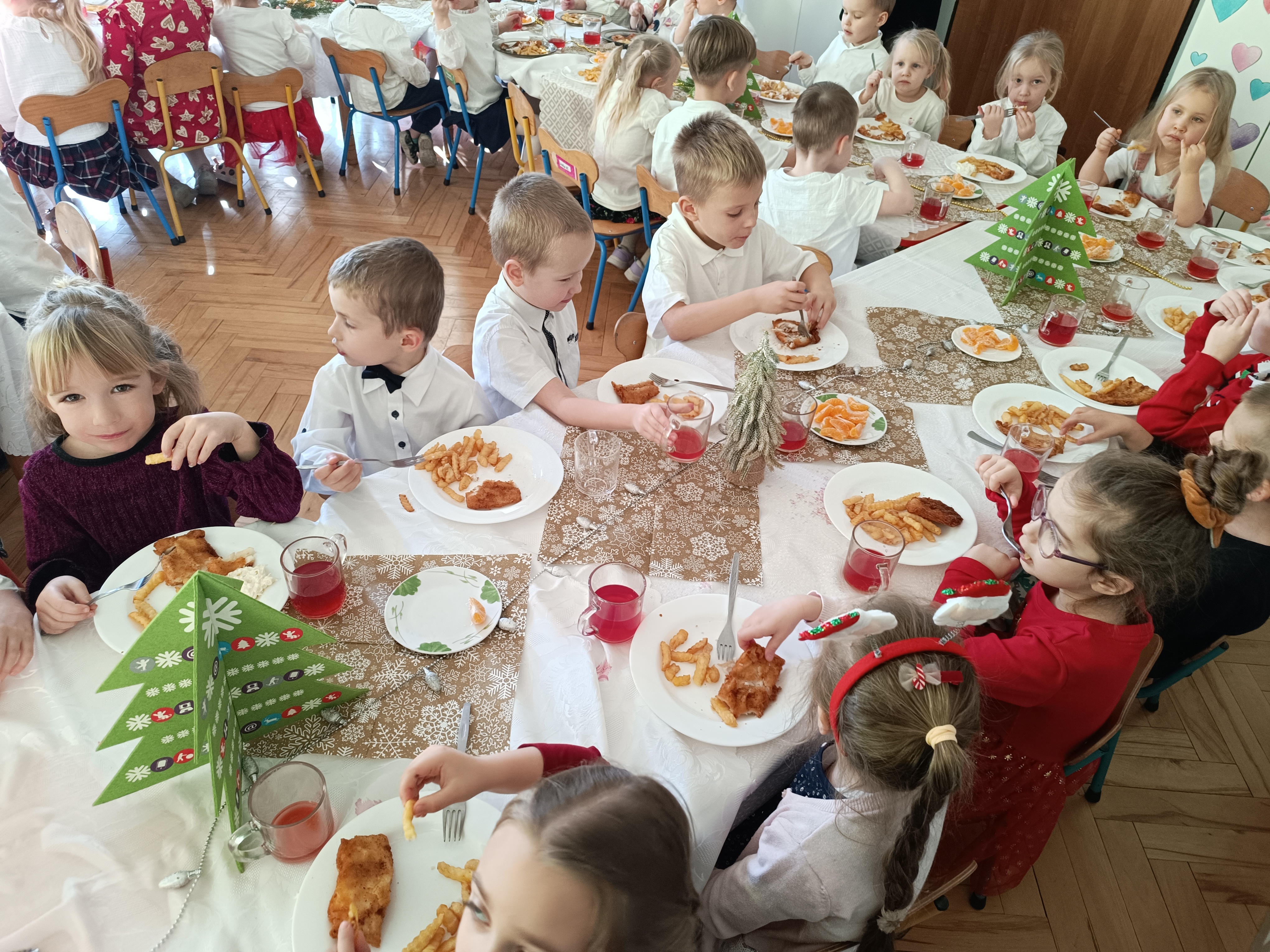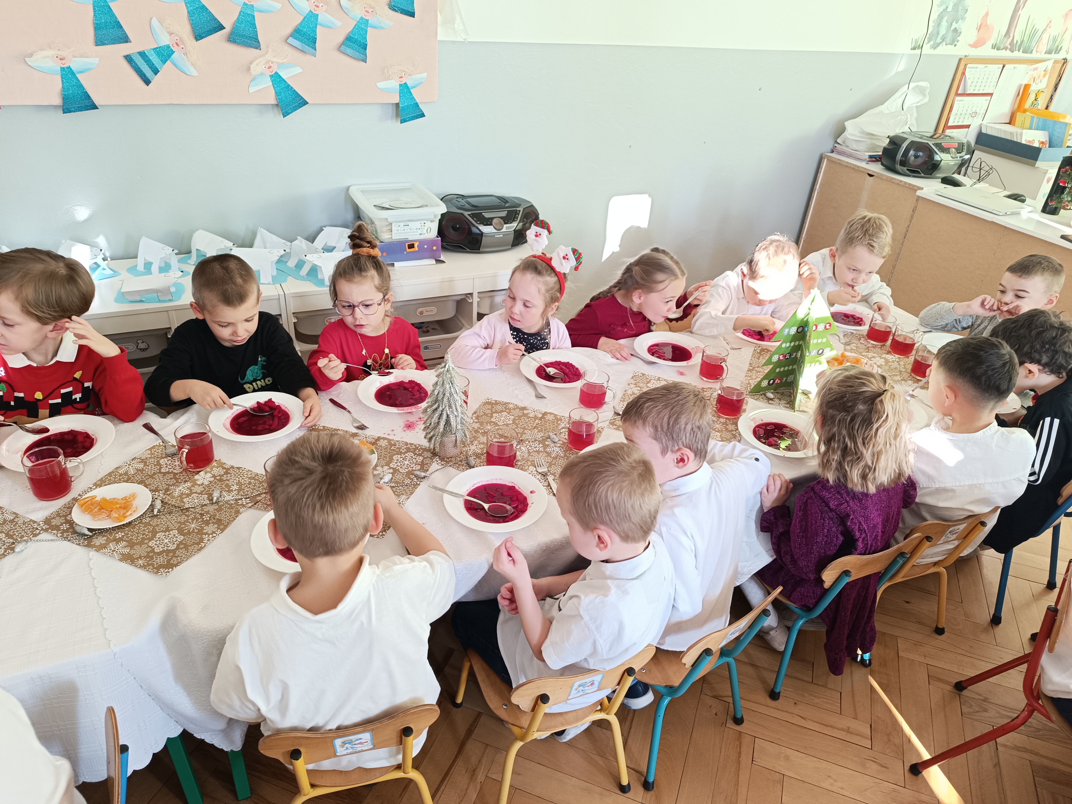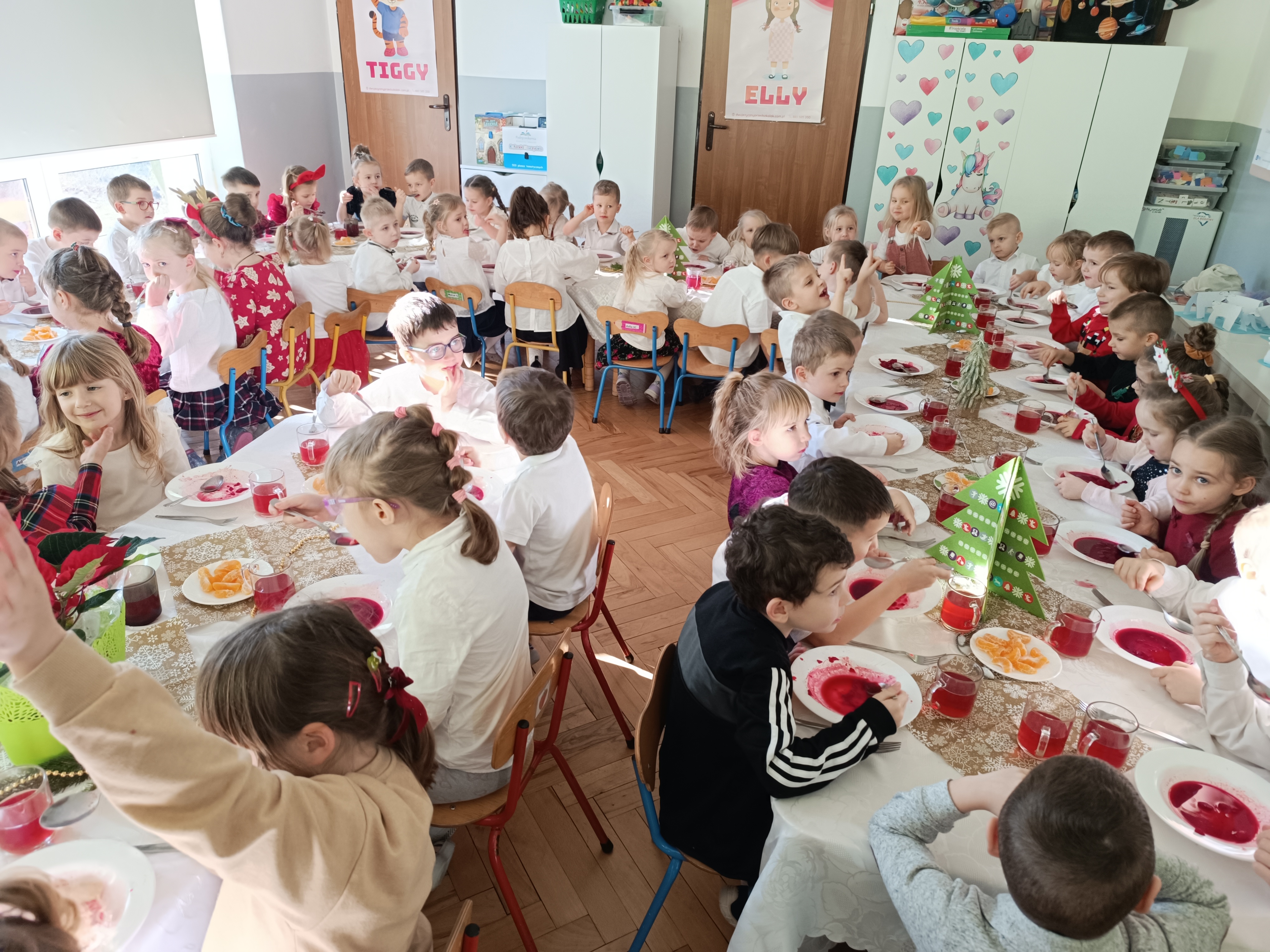 Zgromadziliśmy się na jednej sali ,a Pani Dyrektor złożyła wszystkim obecnym najlepsze życzenia, następnie wspólnie wszyscy przystąpiliśmy do tradycyjnego wigilijnego obiadu.