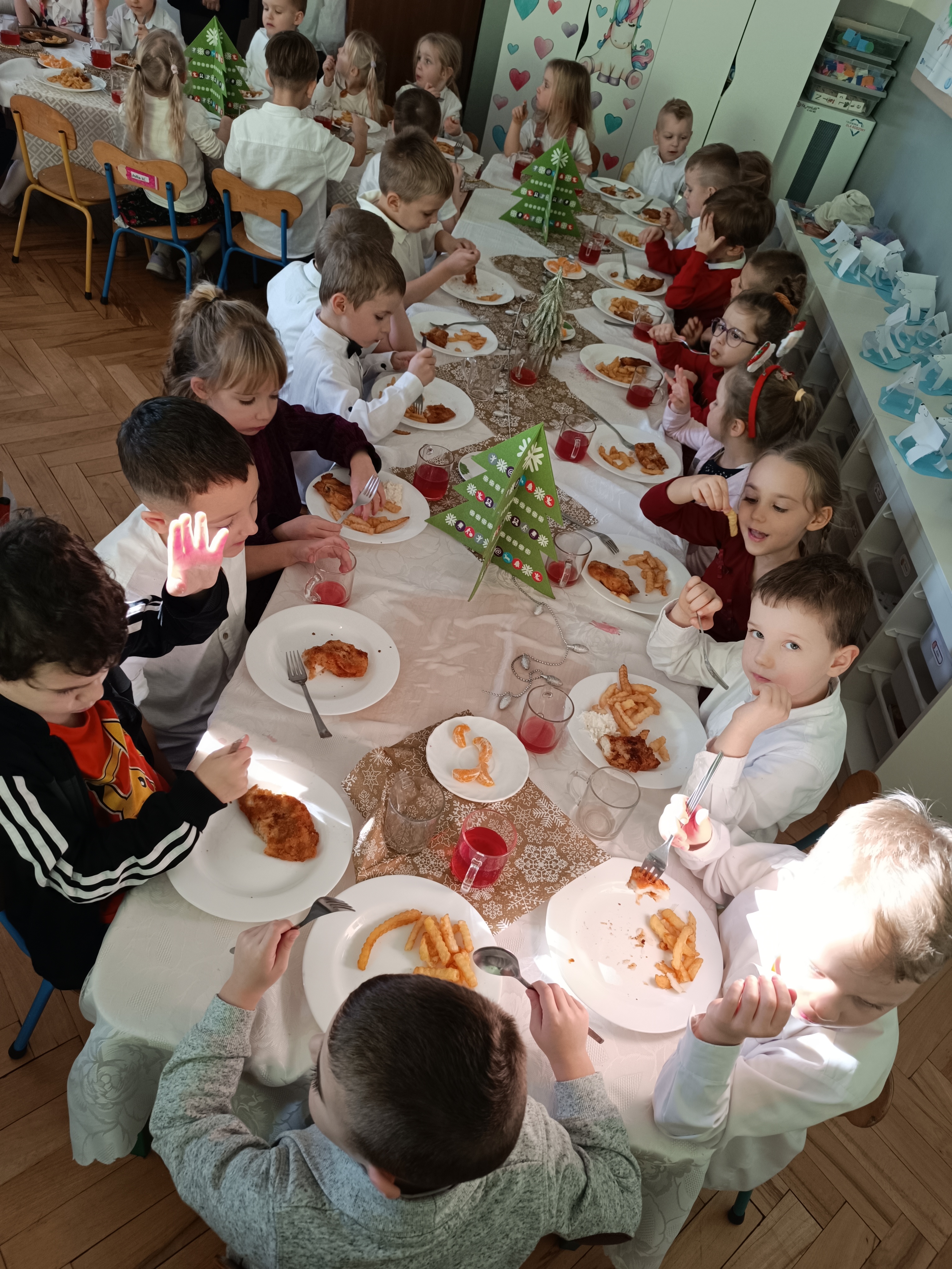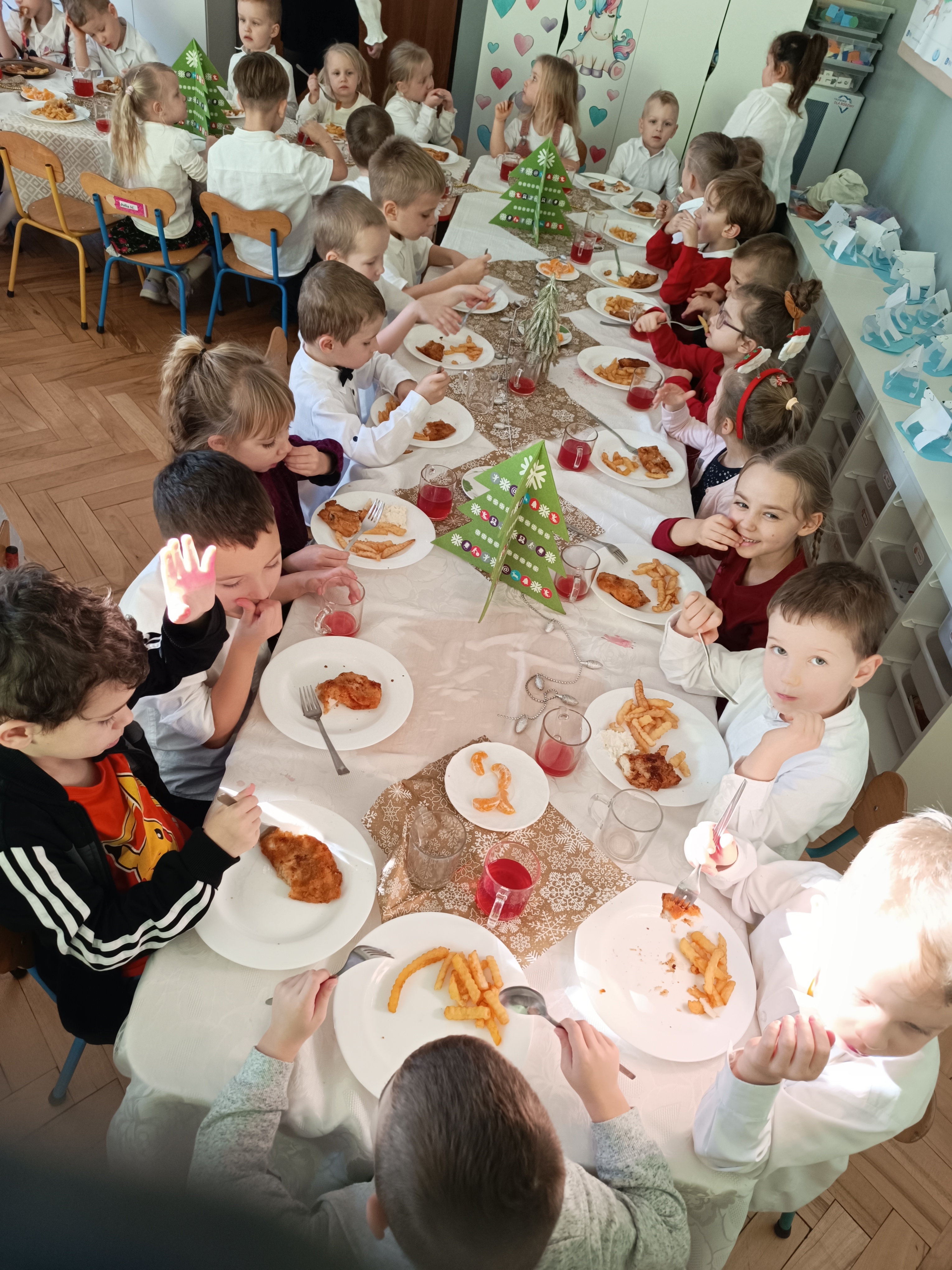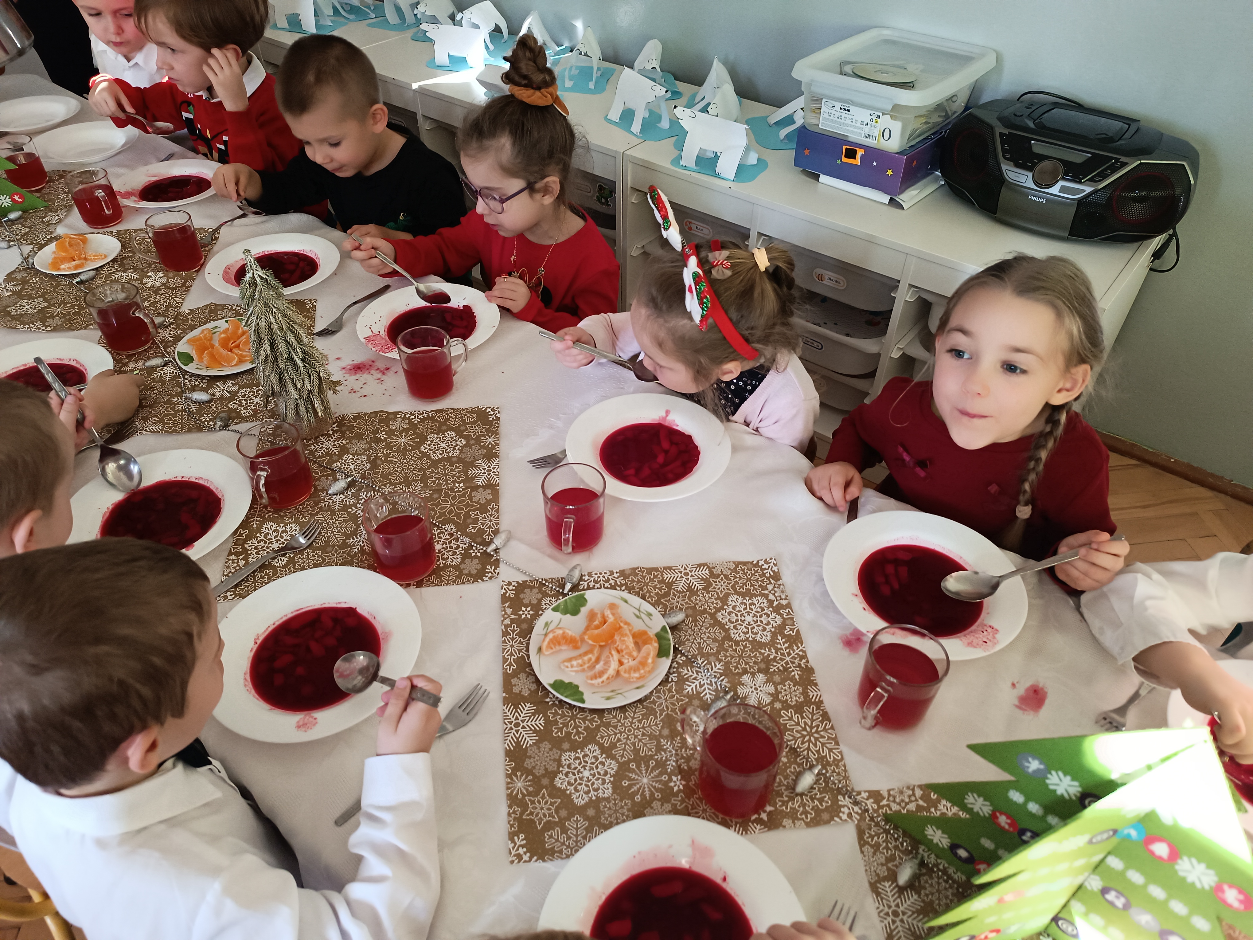 Zgromadziliśmy się na jednej sali ,a Pani Dyrektor złożyła wszystkim obecnym najlepsze życzenia, następnie wspólnie wszyscy przystąpiliśmy do tradycyjnego wigilijnego obiadu.