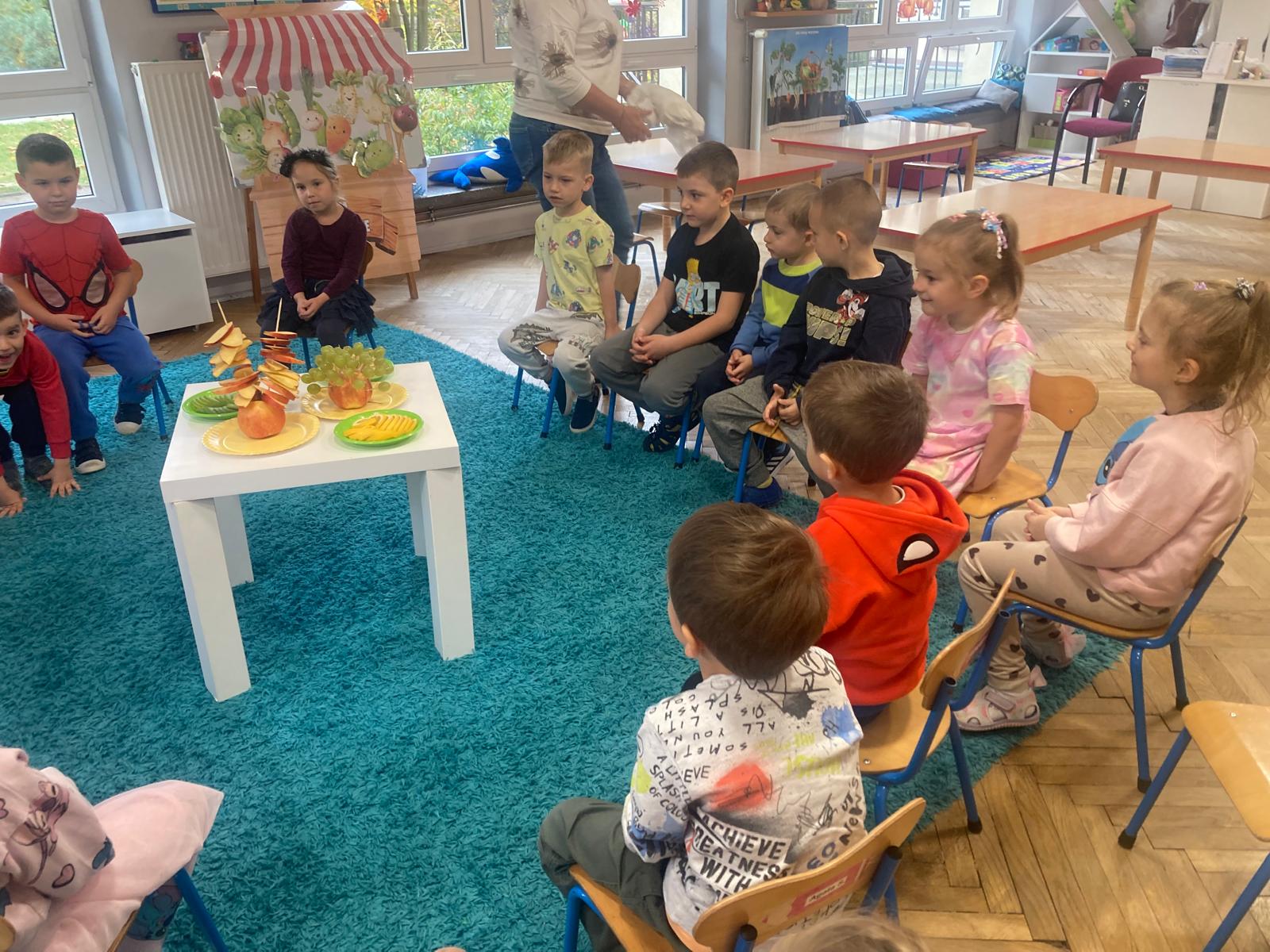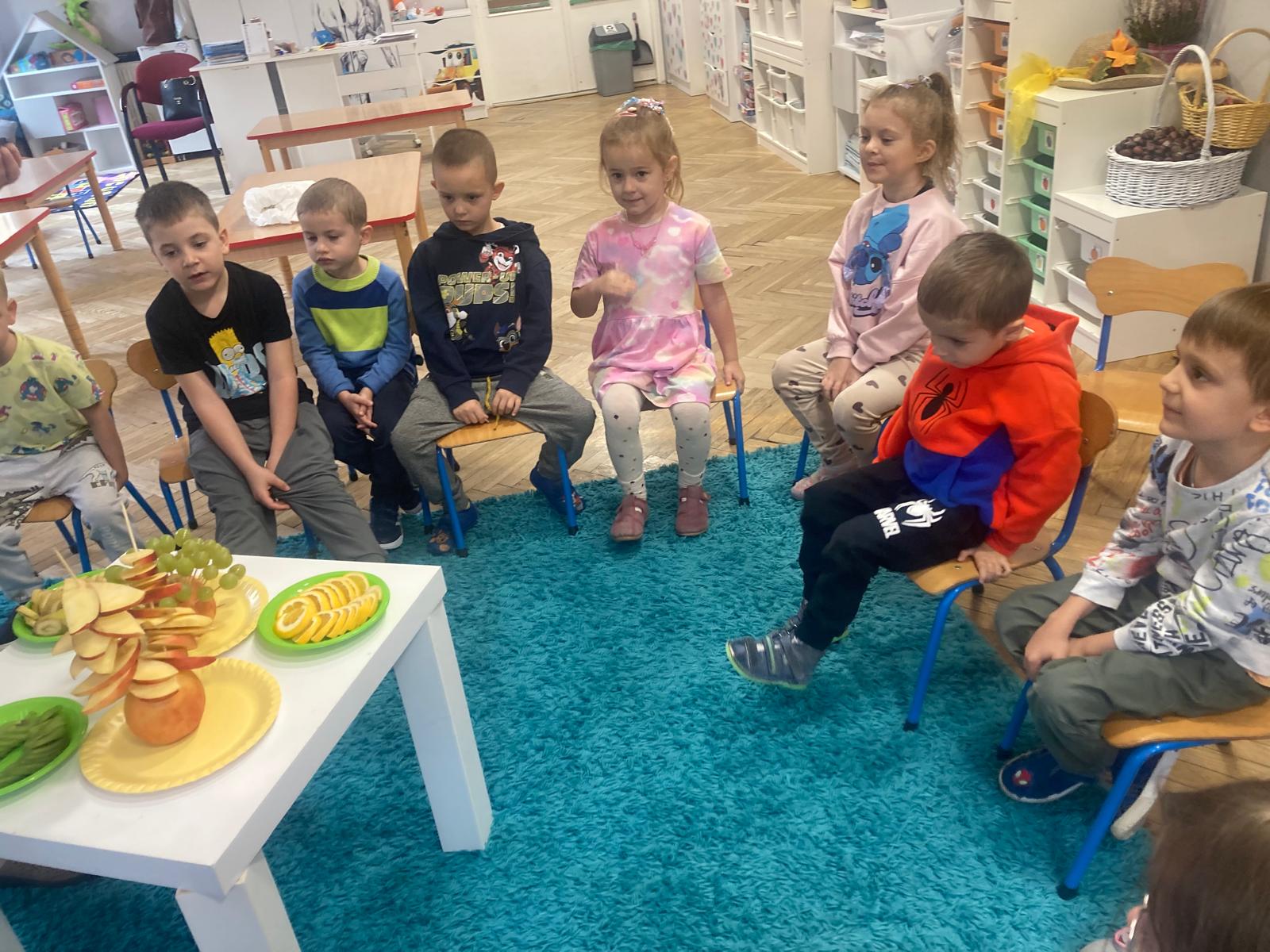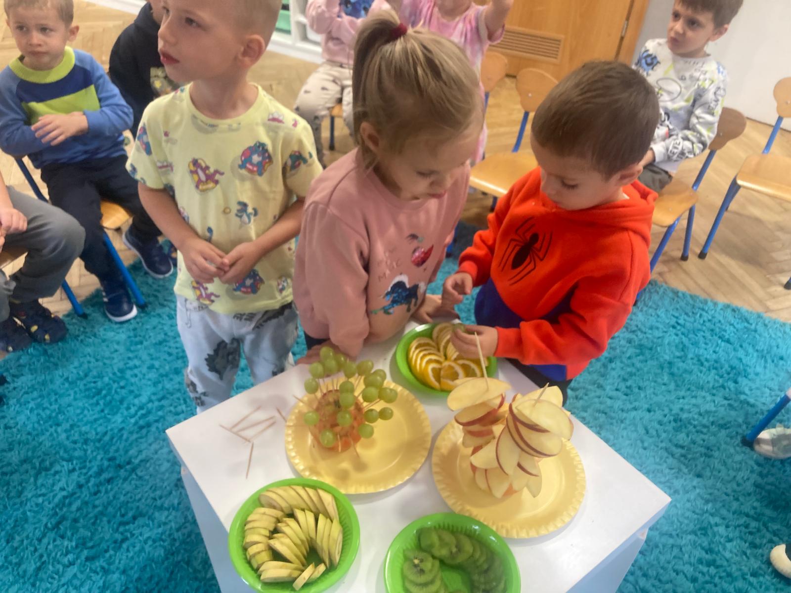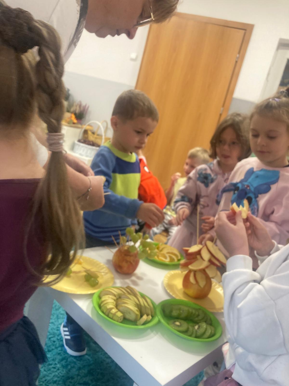 O witaminach zawartych w warzywach i owocach rozmawialiśmy w oparciu o wiersz Jana Brzechwy "Na sraganie".Tańczyliśmy jarzynowe tango a degustacja owocowych " dań" utrwalila wiedzę dzieci o ich roli w zyciu człowieka.