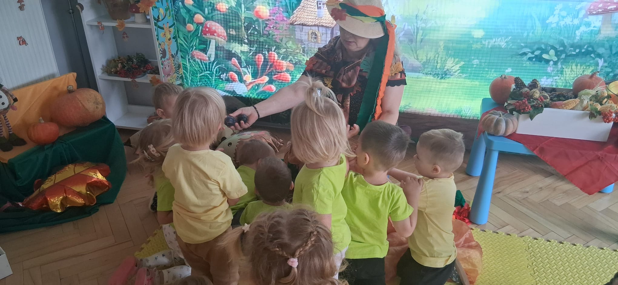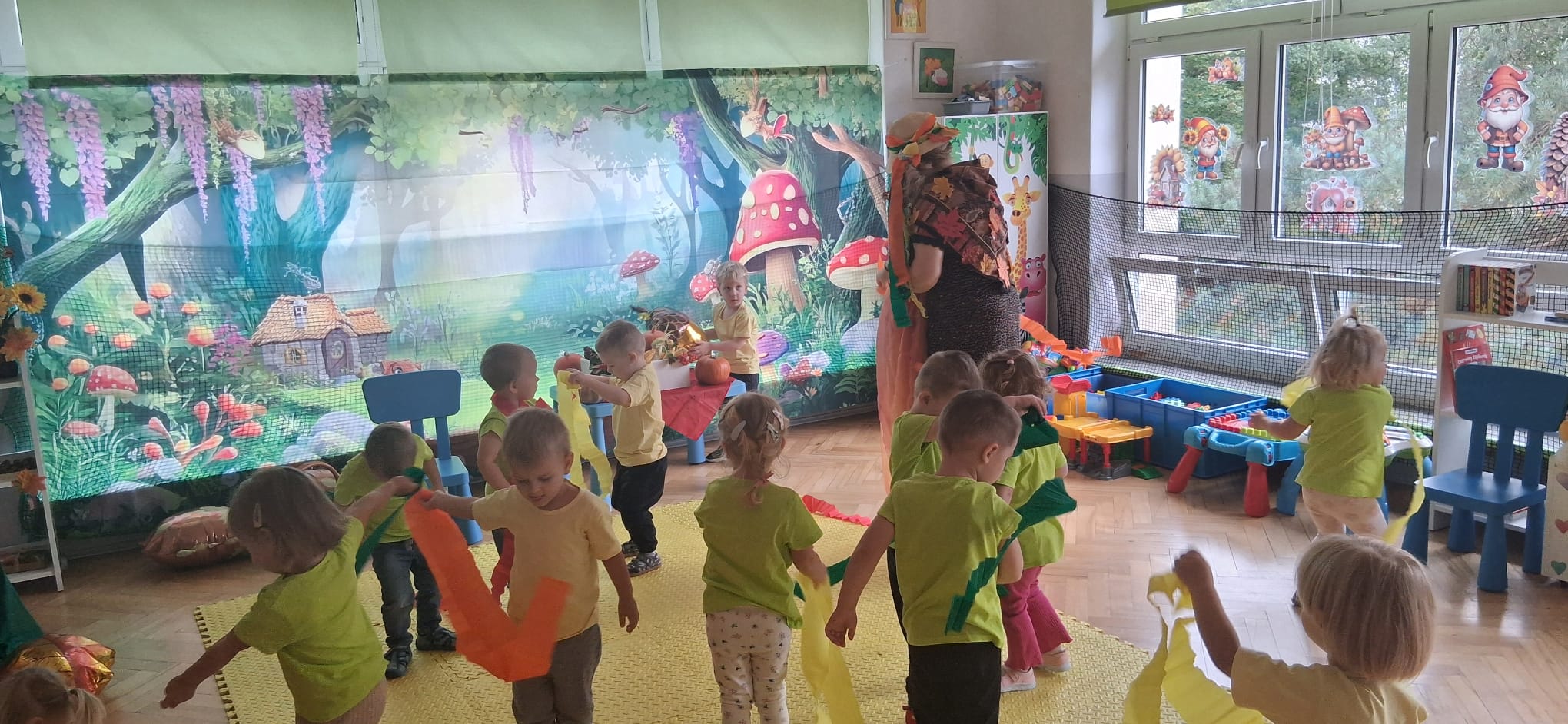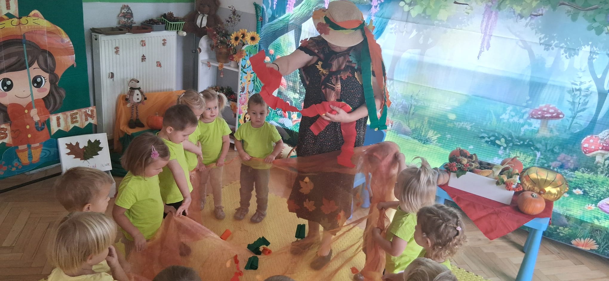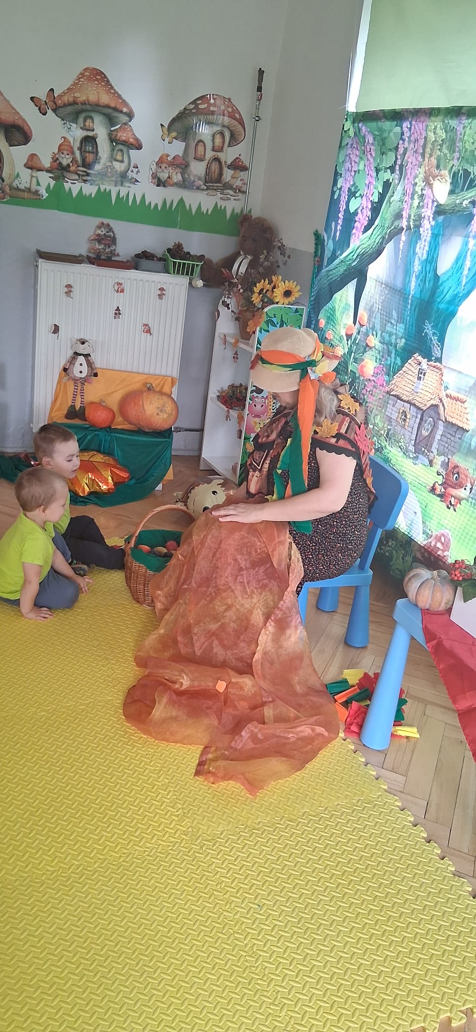 O tym, że mamy już jesień przekonały się ,,Maluszki’’. Pani Jesień przyszła rano w pogodny i radosny dzień. Przyniosła ze sobą kosz pełen darów. Przy dźwiękach wesołej muzyki zaprosiła dzieci do „Jesiennej zabawy’’, zachęcała do tańca i rozwiązywania zagadek na temat jesiennej pory roku.
