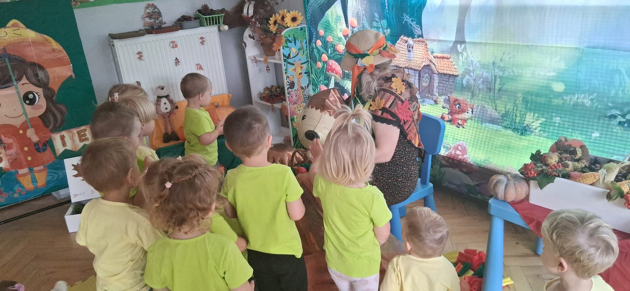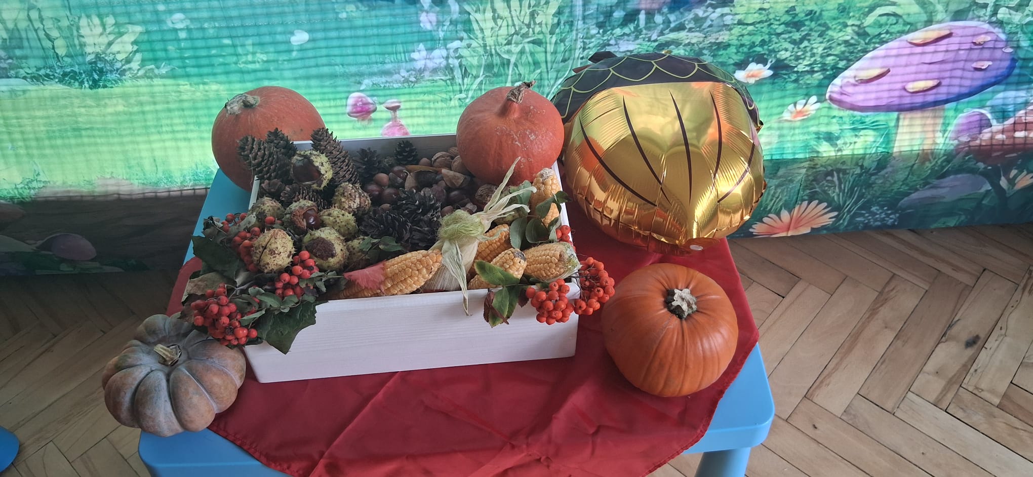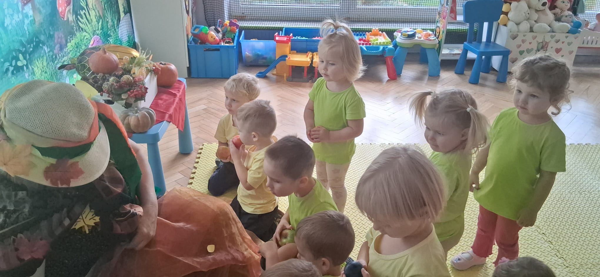 O tym, że mamy już jesień przekonały się ,,Maluszki’’. Pani Jesień przyszła rano w pogodny i radosny dzień. Przyniosła ze sobą kosz pełen darów. Przy dźwiękach wesołej muzyki zaprosiła dzieci do „Jesiennej zabawy’’, zachęcała do tańca i rozwiązywania zagadek na temat jesiennej pory roku.