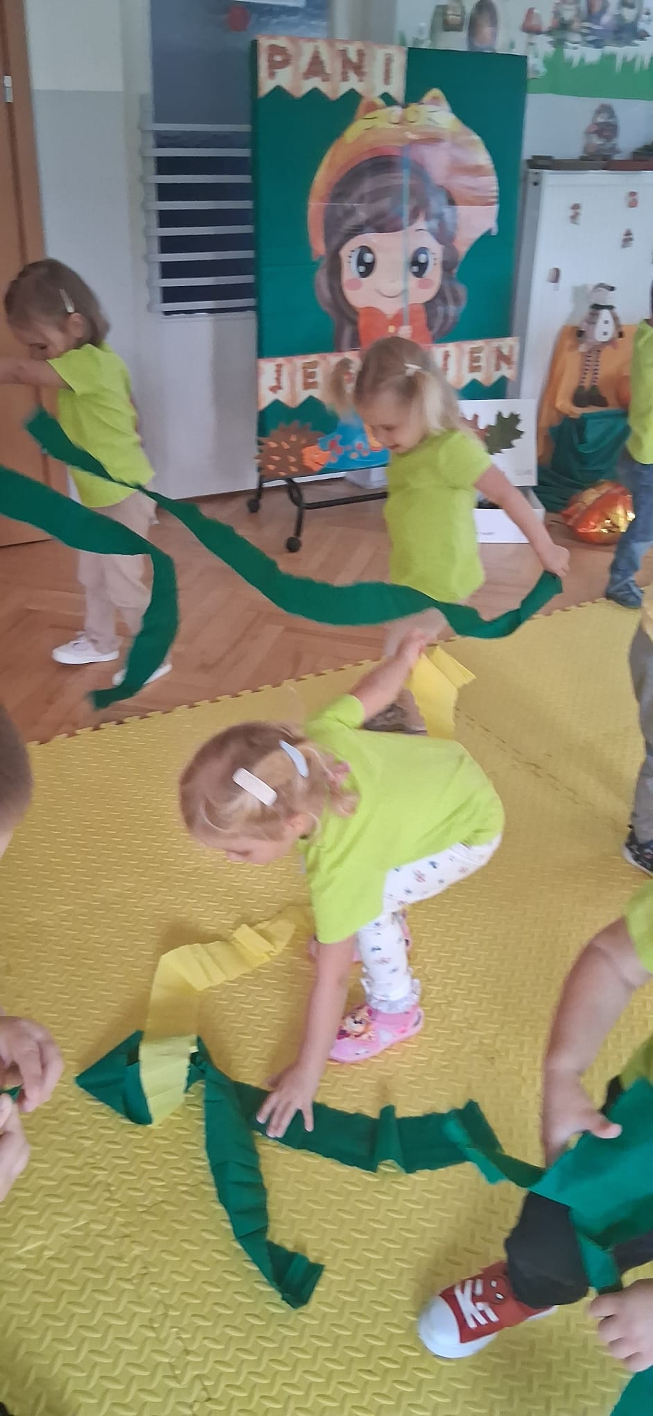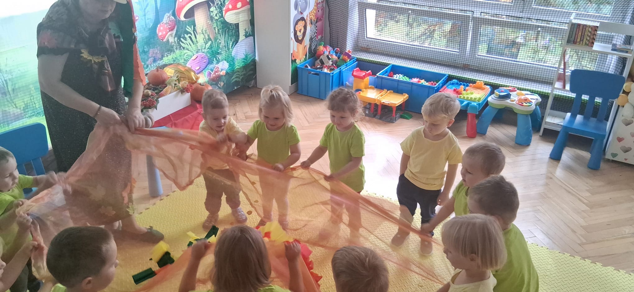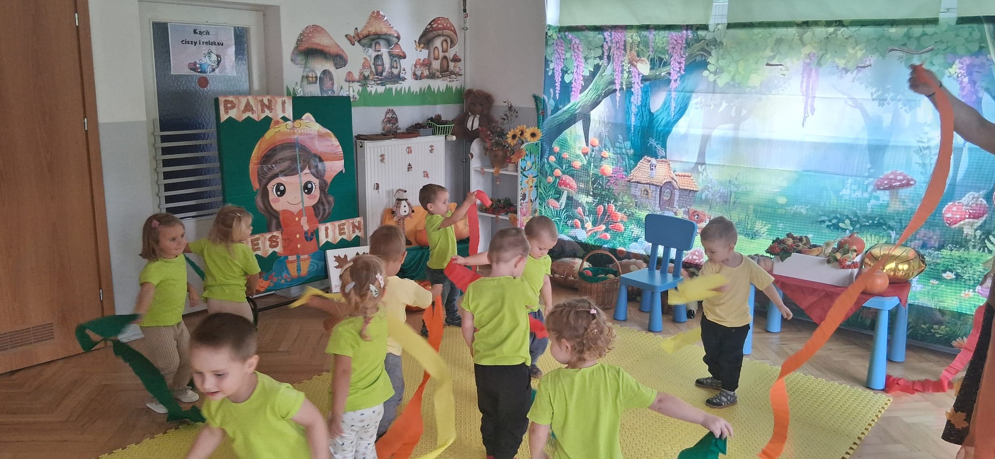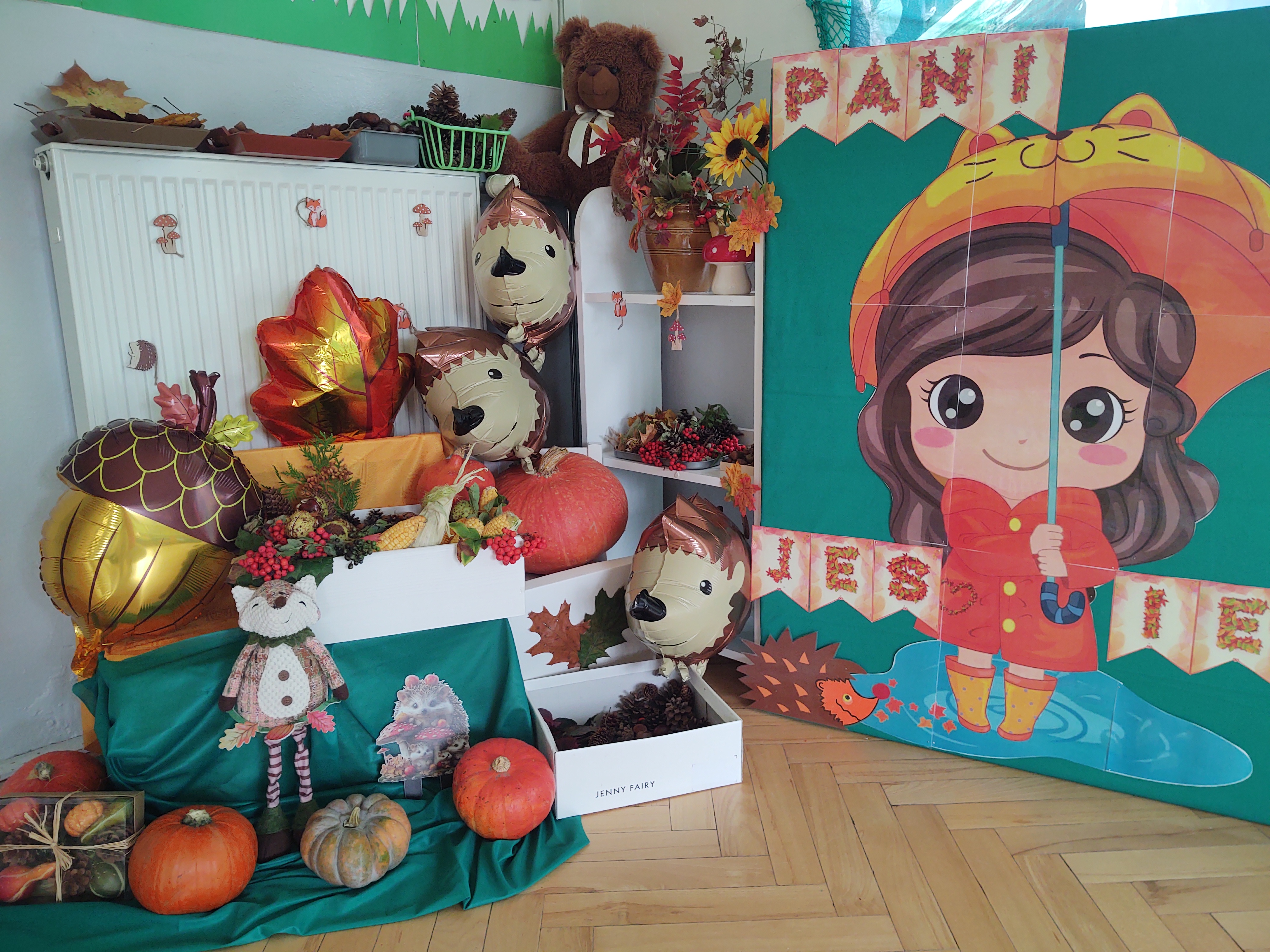 O tym, że mamy już jesień przekonały się ,,Maluszki’’. Pani Jesień przyszła rano w pogodny i radosny dzień. Przyniosła ze sobą kosz pełen darów. Przy dźwiękach wesołej muzyki zaprosiła dzieci do „Jesiennej zabawy’’, zachęcała do tańca i rozwiązywania zagadek na temat jesiennej pory roku.