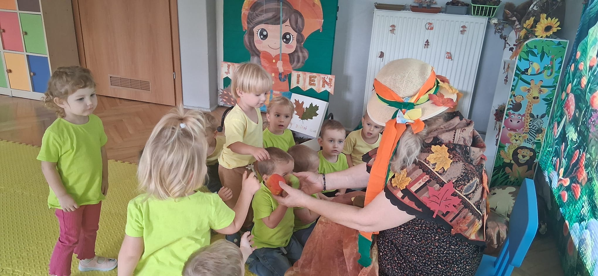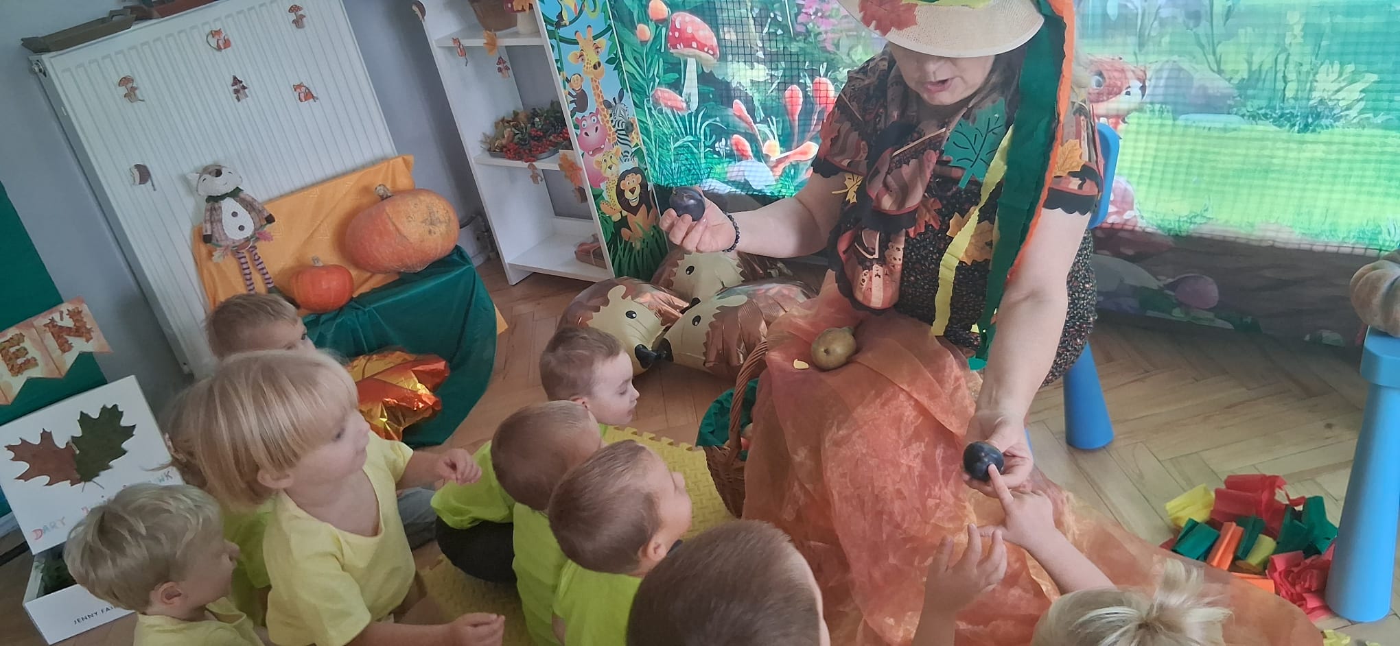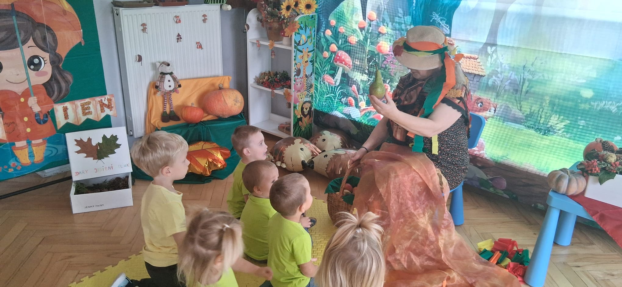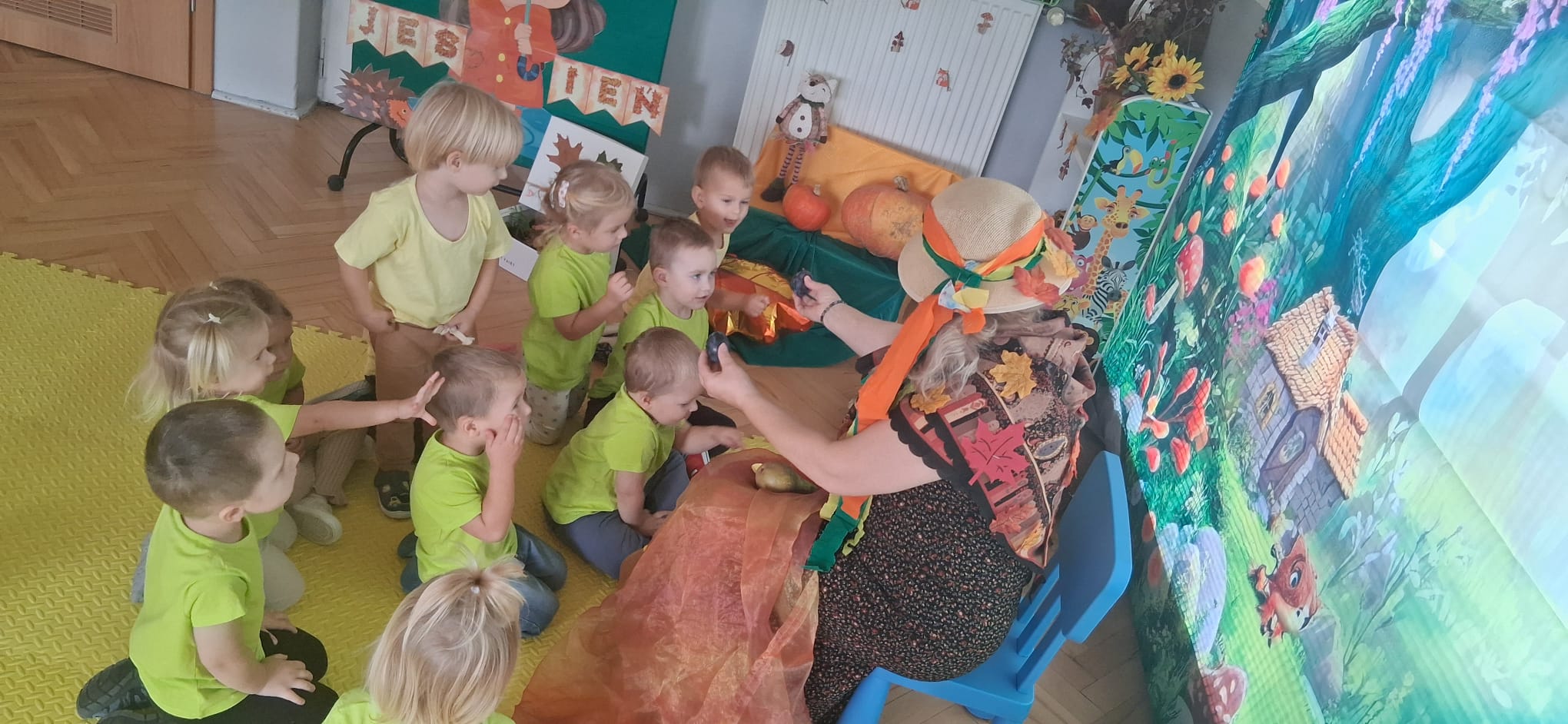 Podczas wizyty Pani Jesieni przedszkolaki przypomniały i utrwaliły wiadomości o aspekcie przyrodniczym, m.in. dlaczego jesienią liście zmieniają kolor, czy dary jesieni są potrzebne tylko ludziom. Na te i wiele innych pytań dzieci odpowiadały bez wahania.. Pani Jesień była tak oczarowana znajomością tematyki jesiennej przez dzieci, że postanowiła uczcić ten szczególny dzień i obdarować przedszkolaki owocowymi darami z jej kosza.