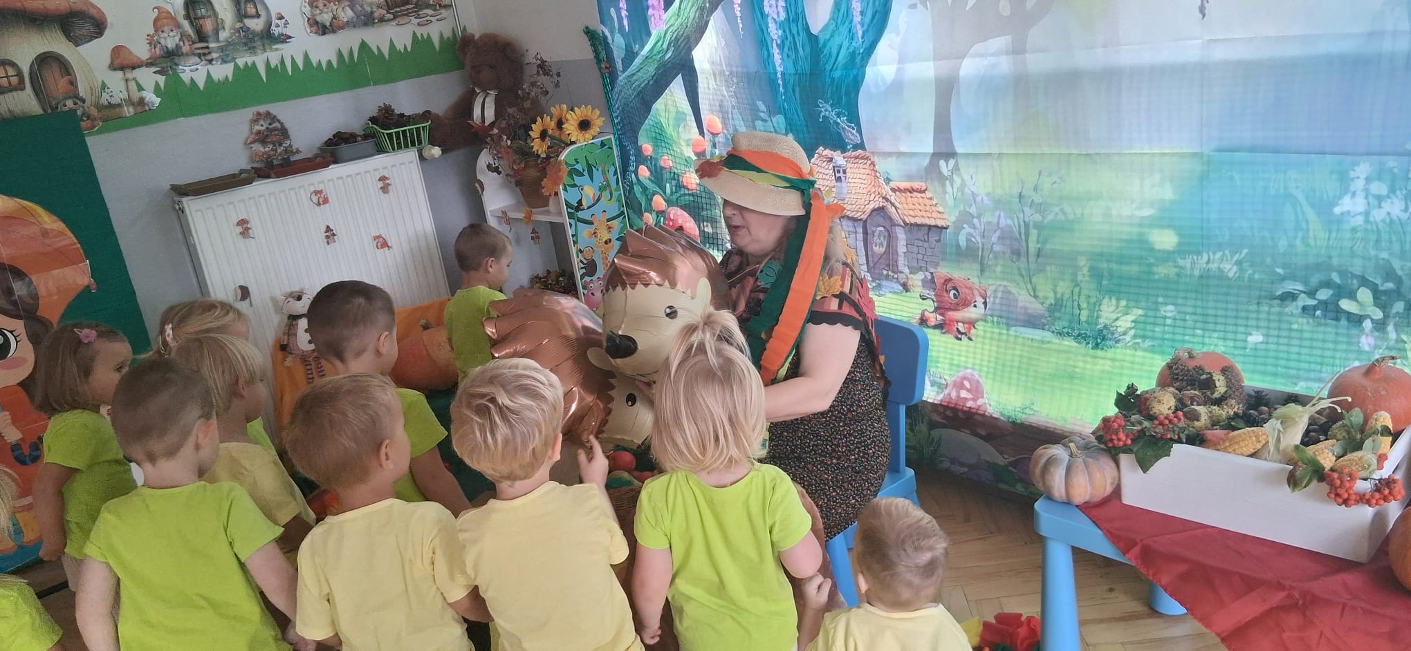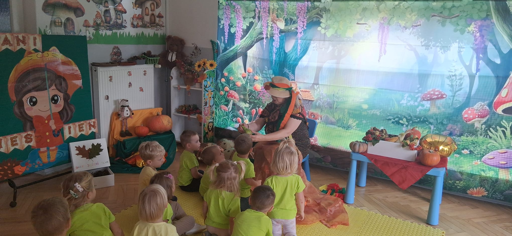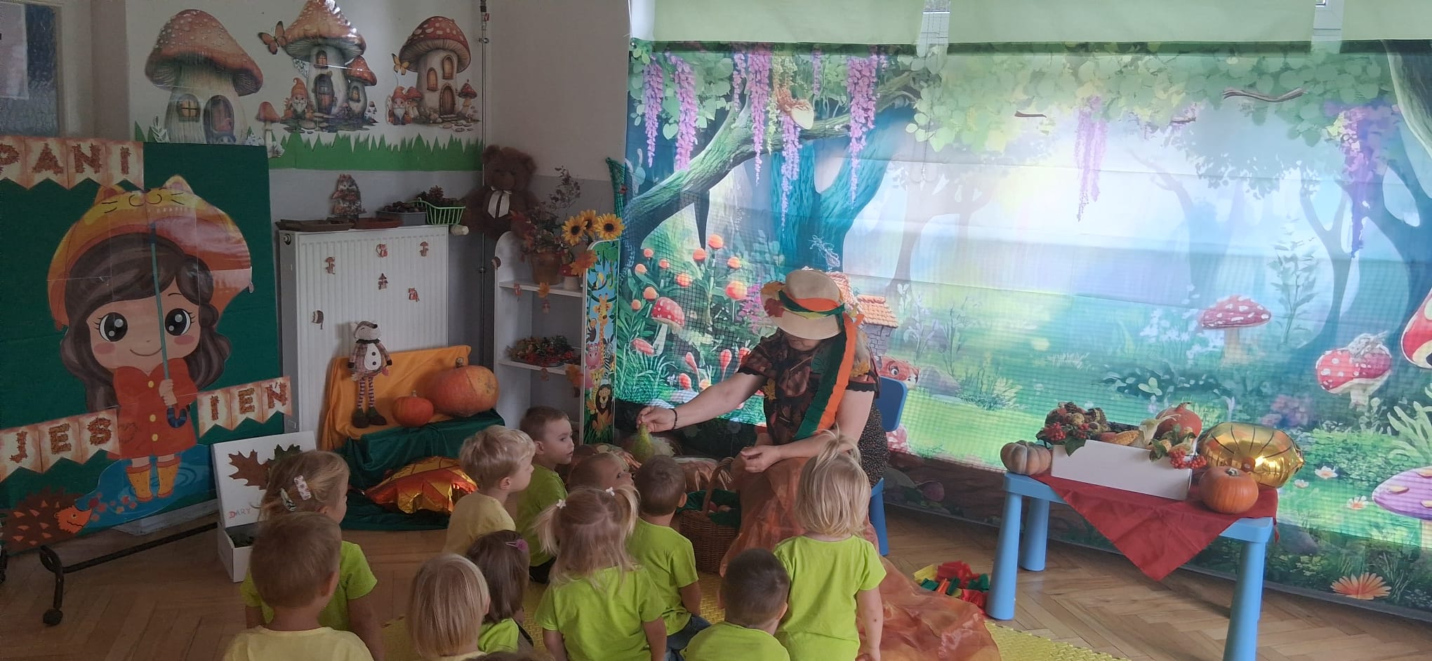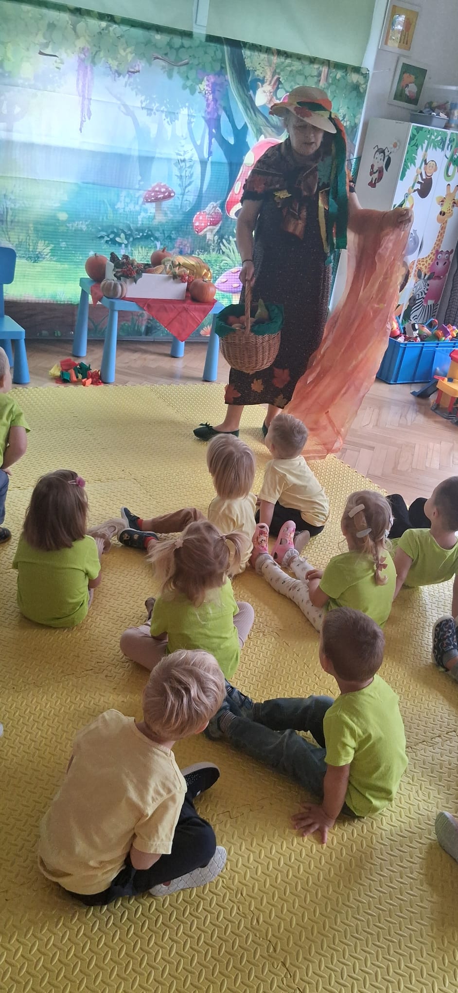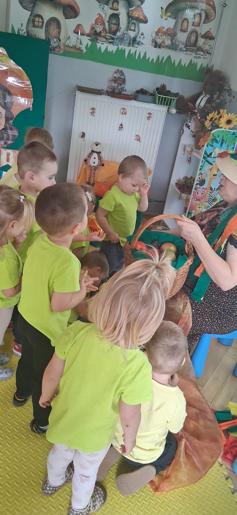 Podczas wizyty Pani Jesieni przedszkolaki przypomniały i utrwaliły wiadomości o aspekcie przyrodniczym, m.in. dlaczego jesienią liście zmieniają kolor, czy dary jesieni są potrzebne tylko ludziom. Na te i wiele innych pytań dzieci odpowiadały bez wahania.. Pani Jesień była tak oczarowana znajomością tematyki jesiennej przez dzieci, że postanowiła uczcić ten szczególny dzień i obdarować przedszkolaki owocowymi darami z jej kosza.