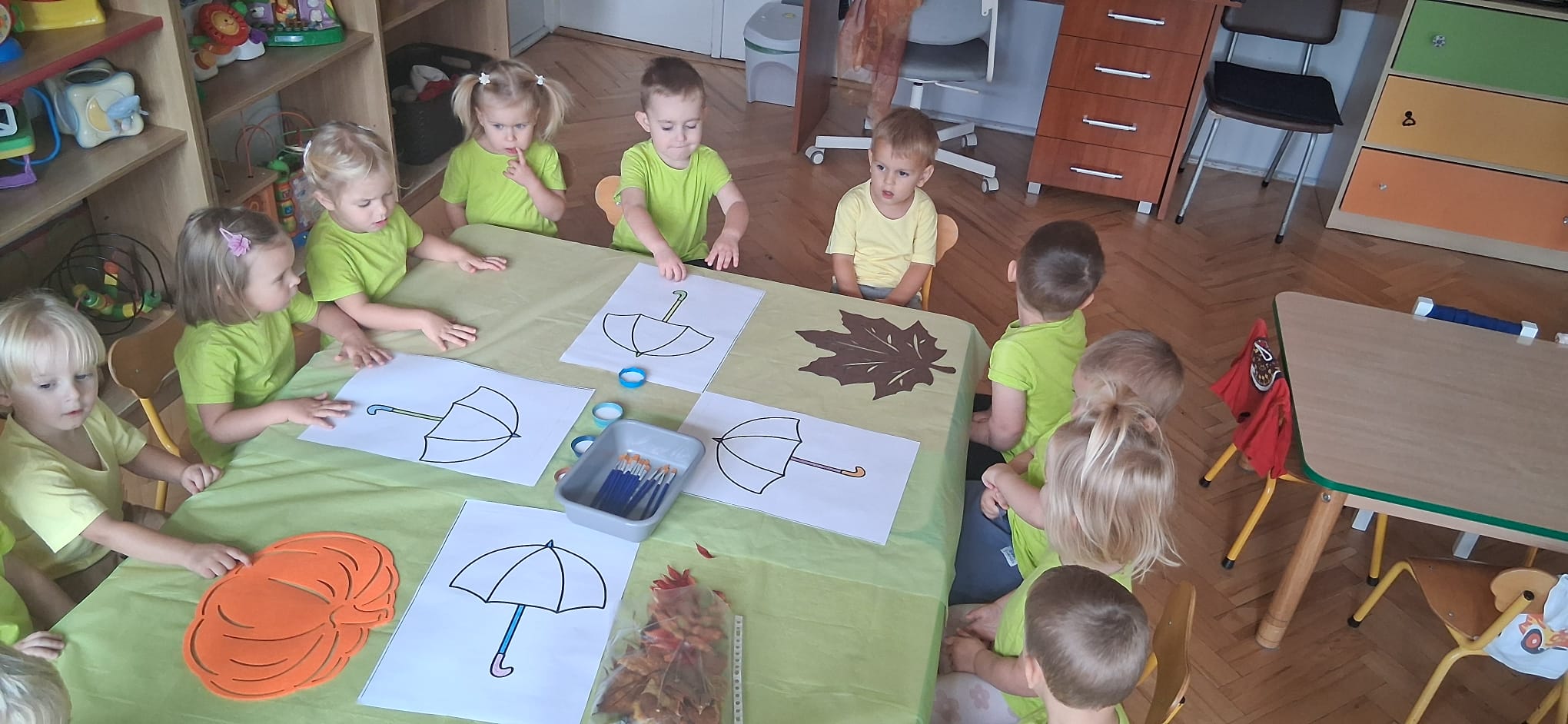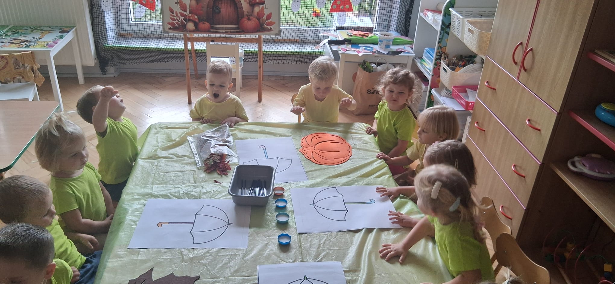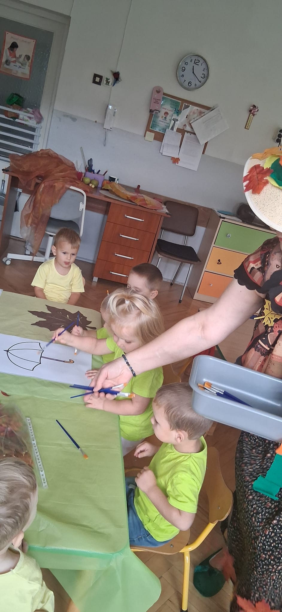 Dzieci w podziękowaniu za odwiedziny wykonały piękne jesienną prace- ozdobiły Parasol Pani Jesieni.