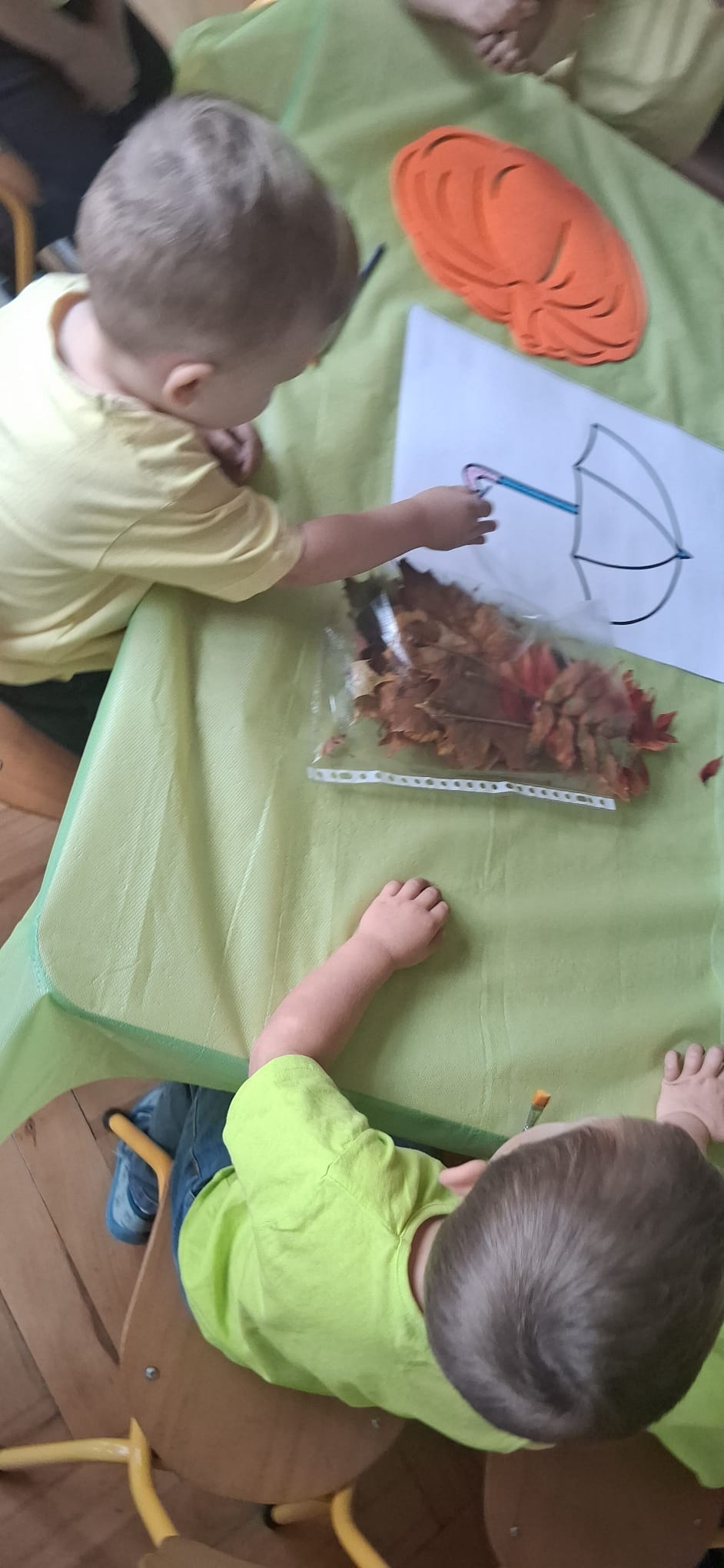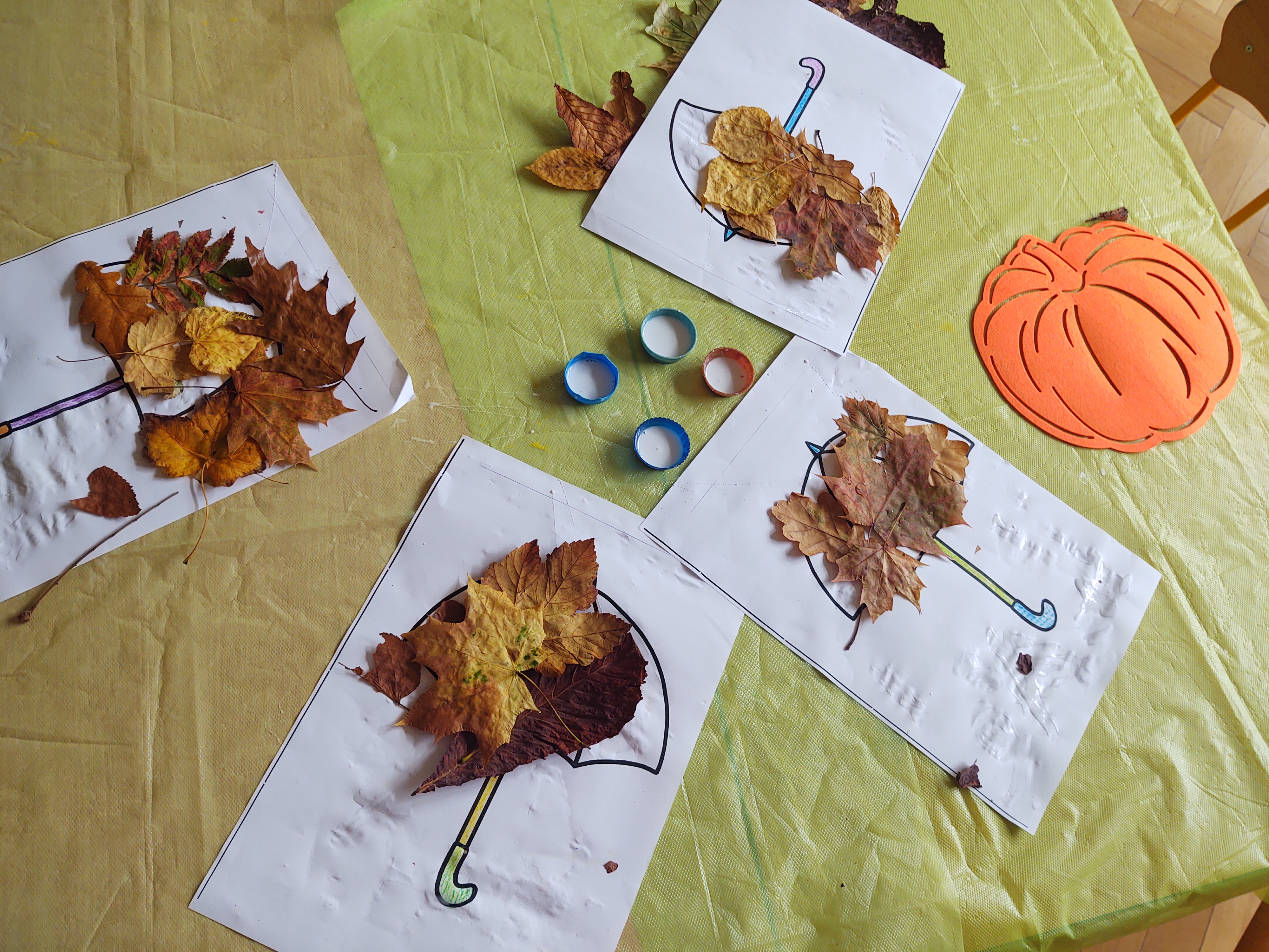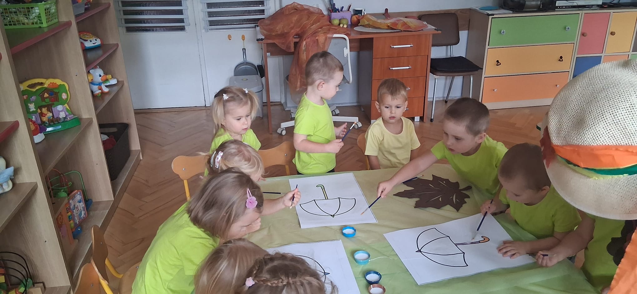 Dzieci w podziękowaniu za odwiedziny wykonały piękne jesienną prace- ozdobiły Parasol Pani Jesieni.