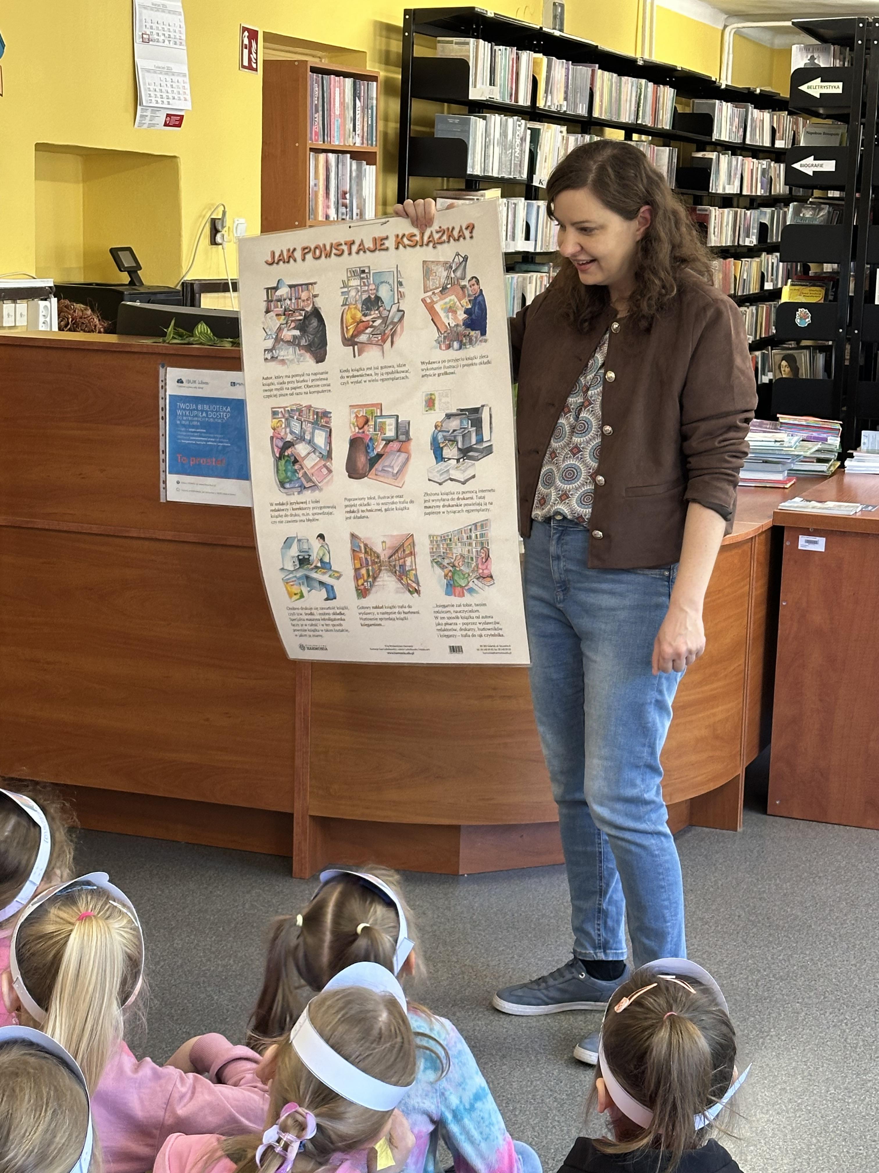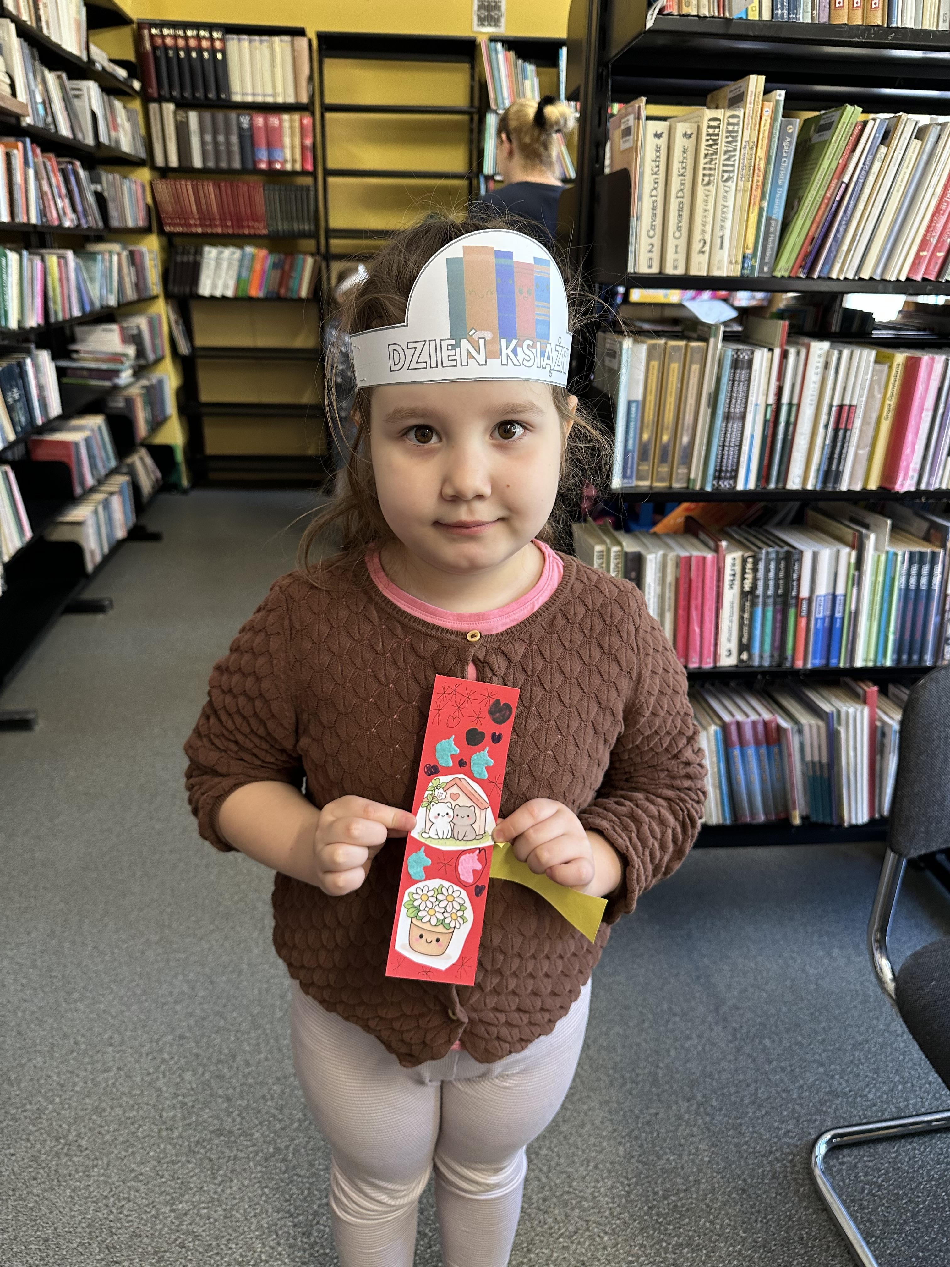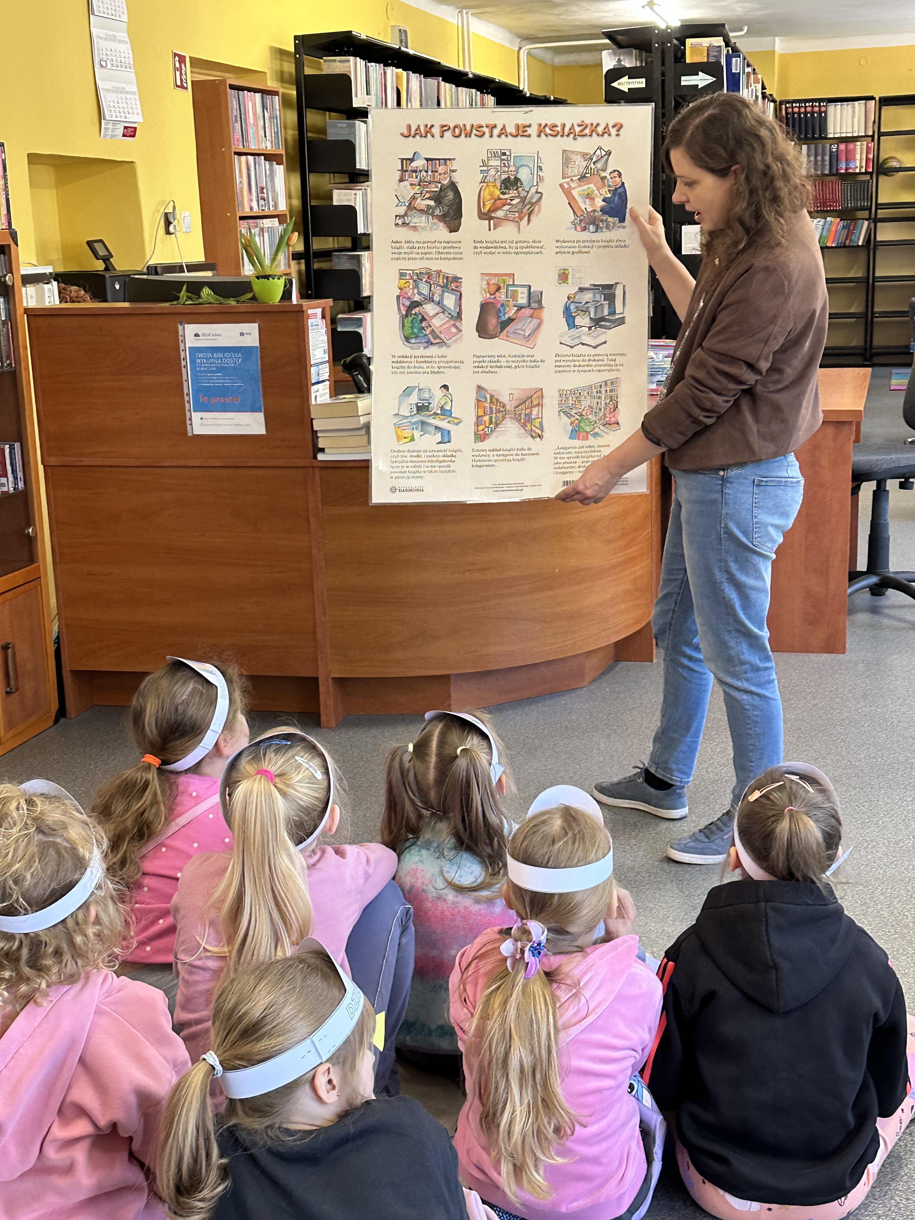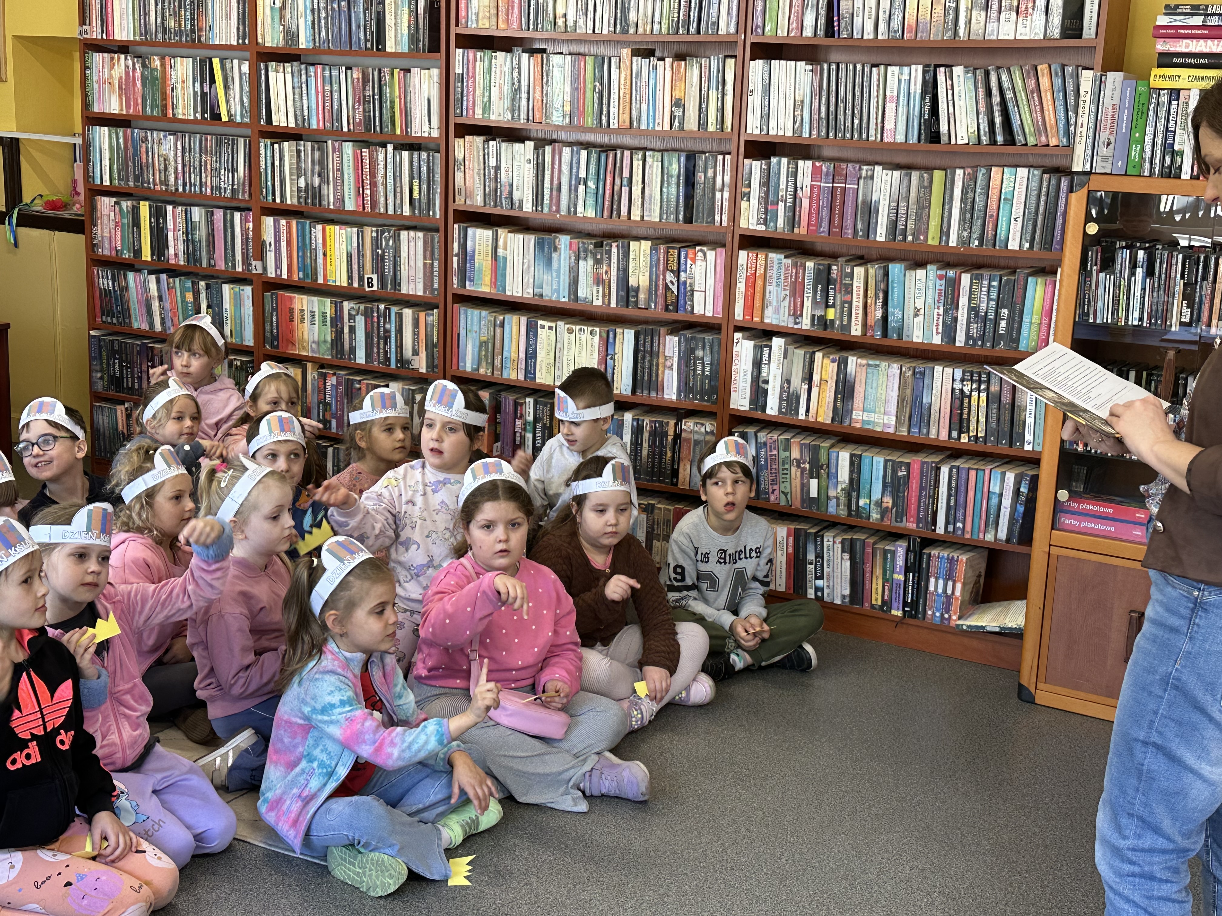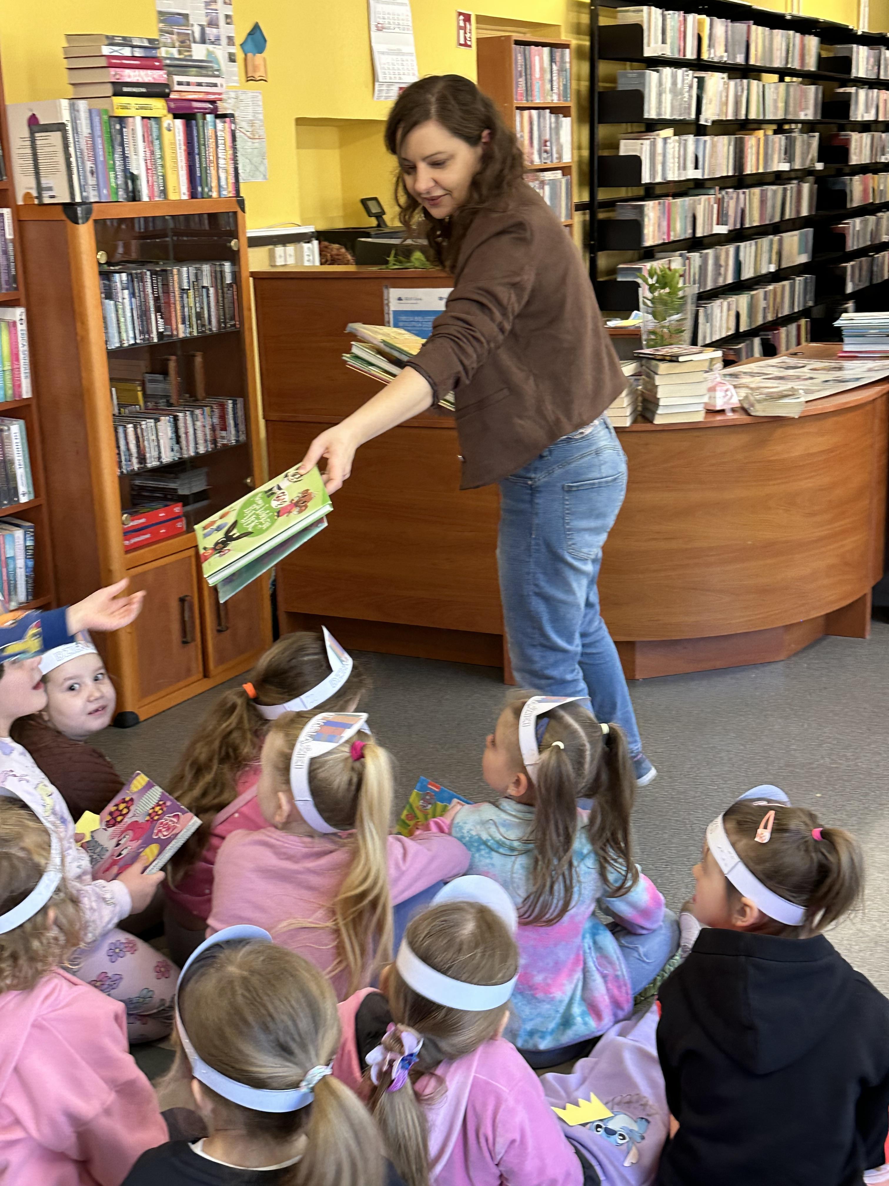 Na początku spotkania pani bibliotekarka oprowadziła dzieci po bibliotece, prezentując jej wygląd oraz rozmieszczenie poszczególnych działów. Dzieci dowiedziały się, jak można zostać czytelnikiem oraz jakie obowiązują zasady wypożyczania i dbania o książki. Szczególną uwagę zwrócono na odpowiednie zachowanie w bibliotece - ciszę, szacunek do książek oraz innych czytelników. Podczas spotkania dzieci utrwaliły sobie etapy powstawania książki - od pomysłu autora, poprzez ilustracje, aż po druk i trafienie książki na półkę biblioteczną. Była to bardzo ciekawa i pouczająca część zajęć. W dalszej części wizyty starszaki zaprezentowały przygotowany wcześniej wiersz, czym sprawiły pani bibliotekarce wiele radości. Następnie miały okazję samodzielnie oglądać książki, co wzbudziło duże zainteresowanie i zachęciło do sięgania po literaturę. Kolejnym punktem spotkania było wykonanie zakładek do książek. Dzieci wykazały się dużą kreatywnością i starannością podczas pracy plastycznej. Na zakończenie wizyty dzieci wręczyły pani bibliotekarce upominek – książeczkę wykonaną własnoręcznie. W podziękowaniu za aktywny udział i zaangażowanie każde dziecko otrzymało pamiątkowy dyplom.