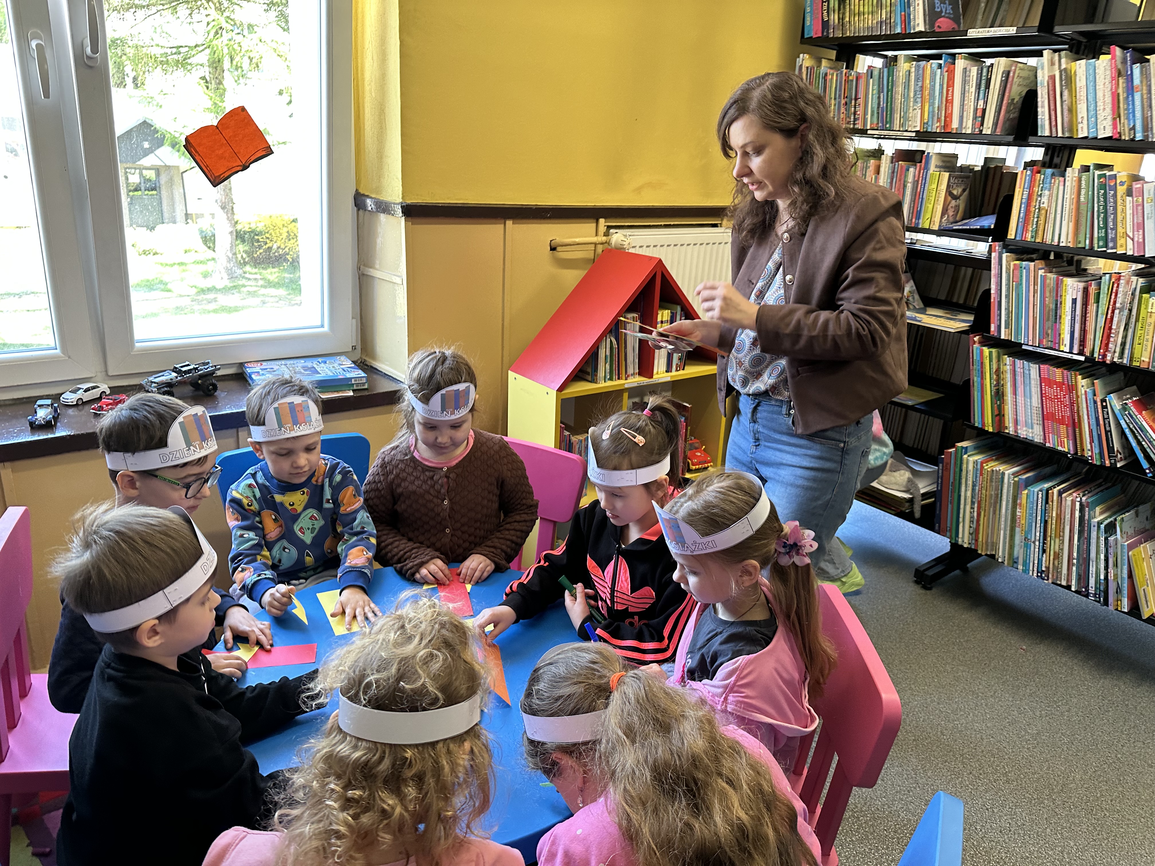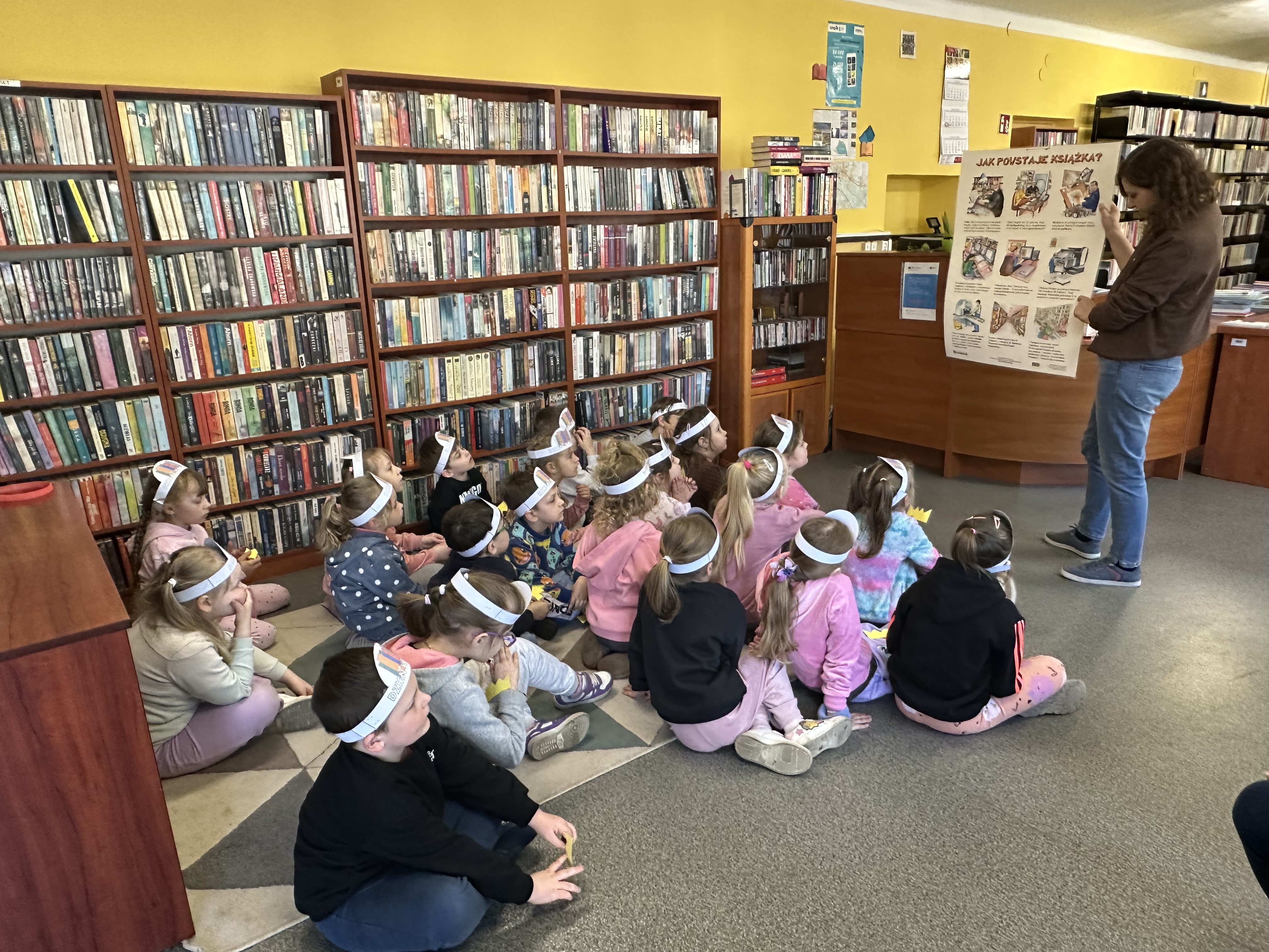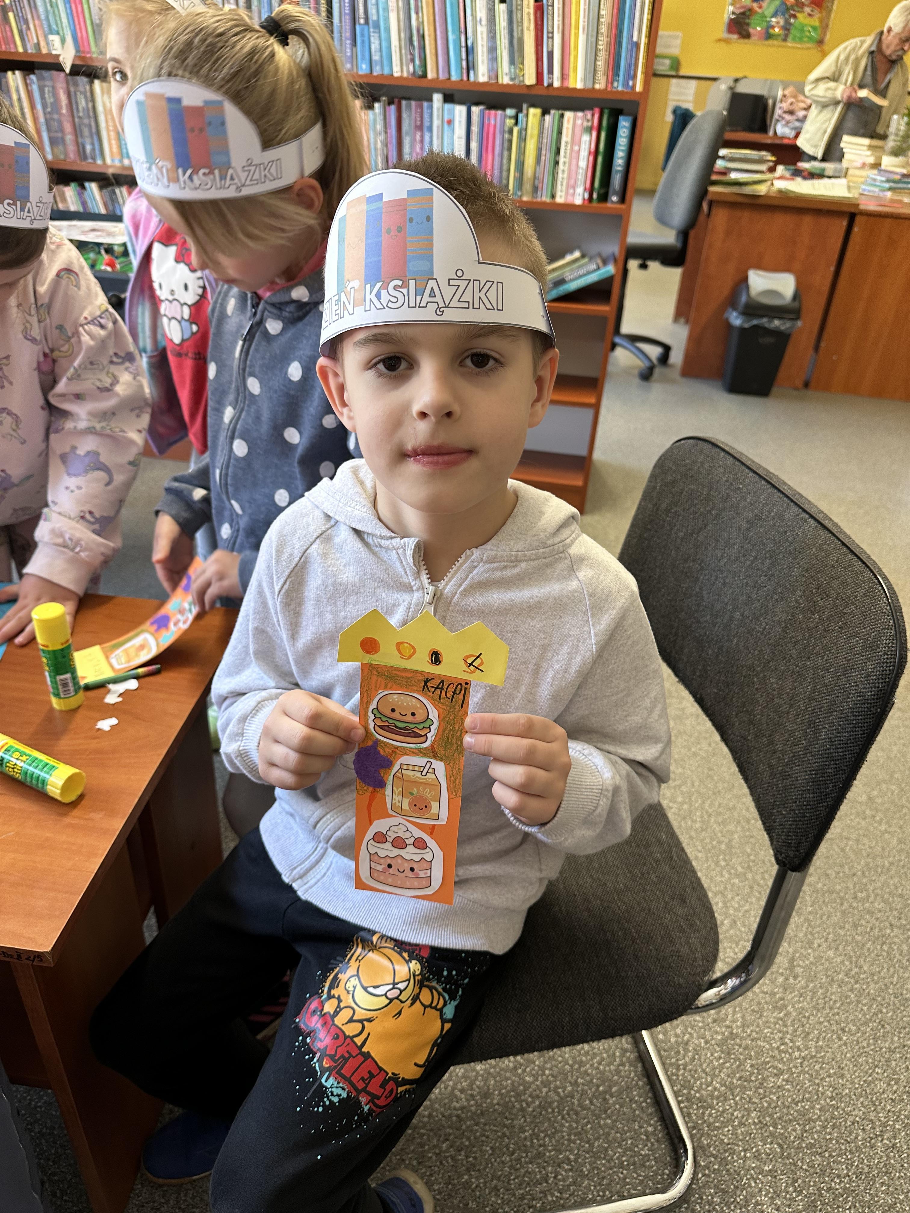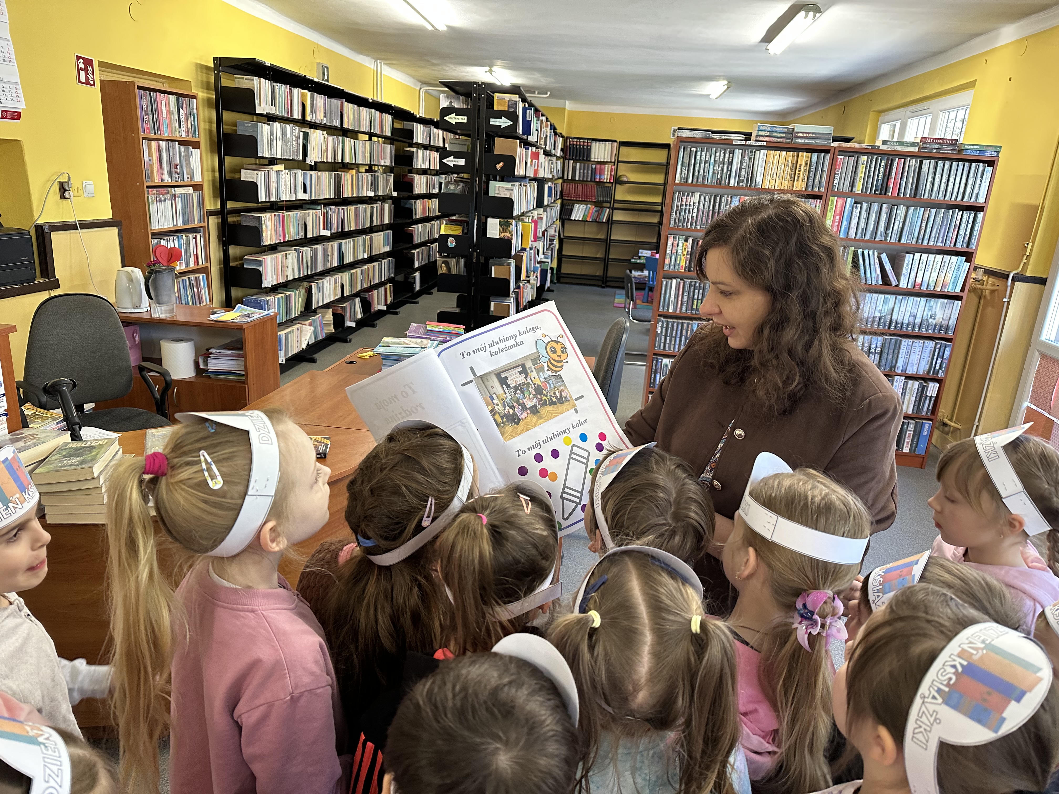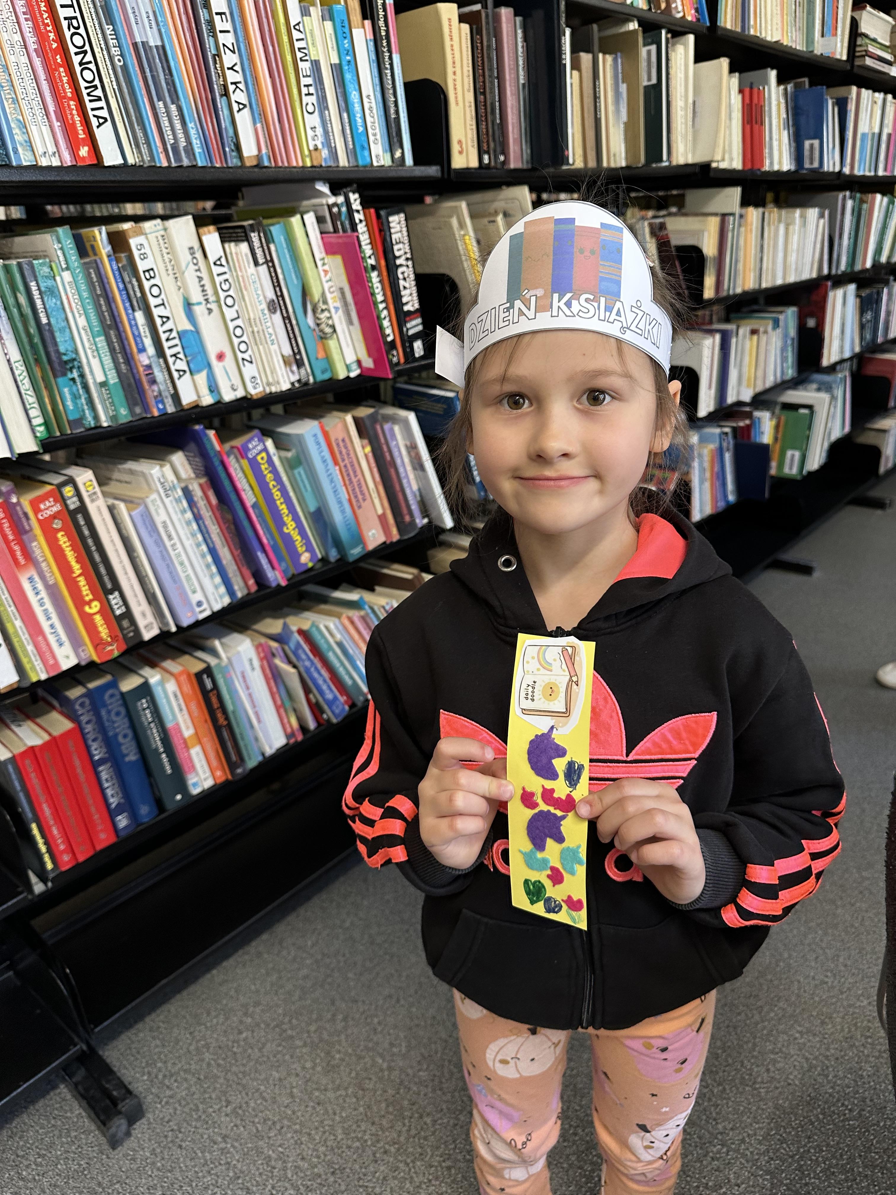 Na początku spotkania pani bibliotekarka oprowadziła dzieci po bibliotece, prezentując jej wygląd oraz rozmieszczenie poszczególnych działów. Dzieci dowiedziały się, jak można zostać czytelnikiem oraz jakie obowiązują zasady wypożyczania i dbania o książki. Szczególną uwagę zwrócono na odpowiednie zachowanie w bibliotece - ciszę, szacunek do książek oraz innych czytelników. Podczas spotkania dzieci utrwaliły sobie etapy powstawania książki - od pomysłu autora, poprzez ilustracje, aż po druk i trafienie książki na półkę biblioteczną. Była to bardzo ciekawa i pouczająca część zajęć. W dalszej części wizyty starszaki zaprezentowały przygotowany wcześniej wiersz, czym sprawiły pani bibliotekarce wiele radości. Następnie miały okazję samodzielnie oglądać książki, co wzbudziło duże zainteresowanie i zachęciło do sięgania po literaturę. Kolejnym punktem spotkania było wykonanie zakładek do książek. Dzieci wykazały się dużą kreatywnością i starannością podczas pracy plastycznej. Na zakończenie wizyty dzieci wręczyły pani bibliotekarce upominek – książeczkę wykonaną własnoręcznie. W podziękowaniu za aktywny udział i zaangażowanie każde dziecko otrzymało pamiątkowy dyplom.