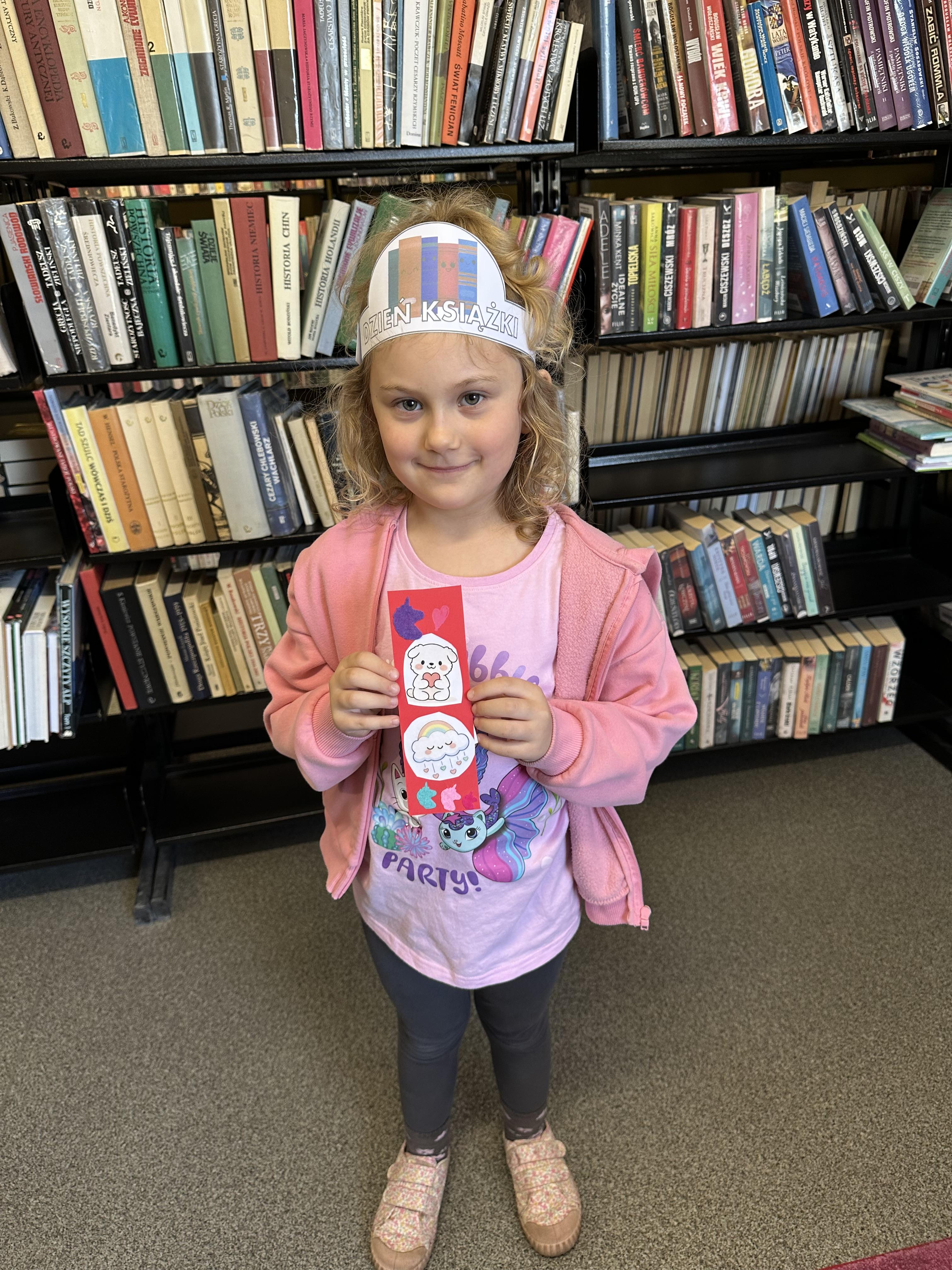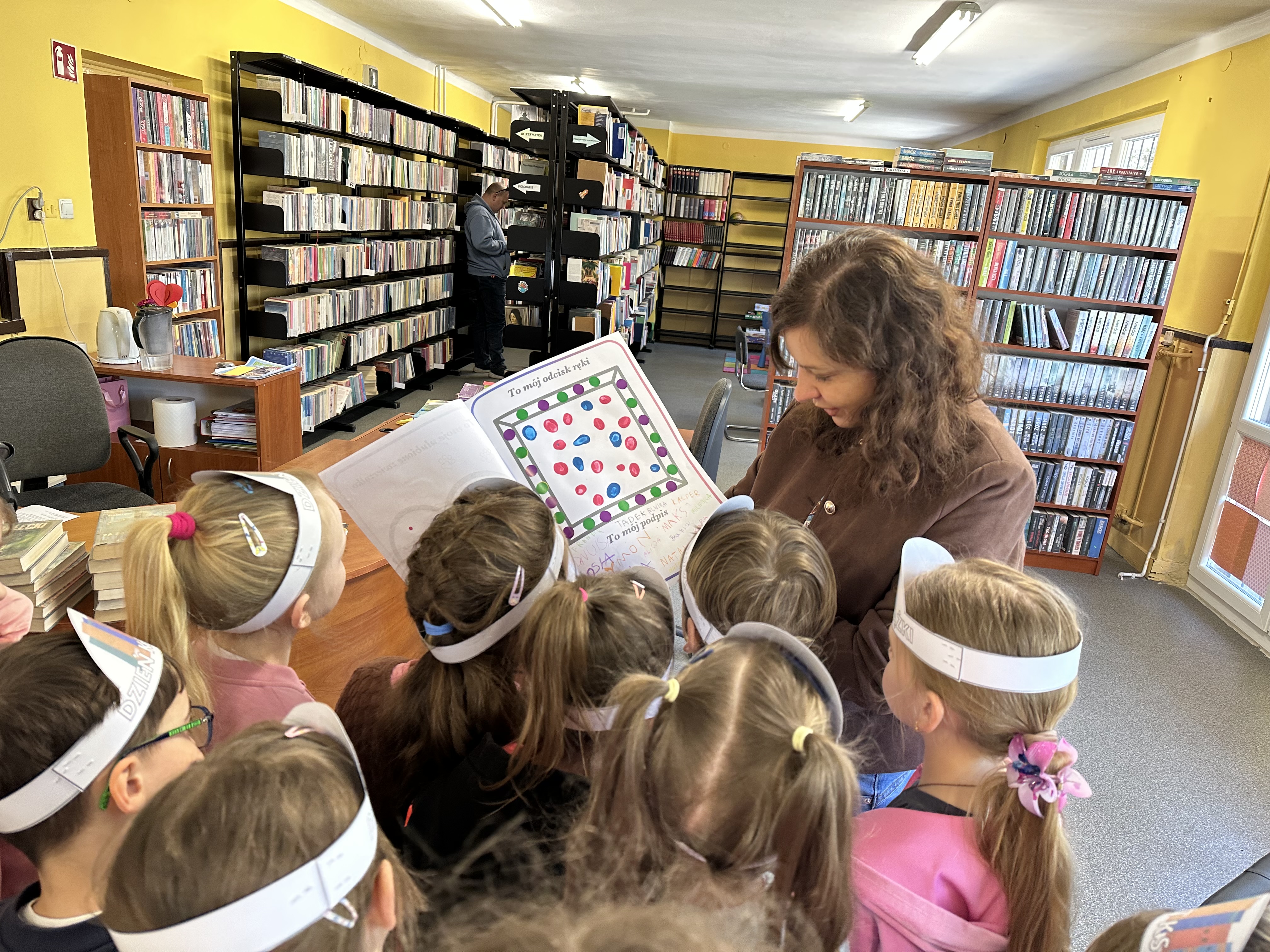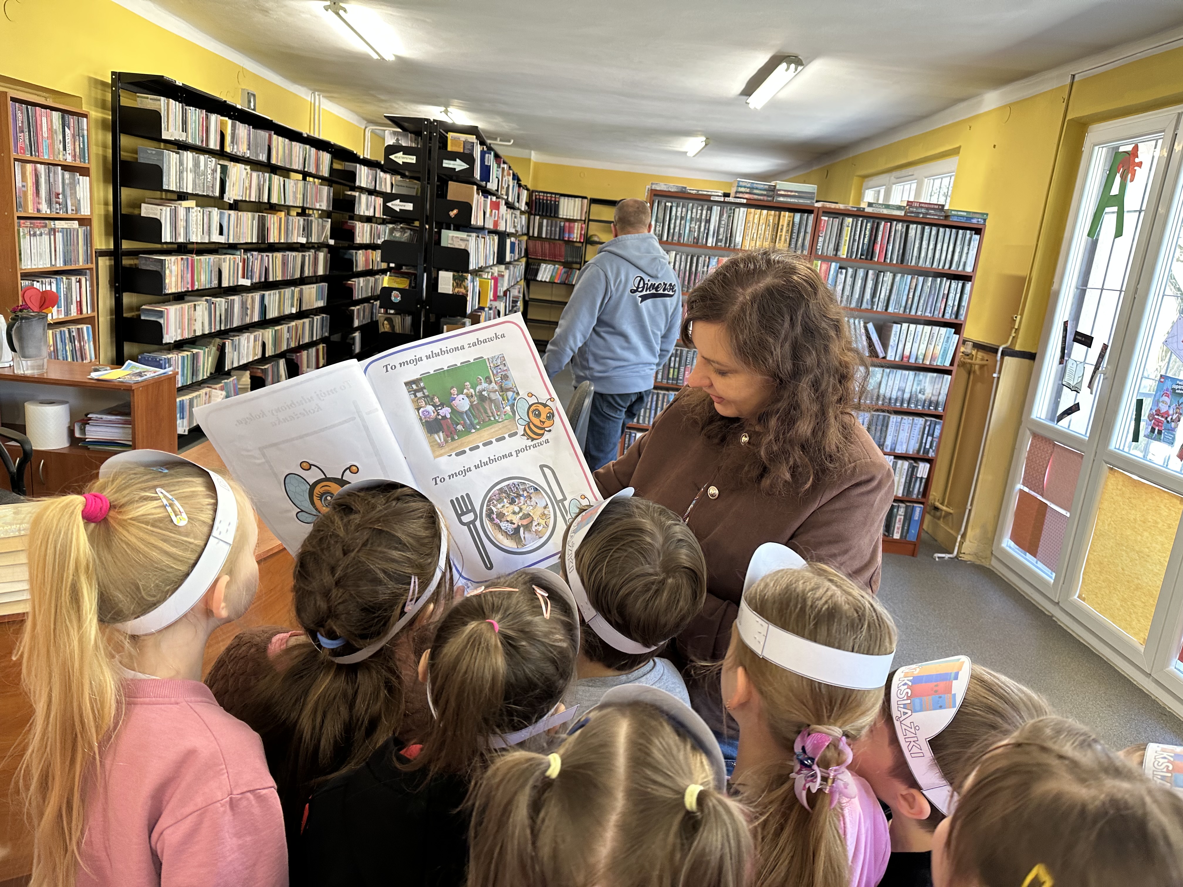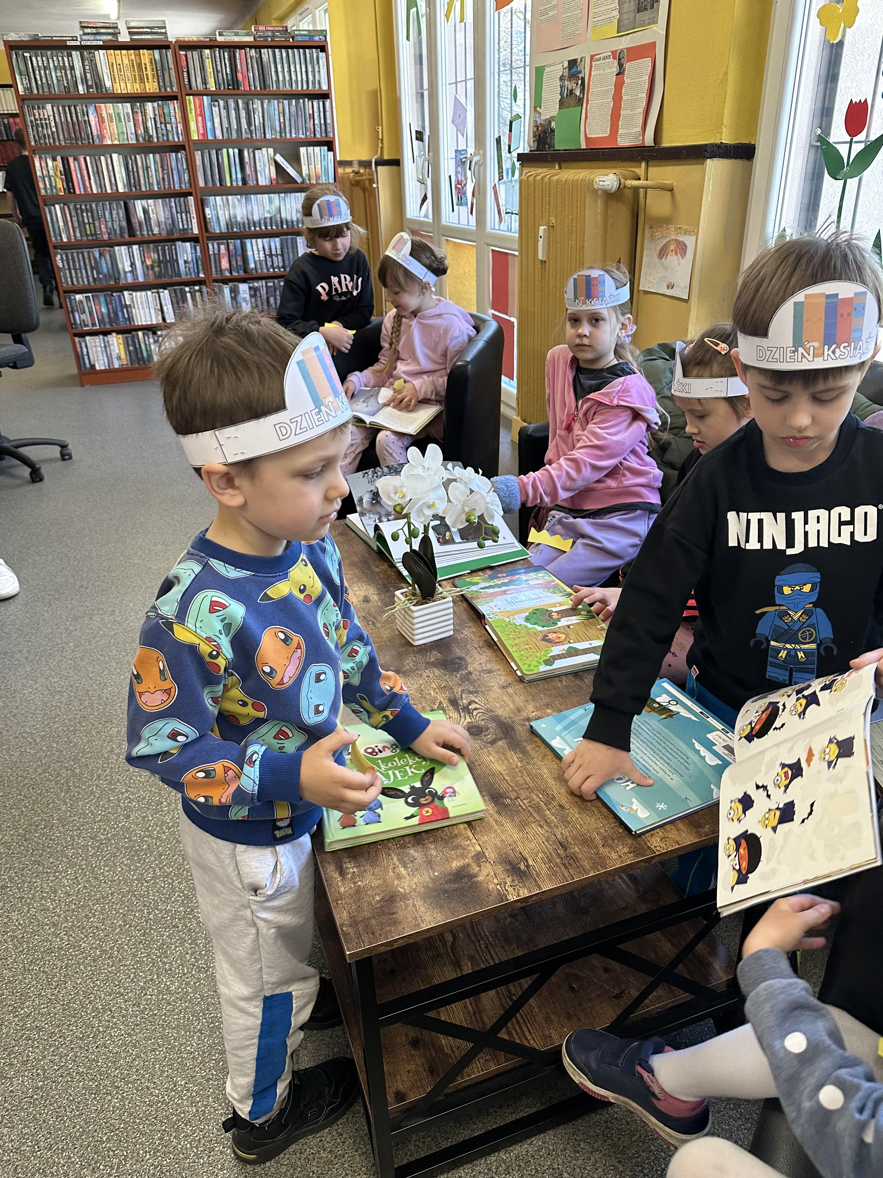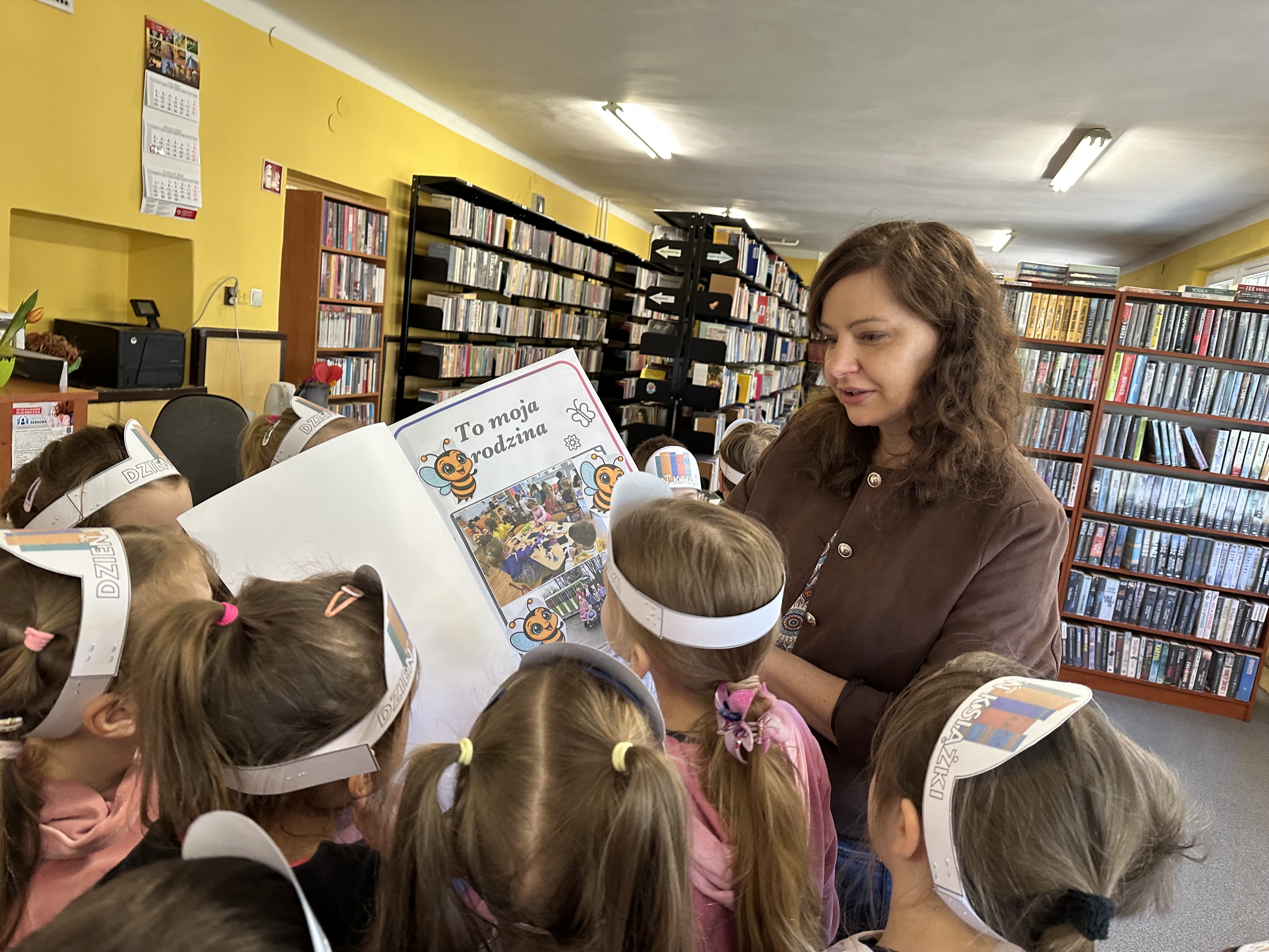 Na początku spotkania pani bibliotekarka oprowadziła dzieci po bibliotece, prezentując jej wygląd oraz rozmieszczenie poszczególnych działów. Dzieci dowiedziały się, jak można zostać czytelnikiem oraz jakie obowiązują zasady wypożyczania i dbania o książki. Szczególną uwagę zwrócono na odpowiednie zachowanie w bibliotece - ciszę, szacunek do książek oraz innych czytelników. Podczas spotkania dzieci utrwaliły sobie etapy powstawania książki - od pomysłu autora, poprzez ilustracje, aż po druk i trafienie książki na półkę biblioteczną. Była to bardzo ciekawa i pouczająca część zajęć. W dalszej części wizyty starszaki zaprezentowały przygotowany wcześniej wiersz, czym sprawiły pani bibliotekarce wiele radości. Następnie miały okazję samodzielnie oglądać książki, co wzbudziło duże zainteresowanie i zachęciło do sięgania po literaturę. Kolejnym punktem spotkania było wykonanie zakładek do książek. Dzieci wykazały się dużą kreatywnością i starannością podczas pracy plastycznej. Na zakończenie wizyty dzieci wręczyły pani bibliotekarce upominek – książeczkę wykonaną własnoręcznie. W podziękowaniu za aktywny udział i zaangażowanie każde dziecko otrzymało pamiątkowy dyplom.