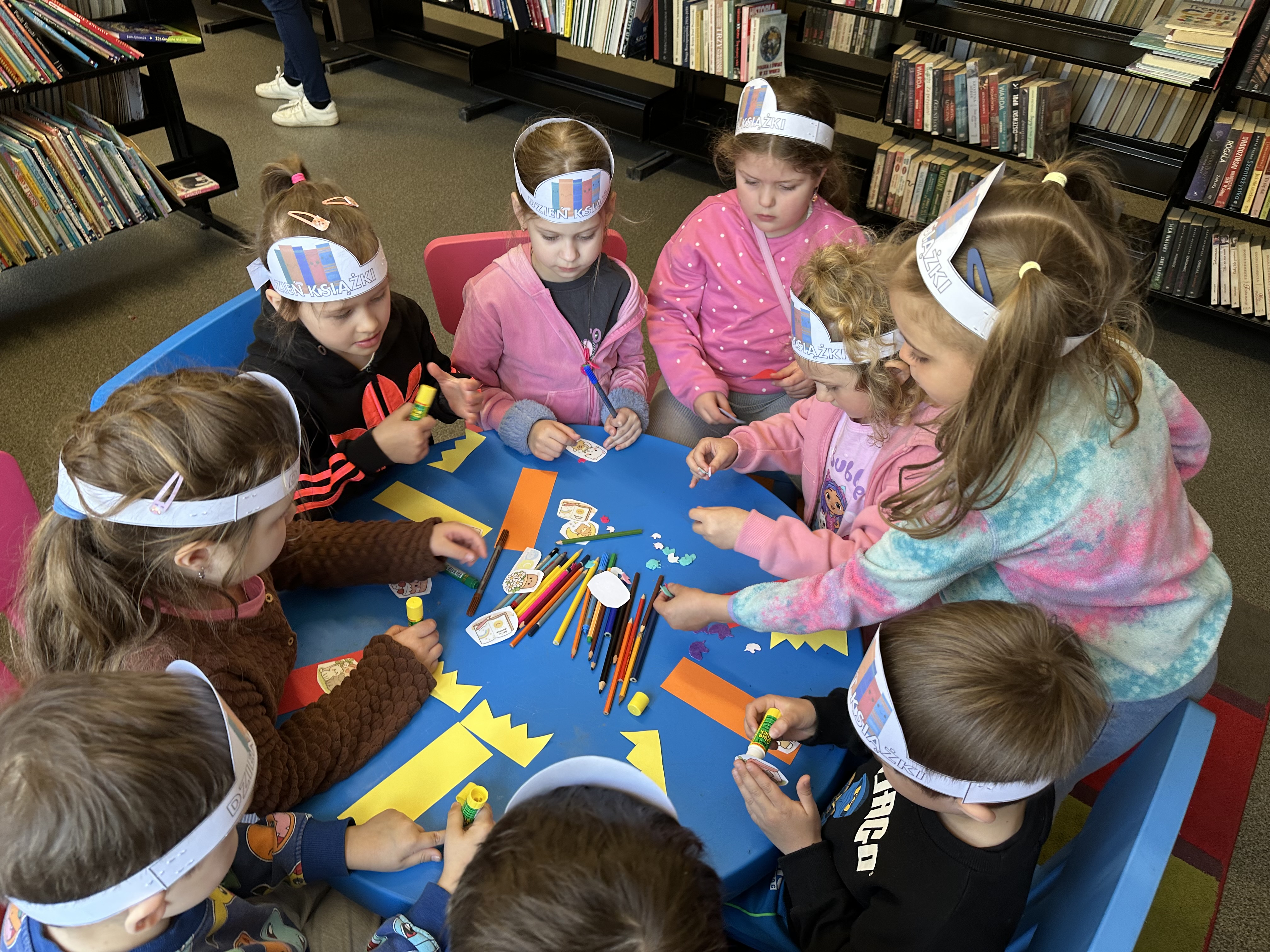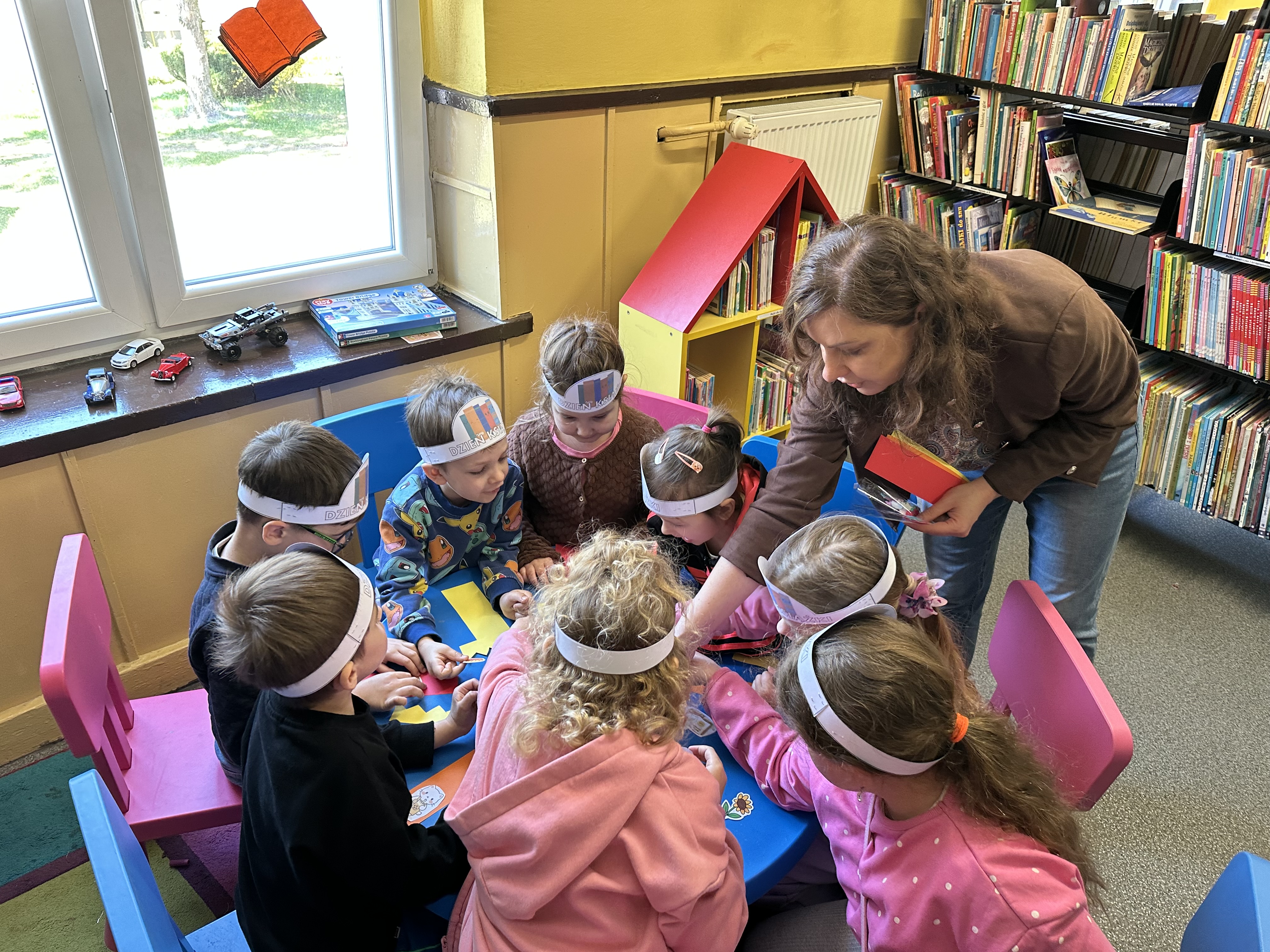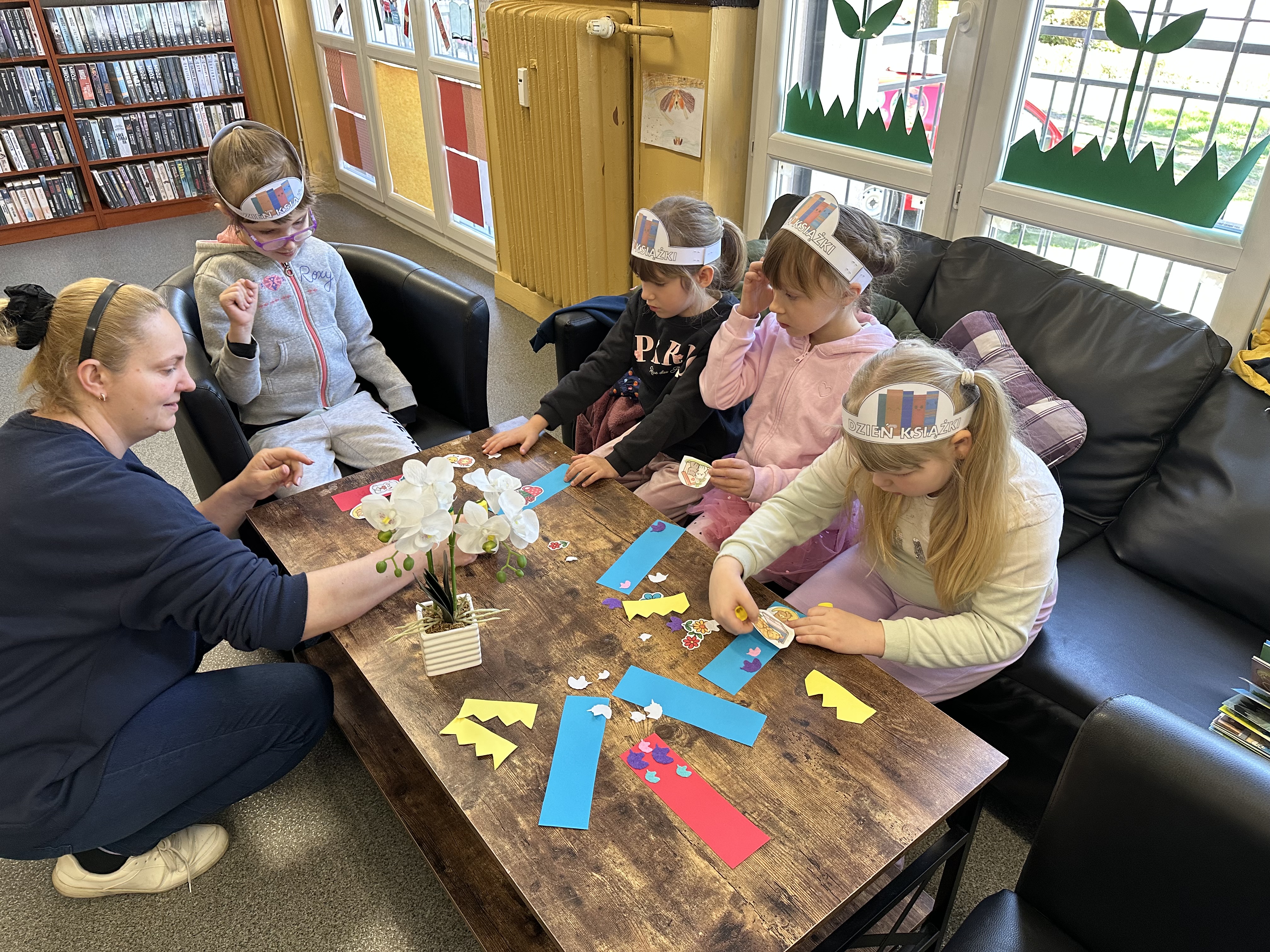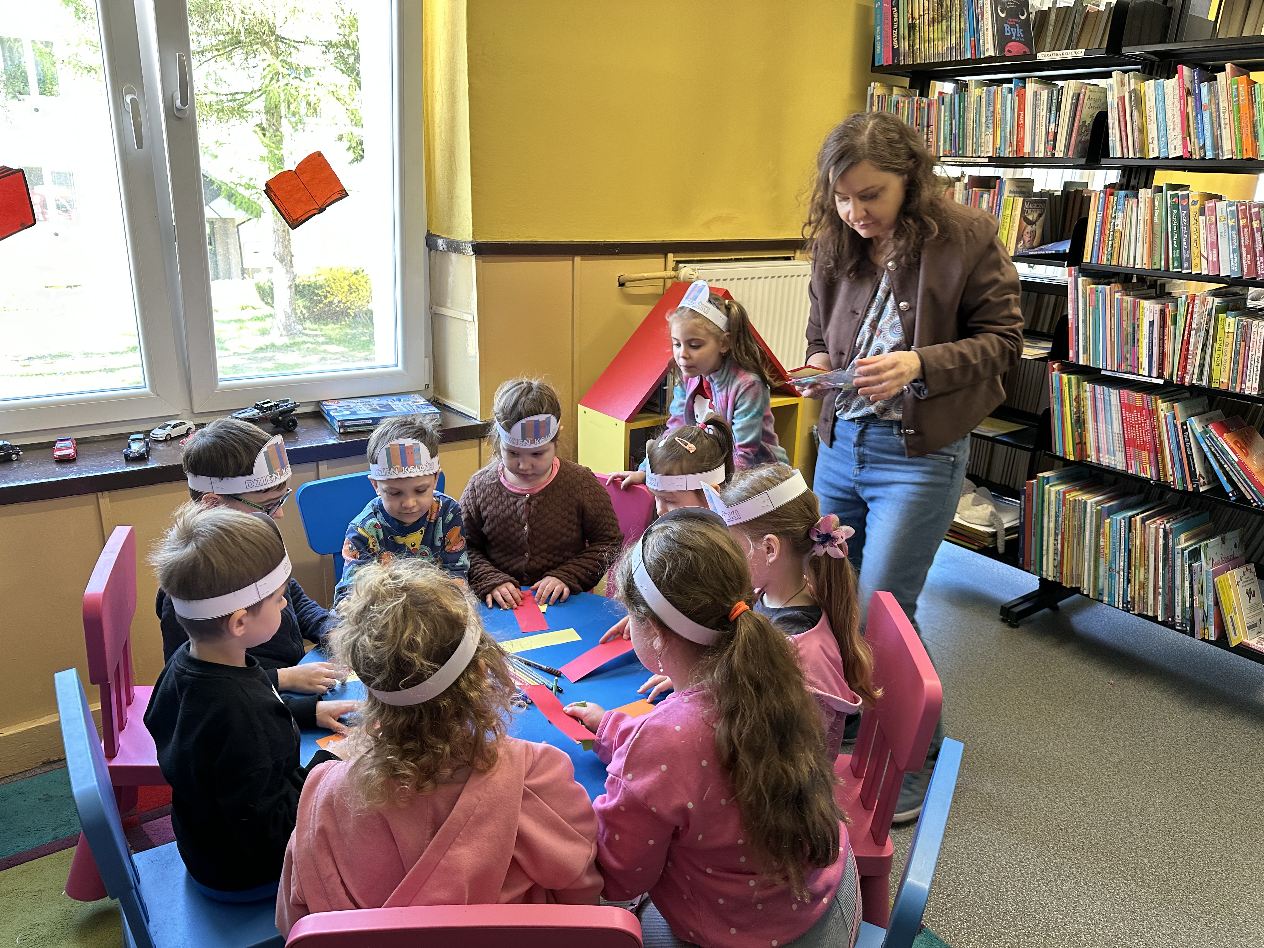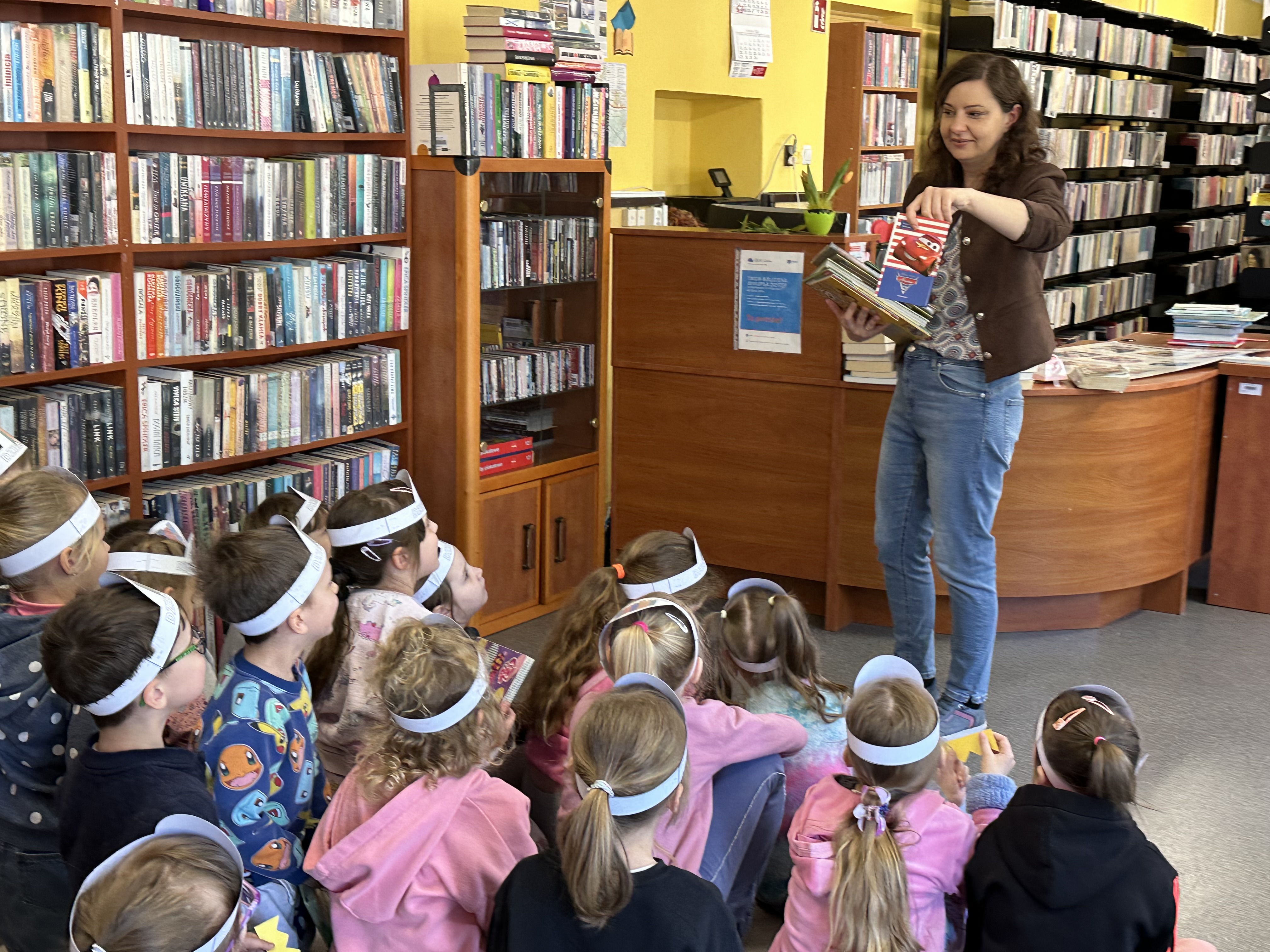 Na początku spotkania pani bibliotekarka oprowadziła dzieci po bibliotece, prezentując jej wygląd oraz rozmieszczenie poszczególnych działów. Dzieci dowiedziały się, jak można zostać czytelnikiem oraz jakie obowiązują zasady wypożyczania i dbania o książki. Szczególną uwagę zwrócono na odpowiednie zachowanie w bibliotece - ciszę, szacunek do książek oraz innych czytelników. Podczas spotkania dzieci utrwaliły sobie etapy powstawania książki - od pomysłu autora, poprzez ilustracje, aż po druk i trafienie książki na półkę biblioteczną. Była to bardzo ciekawa i pouczająca część zajęć. W dalszej części wizyty starszaki zaprezentowały przygotowany wcześniej wiersz, czym sprawiły pani bibliotekarce wiele radości. Następnie miały okazję samodzielnie oglądać książki, co wzbudziło duże zainteresowanie i zachęciło do sięgania po literaturę. Kolejnym punktem spotkania było wykonanie zakładek do książek. Dzieci wykazały się dużą kreatywnością i starannością podczas pracy plastycznej. Na zakończenie wizyty dzieci wręczyły pani bibliotekarce upominek – książeczkę wykonaną własnoręcznie. W podziękowaniu za aktywny udział i zaangażowanie każde dziecko otrzymało pamiątkowy dyplom.