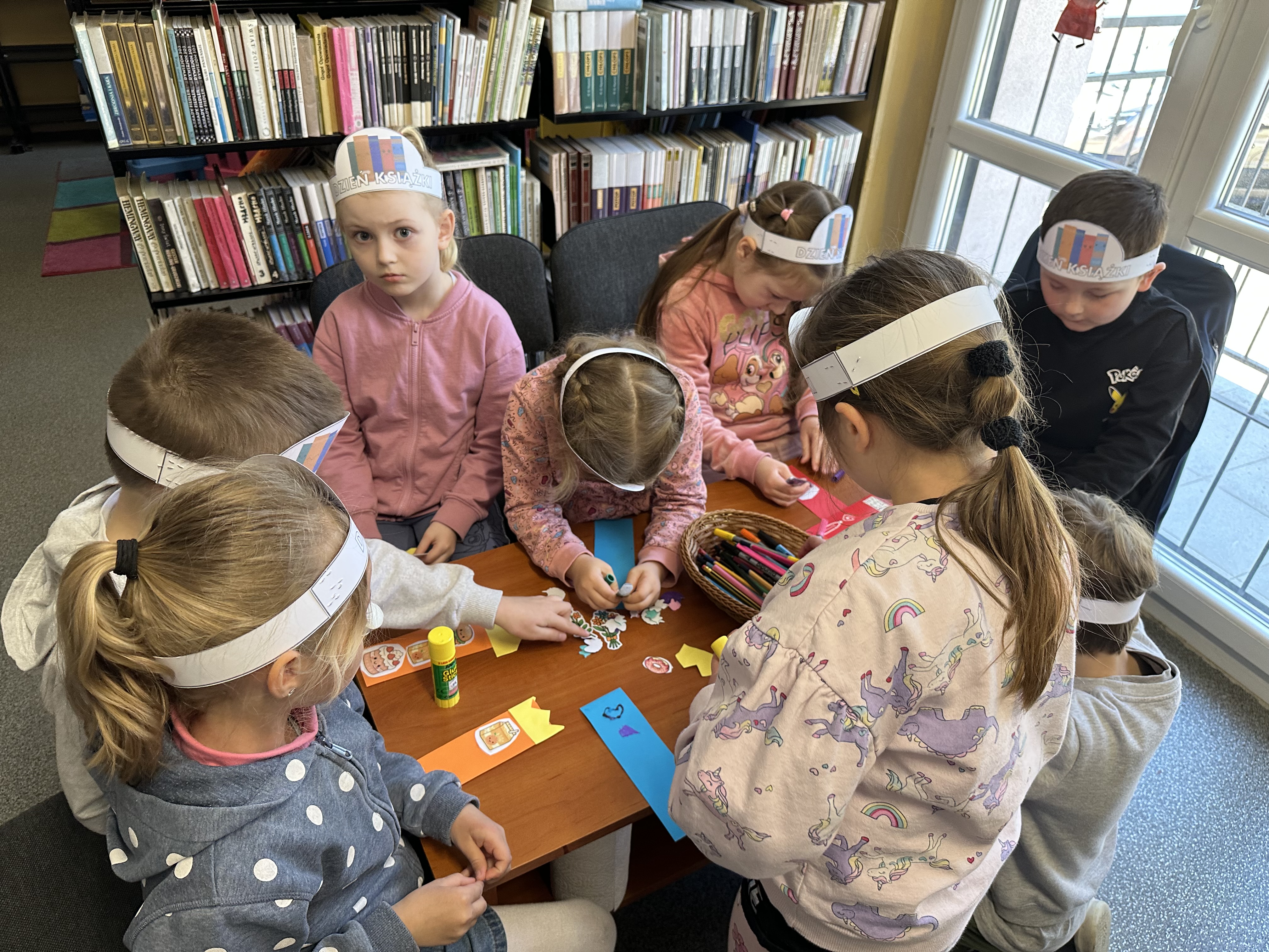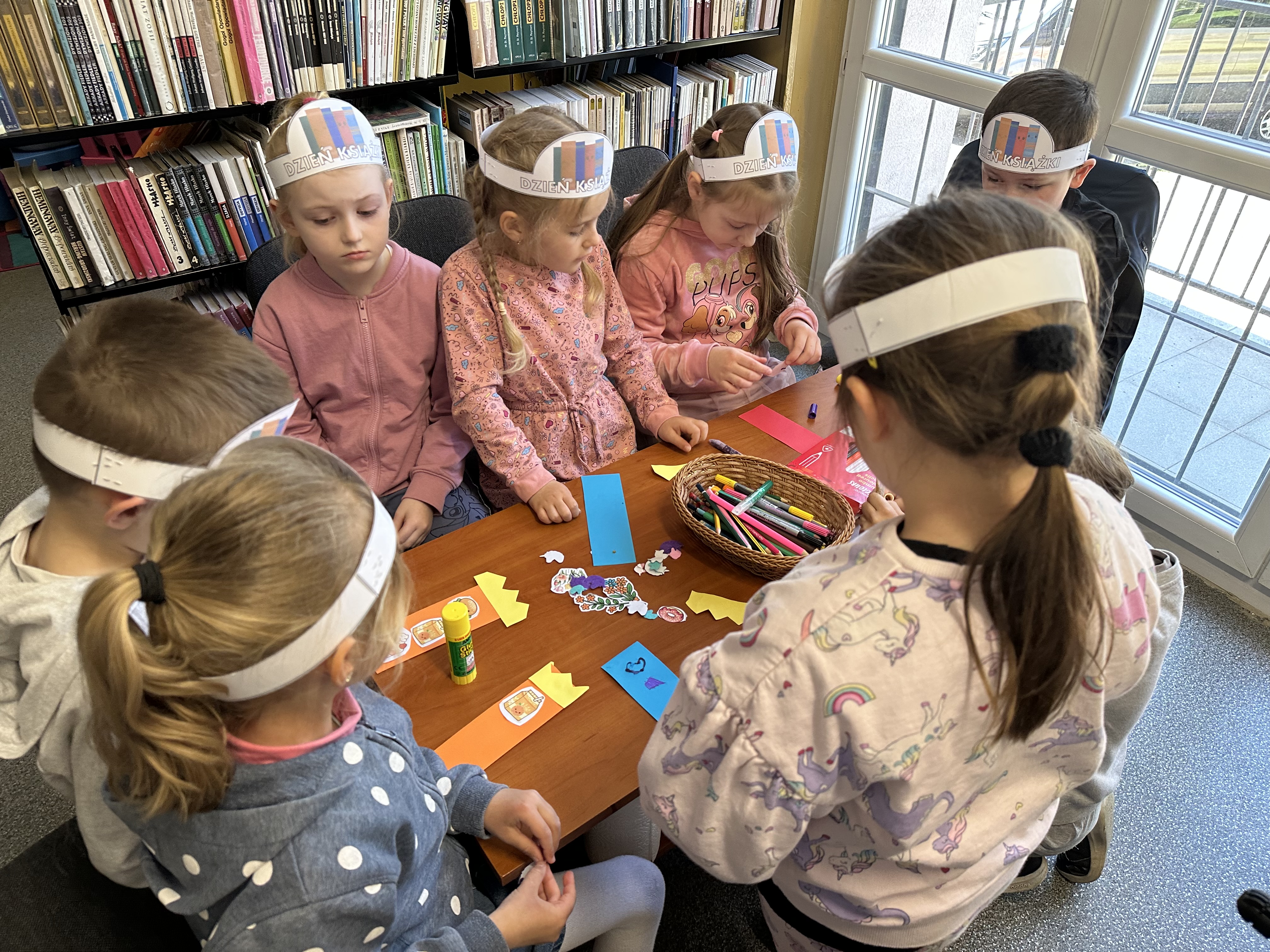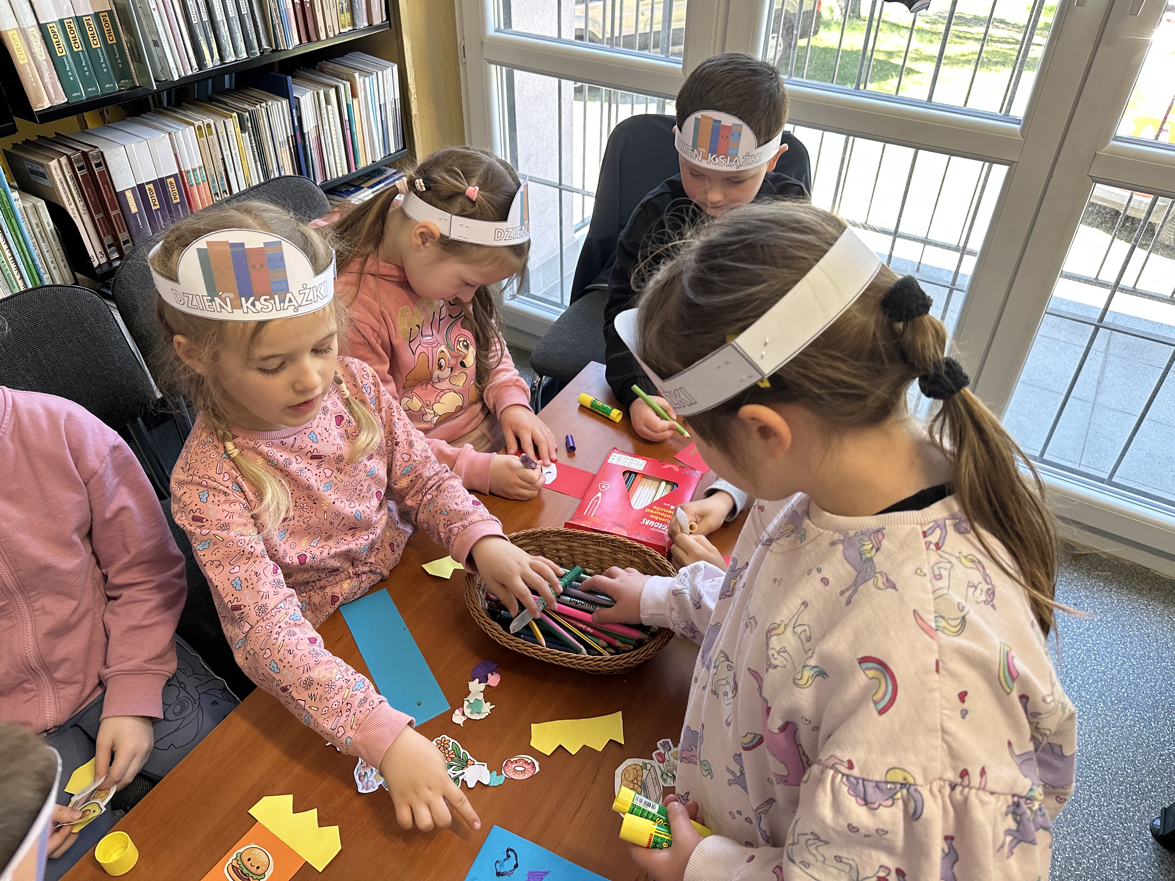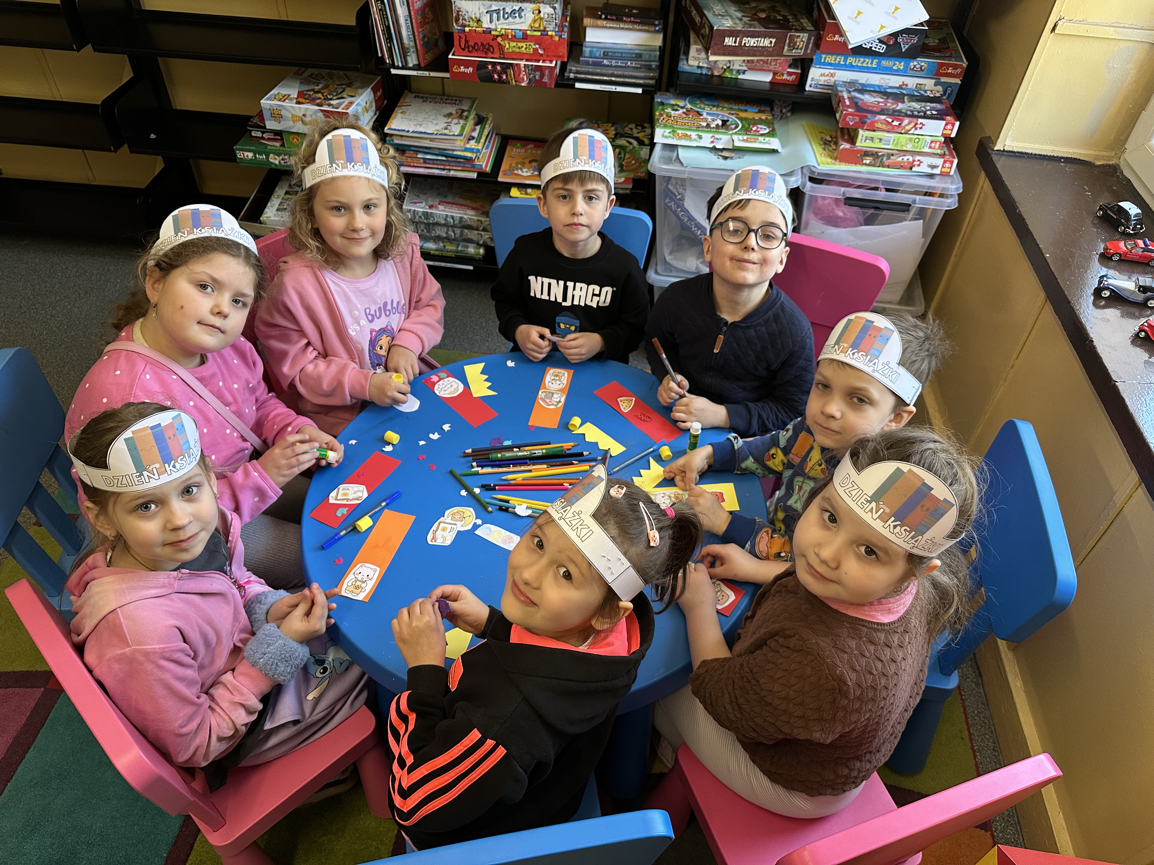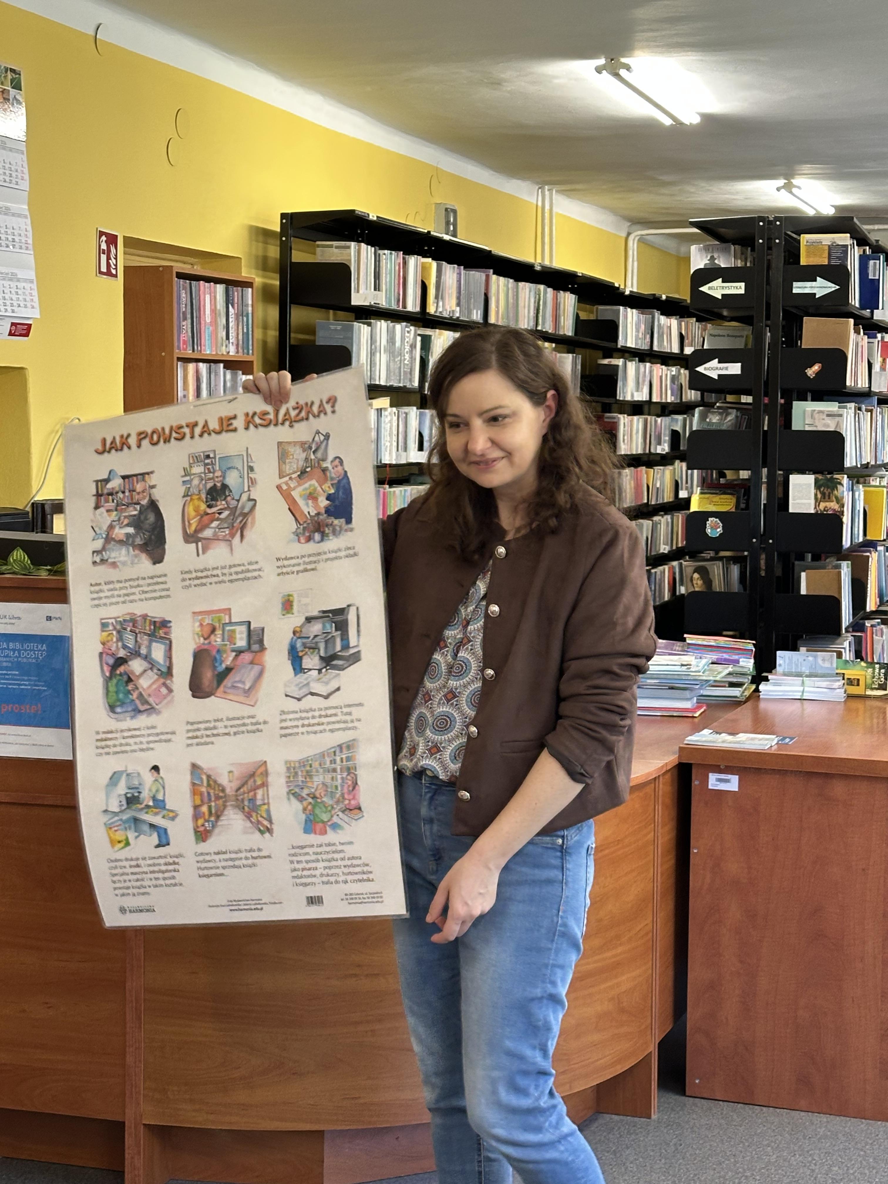 Na początku spotkania pani bibliotekarka oprowadziła dzieci po bibliotece, prezentując jej wygląd oraz rozmieszczenie poszczególnych działów. Dzieci dowiedziały się, jak można zostać czytelnikiem oraz jakie obowiązują zasady wypożyczania i dbania o książki. Szczególną uwagę zwrócono na odpowiednie zachowanie w bibliotece - ciszę, szacunek do książek oraz innych czytelników. Podczas spotkania dzieci utrwaliły sobie etapy powstawania książki - od pomysłu autora, poprzez ilustracje, aż po druk i trafienie książki na półkę biblioteczną. Była to bardzo ciekawa i pouczająca część zajęć. W dalszej części wizyty starszaki zaprezentowały przygotowany wcześniej wiersz, czym sprawiły pani bibliotekarce wiele radości. Następnie miały okazję samodzielnie oglądać książki, co wzbudziło duże zainteresowanie i zachęciło do sięgania po literaturę. Kolejnym punktem spotkania było wykonanie zakładek do książek. Dzieci wykazały się dużą kreatywnością i starannością podczas pracy plastycznej. Na zakończenie wizyty dzieci wręczyły pani bibliotekarce upominek – książeczkę wykonaną własnoręcznie. W podziękowaniu za aktywny udział i zaangażowanie każde dziecko otrzymało pamiątkowy dyplom.