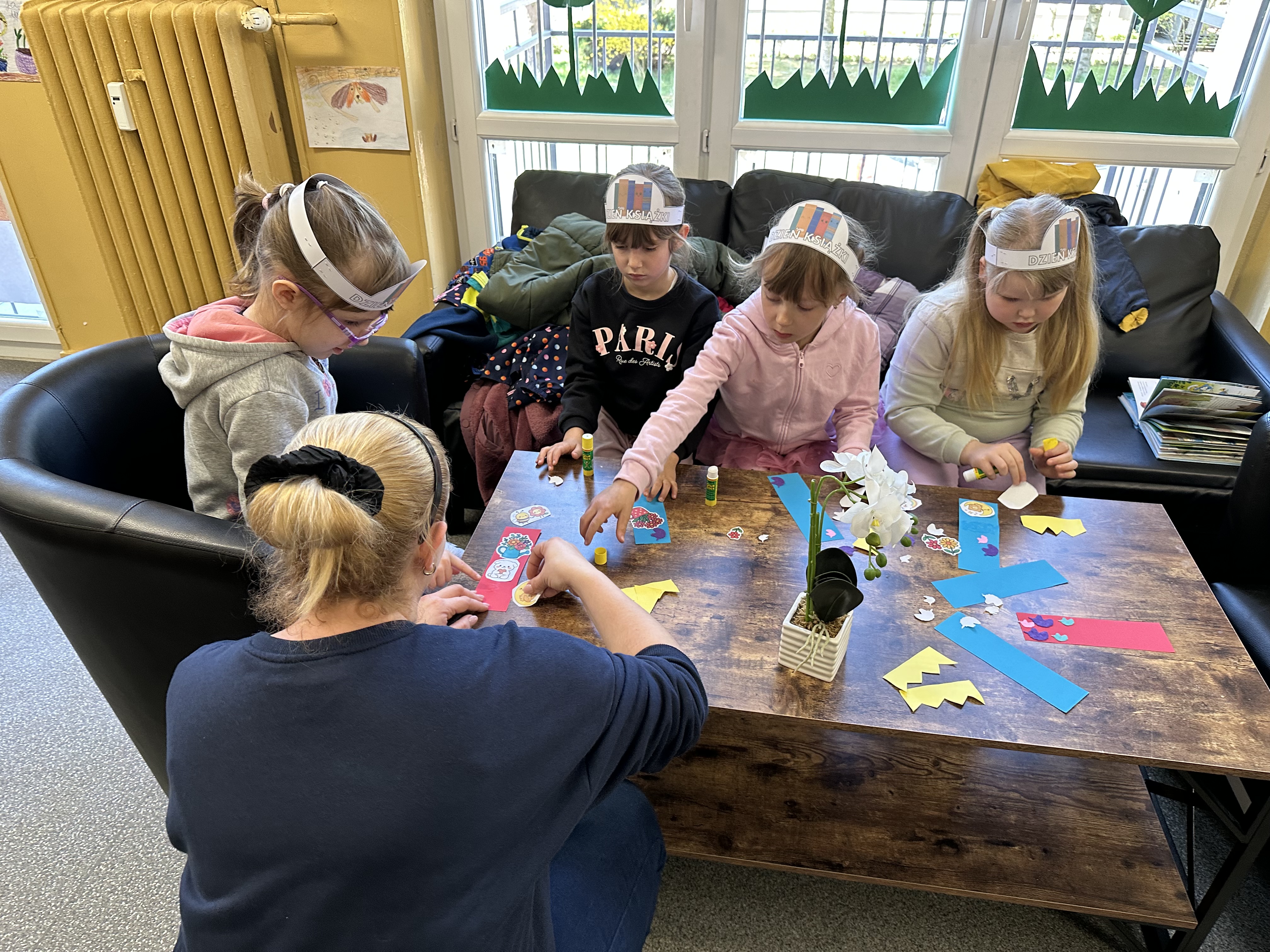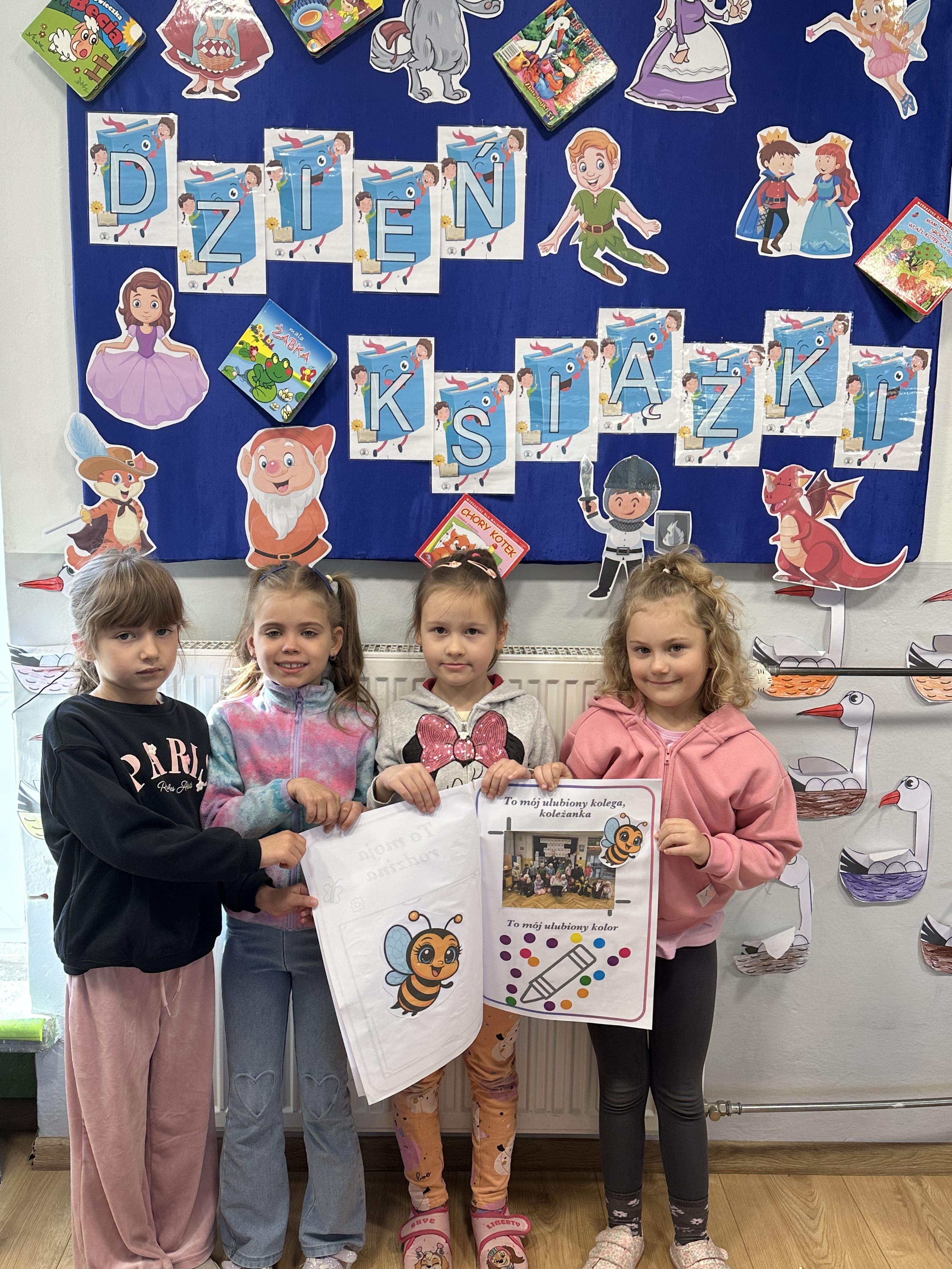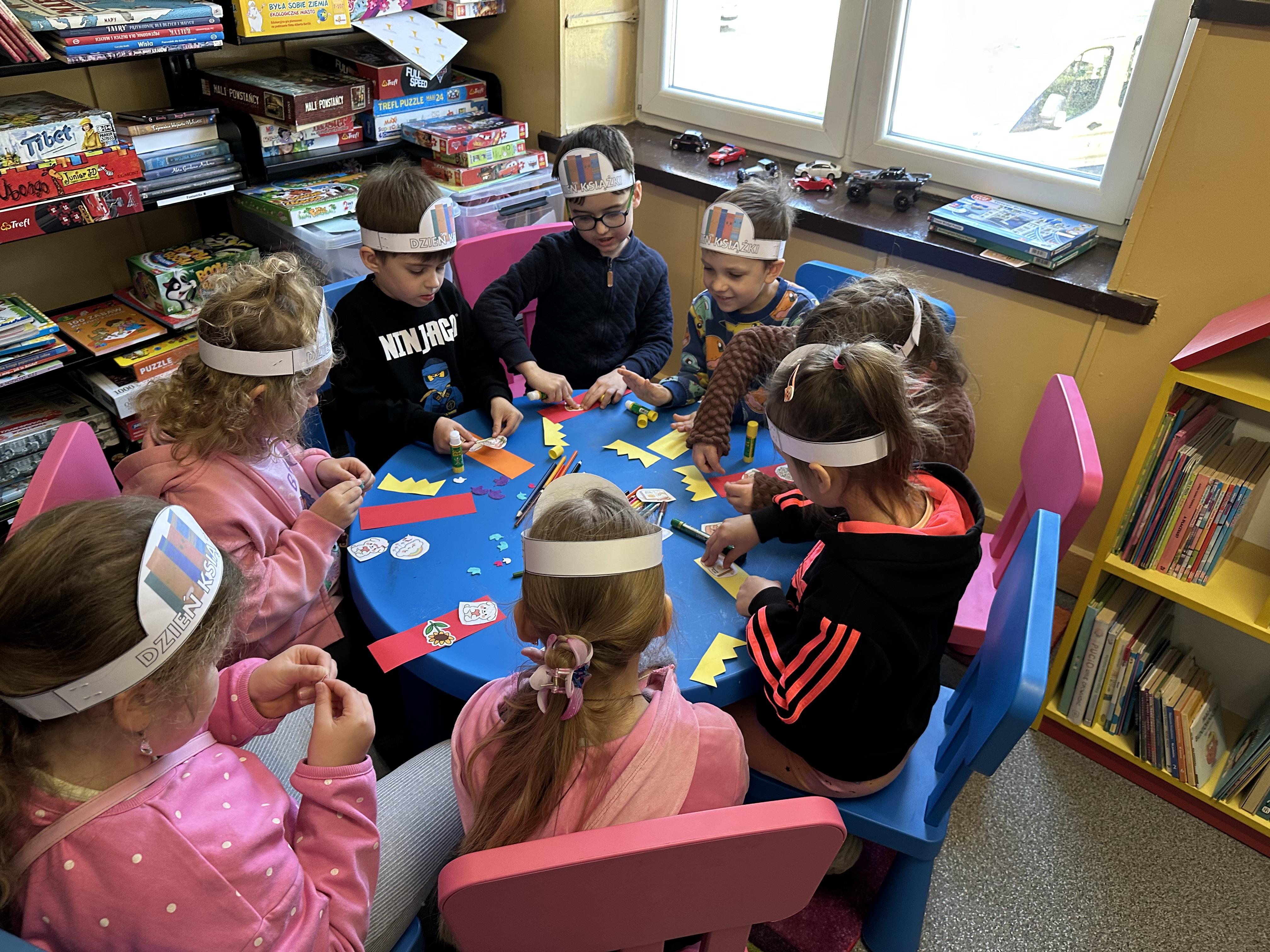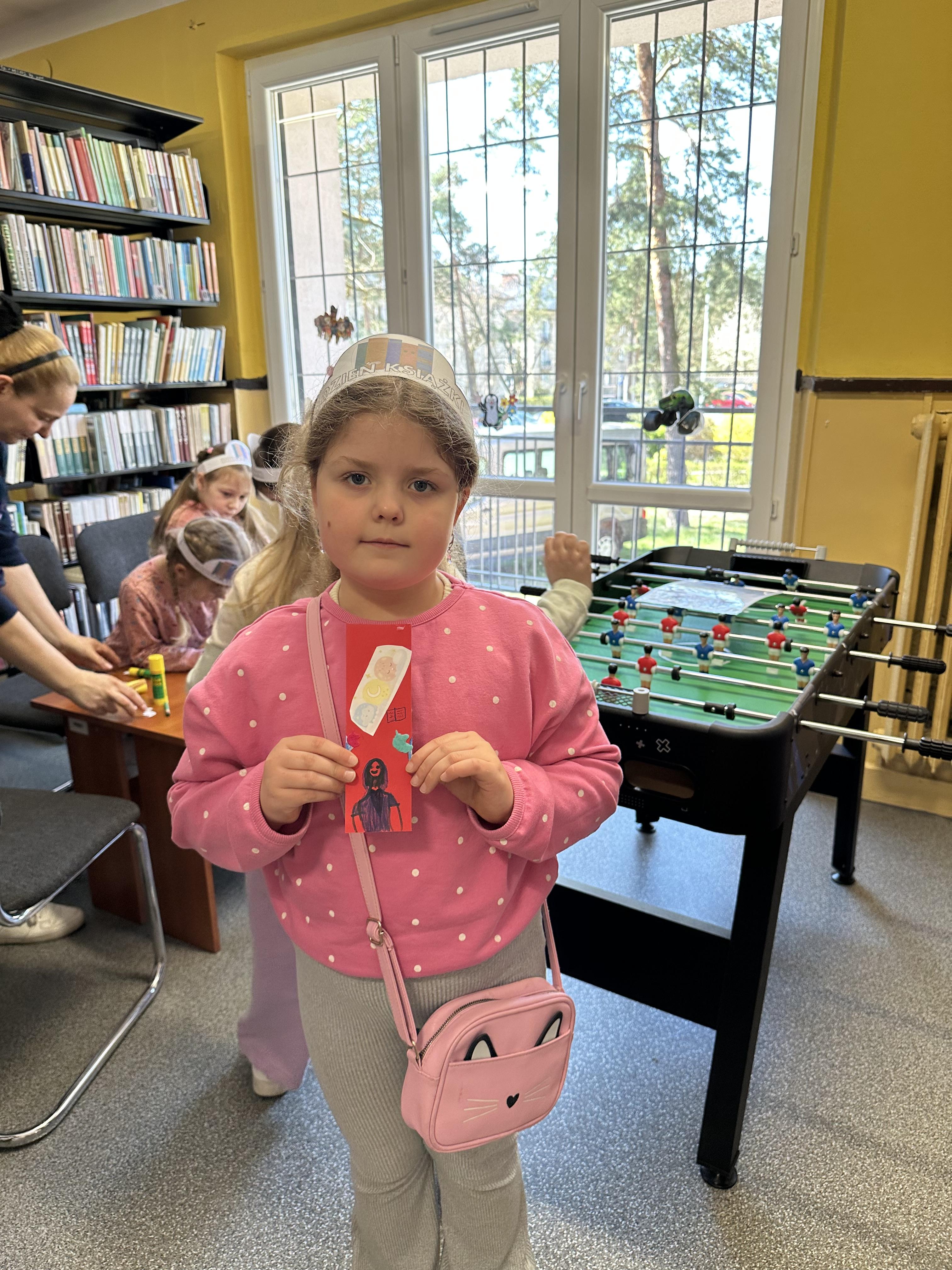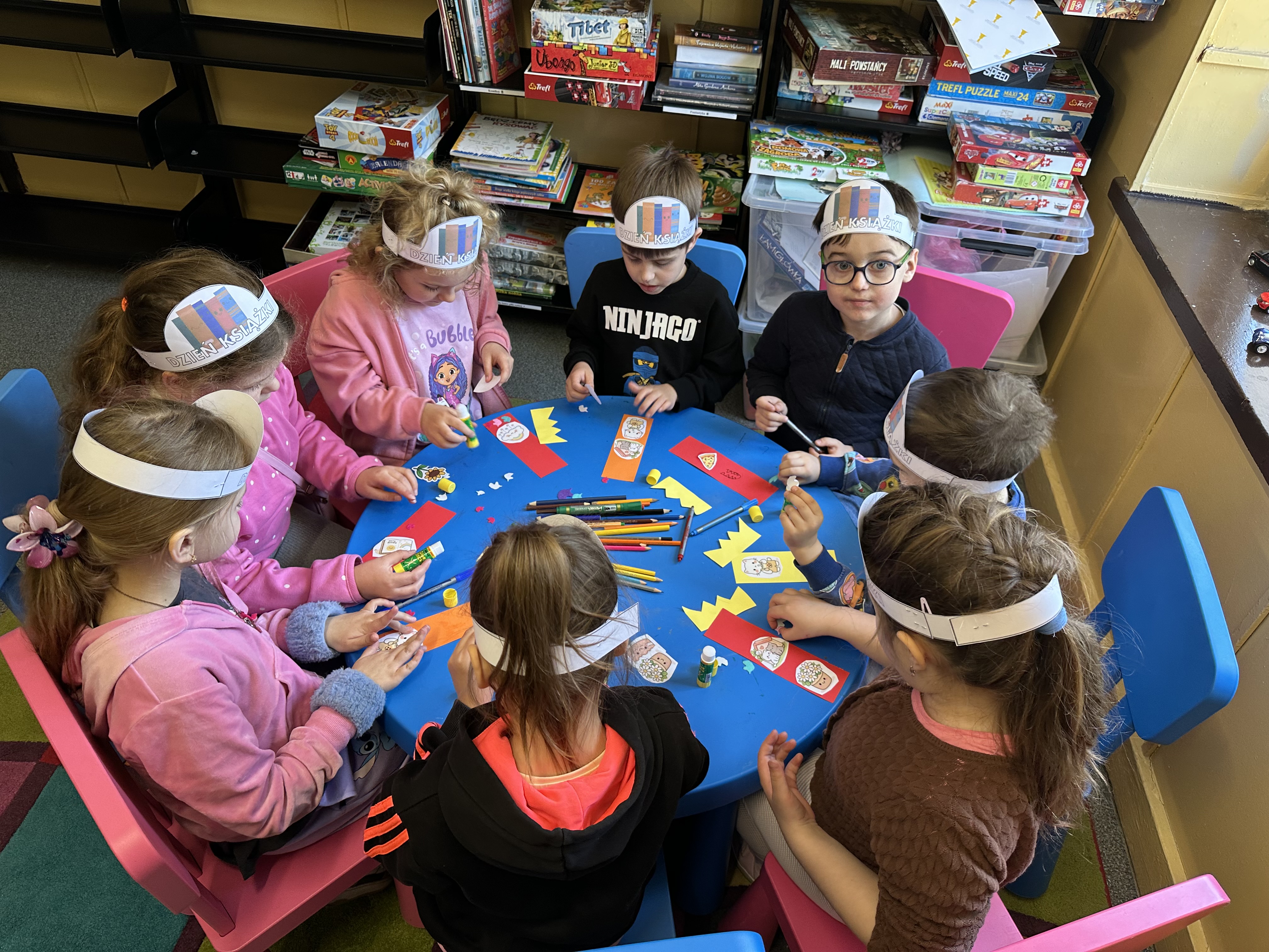 Na początku spotkania pani bibliotekarka oprowadziła dzieci po bibliotece, prezentując jej wygląd oraz rozmieszczenie poszczególnych działów. Dzieci dowiedziały się, jak można zostać czytelnikiem oraz jakie obowiązują zasady wypożyczania i dbania o książki. Szczególną uwagę zwrócono na odpowiednie zachowanie w bibliotece - ciszę, szacunek do książek oraz innych czytelników. Podczas spotkania dzieci utrwaliły sobie etapy powstawania książki - od pomysłu autora, poprzez ilustracje, aż po druk i trafienie książki na półkę biblioteczną. Była to bardzo ciekawa i pouczająca część zajęć. W dalszej części wizyty starszaki zaprezentowały przygotowany wcześniej wiersz, czym sprawiły pani bibliotekarce wiele radości. Następnie miały okazję samodzielnie oglądać książki, co wzbudziło duże zainteresowanie i zachęciło do sięgania po literaturę. Kolejnym punktem spotkania było wykonanie zakładek do książek. Dzieci wykazały się dużą kreatywnością i starannością podczas pracy plastycznej. Na zakończenie wizyty dzieci wręczyły pani bibliotekarce upominek – książeczkę wykonaną własnoręcznie. W podziękowaniu za aktywny udział i zaangażowanie każde dziecko otrzymało pamiątkowy dyplom.