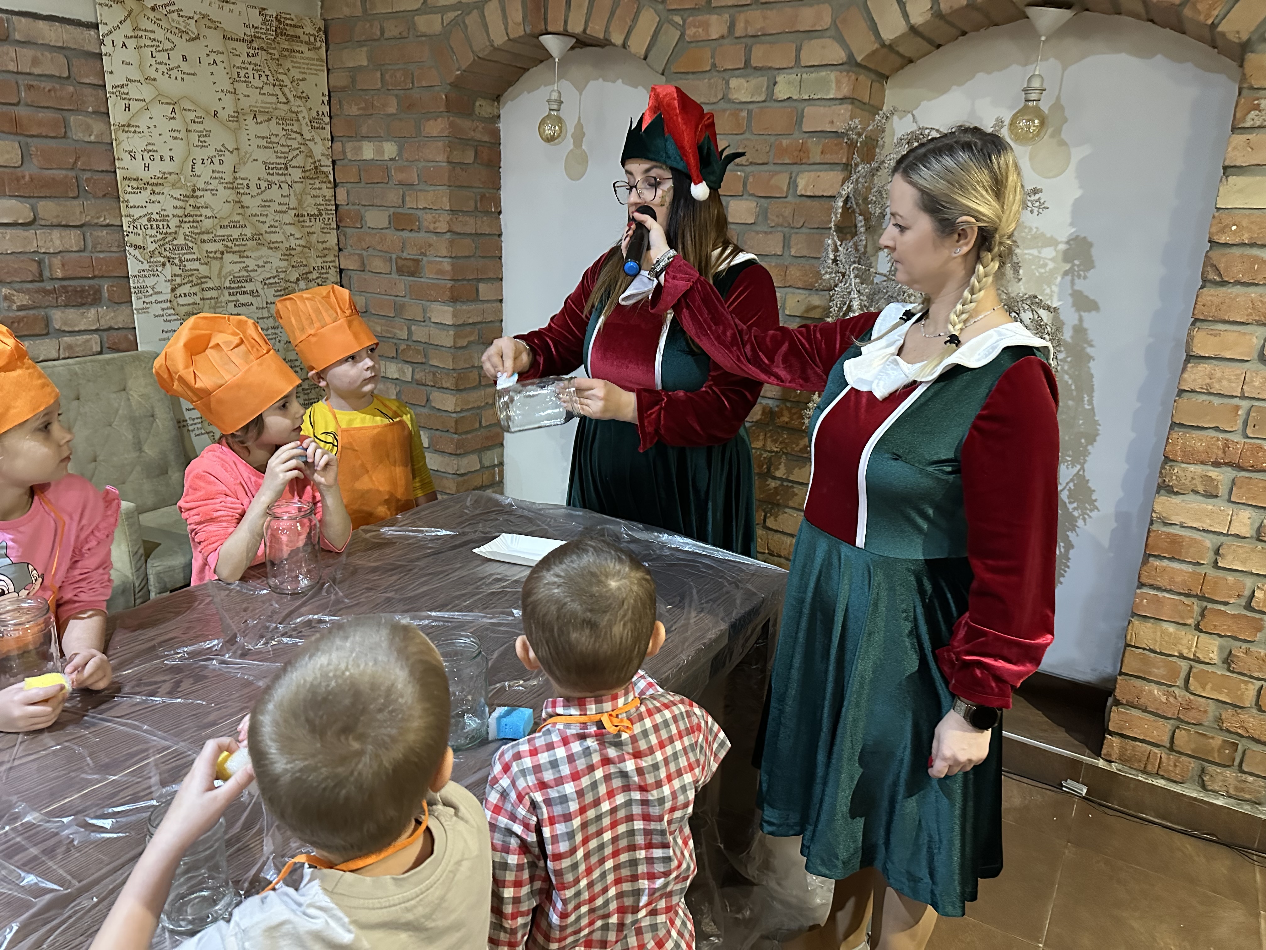 W dniu 1 grudnia grupa starszaków odwiedziła Fabrykę Świątecznych Cudów w Chrzanowie. Celem wyjazdu było wprowadzenie dzieci w atmosferę nadchodzących świąt oraz rozwijanie ich kreatywności poprzez udział w różnorodnych warsztatach tematycznych. Podczas pobytu dzieci uczestniczyły w świątecznych zajęciach plastyczno-kulinarnych. Samodzielnie piekły pierniczki, które następnie ozdabiały według własnych pomysłów. Kolejnym zadaniem było wykonanie lampionów świątecznych – każdy z nich niepowtarzalny i wyjątkowy, tak jak mali twórcy. Zajęciom towarzyszyły elfy, które – jak podkreślały dzieci – zostały przysłane prosto przez Świętego Mikołaja. Pomagały one w wykonywaniu prac, dbały o dobrą zabawę oraz wykonały dzieciom świąteczne tatuaże. Następnie przedszkolaki zostały zaproszone do zabaw ruchowych i muzycznych, podczas których mogły spotkać wesołe świąteczne maskotki. Zwieńczeniem wizyty było długo wyczekiwane spotkanie ze Świętym Mikołajem. Każde dziecko otrzymało pamiątkowy certyfikat, który wywołał wiele radości i dumy. Wyjazd do Fabryki Świątecznych Cudów dostarczył dzieciom mnóstwo wrażeń i wprowadził je w magiczny nastrój zbliżających się świąt. Był to dzień pełen twórczej aktywności, uśmiechu i przedświątecznej atmosfery.