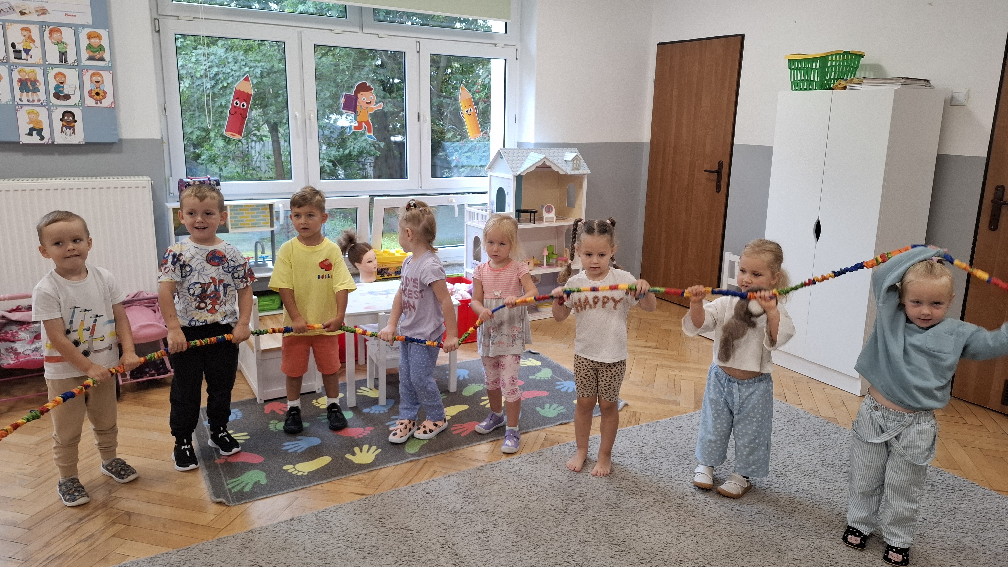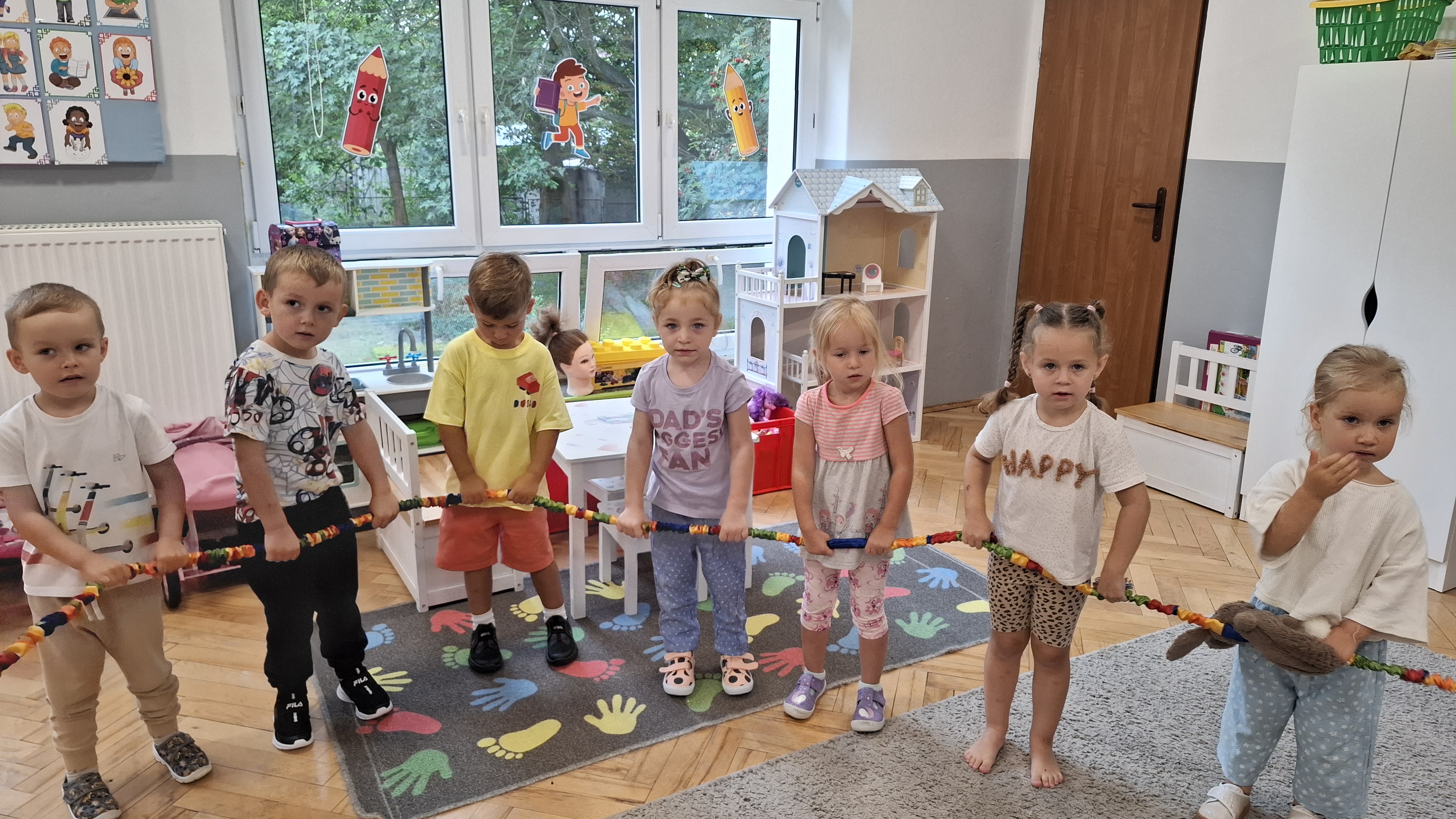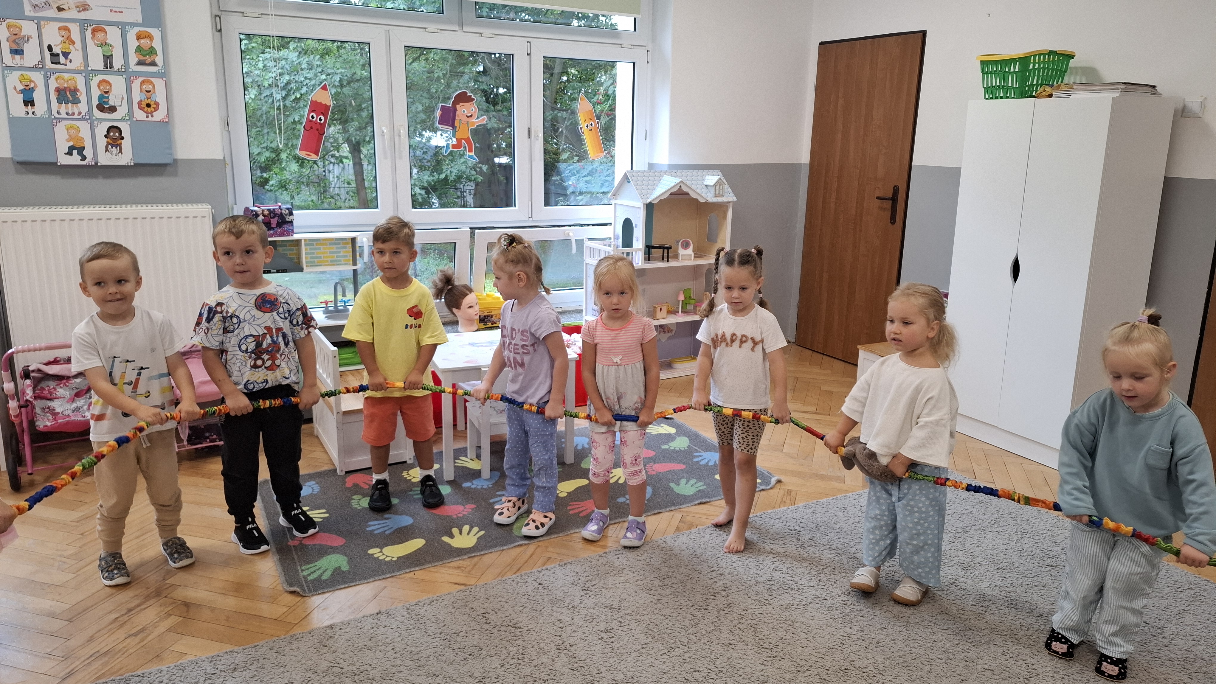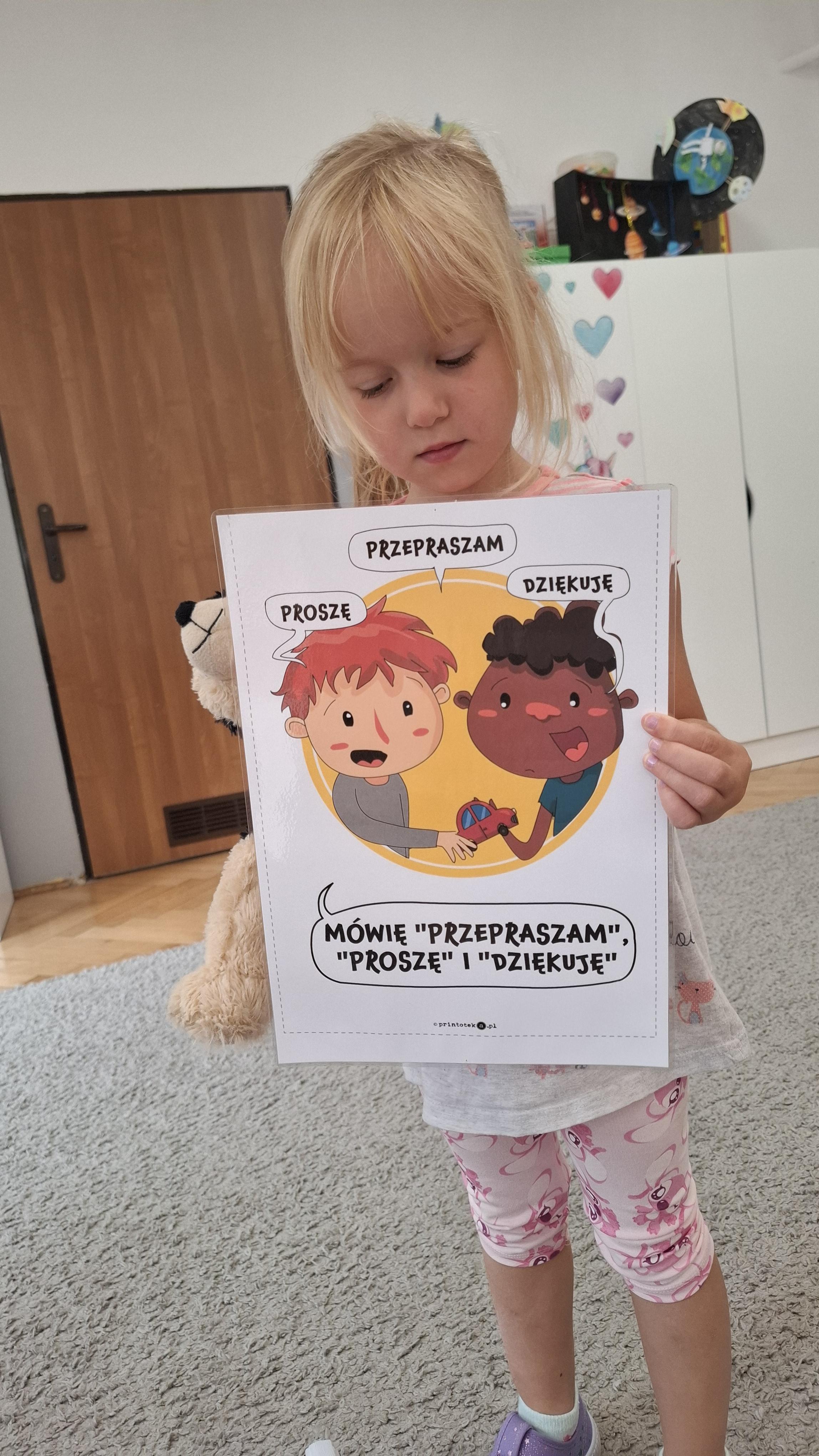 W ostatnim tygodniu w przedszkolu prowadziliśmy zajęcia poświęcone m.in. nauce dobrych manier. Naszym celem było wsparcie dzieci w rozwijaniu umiejętności społecznych i zachęcenie ich do kierowania się uprzejmością w codziennym życiu. Dzieci wysłuchały opowiadania W. Kosteckiej „Dobra atmosfera”, które skłoniło je do refleksji, jak należy się zachowywać, aby wszyscy dobrze czuli się w grupie. Dzięki zabawie „Pociąg dobrych manier” utrwaliły z kolei bardzo istotną formę komunikacji, jaką są zwroty grzecznościowe. Ustaliliśmy również zasady grupowe, aby uwrażliwić dzieci na potrzebę ich stosowania.