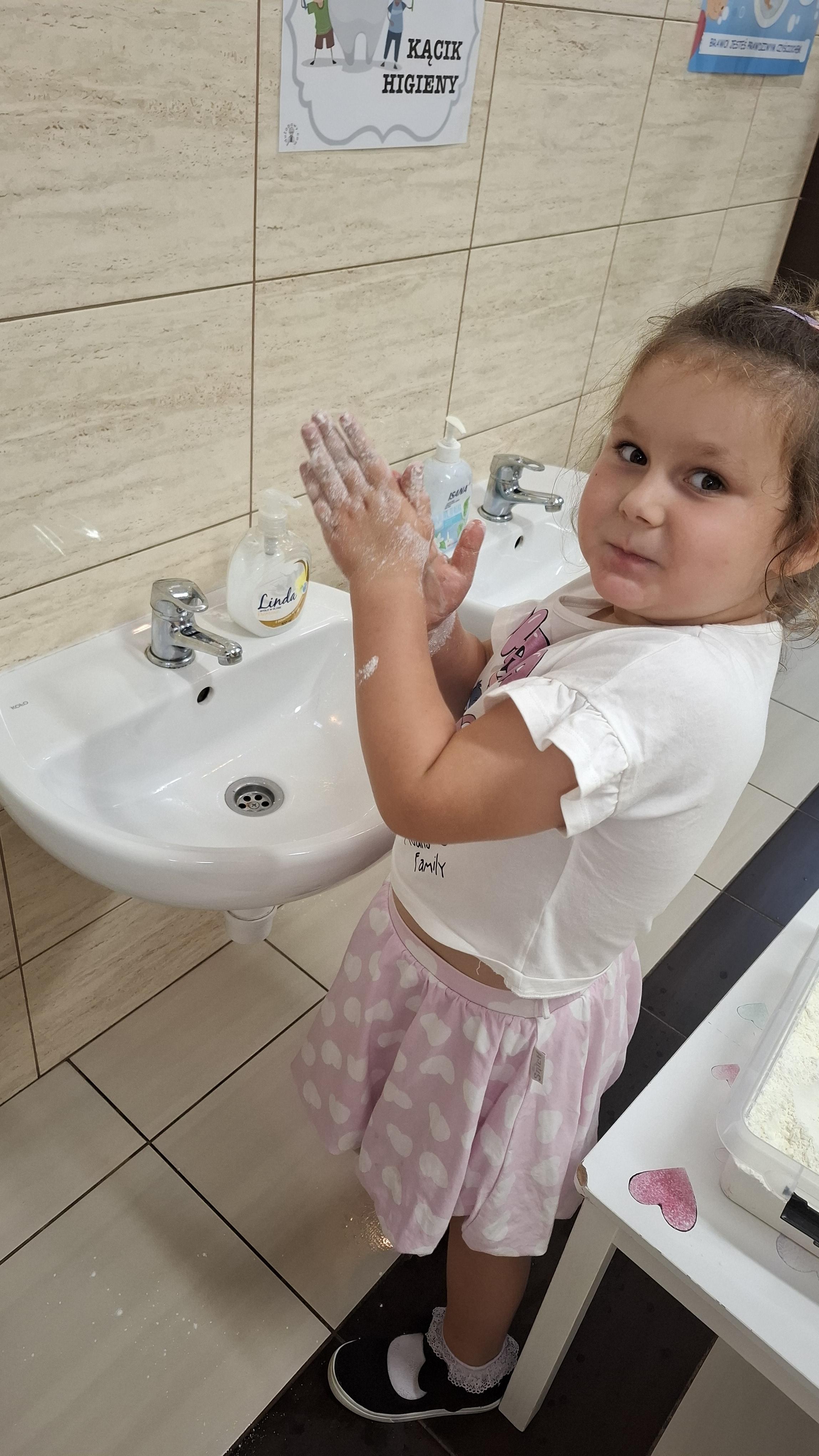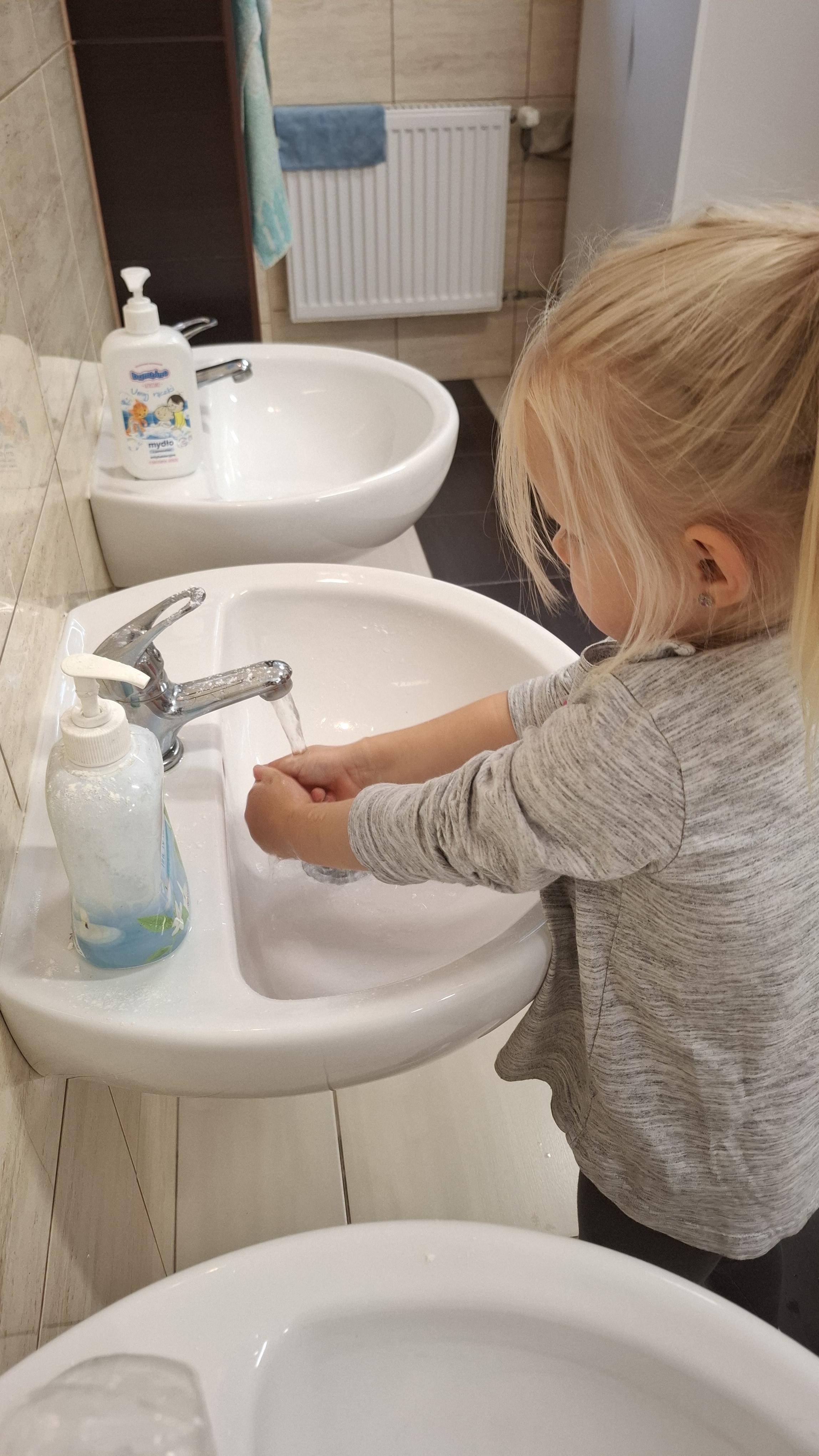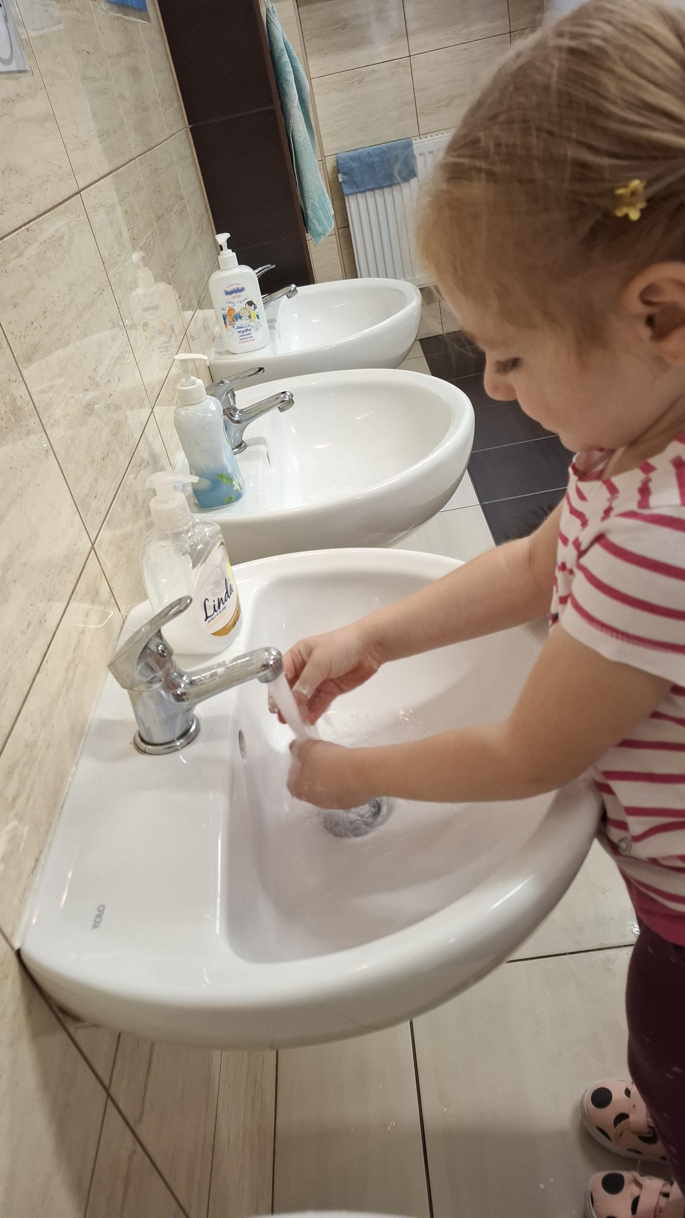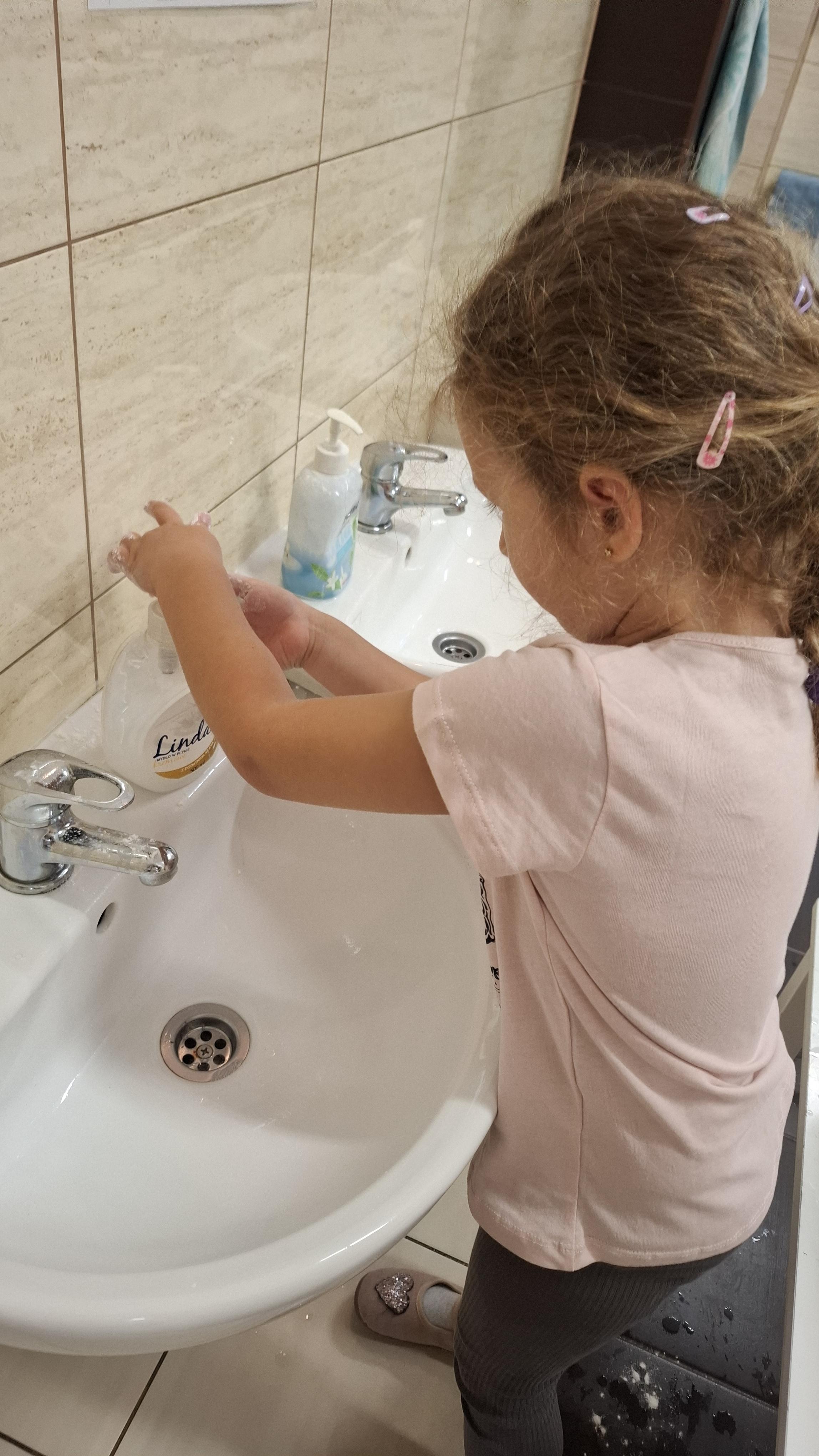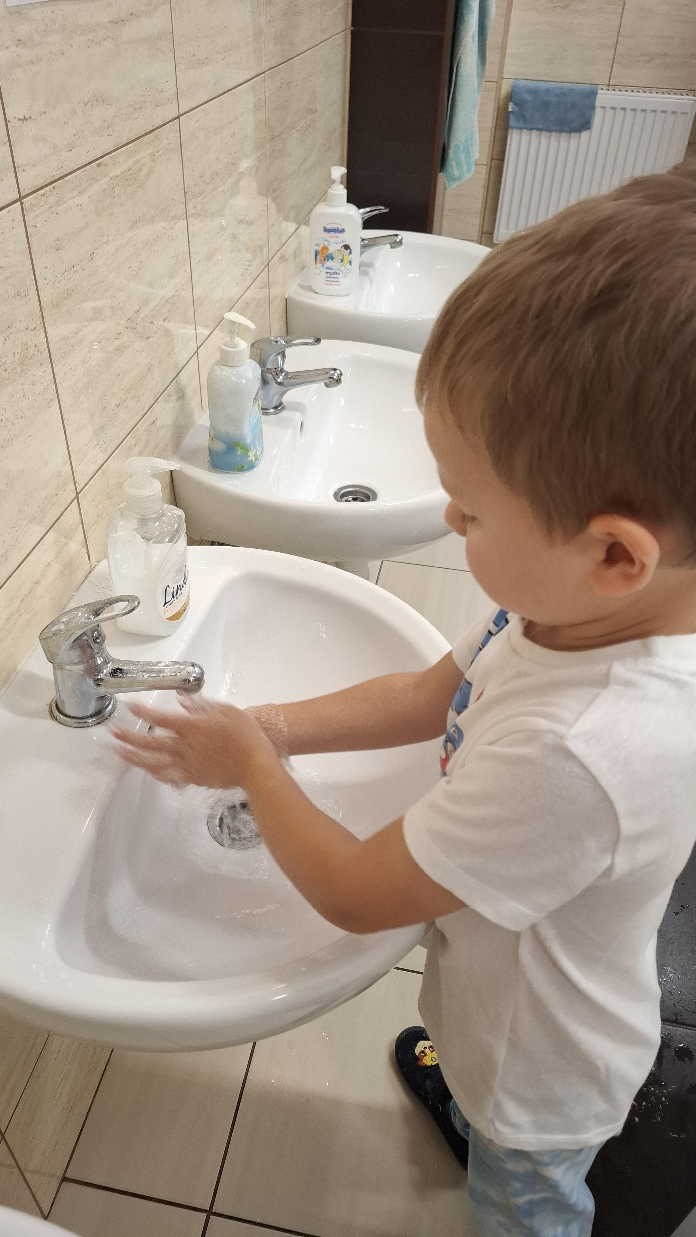 Ponieważ naszą codziennością w przedszkolu jest dbanie o higienę osobistą, nie zapominamy oczywiście o myciu rąk przed posiłkami. Za pomocą zabaw takich jak „W świecie czystości” dzieci utrwaliły natomiast nazwy przyborów higienicznych i ich przeznaczenie. Oprócz tego przeprowadziliśmy bardzo ciekawy eksperyment „Mydło i zarazki”, który uświadomił wszystkim, jak mydło działa na zarazki i jak ważne jest dbanie o higienę.