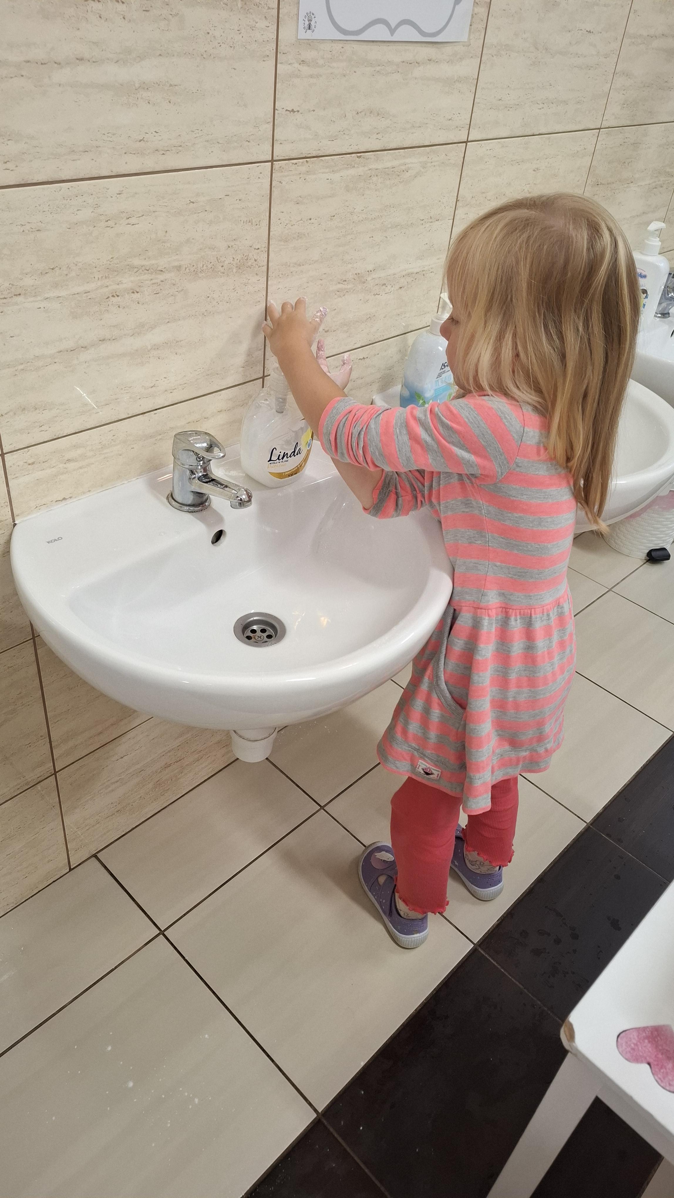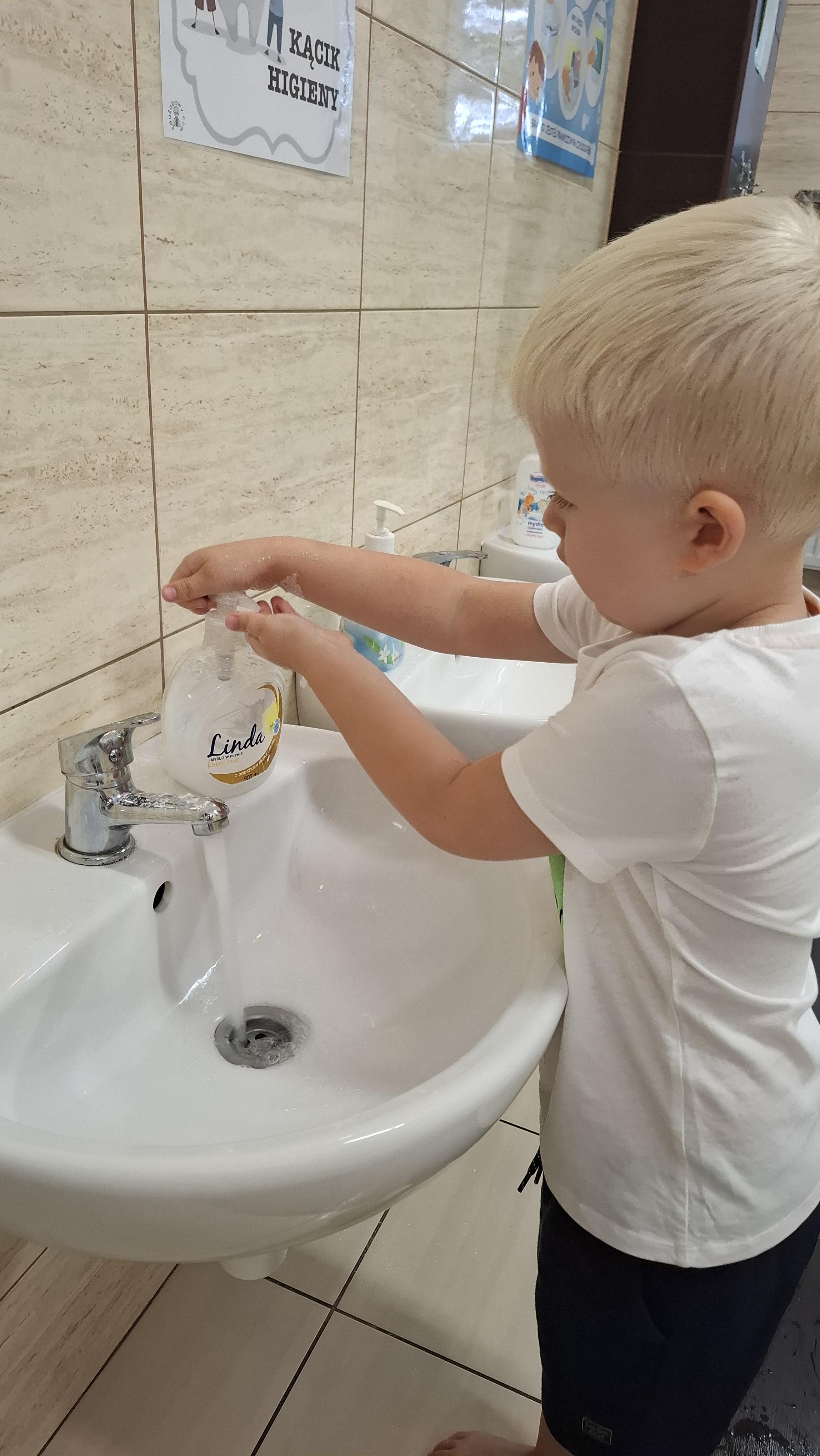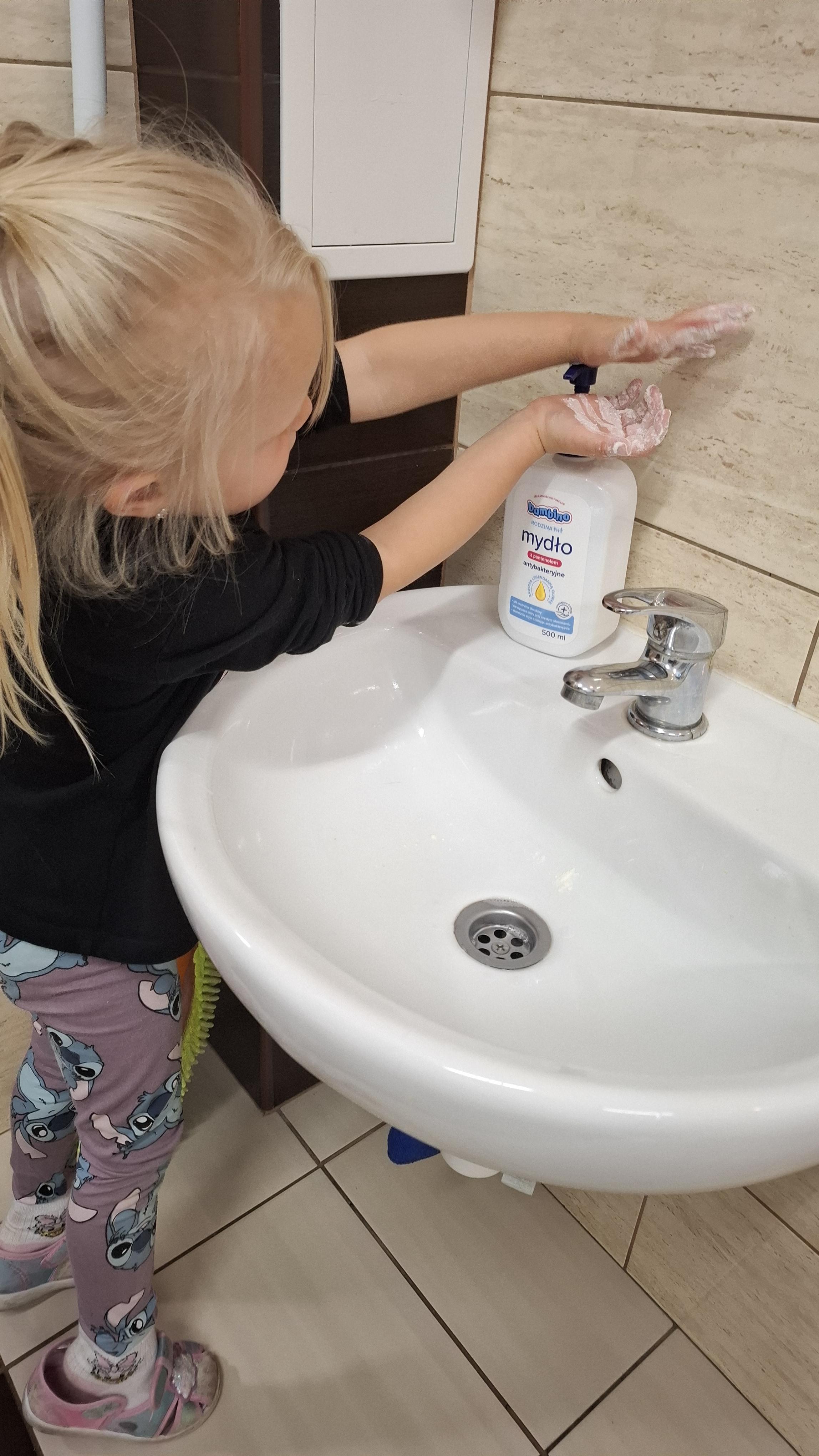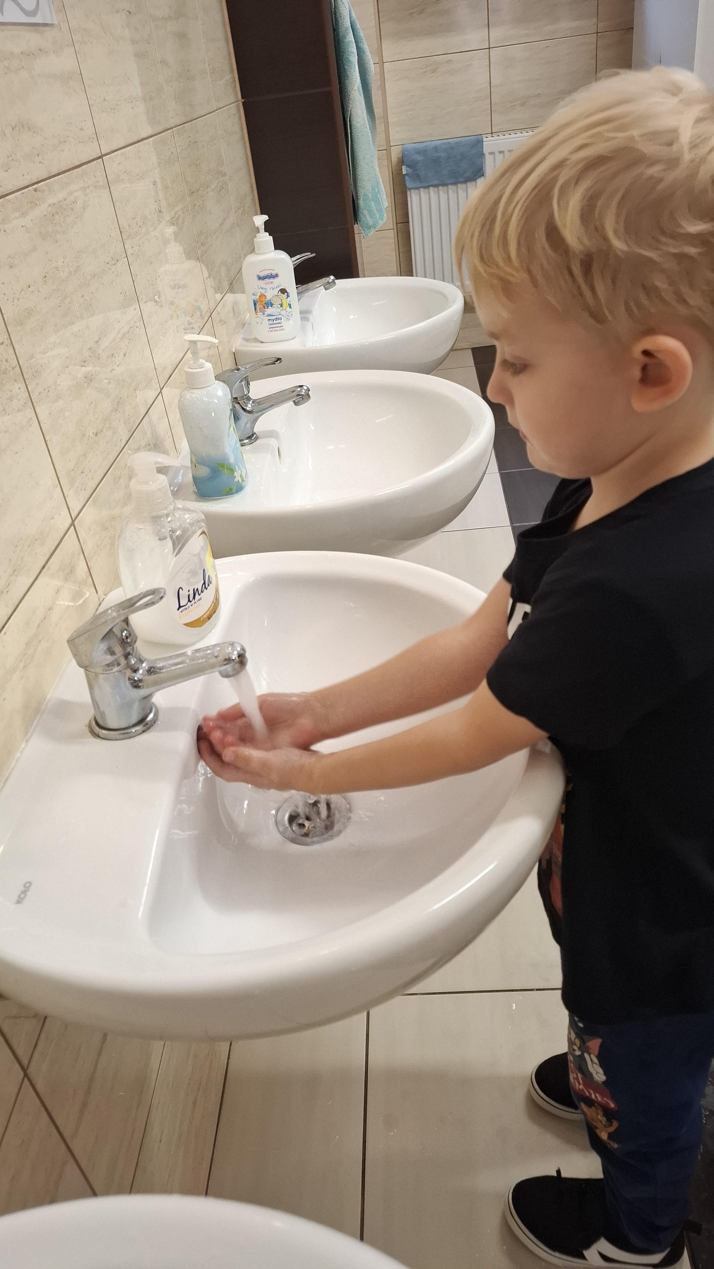 Ponieważ naszą codziennością w przedszkolu jest dbanie o higienę osobistą, nie zapominamy oczywiście o myciu rąk przed posiłkami. Za pomocą zabaw takich jak „W świecie czystości” dzieci utrwaliły natomiast nazwy przyborów higienicznych i ich przeznaczenie. Oprócz tego przeprowadziliśmy bardzo ciekawy eksperyment „Mydło i zarazki”, który uświadomił wszystkim, jak mydło działa na zarazki i jak ważne jest dbanie o higienę.