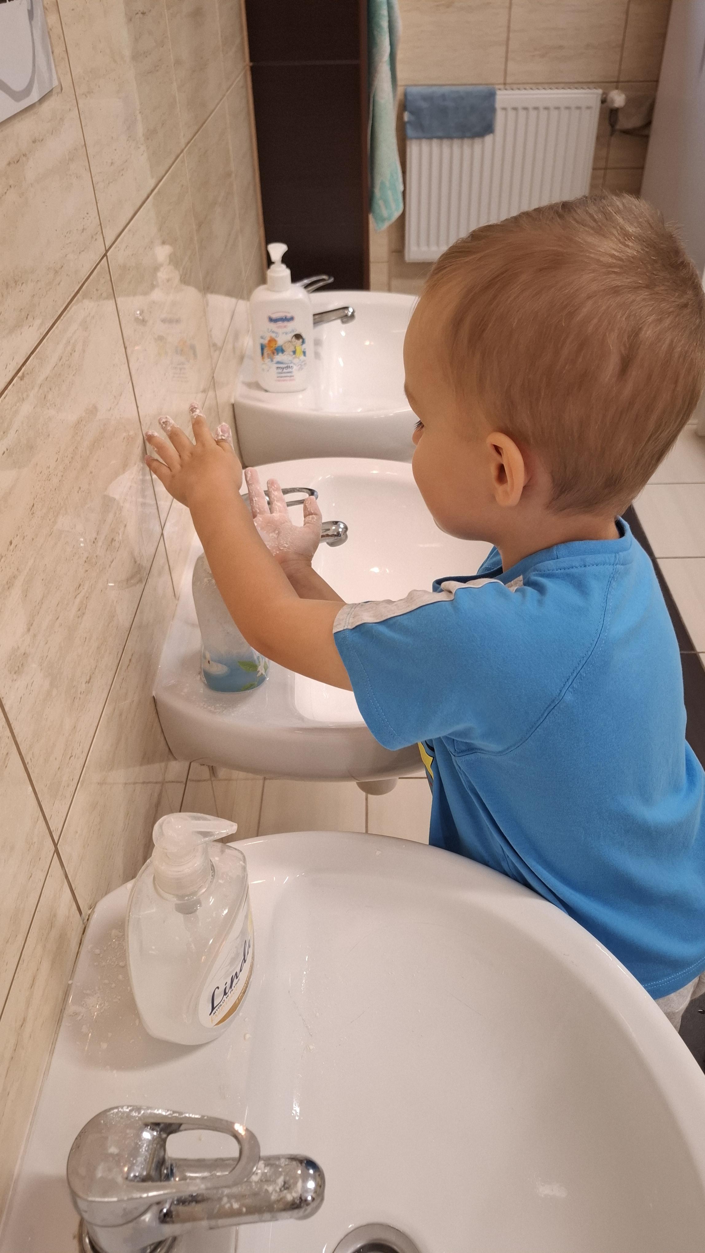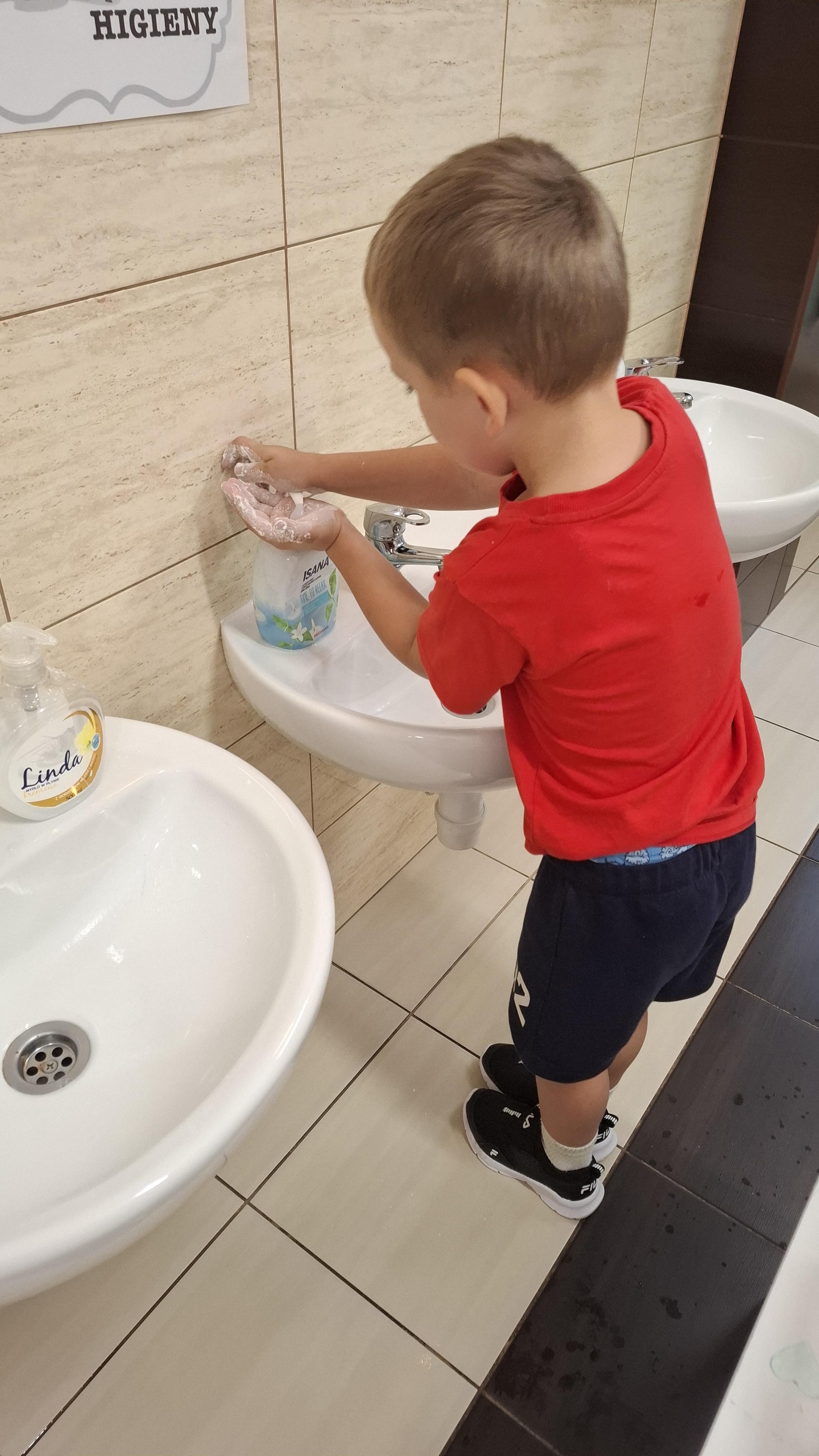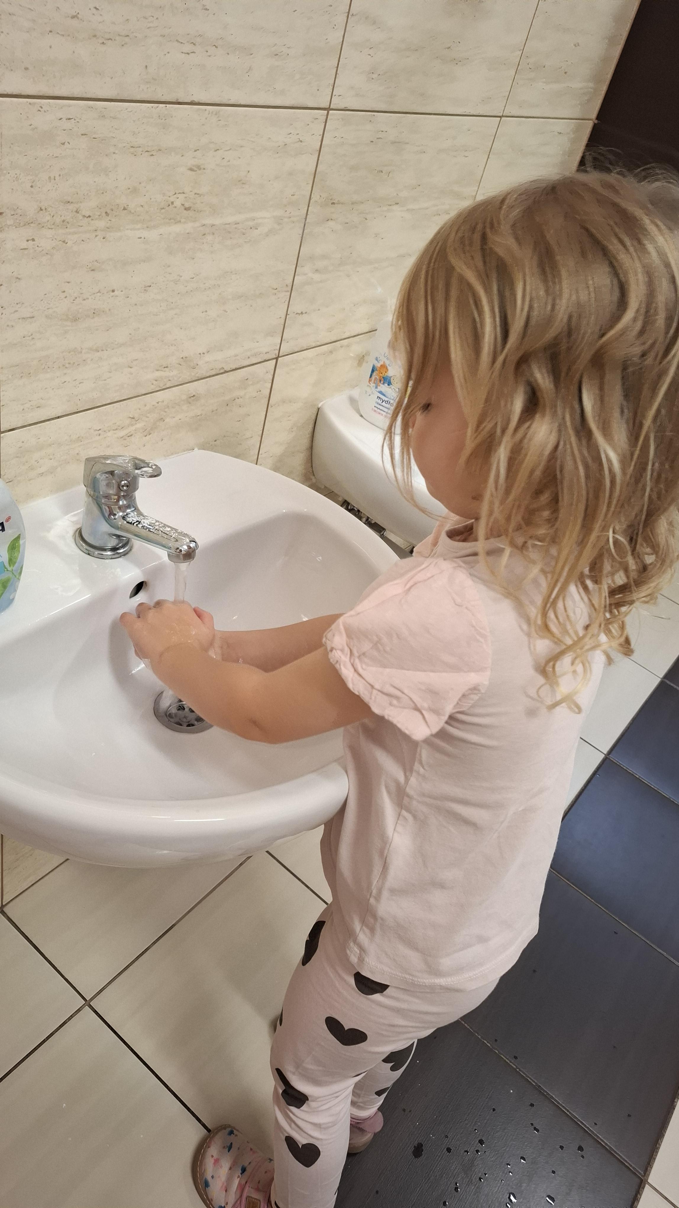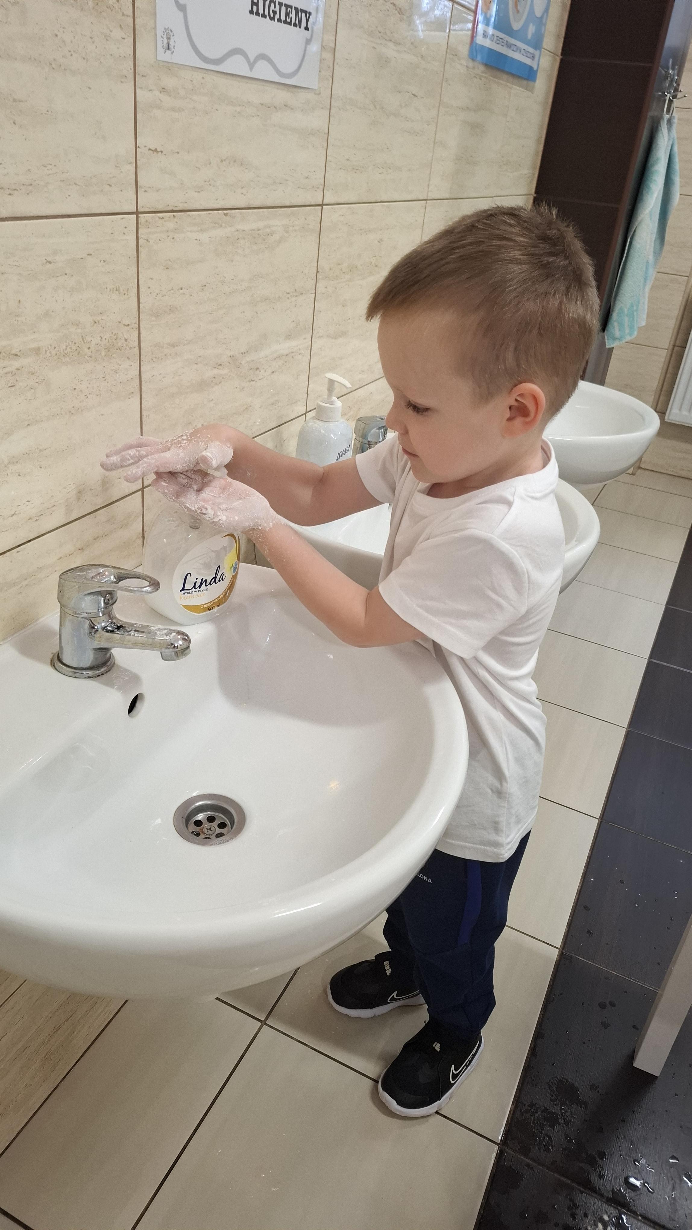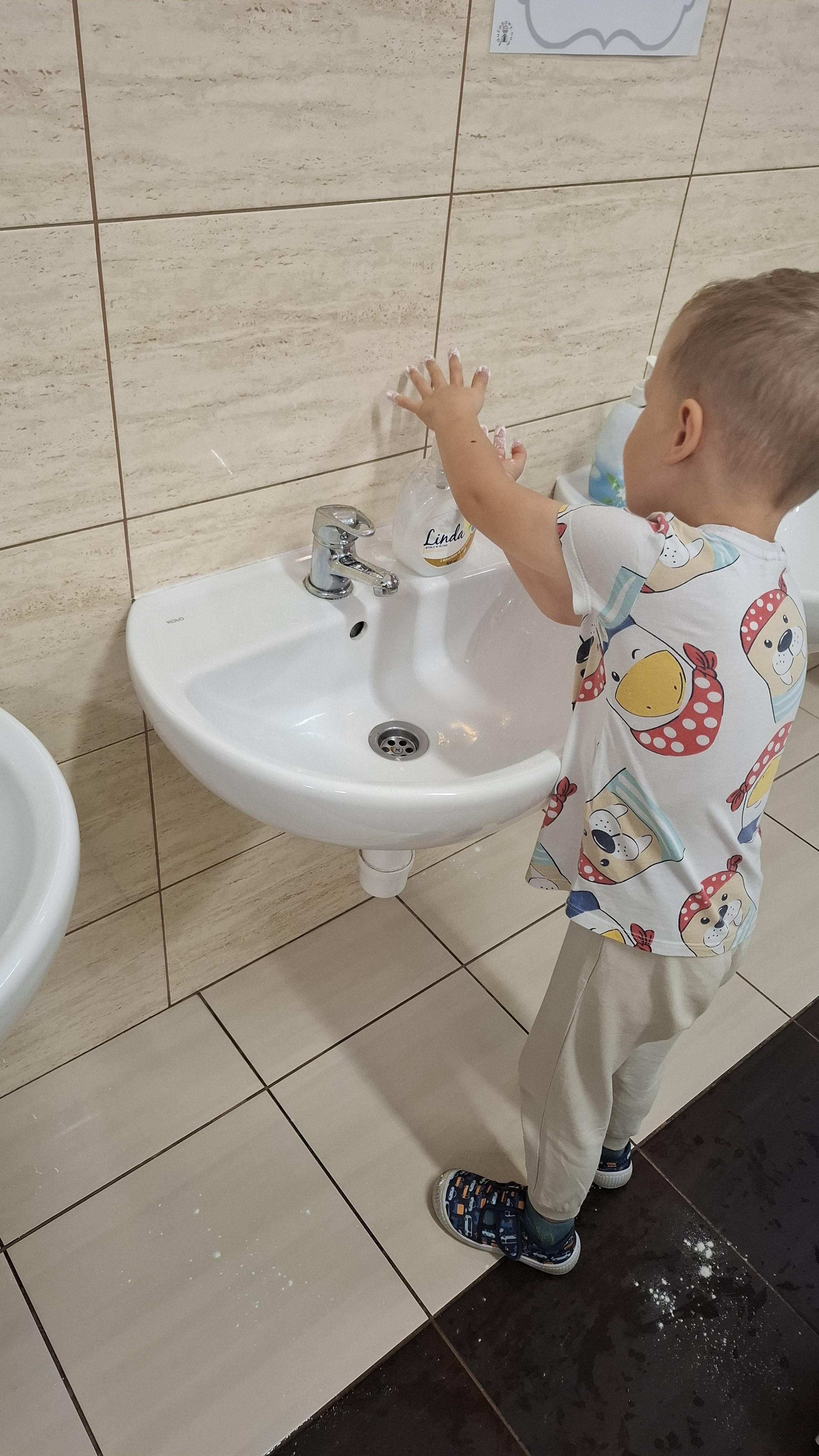 Ponieważ naszą codziennością w przedszkolu jest dbanie o higienę osobistą, nie zapominamy oczywiście o myciu rąk przed posiłkami. Za pomocą zabaw takich jak „W świecie czystości” dzieci utrwaliły natomiast nazwy przyborów higienicznych i ich przeznaczenie. Oprócz tego przeprowadziliśmy bardzo ciekawy eksperyment „Mydło i zarazki”, który uświadomił wszystkim, jak mydło działa na zarazki i jak ważne jest dbanie o higienę.