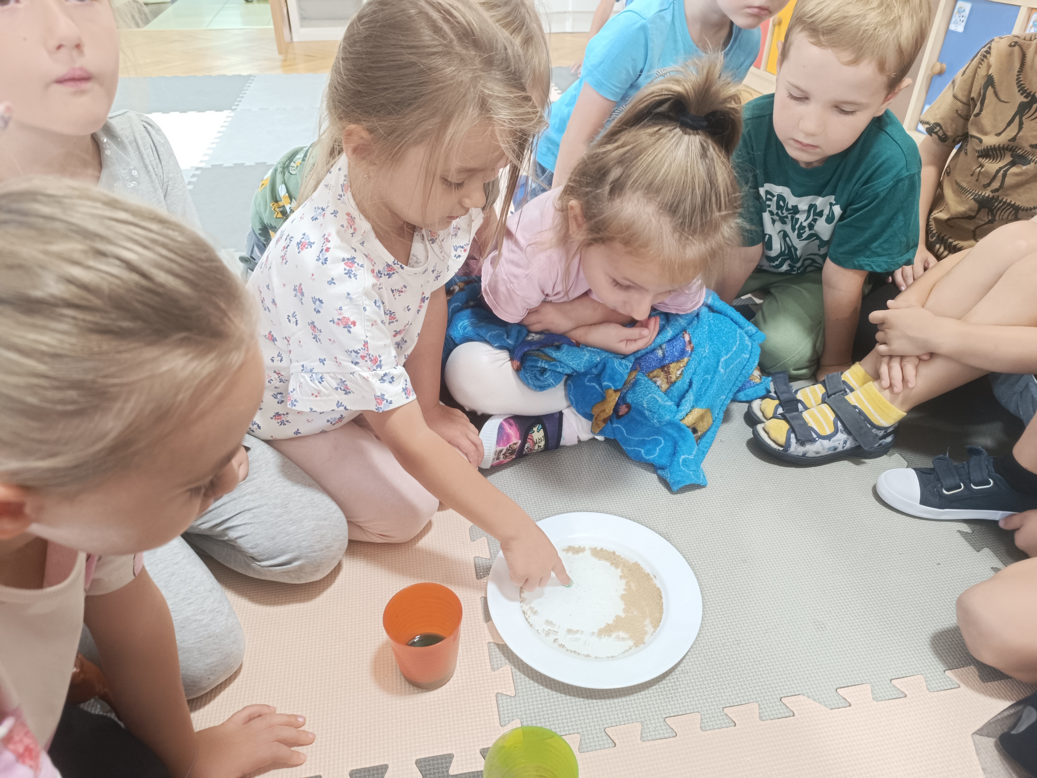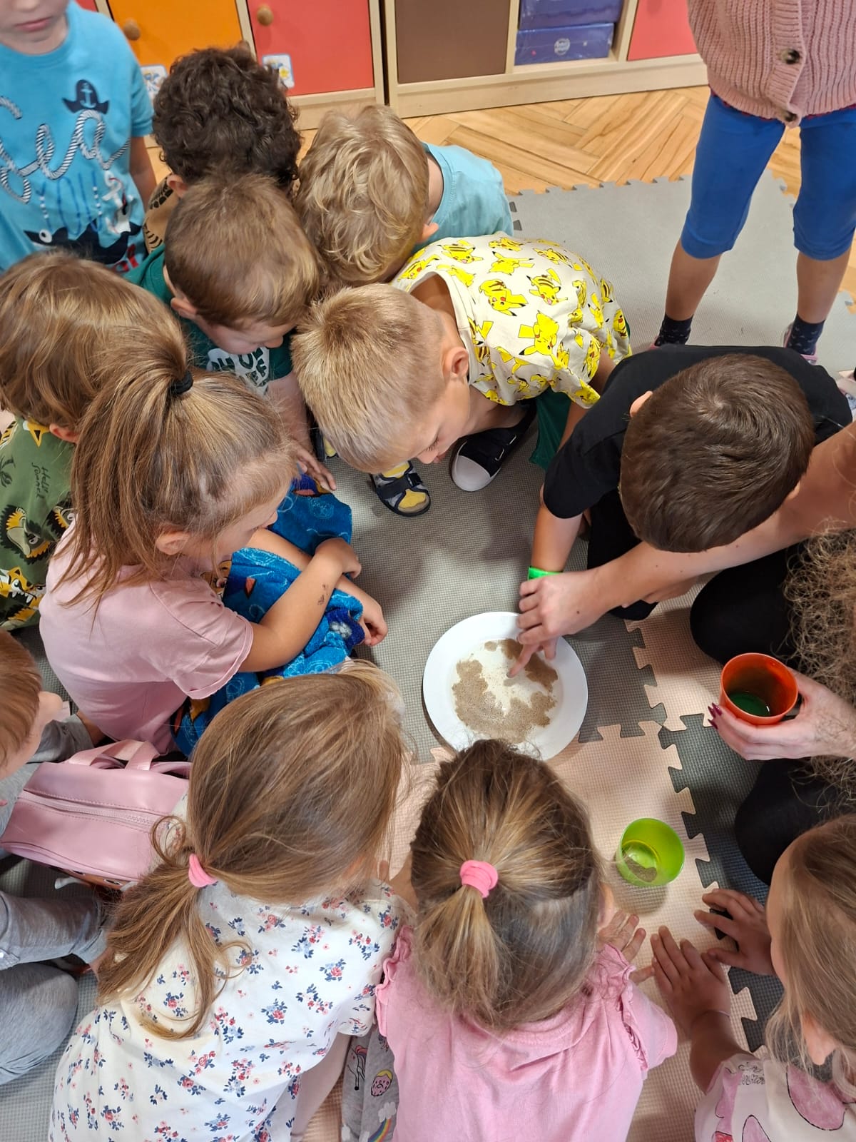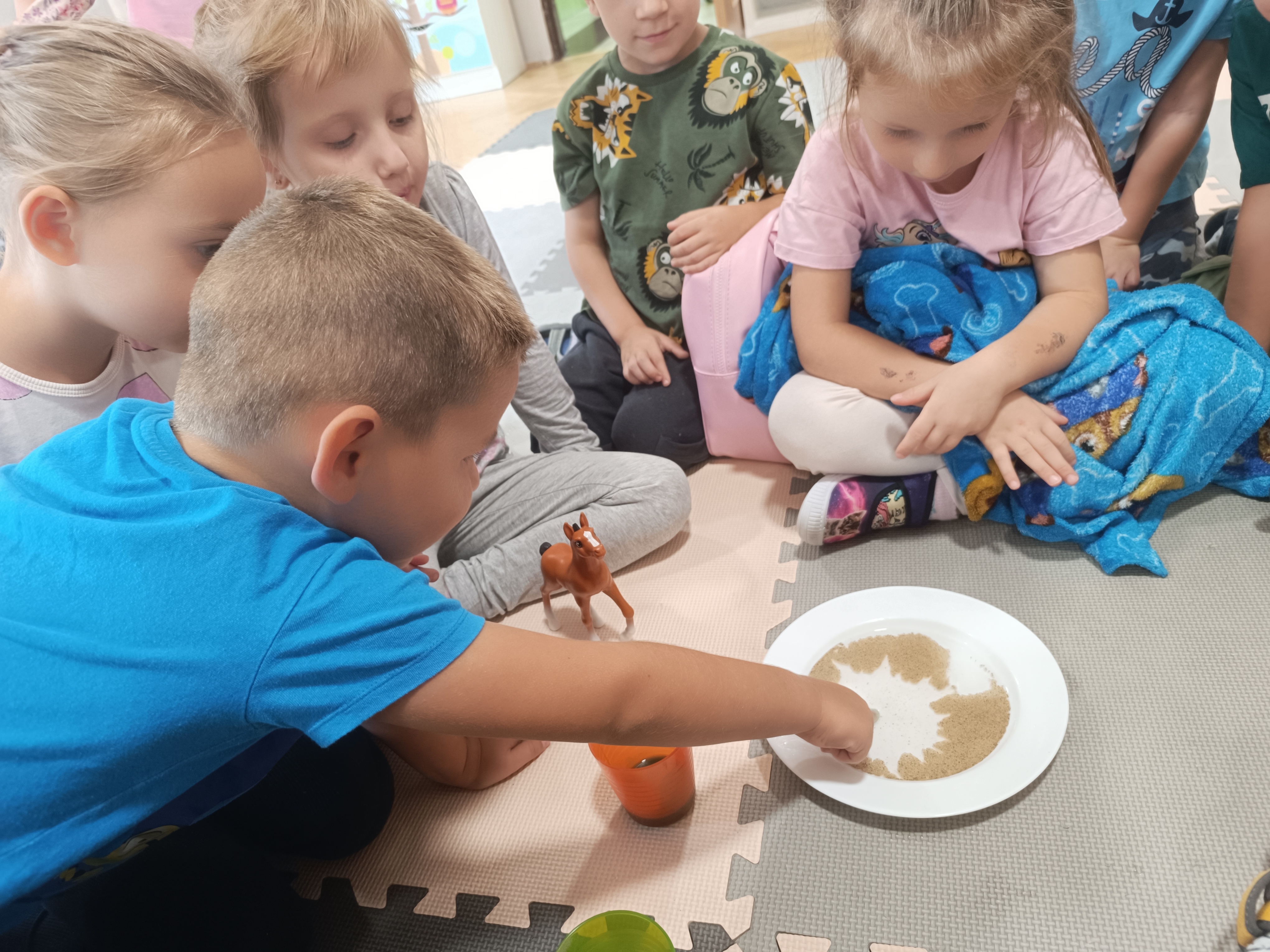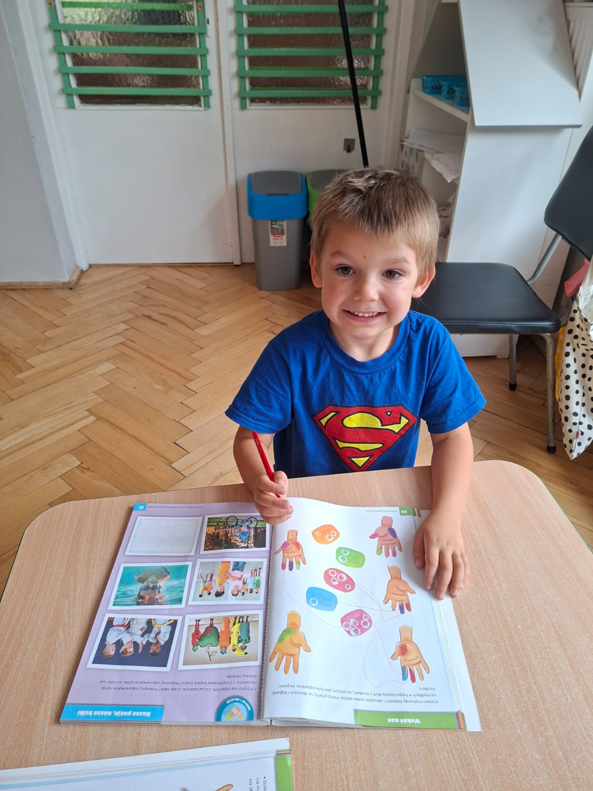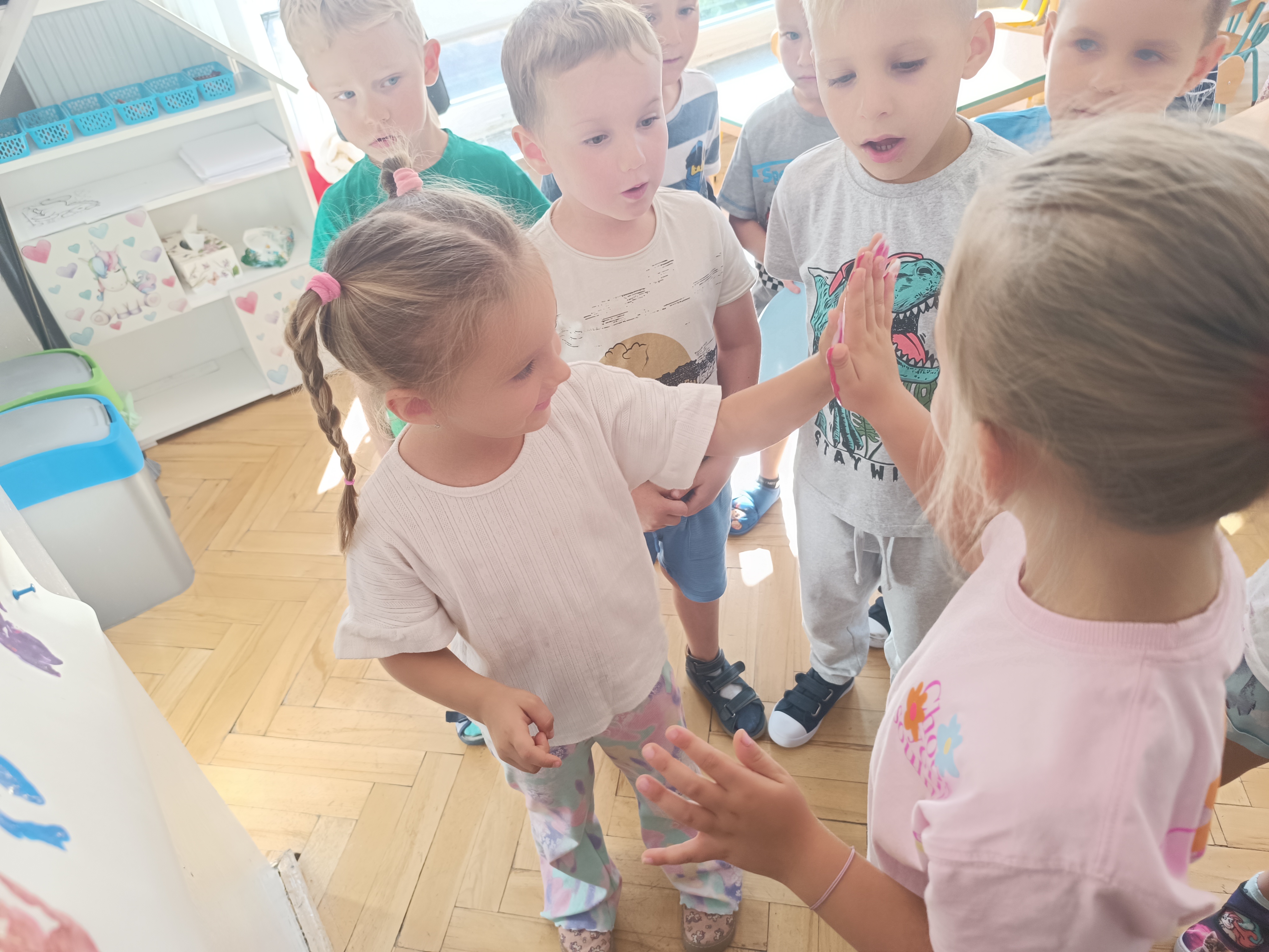 W tym tygodniu również poznawaliśmy pomieszczenia przedszkolne oraz wymienialiśmy pracowników przedszkola. Układaliśmy historyjki obrazkowe opowiadając o nich. Rozmawialiśmy o zabawkach, o czynnościach higienicznych w łazience, jak poprawnie myć ręce, zrobiliśmy doświadczenie z pieprzem i płynem do naczyń, pokazując jak oddziałuje mycie rączek mydłem na bakterie które mamy na sobie po zabawie np. na placu zabaw. Rozpoznawaliśmy dźwięki suszenia włosów, spuszczania wody, mycia rąk, pralki, mycia zębów puszczonych z radia. Oglądaliśmy film edukacyjny o czynnościach higienicznych w łazience.